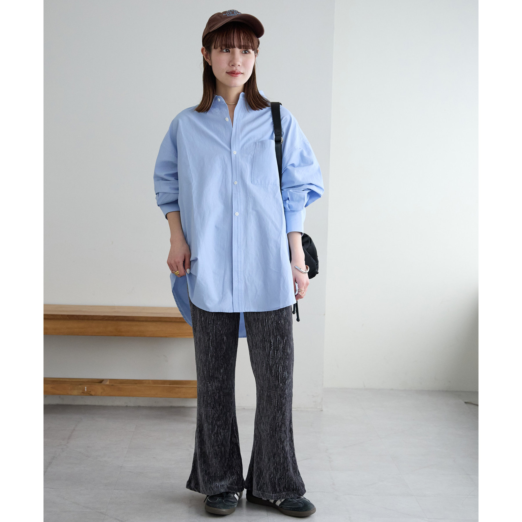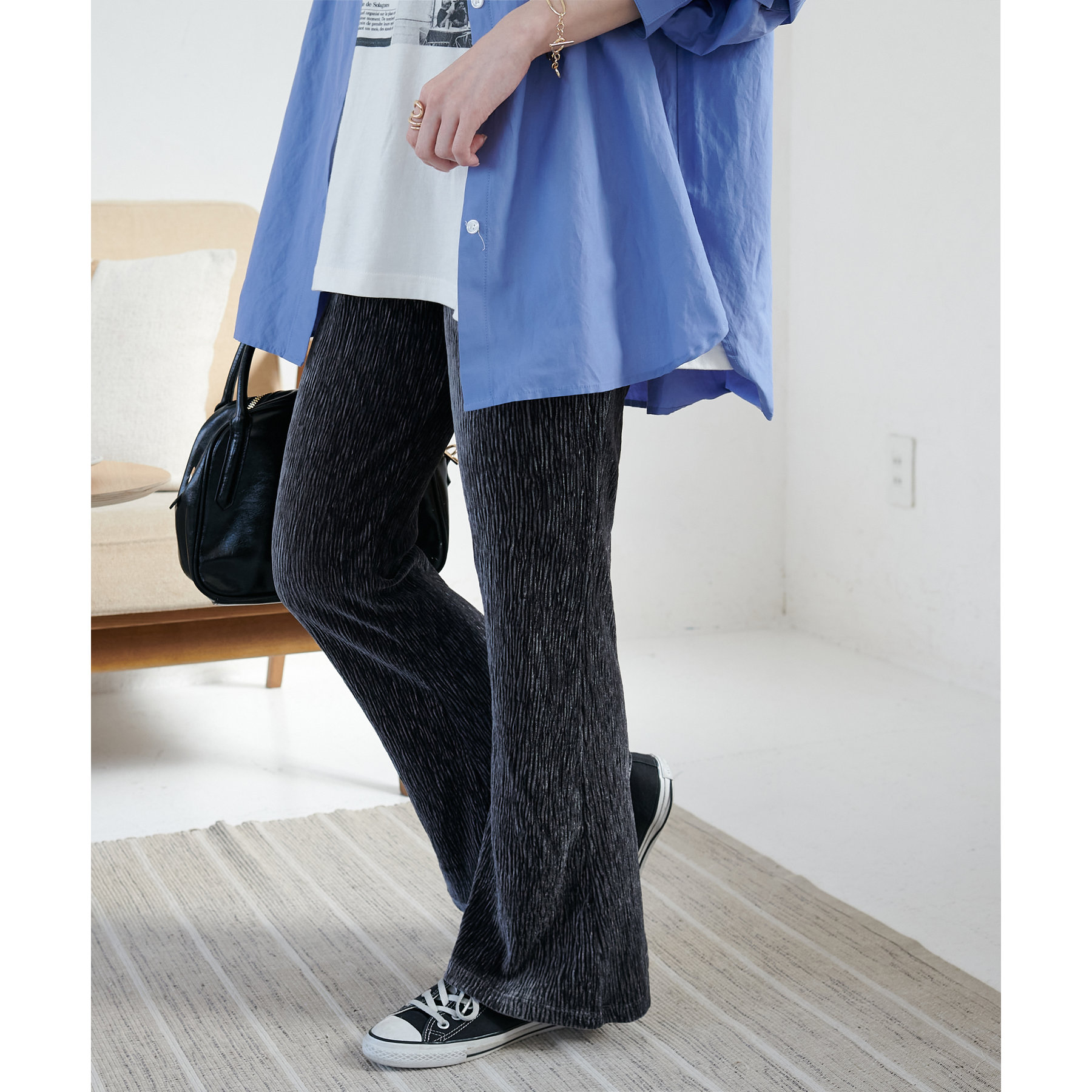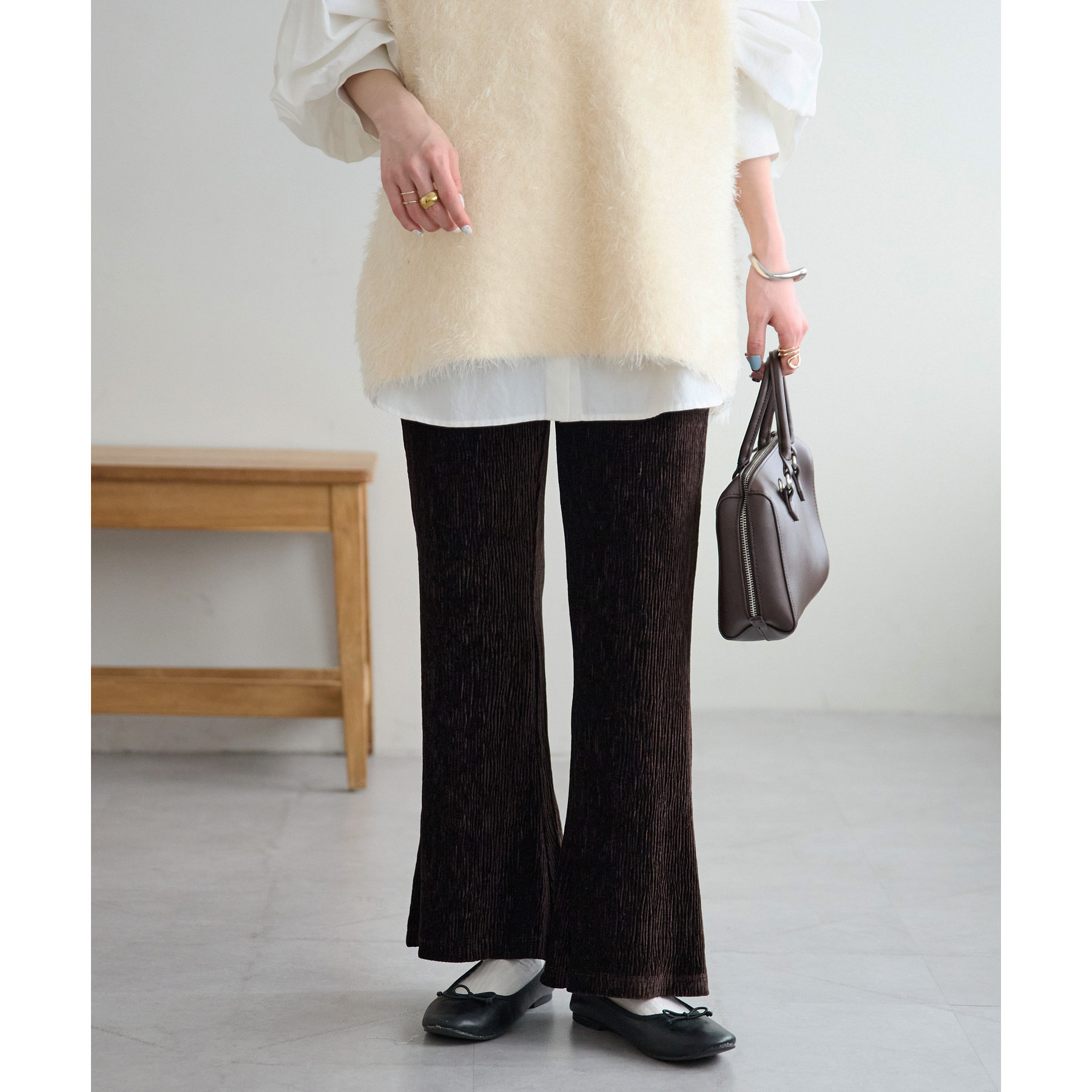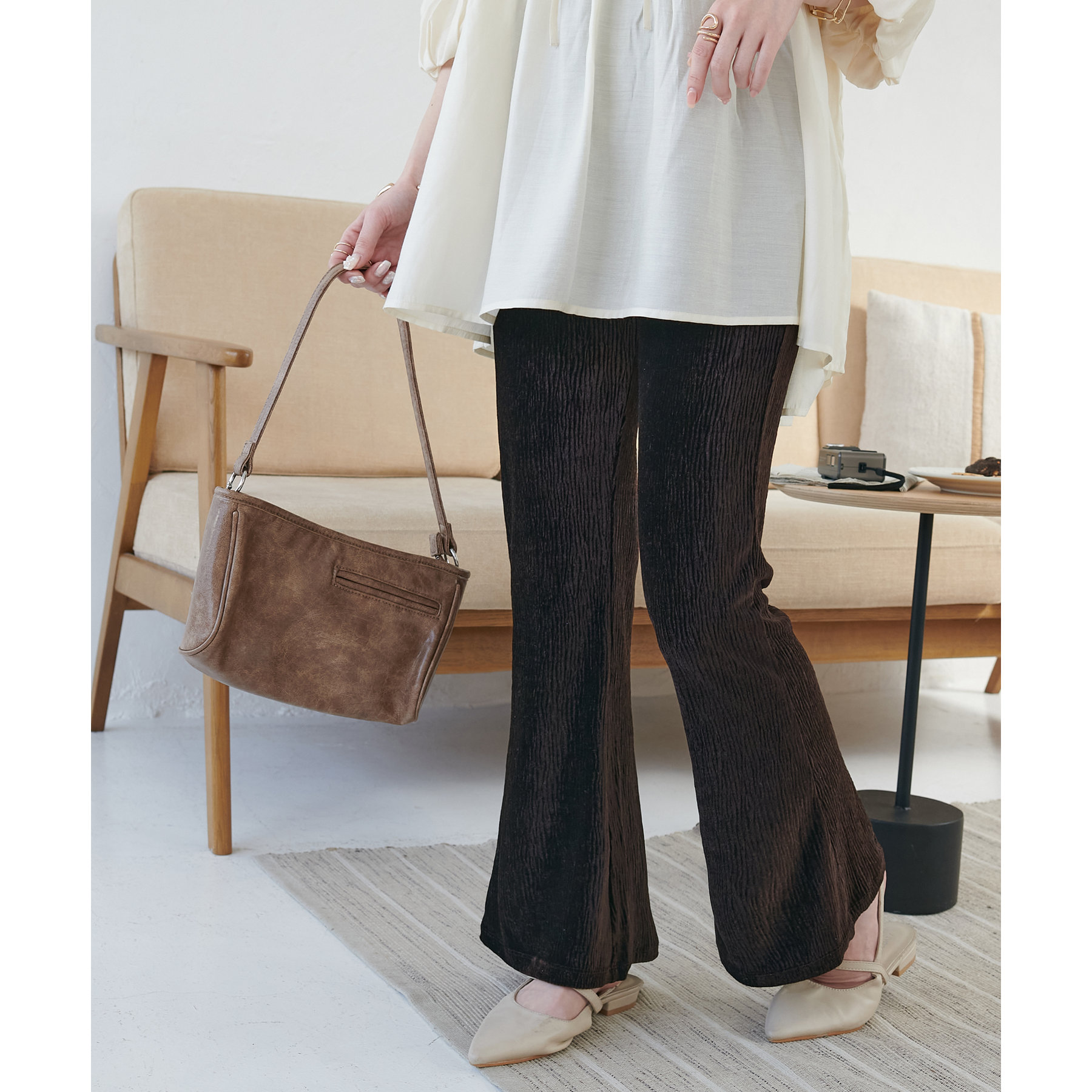 細見えするフレアパンツはゆったりとした着丈のトップスと合わせることで、メリハリ尾あるコーデが完成◎