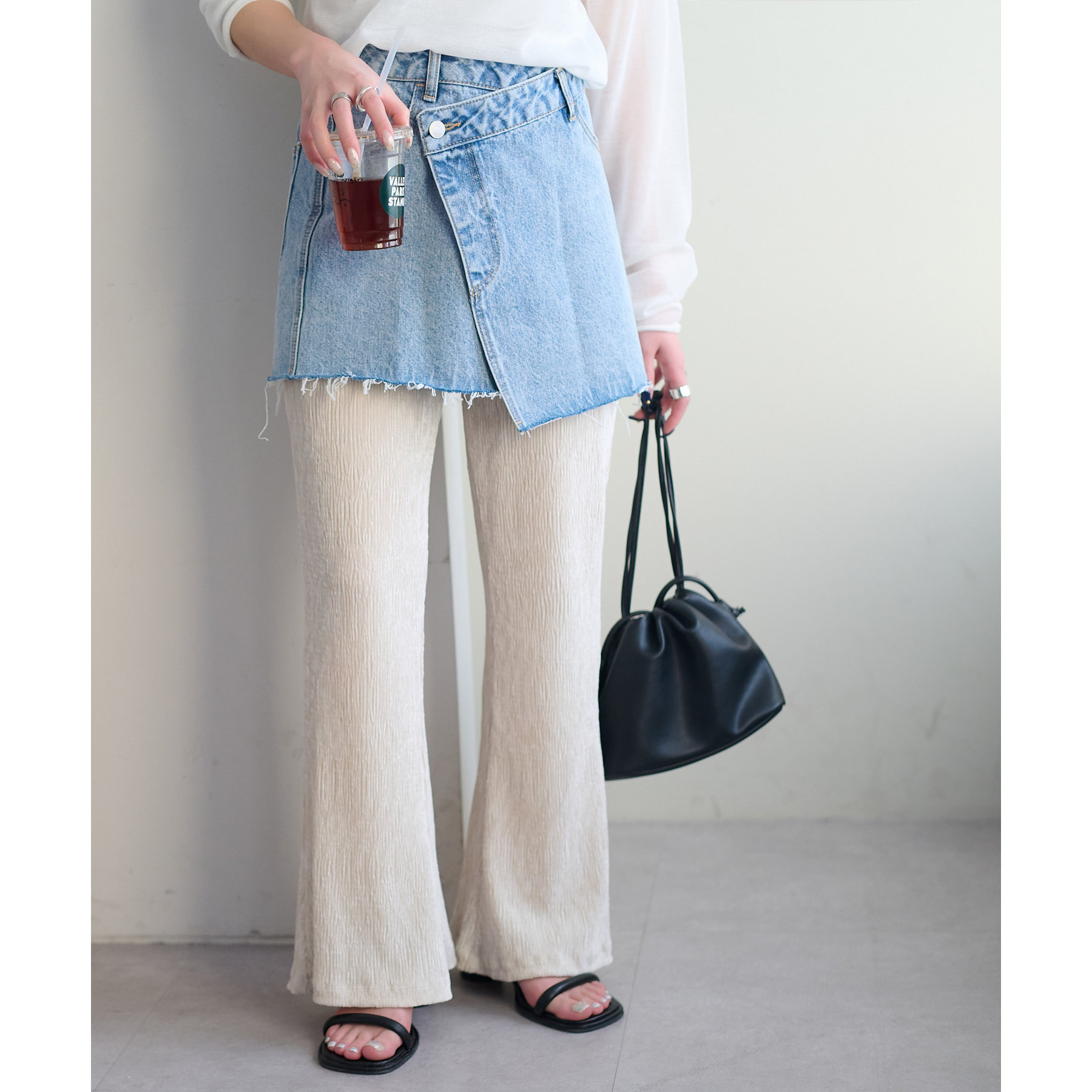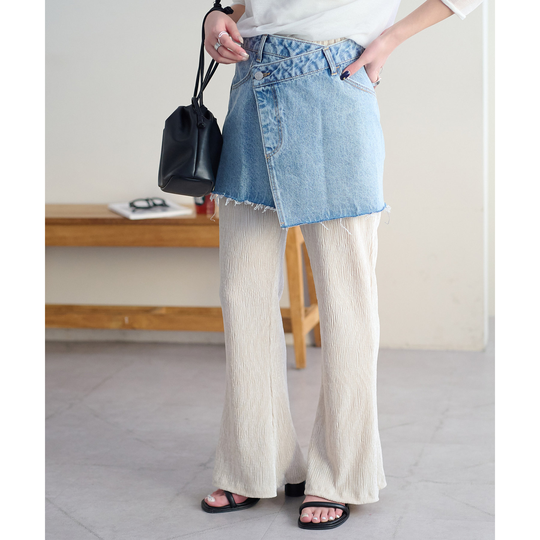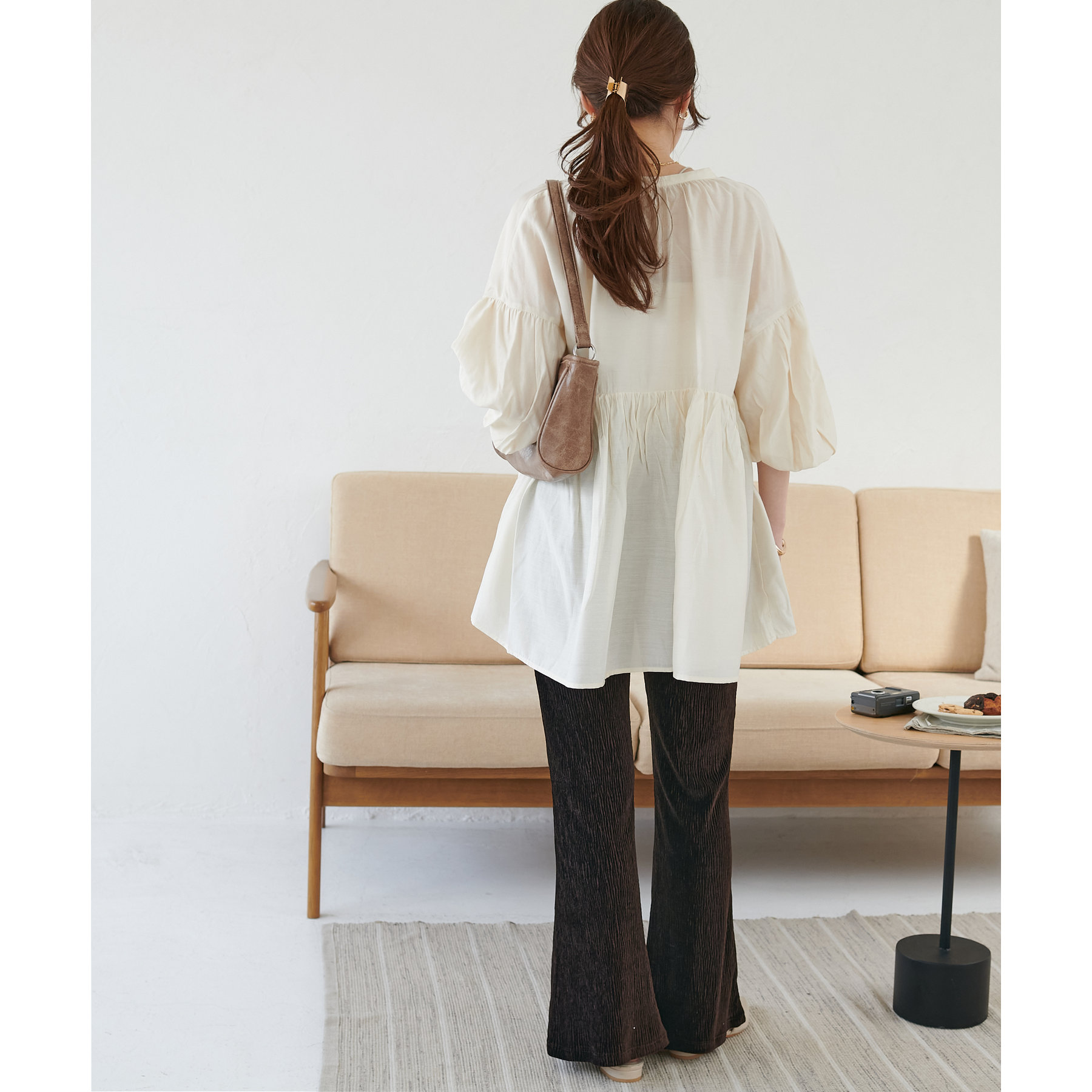 細見えするフレアパンツはゆったりとした着丈のトップスと合わせることで、メリハリ尾あるコーデが完成◎