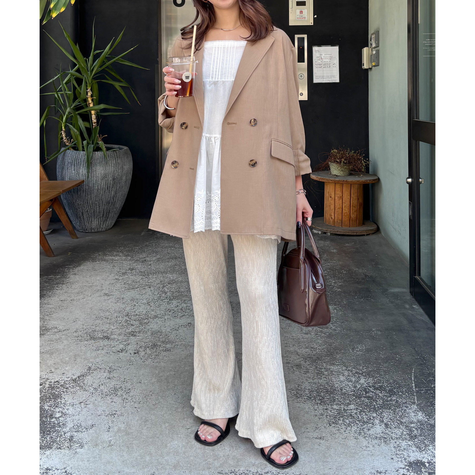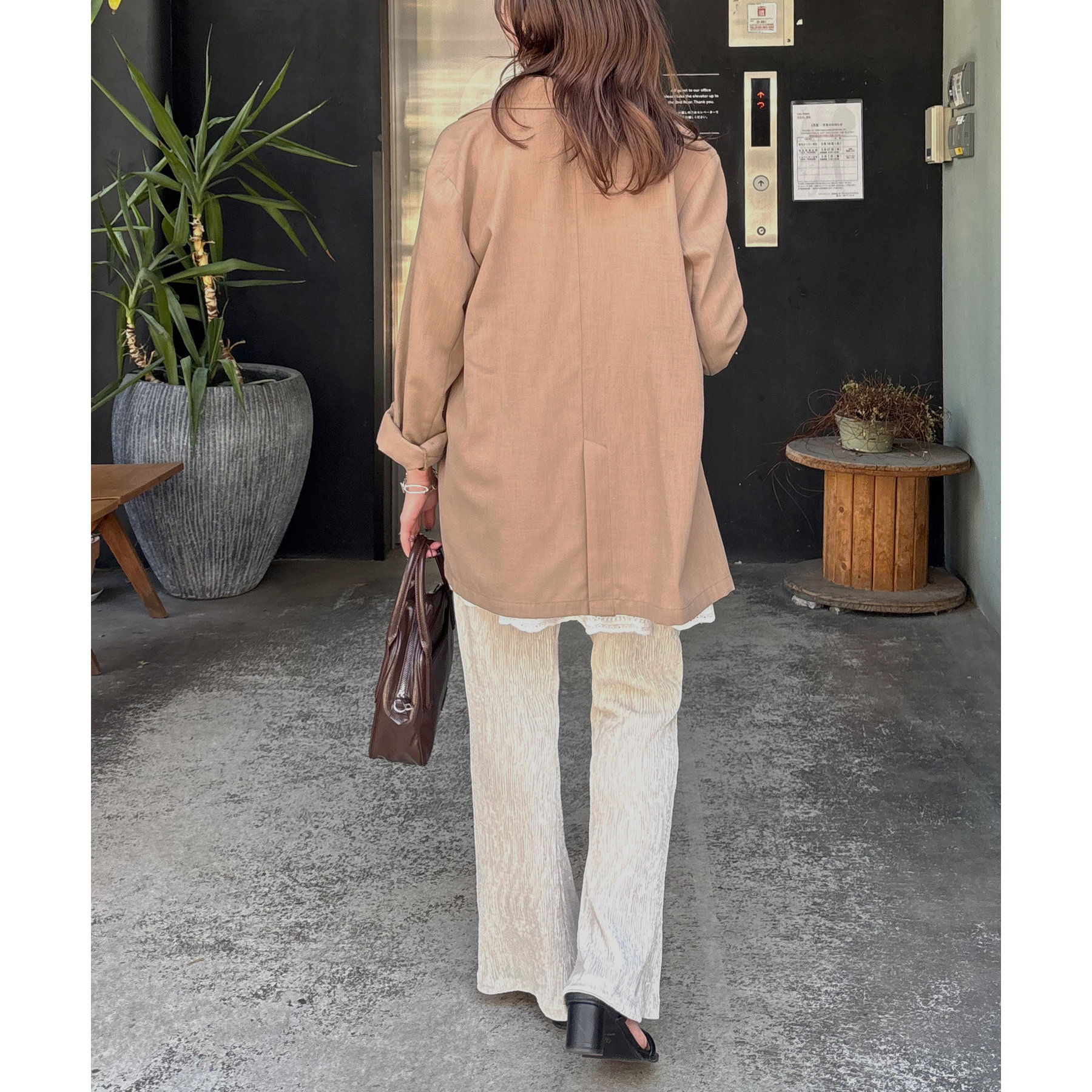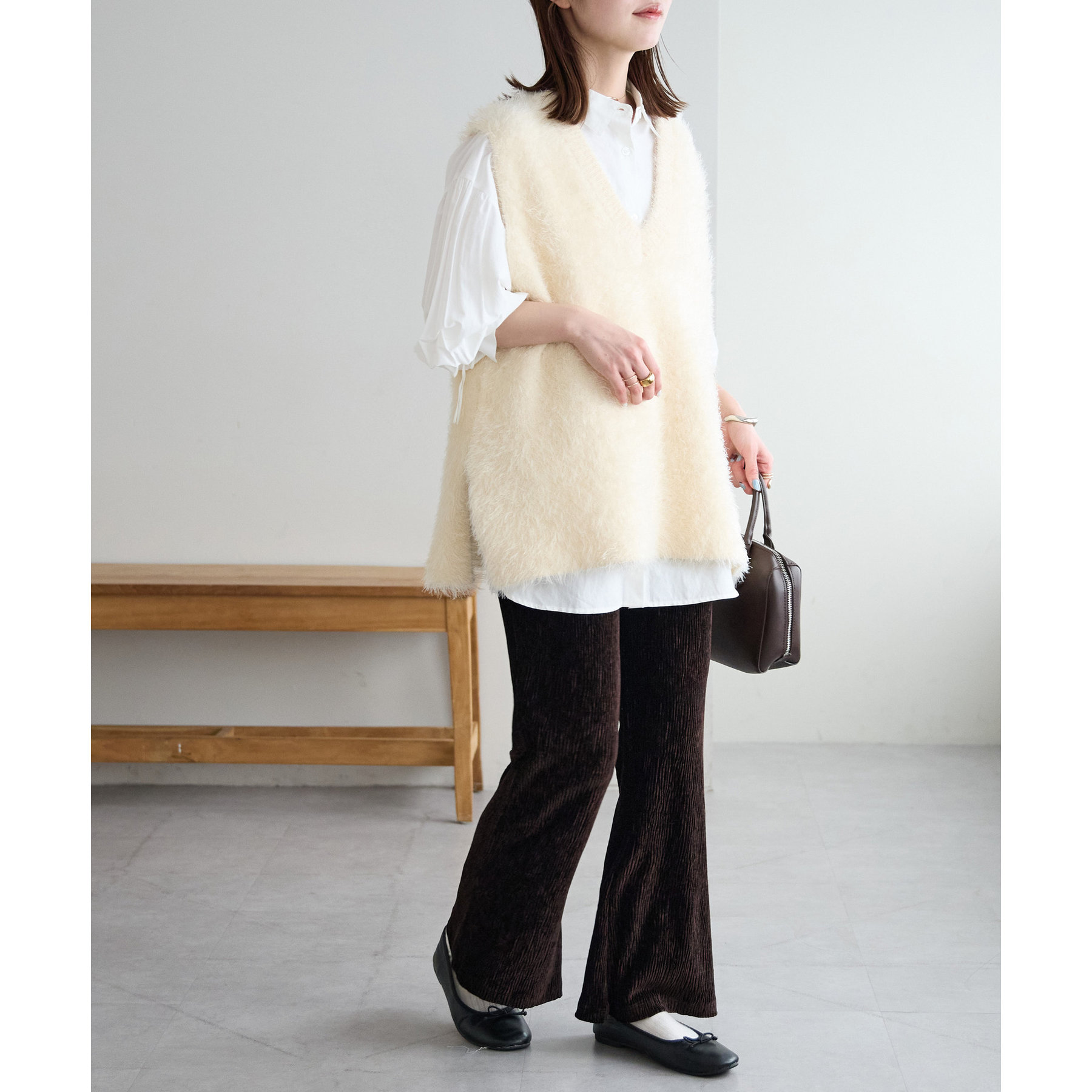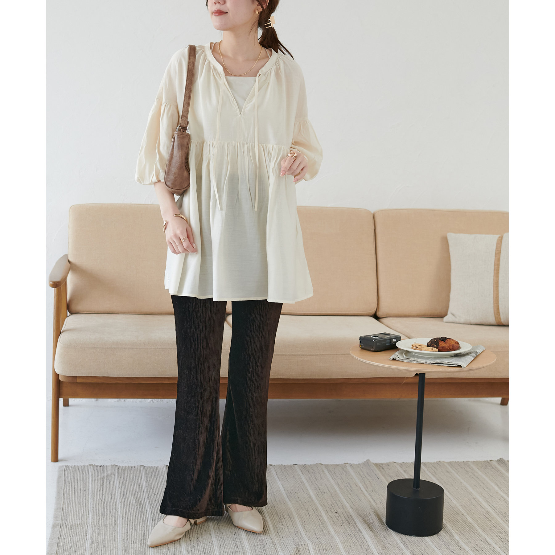 細見えするフレアパンツはゆったりとした着丈のトップスと合わせることで、メリハリ尾あるコーデが完成◎