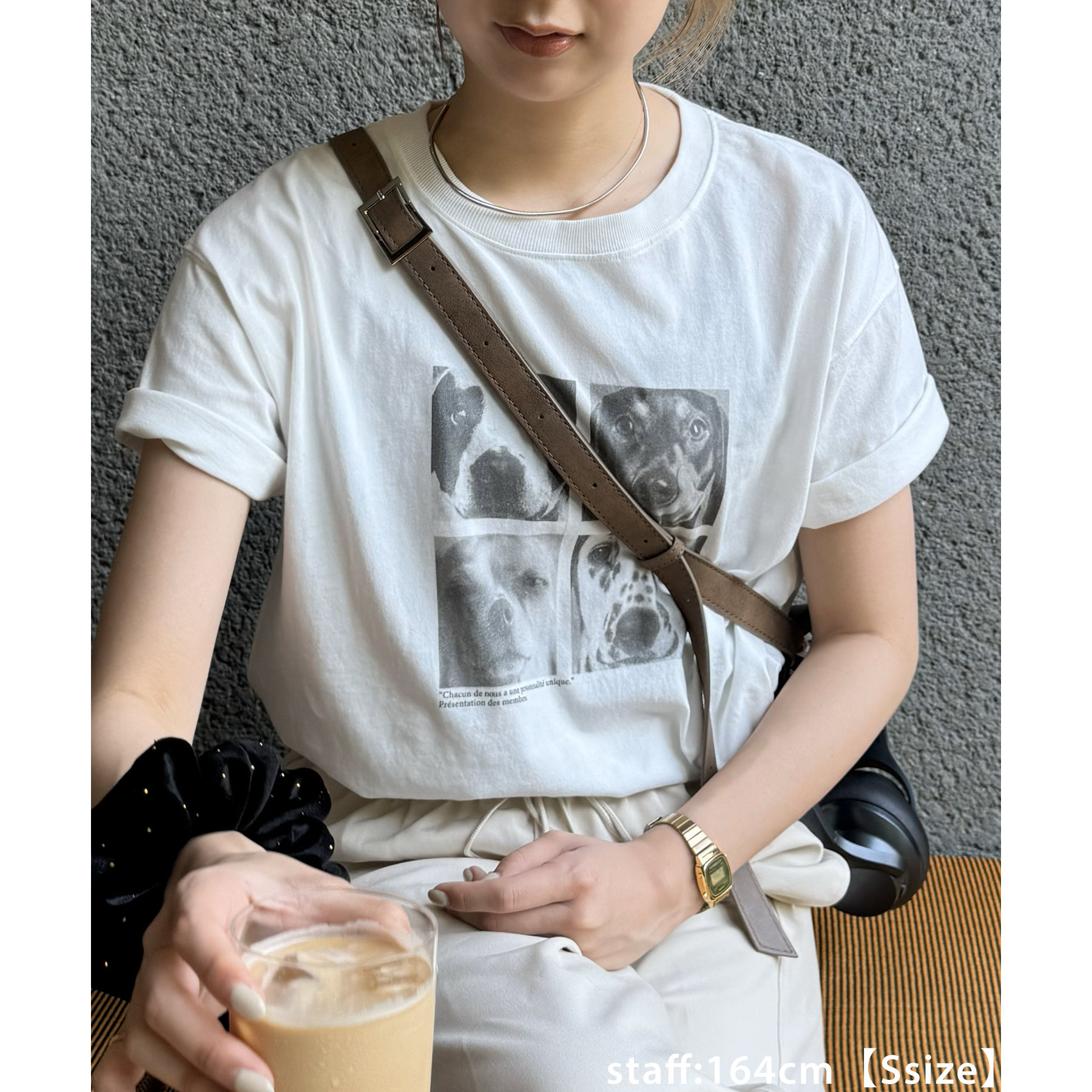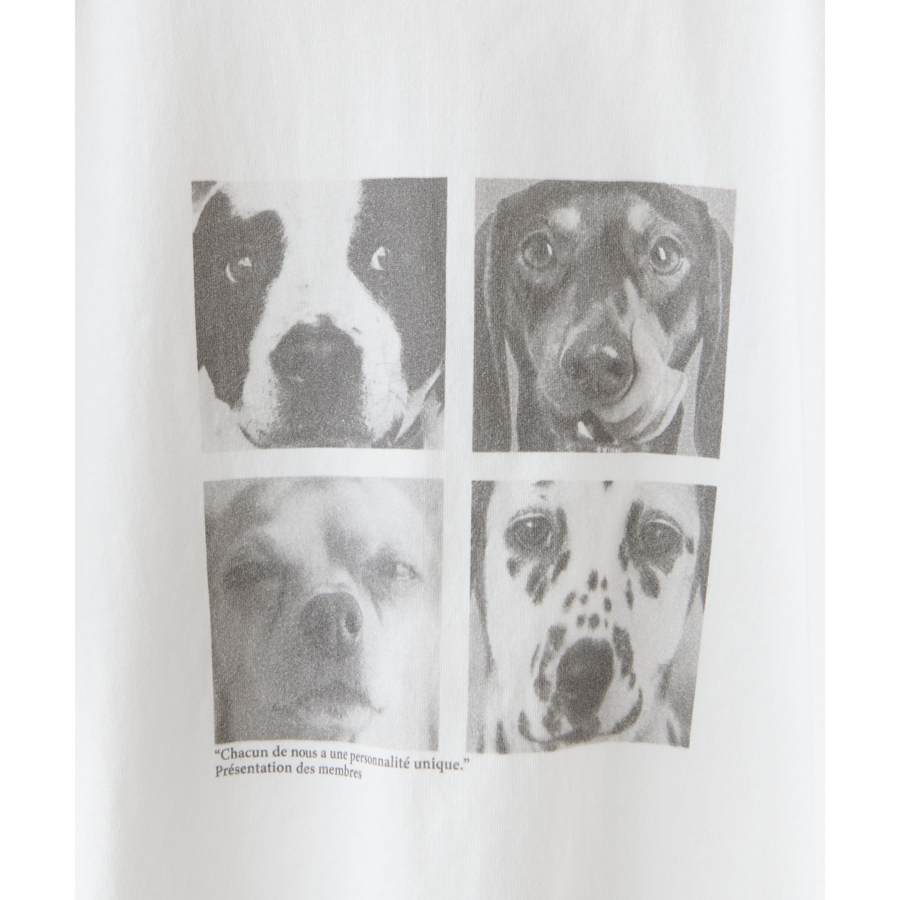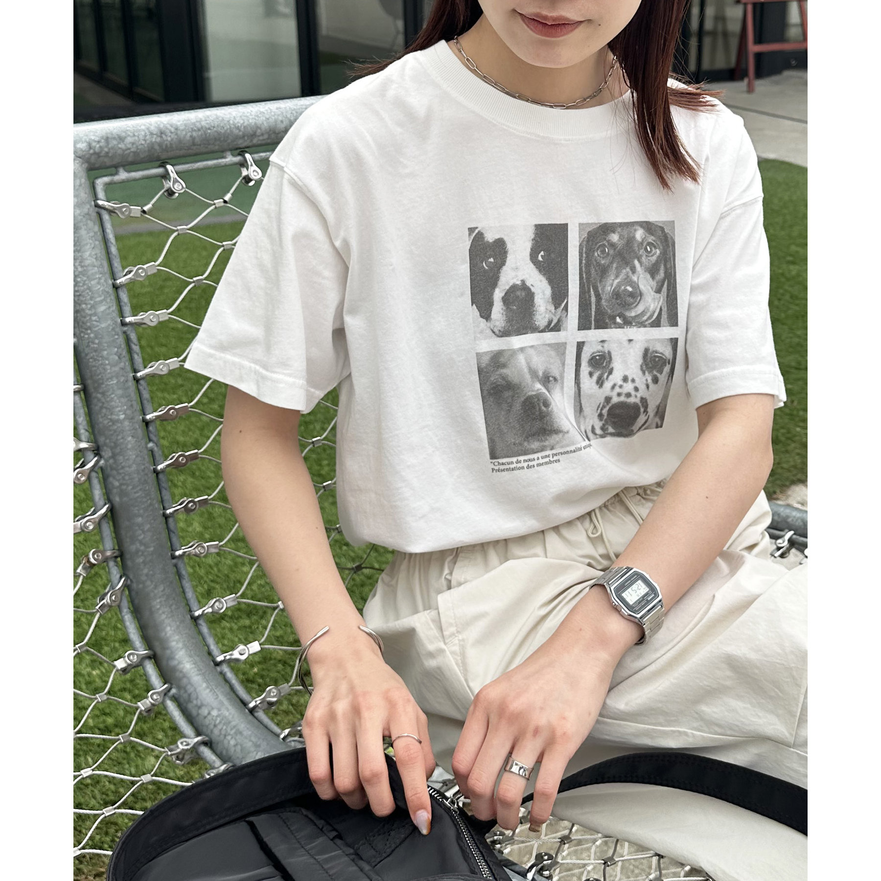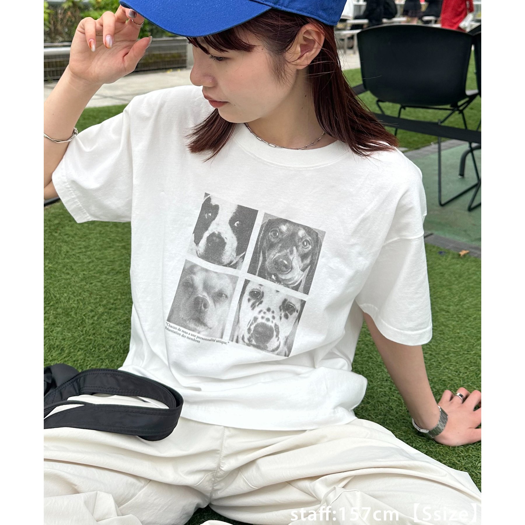 169cmメンズスタッフ(Mサイズ着用):ワンちゃんの写真が目を惹くデザインなので、シンプルなデニムと合わせてもサマになります◎また、ジャケットやシャツのインナー合わせおすすめです◎