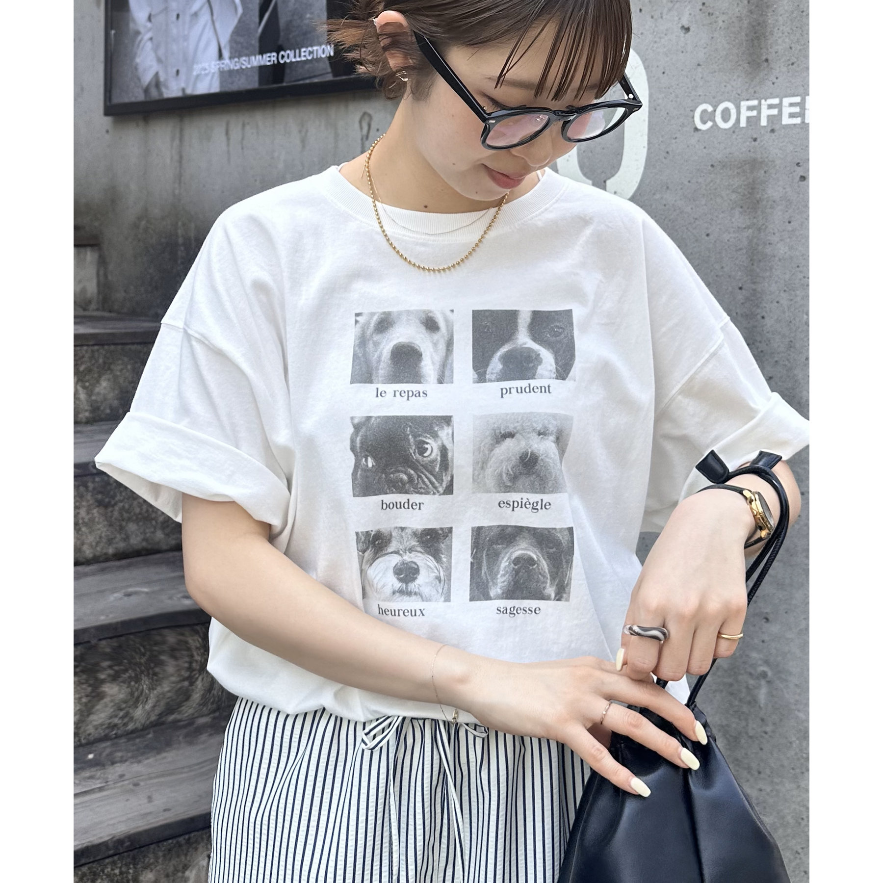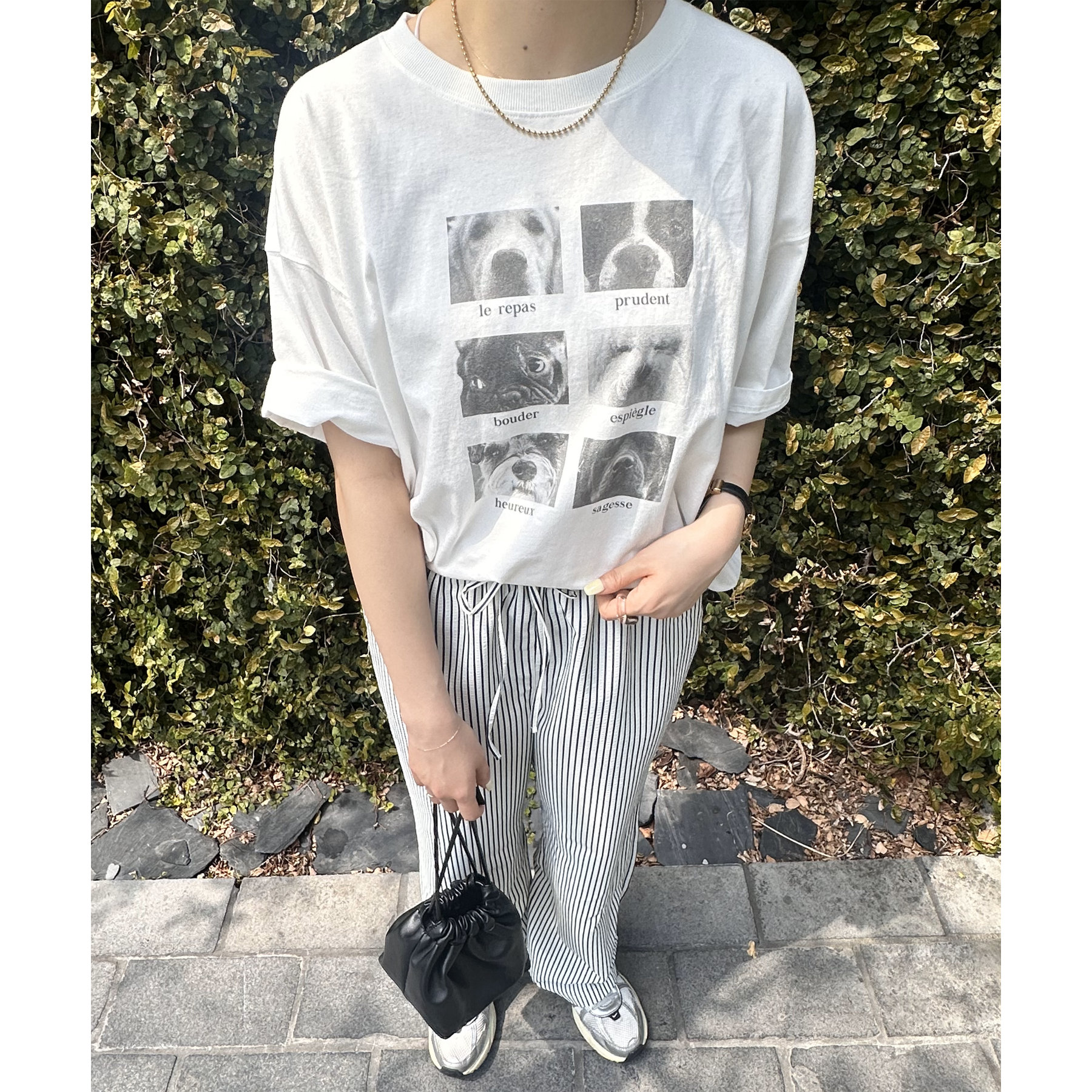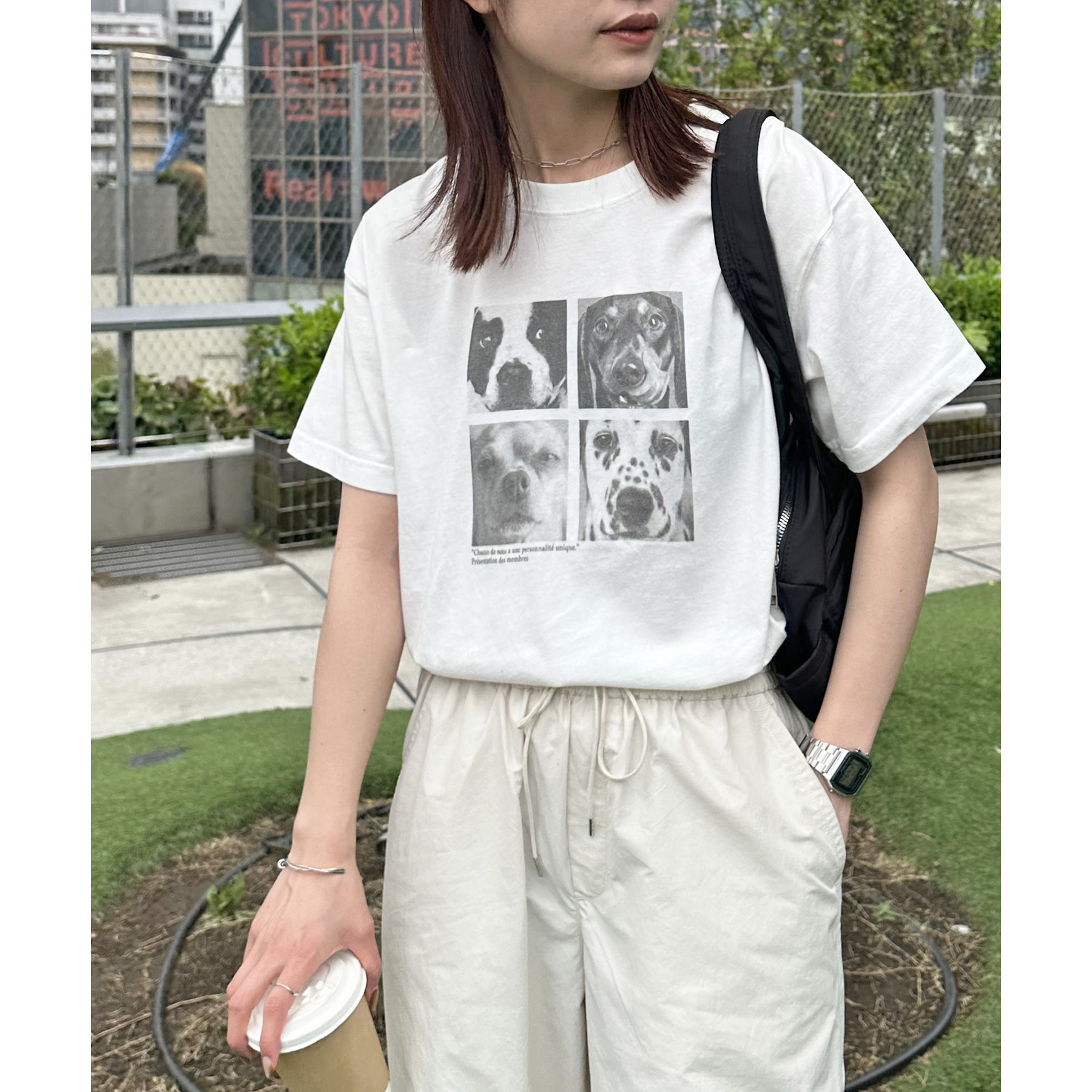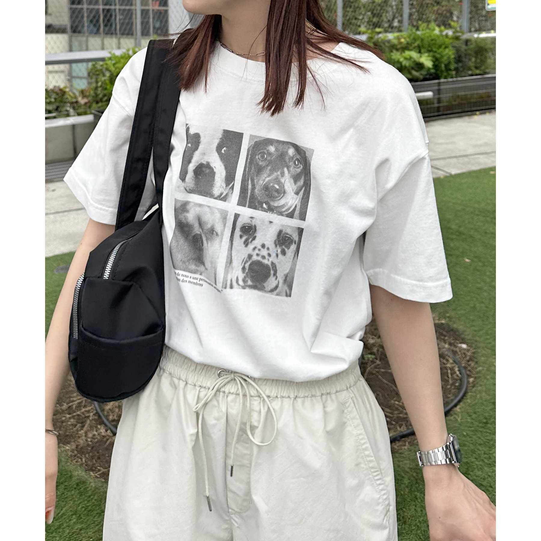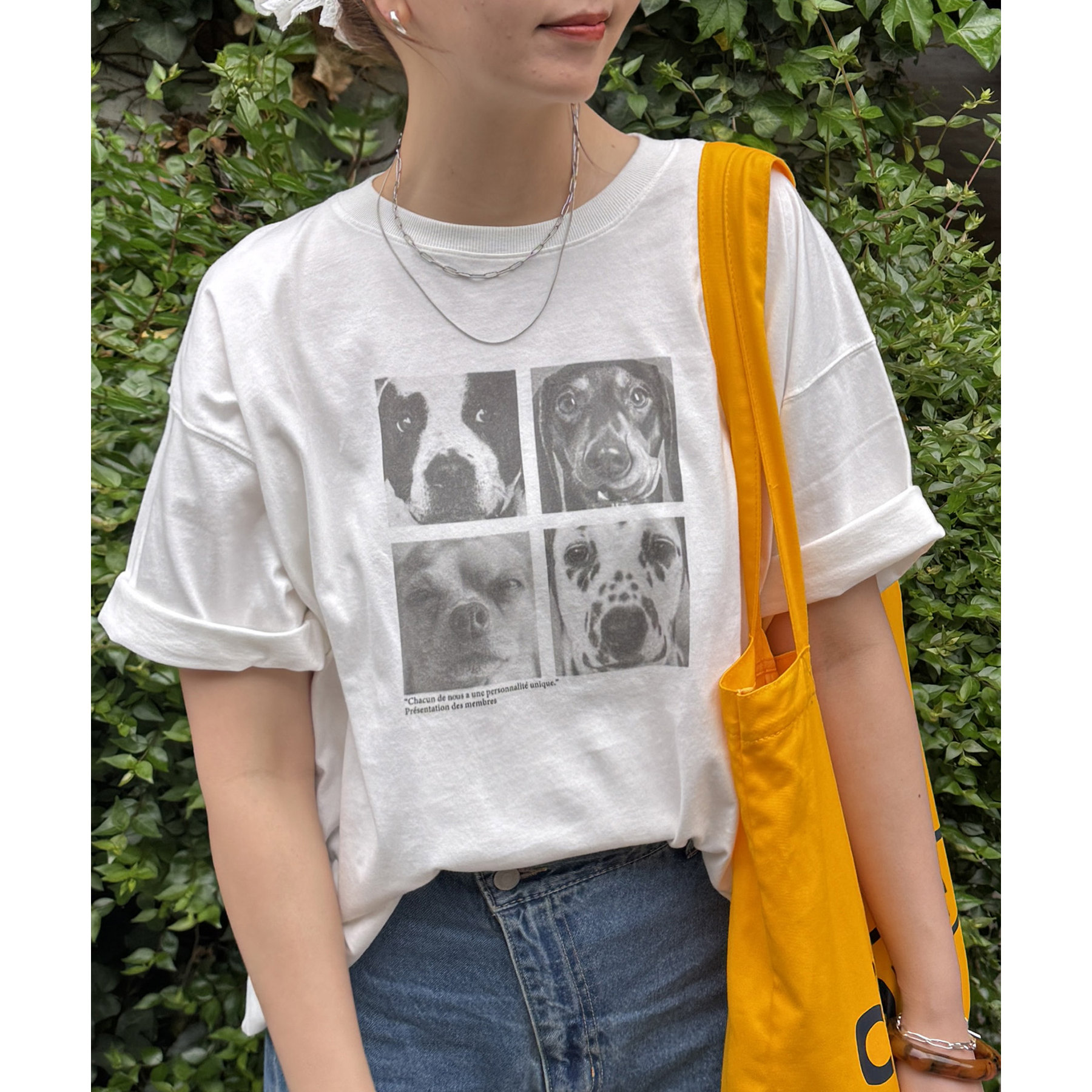 169cmメンズスタッフ(Mサイズ着用):ワンちゃんの写真が目を惹くデザインなので、シンプルなデニムと合わせてもサマになります◎また、ジャケットやシャツのインナー合わせおすすめです◎