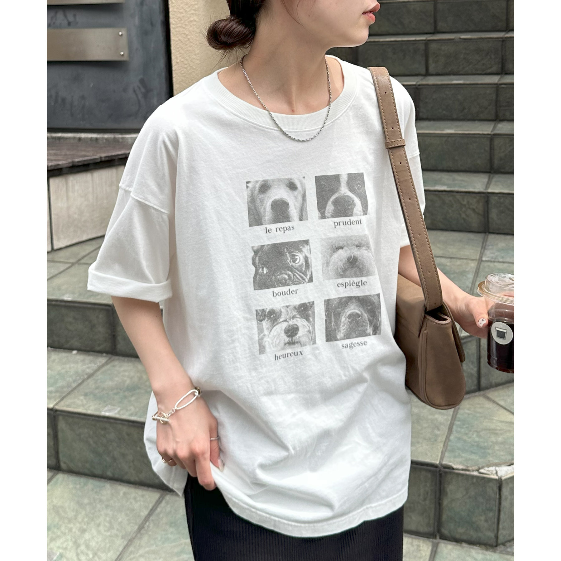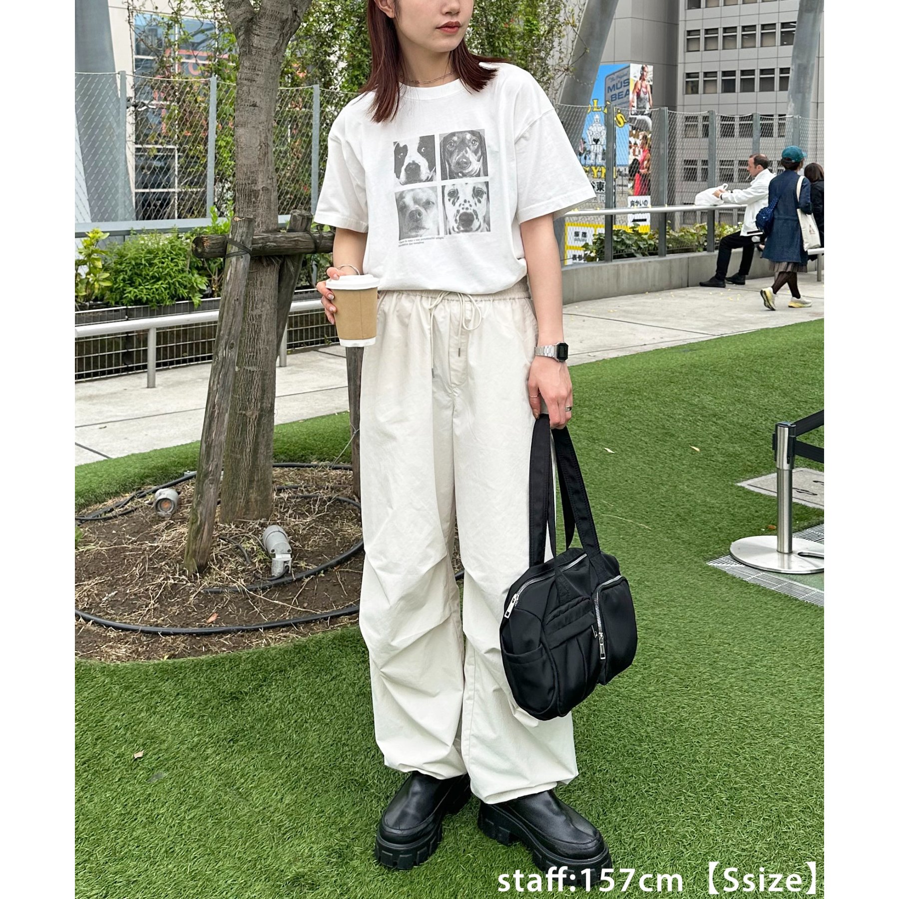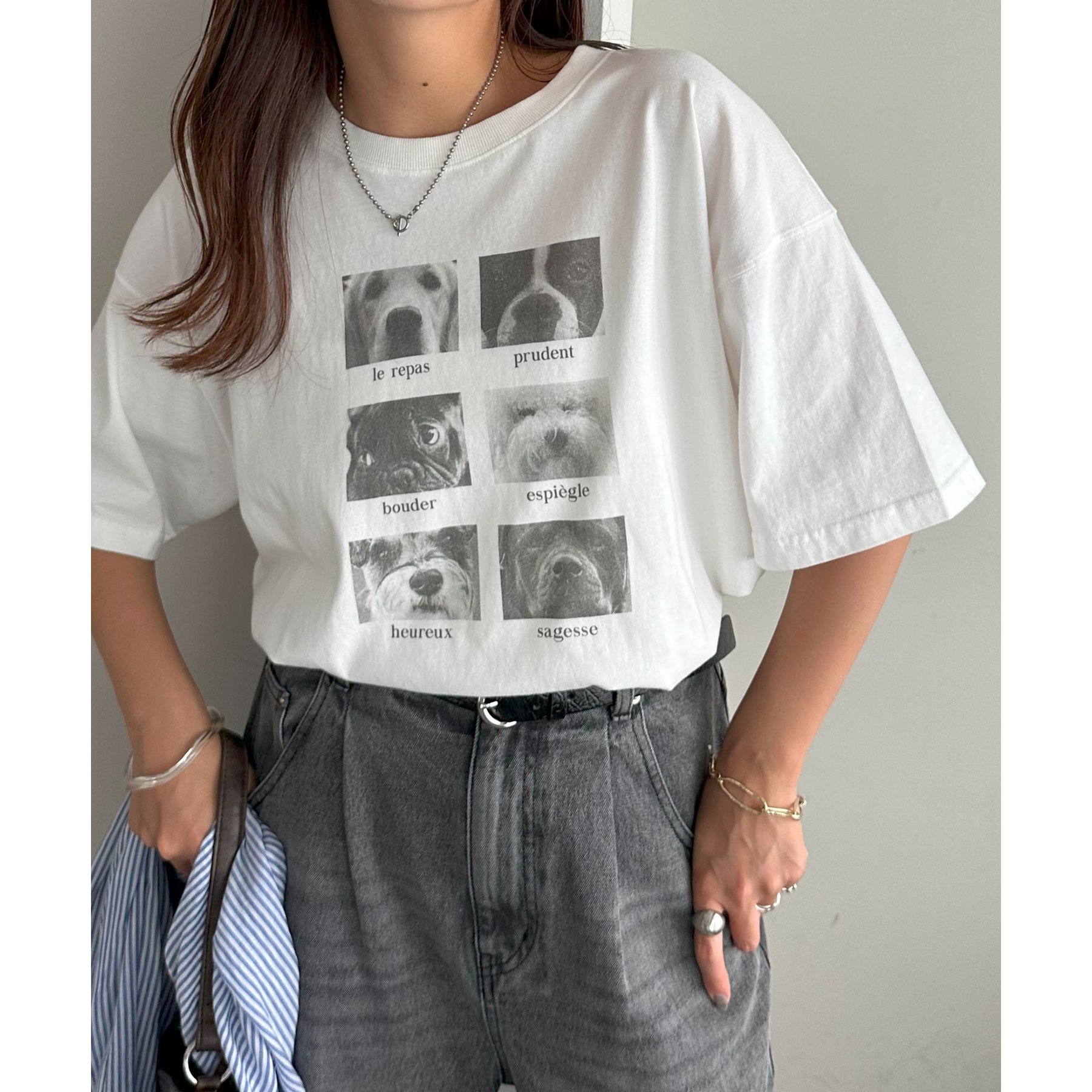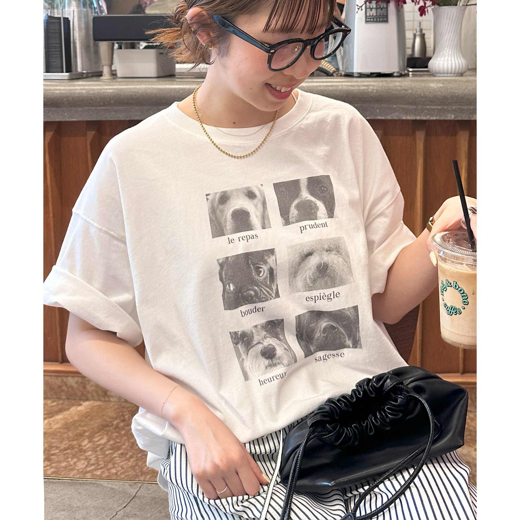 169cmメンズスタッフ(Mサイズ着用):ワンちゃんの写真が目を惹くデザインなので、シンプルなデニムと合わせてもサマになります◎また、ジャケットやシャツのインナー合わせおすすめです◎