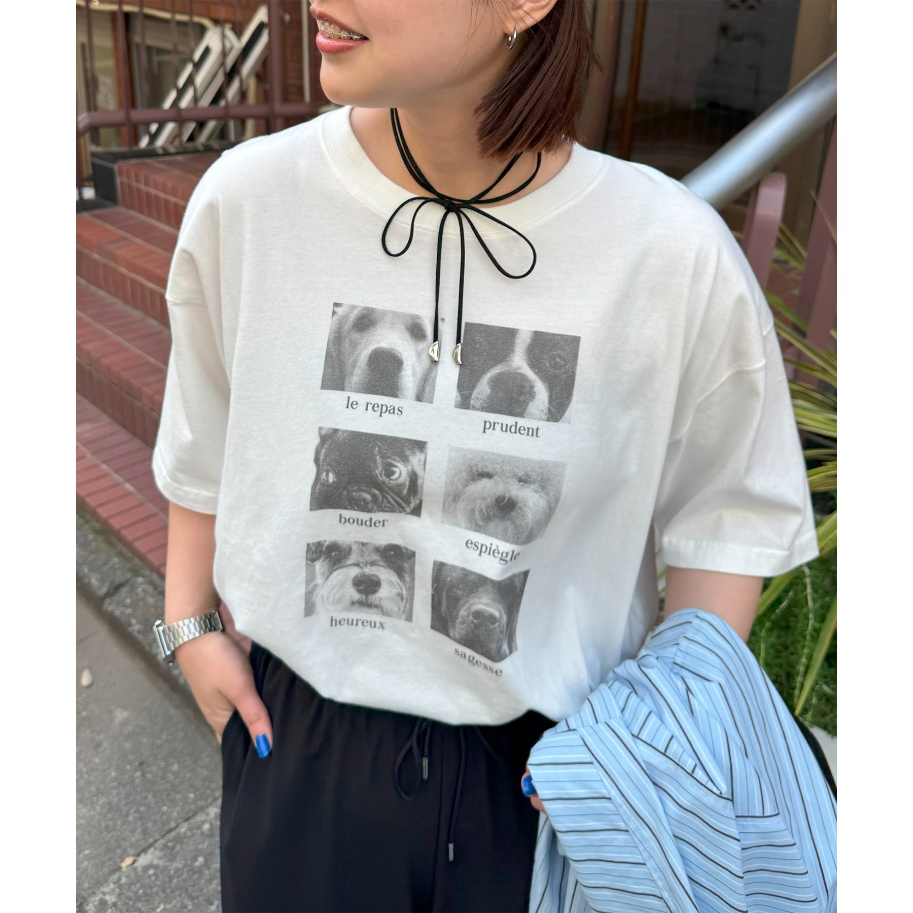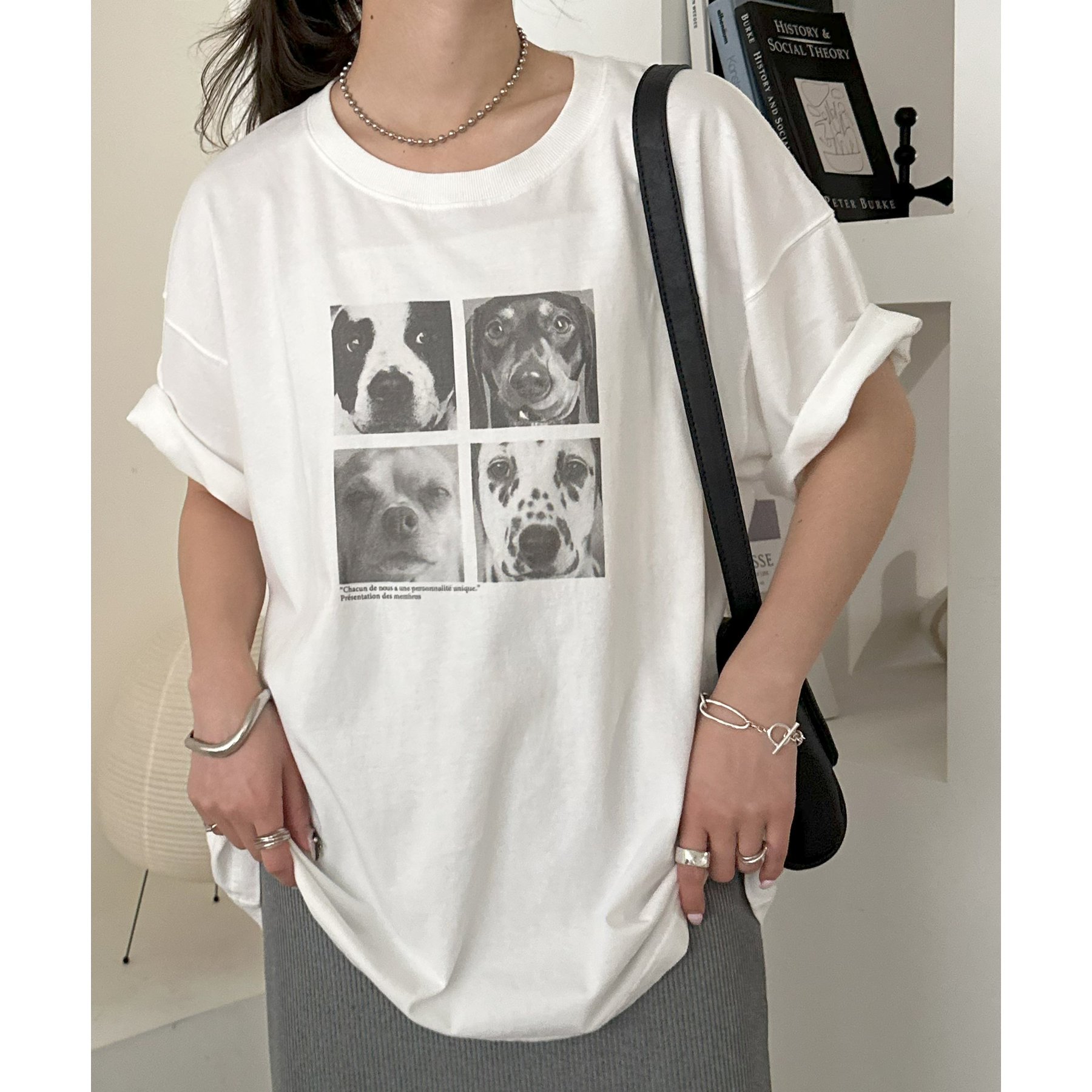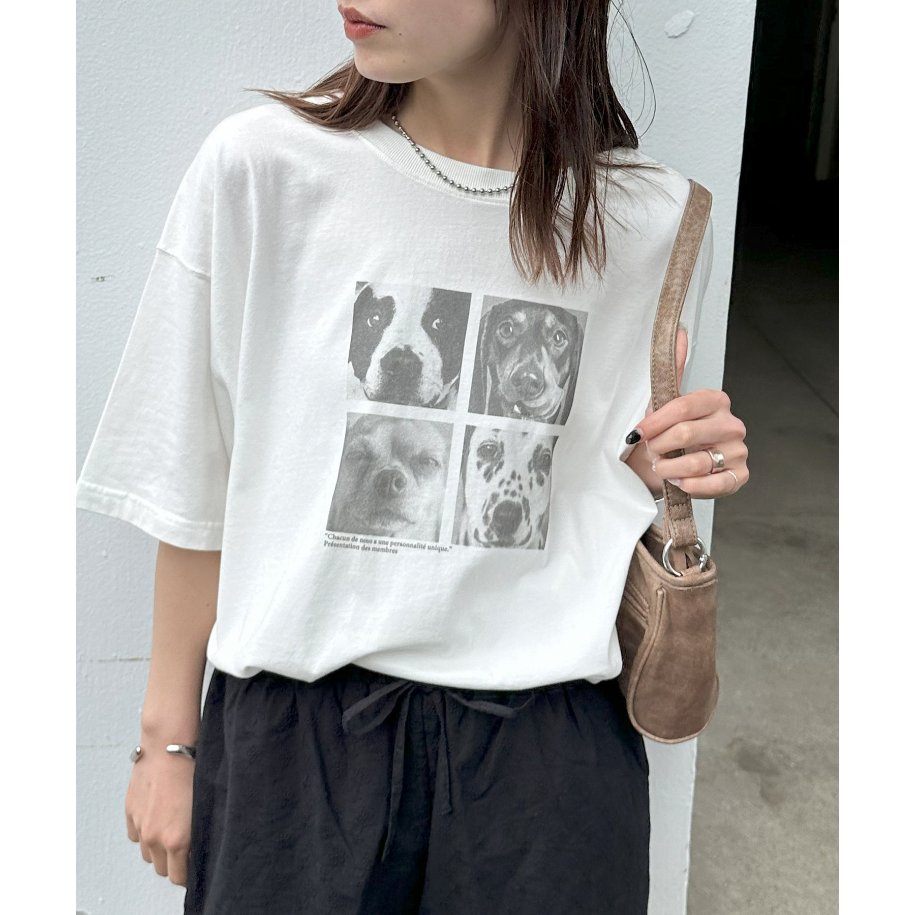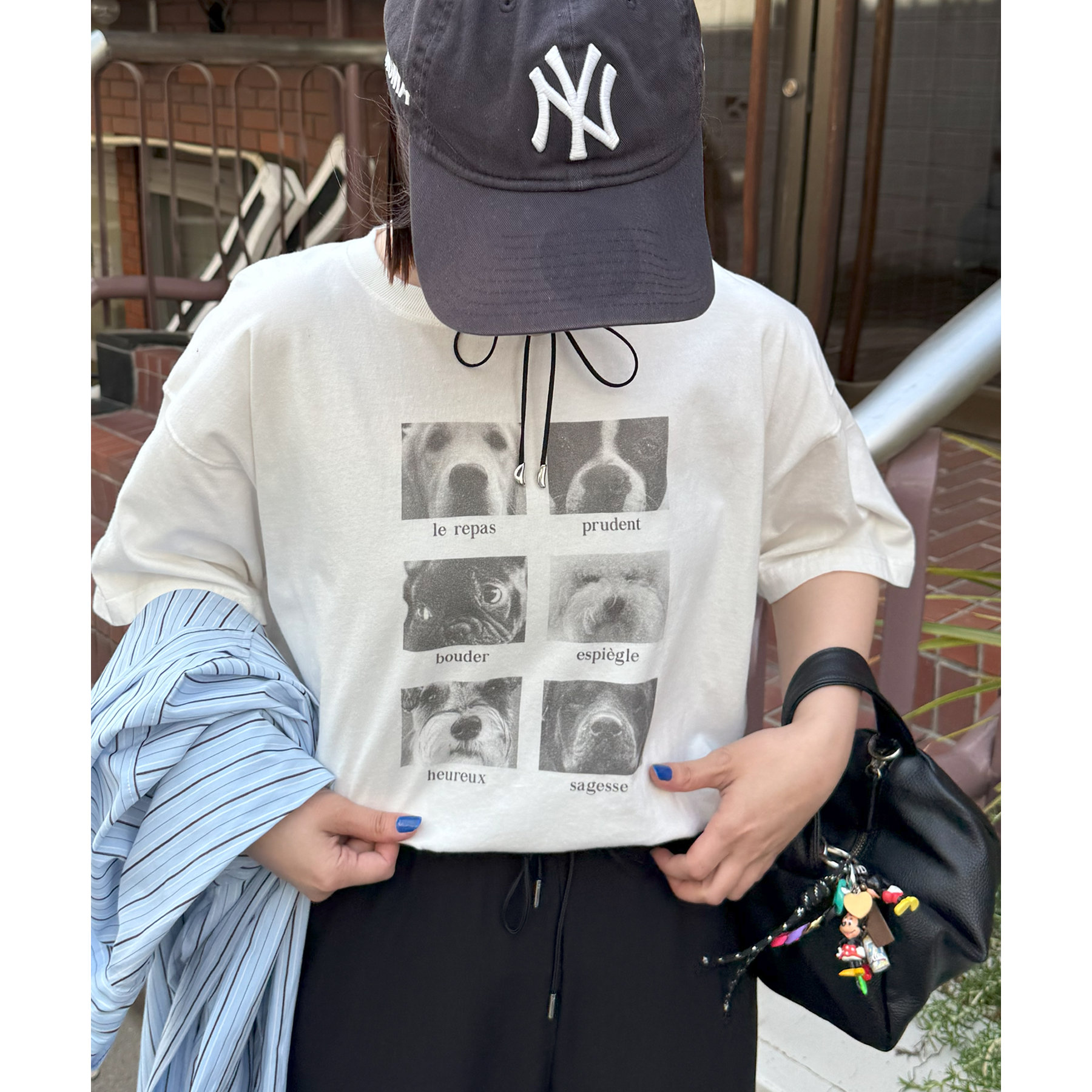 胸元に施されたワンちゃんの写真は、シンプルながらも存在感があり、コーデのアクセントに!