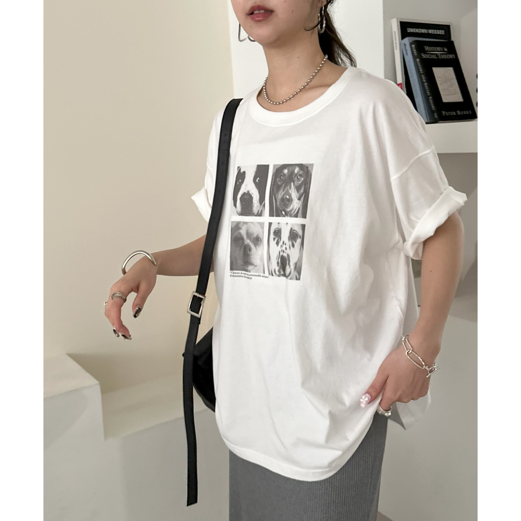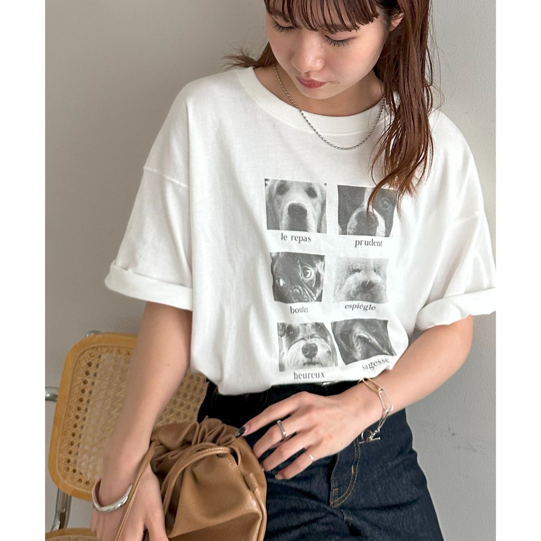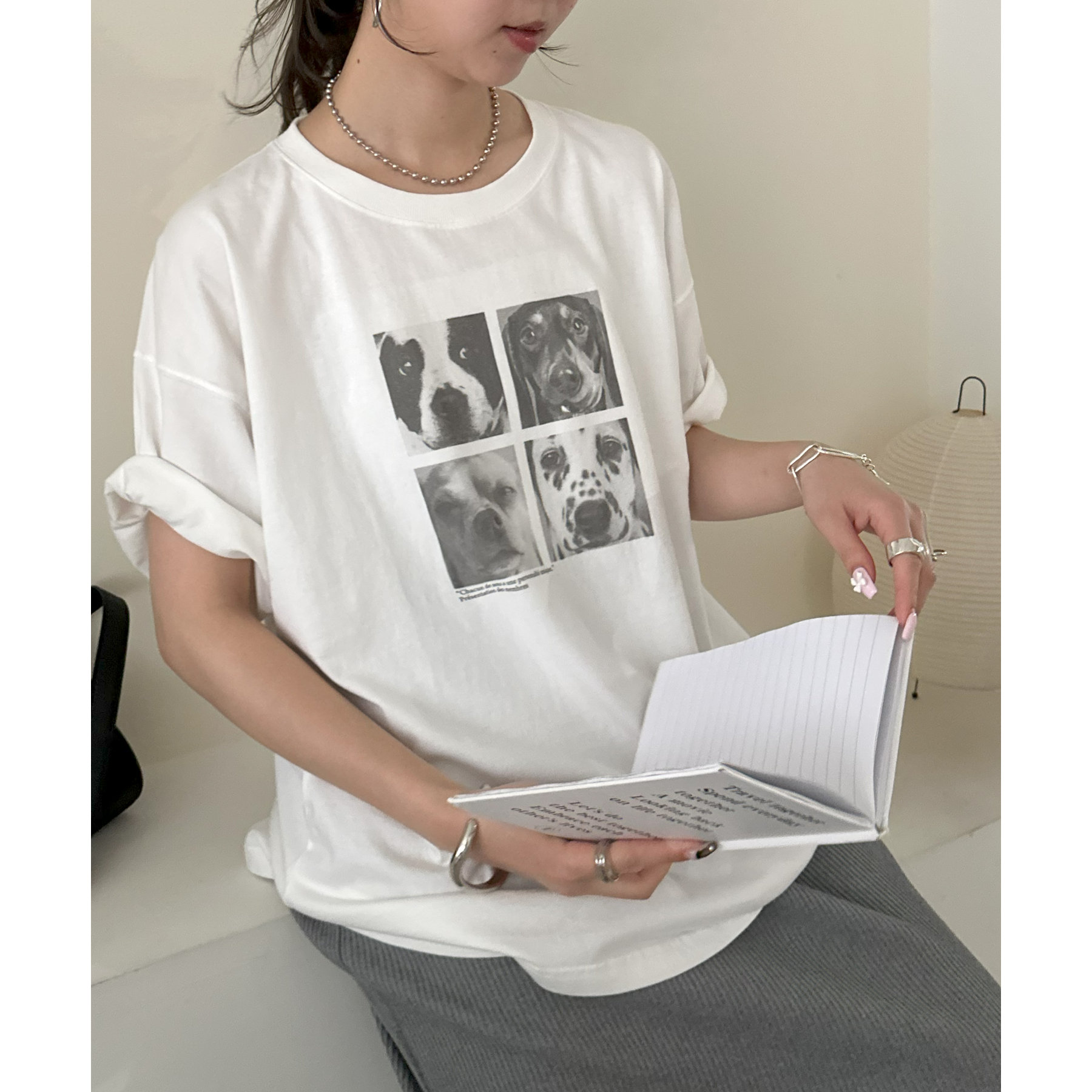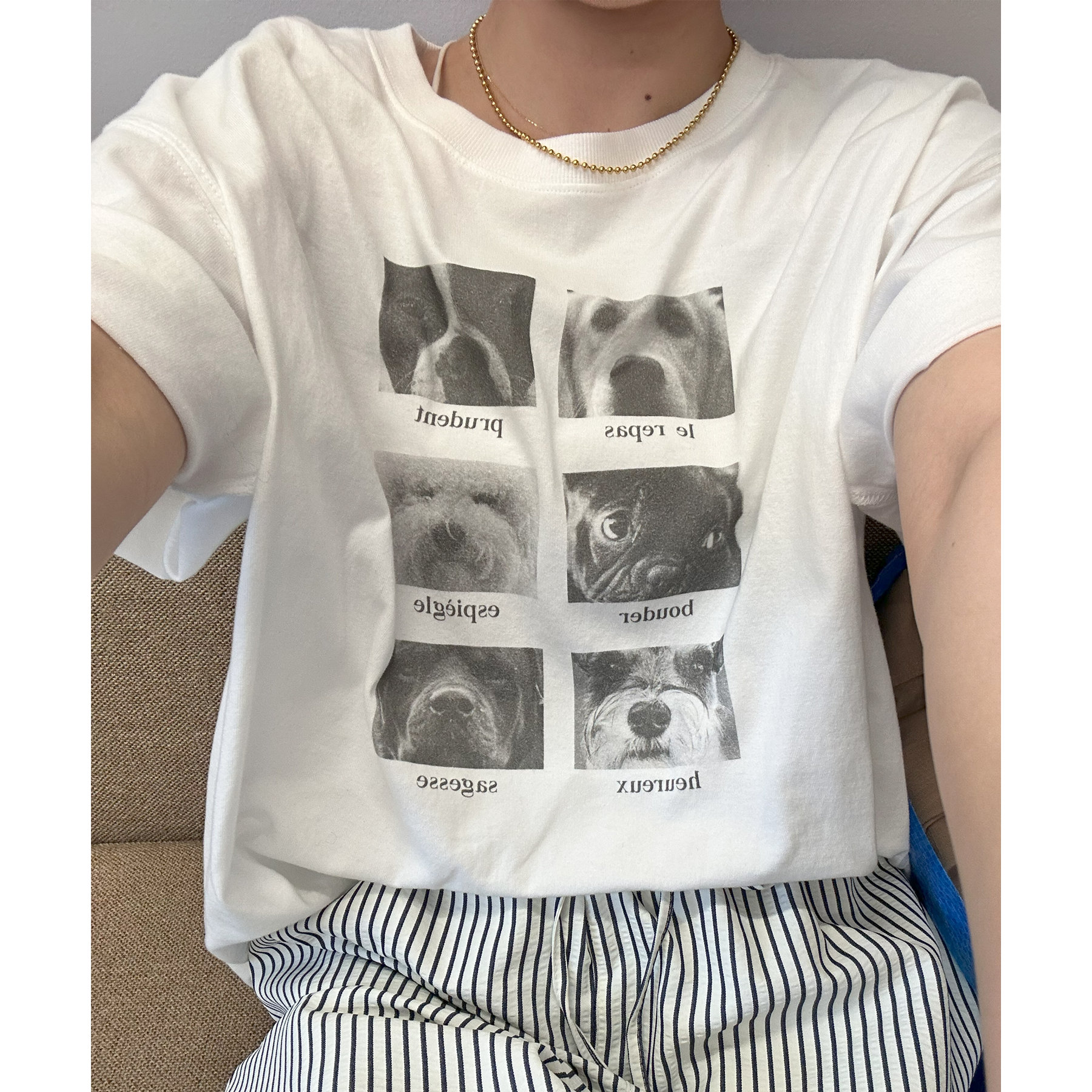 胸元に施されたワンちゃんの写真は、シンプルながらも存在感があり、コーデのアクセントに!