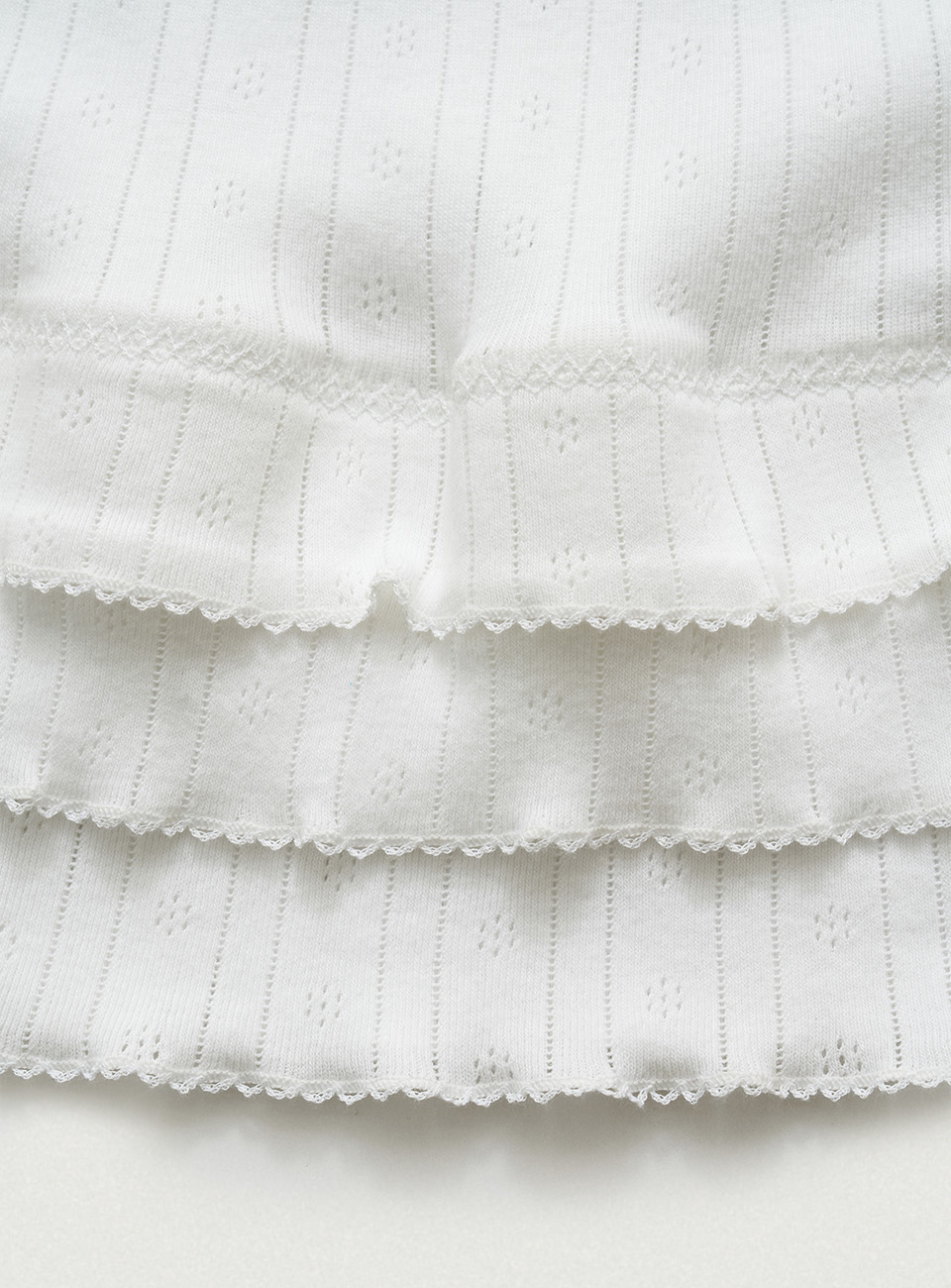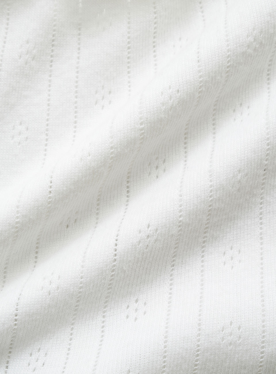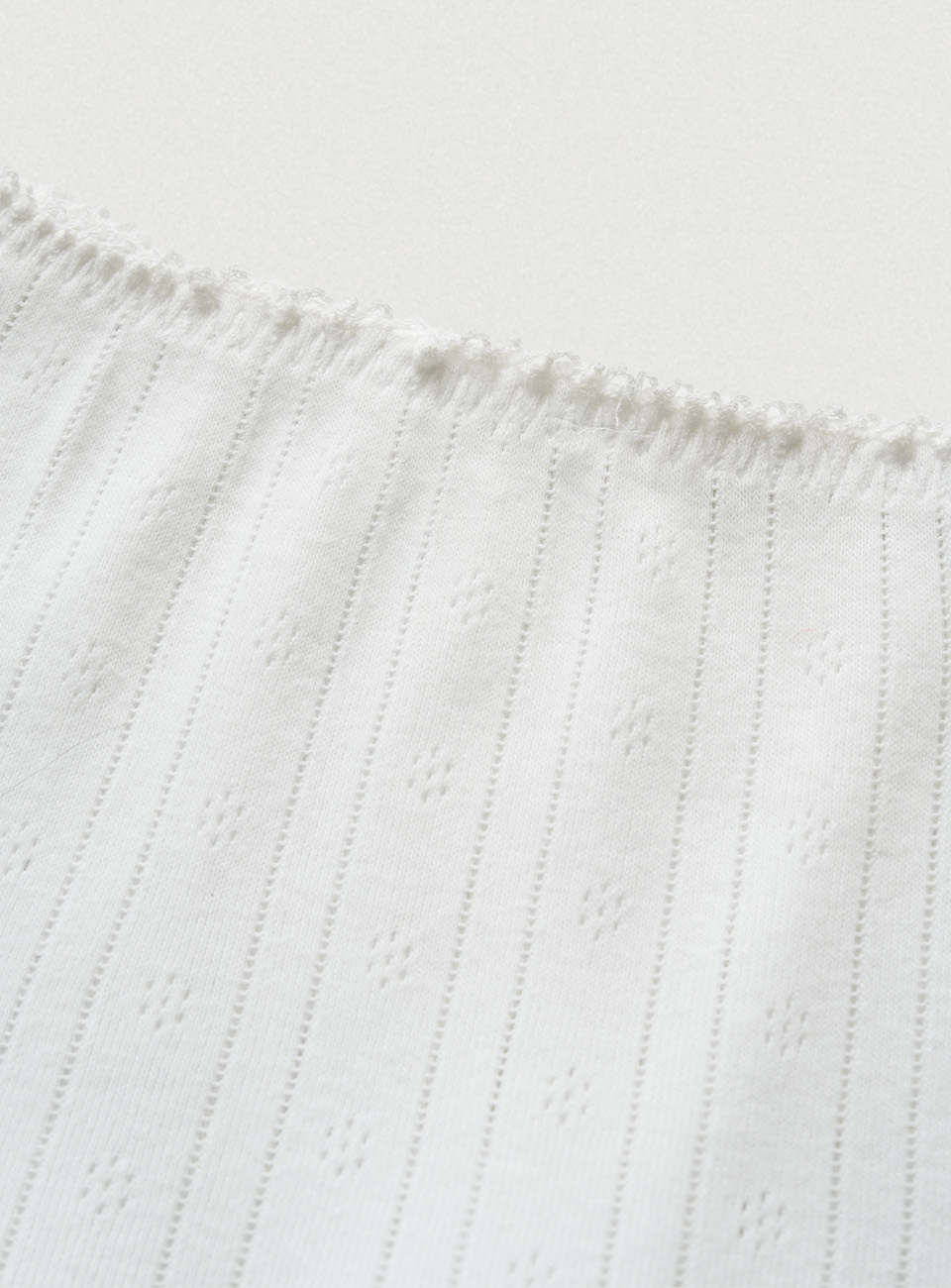 "アイボリーカラーのアイレット特有のテクスチャーと、軽やかで柔らかさが際立つコットンニットファブリック。