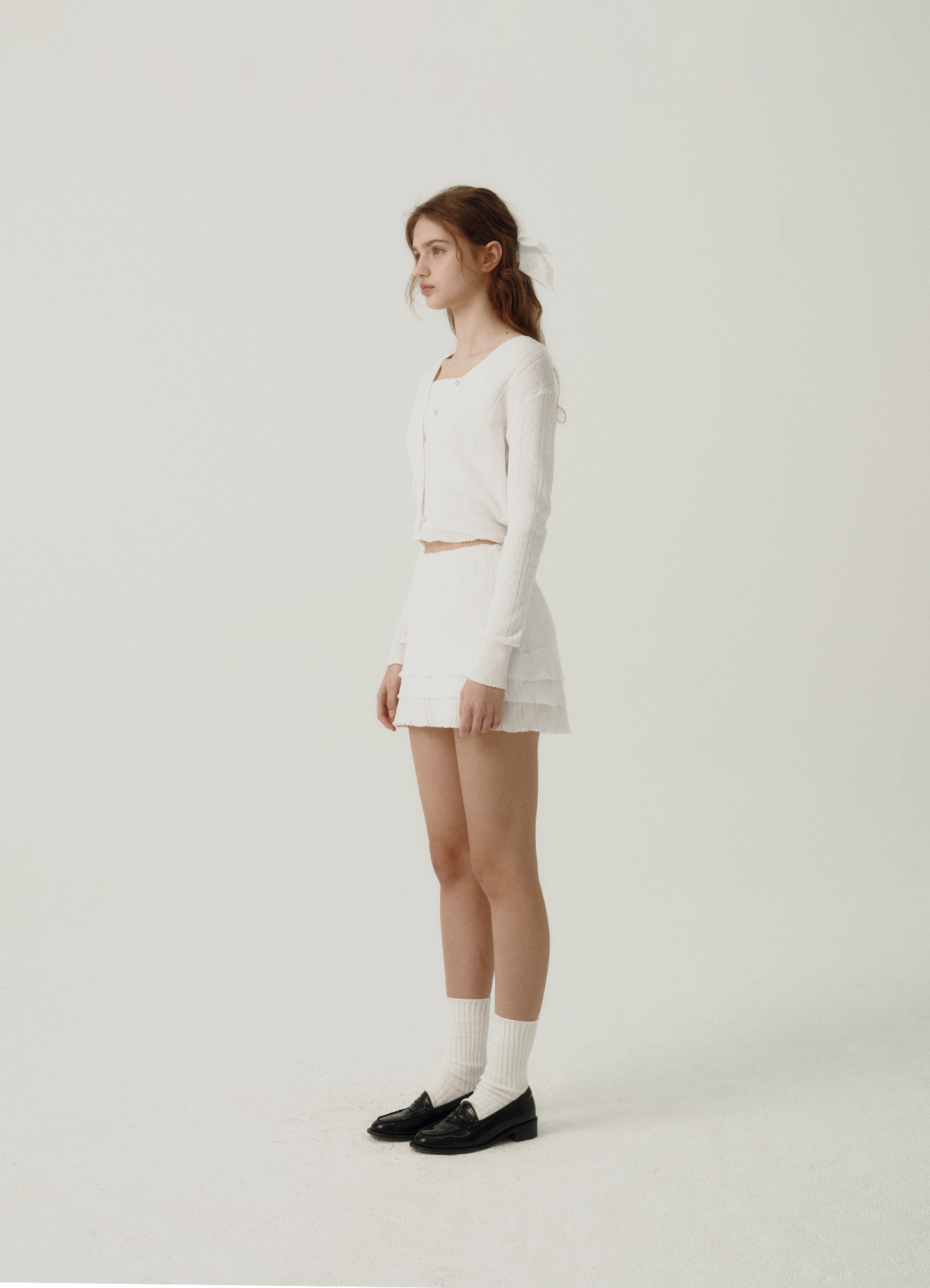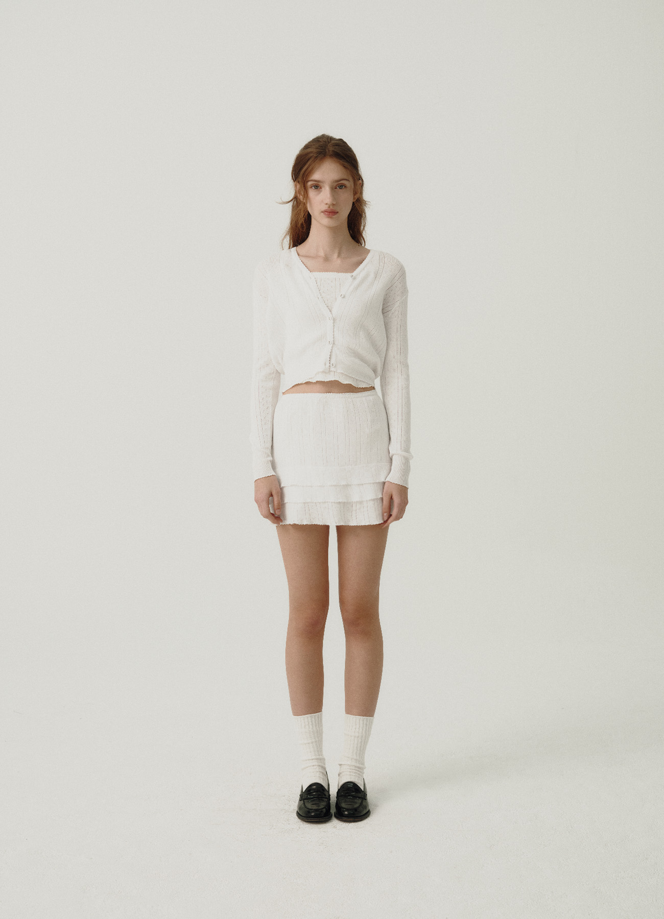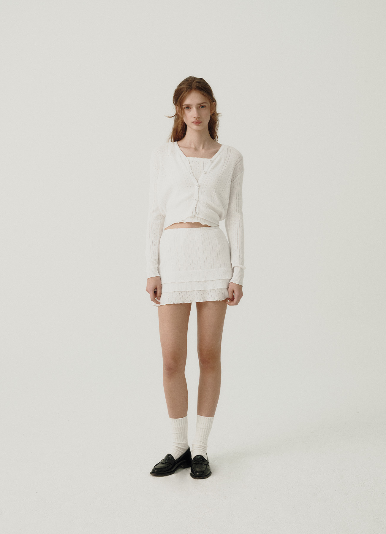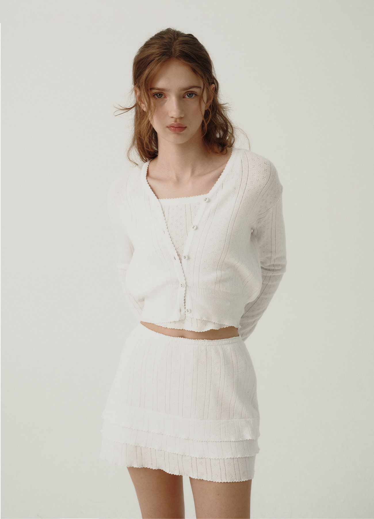"アイボリーカラーのアイレット特有のテクスチャーと、軽やかで柔らかさが際立つコットンニットファブリック。
