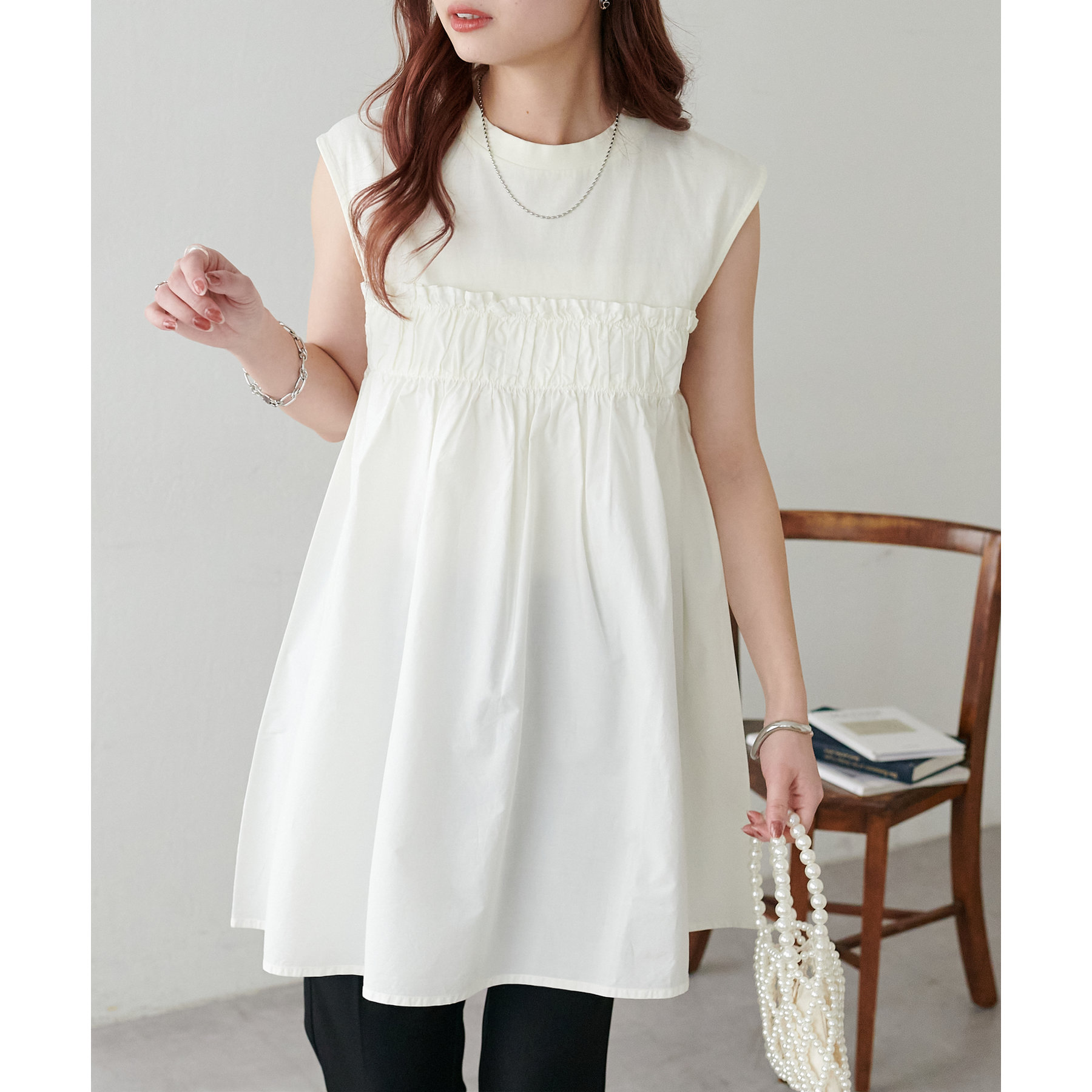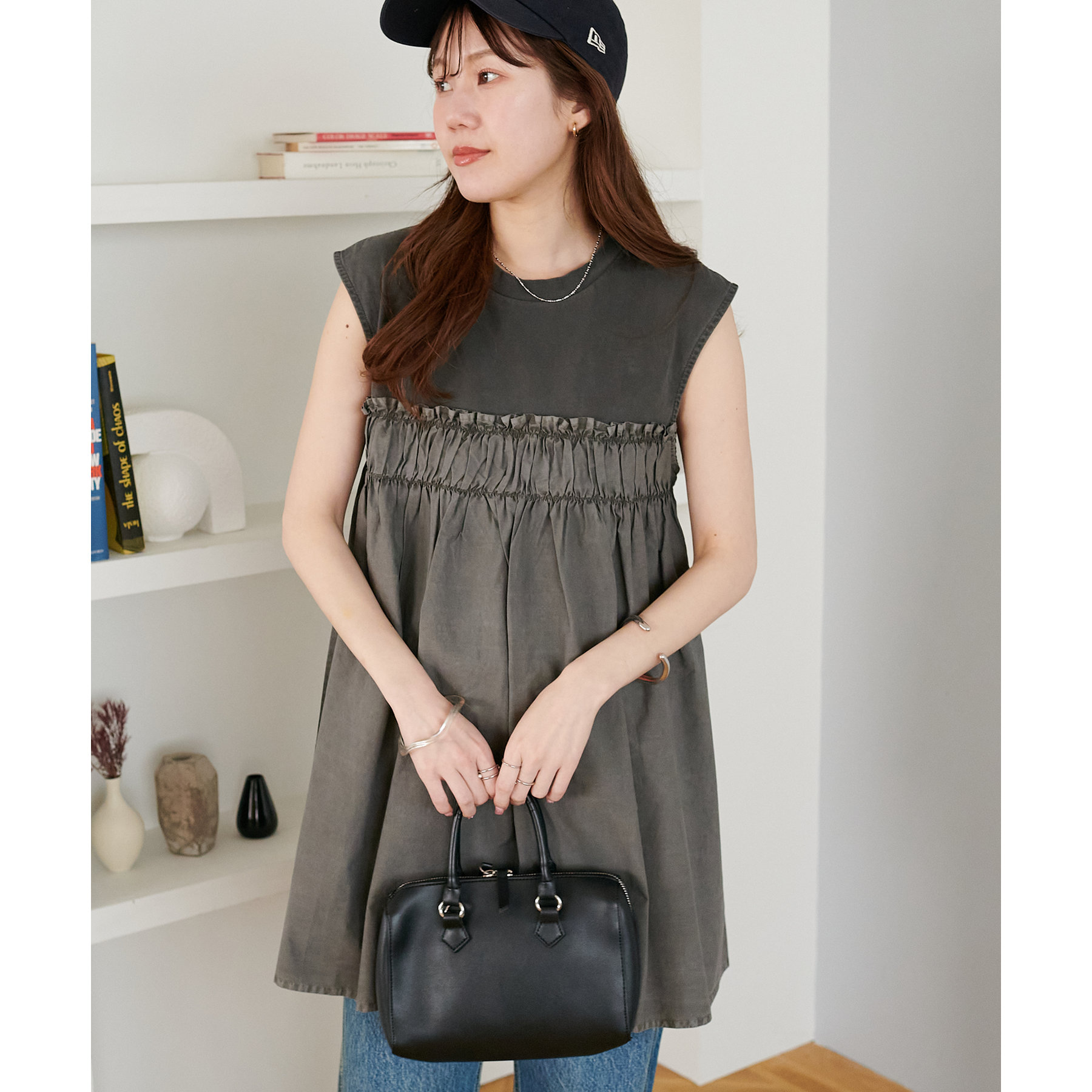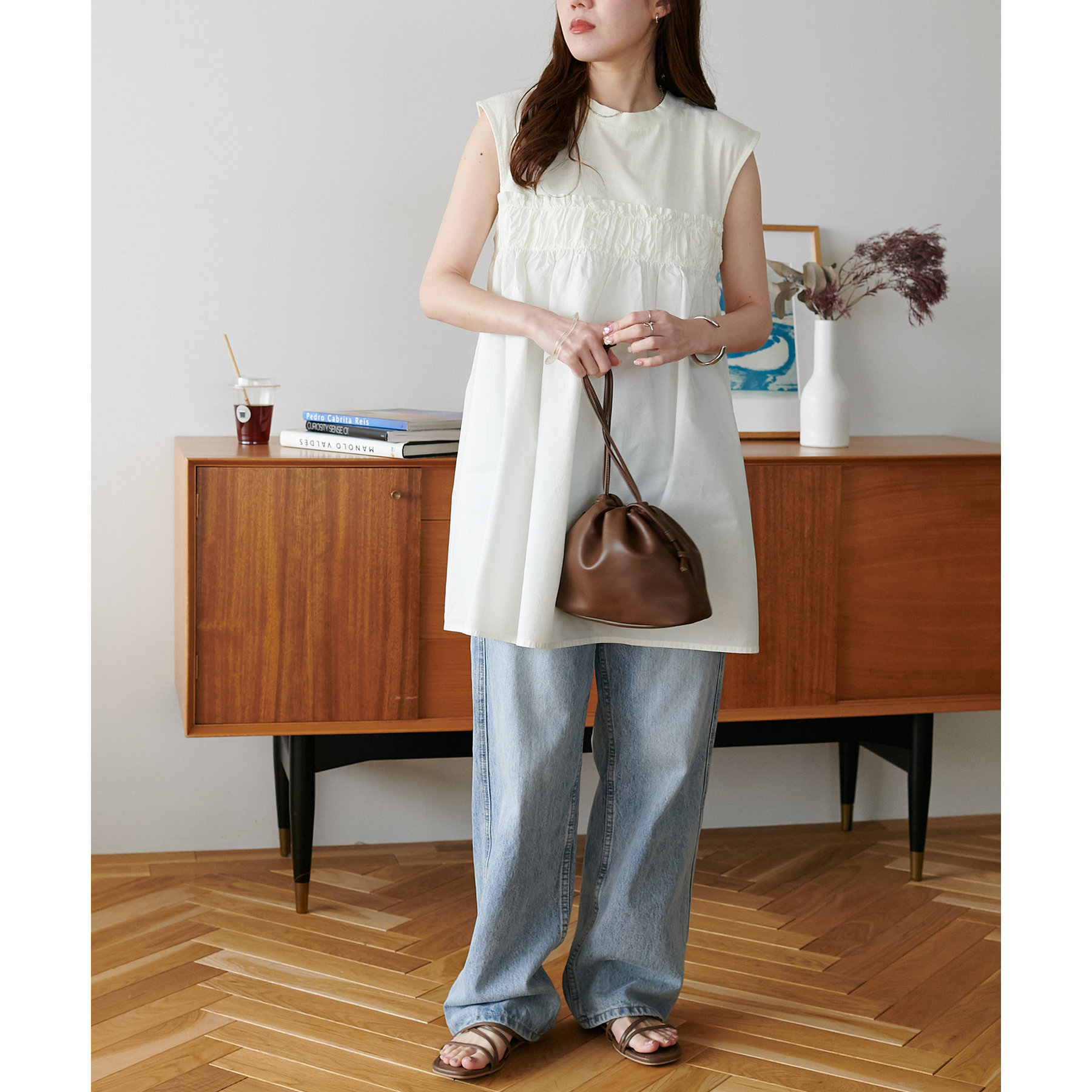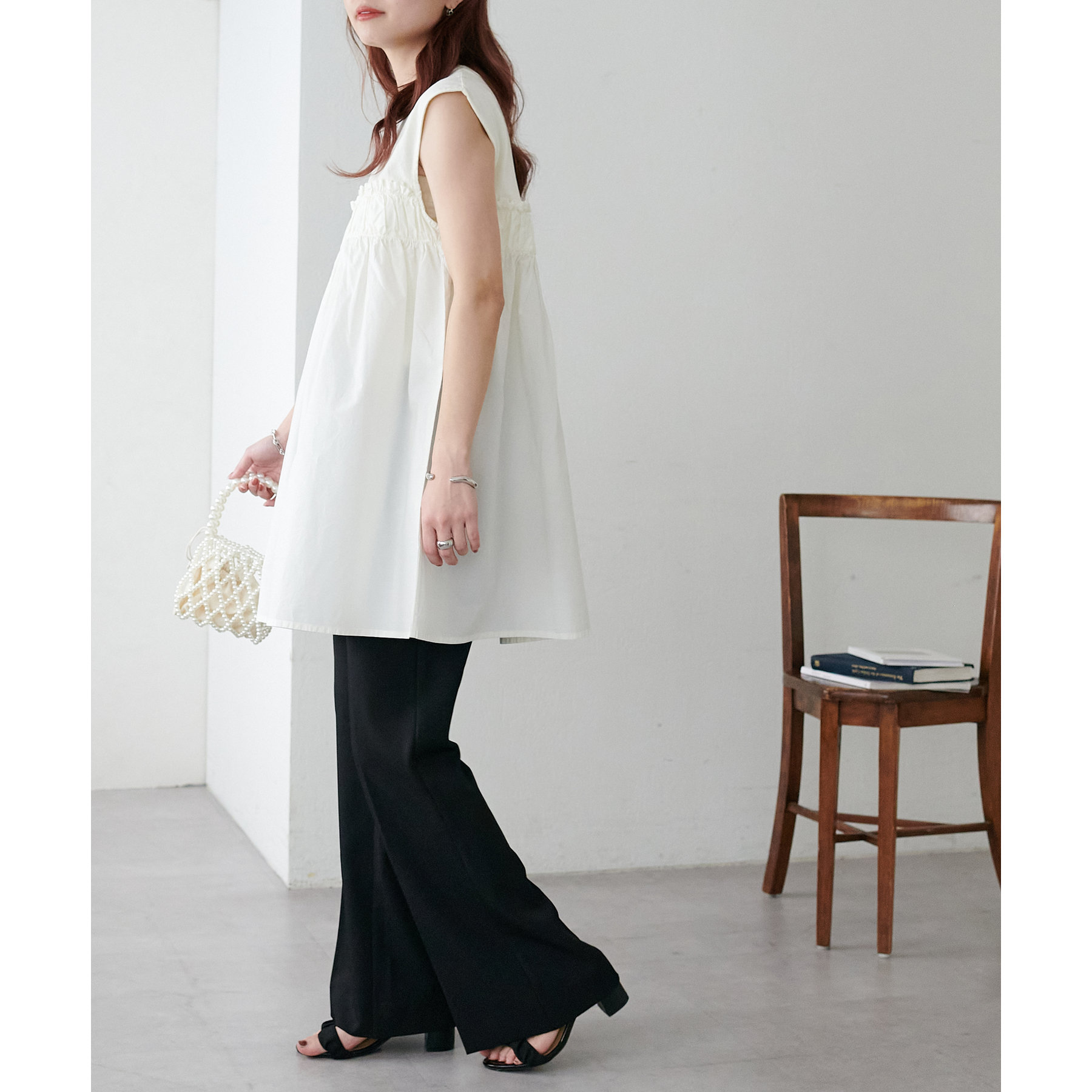 胸元のギャザーが、女性らしい柔らかな印象を与え、メリハリのある印象に!
