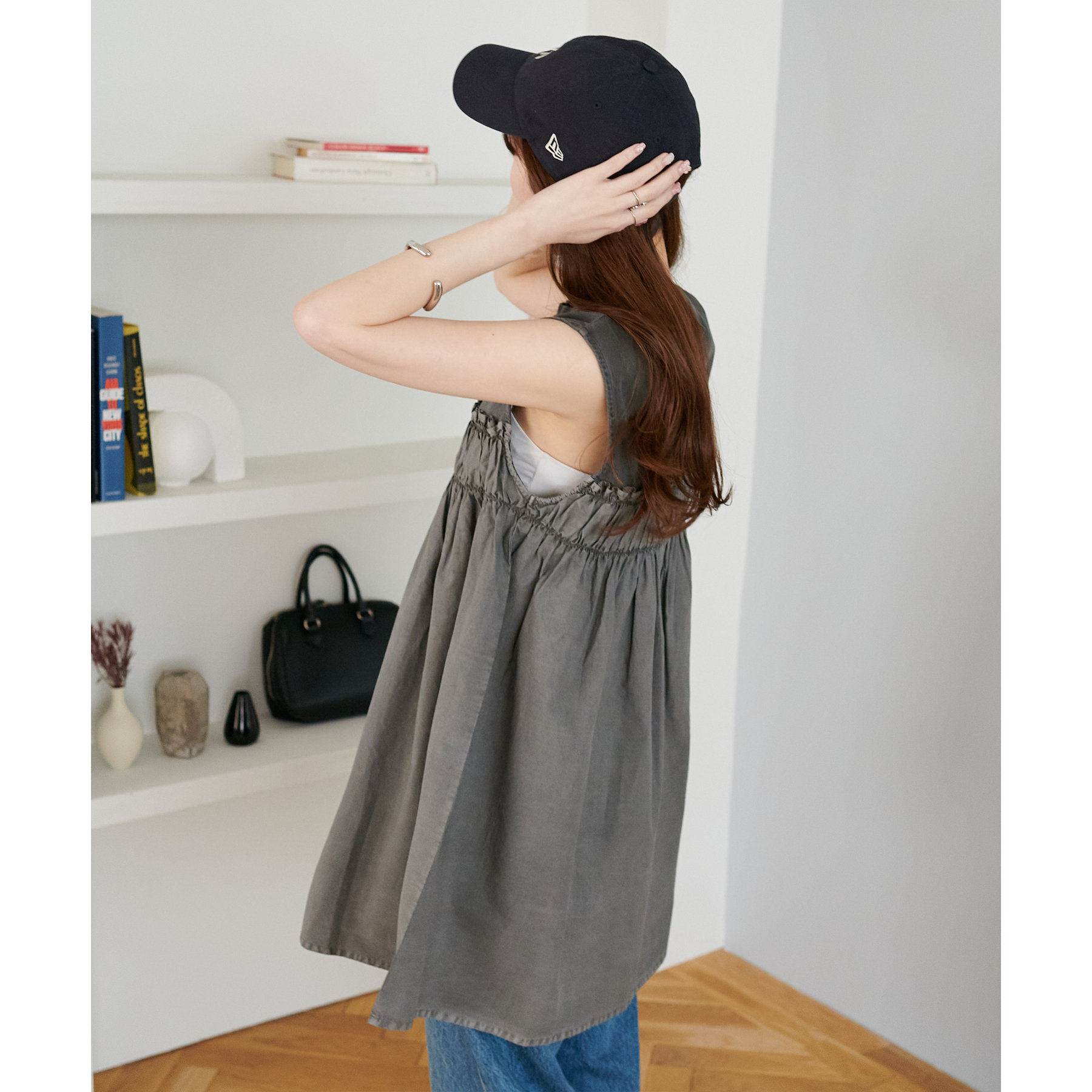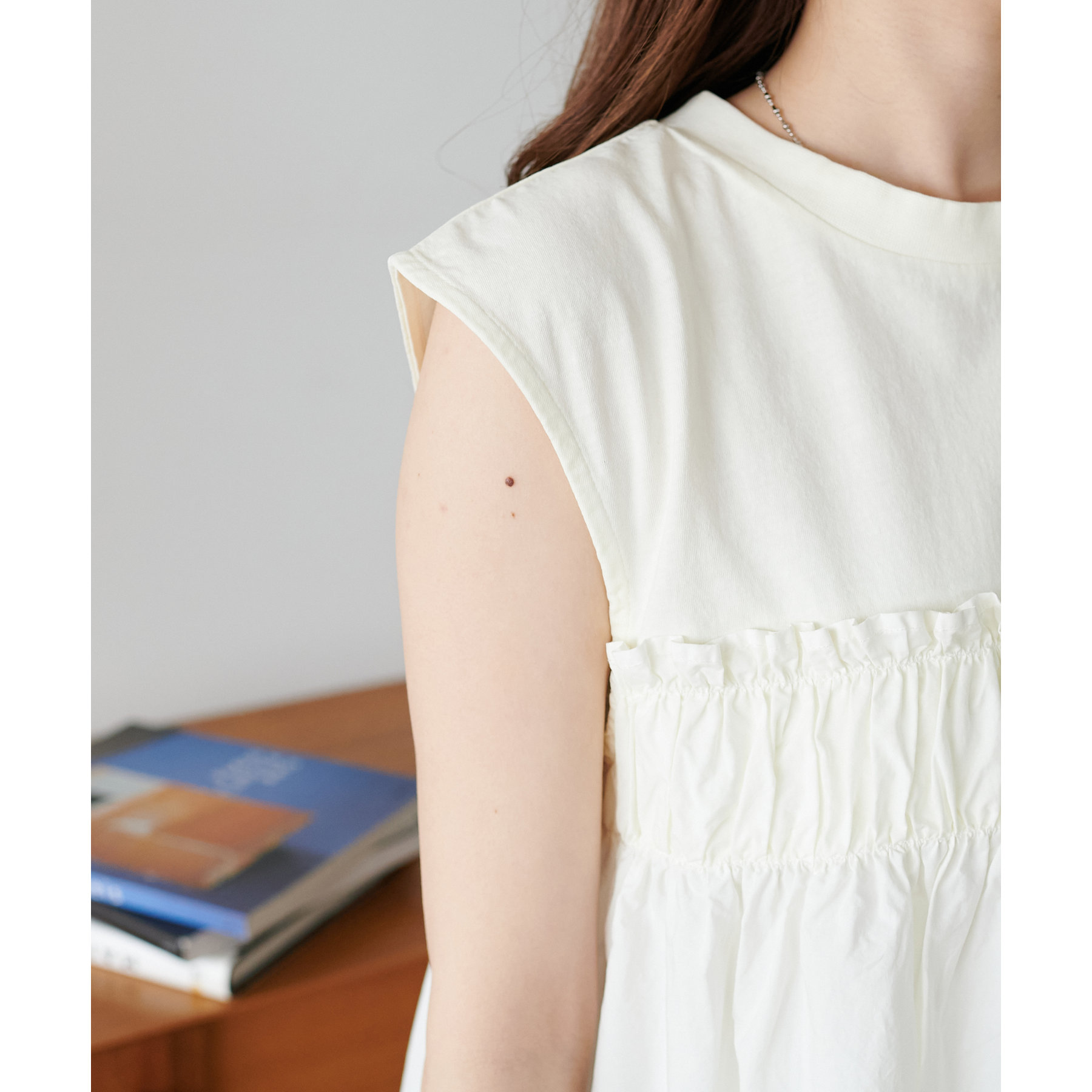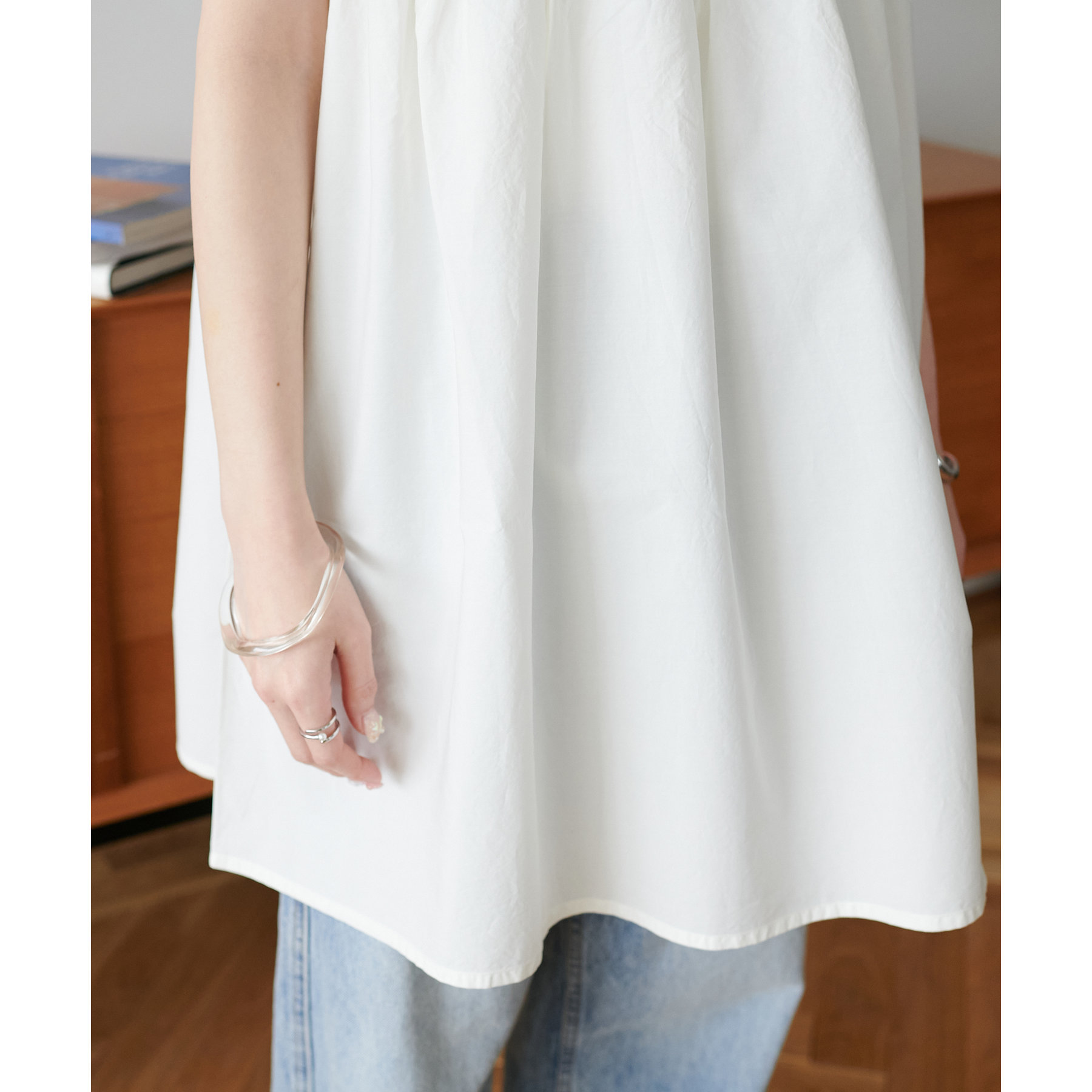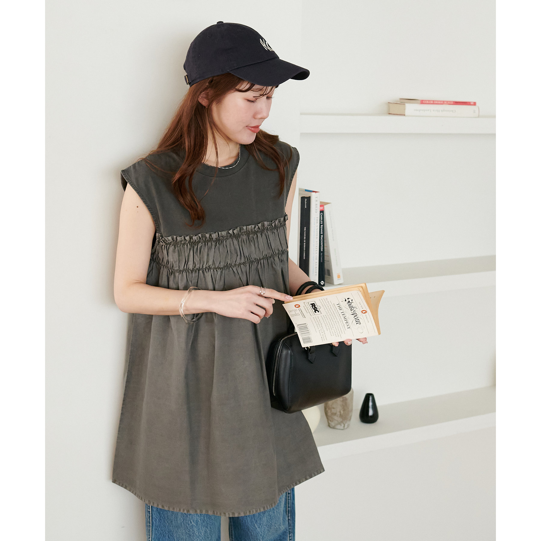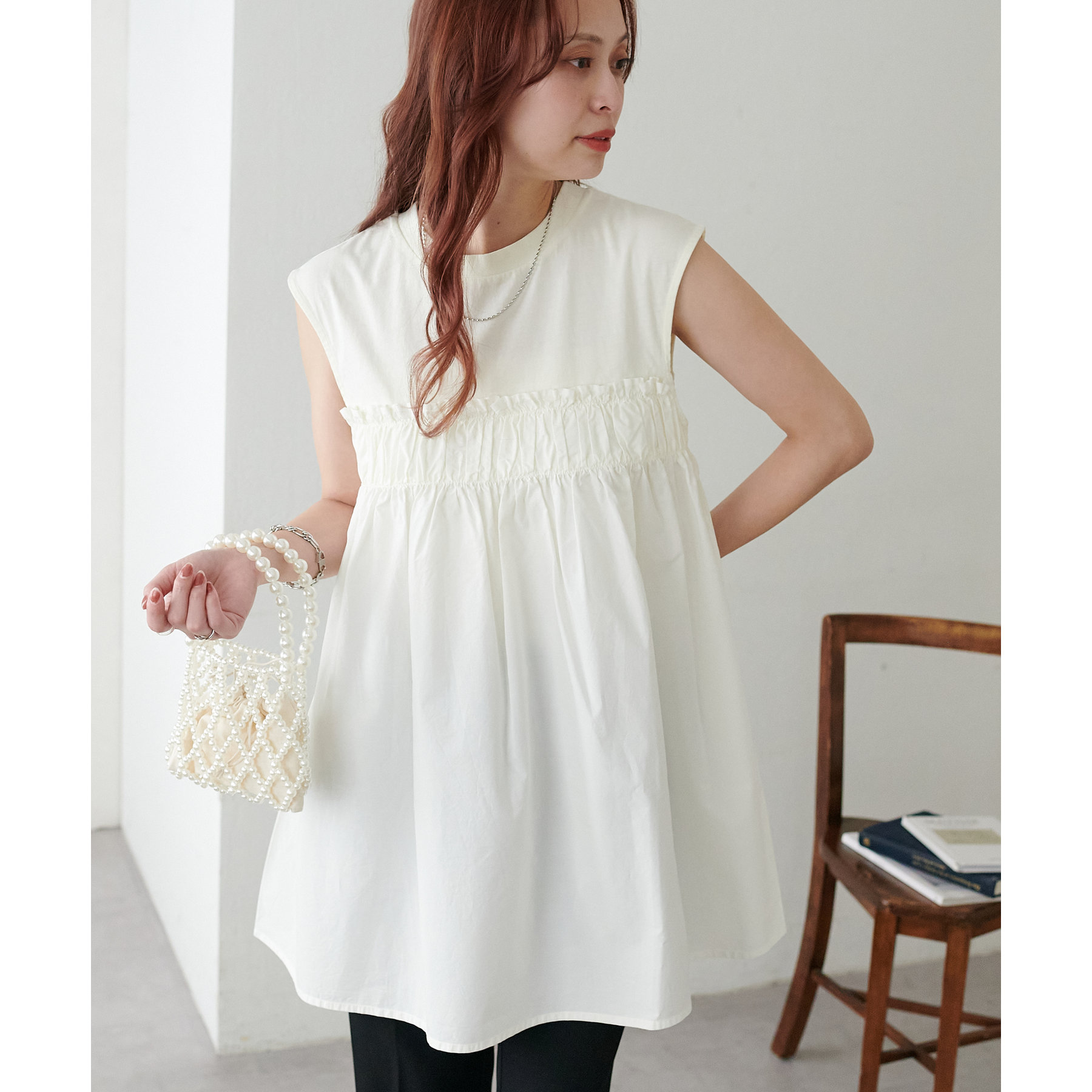 胸元のギャザーが、女性らしい柔らかな印象を与え、メリハリのある印象に!