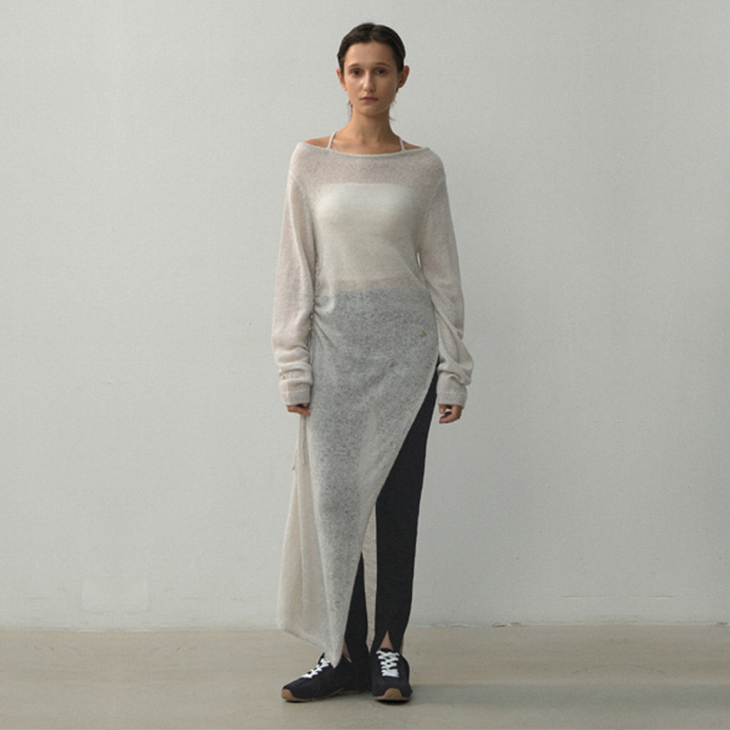 깊은 슬릿과 스트링 장식으로 셔링 디테일이 포인트됩니다.