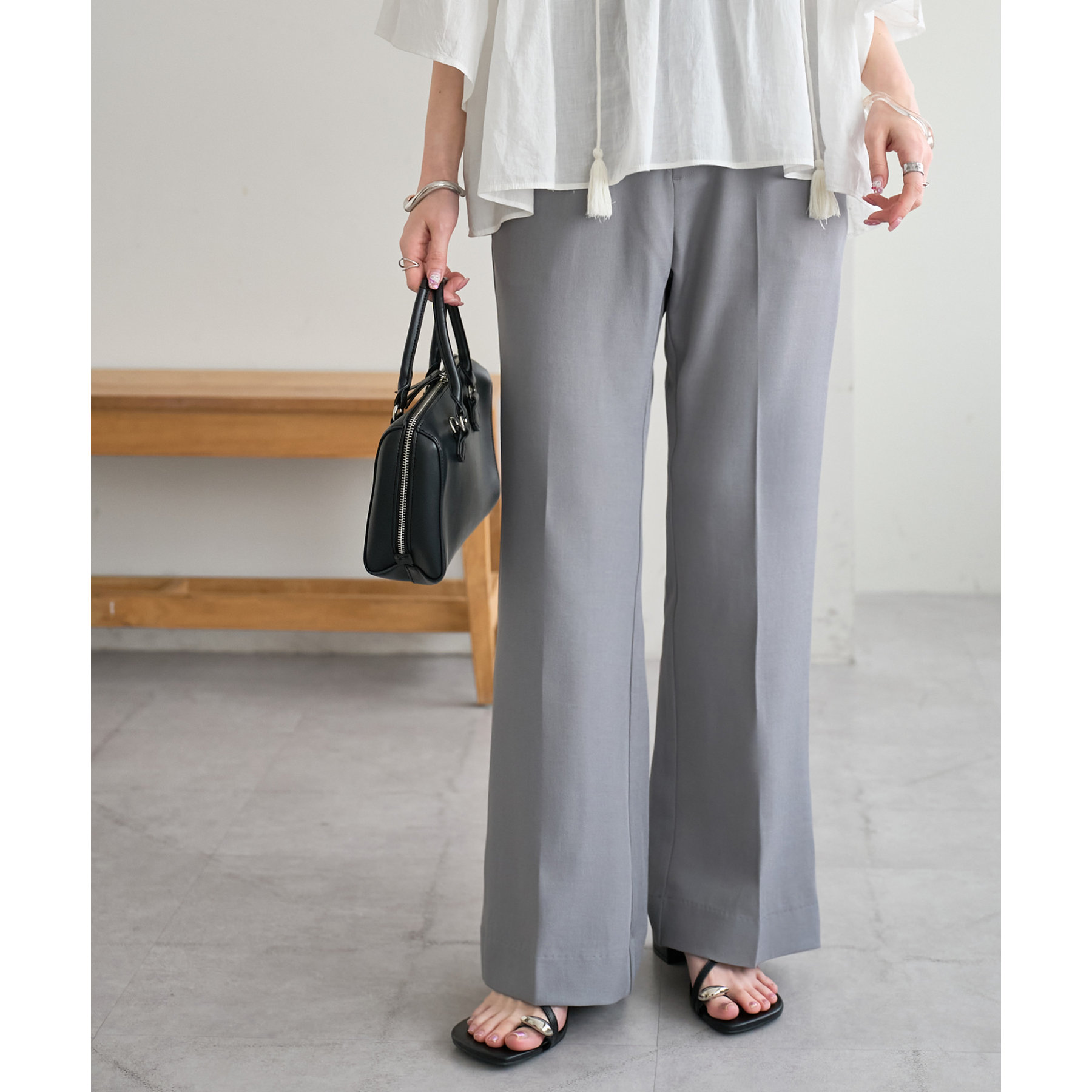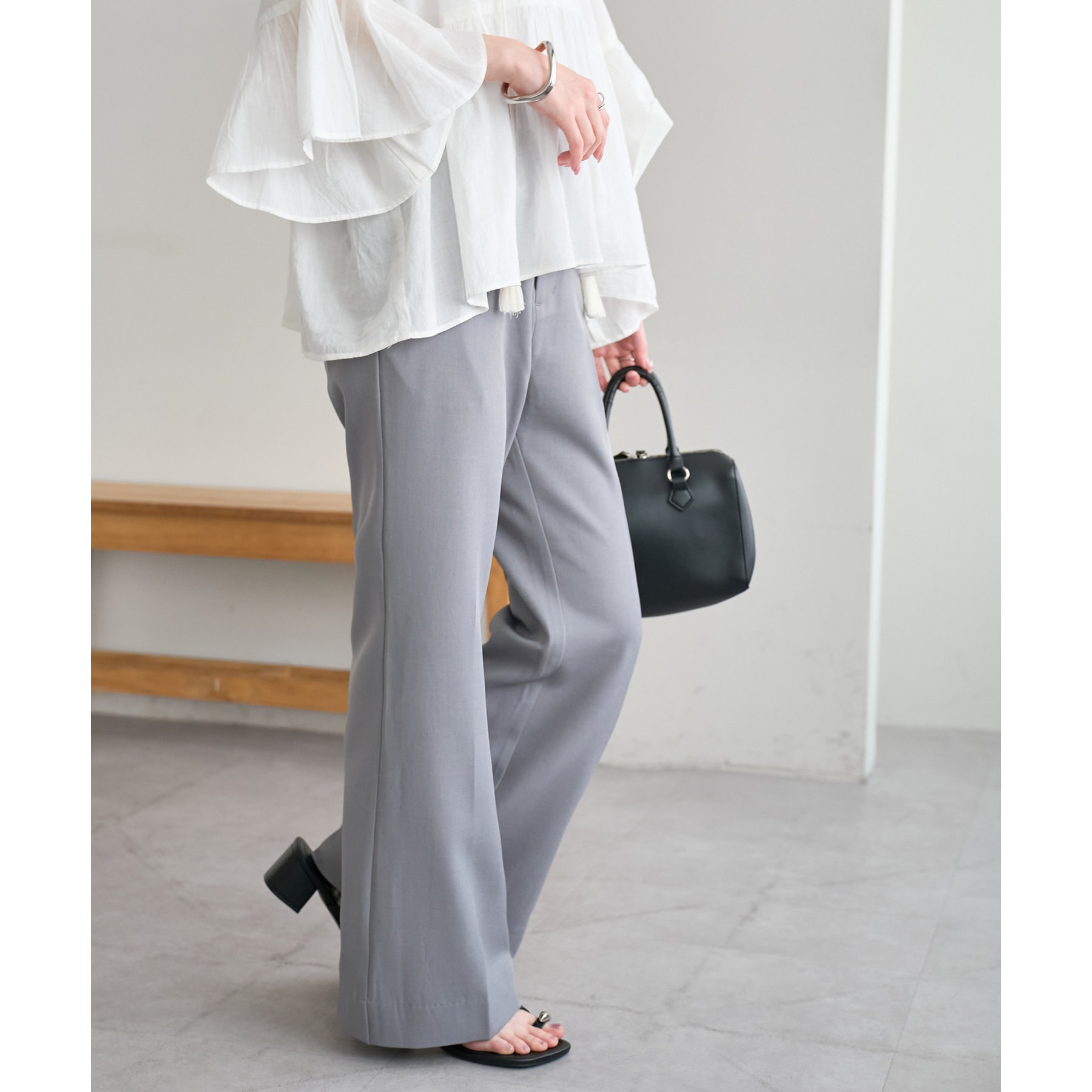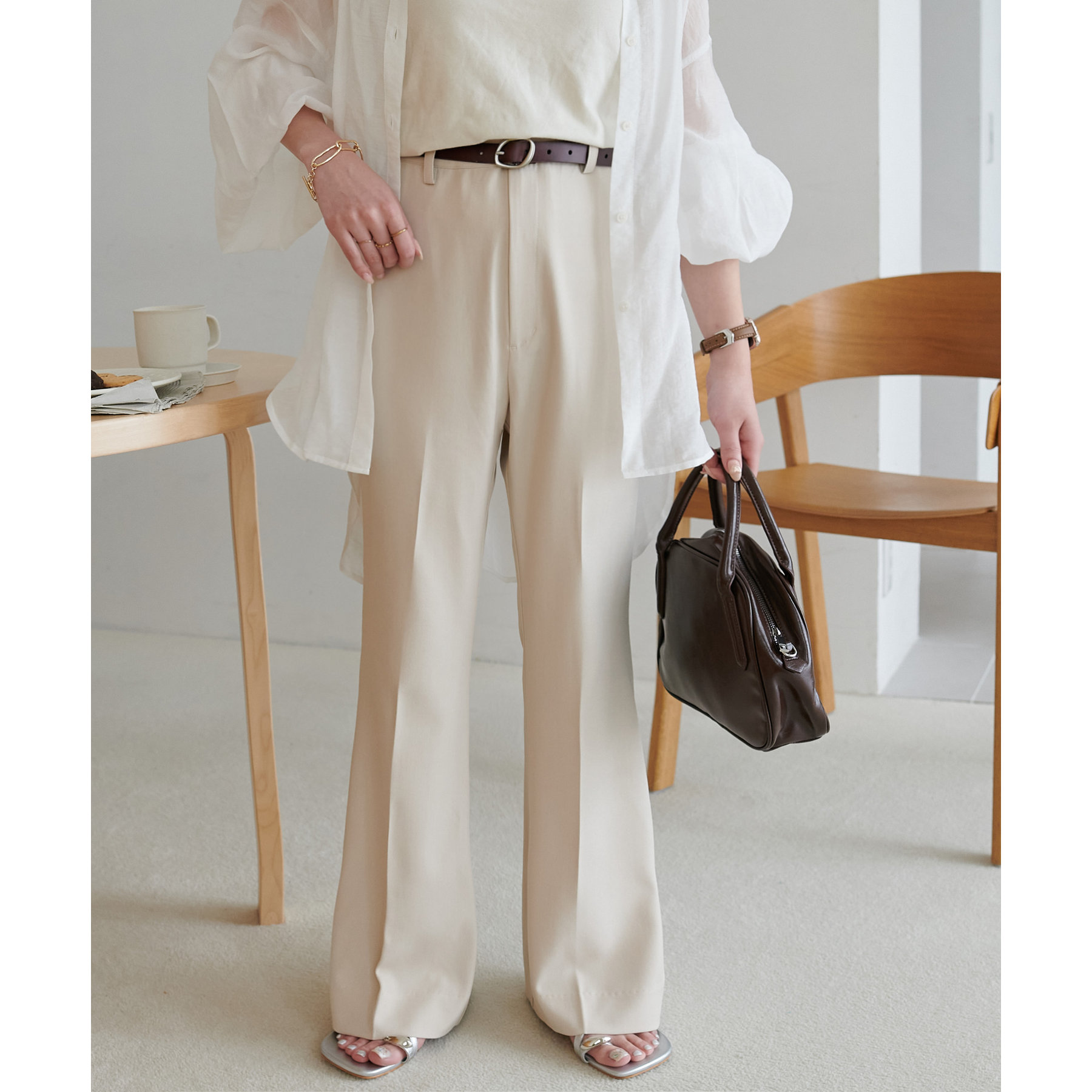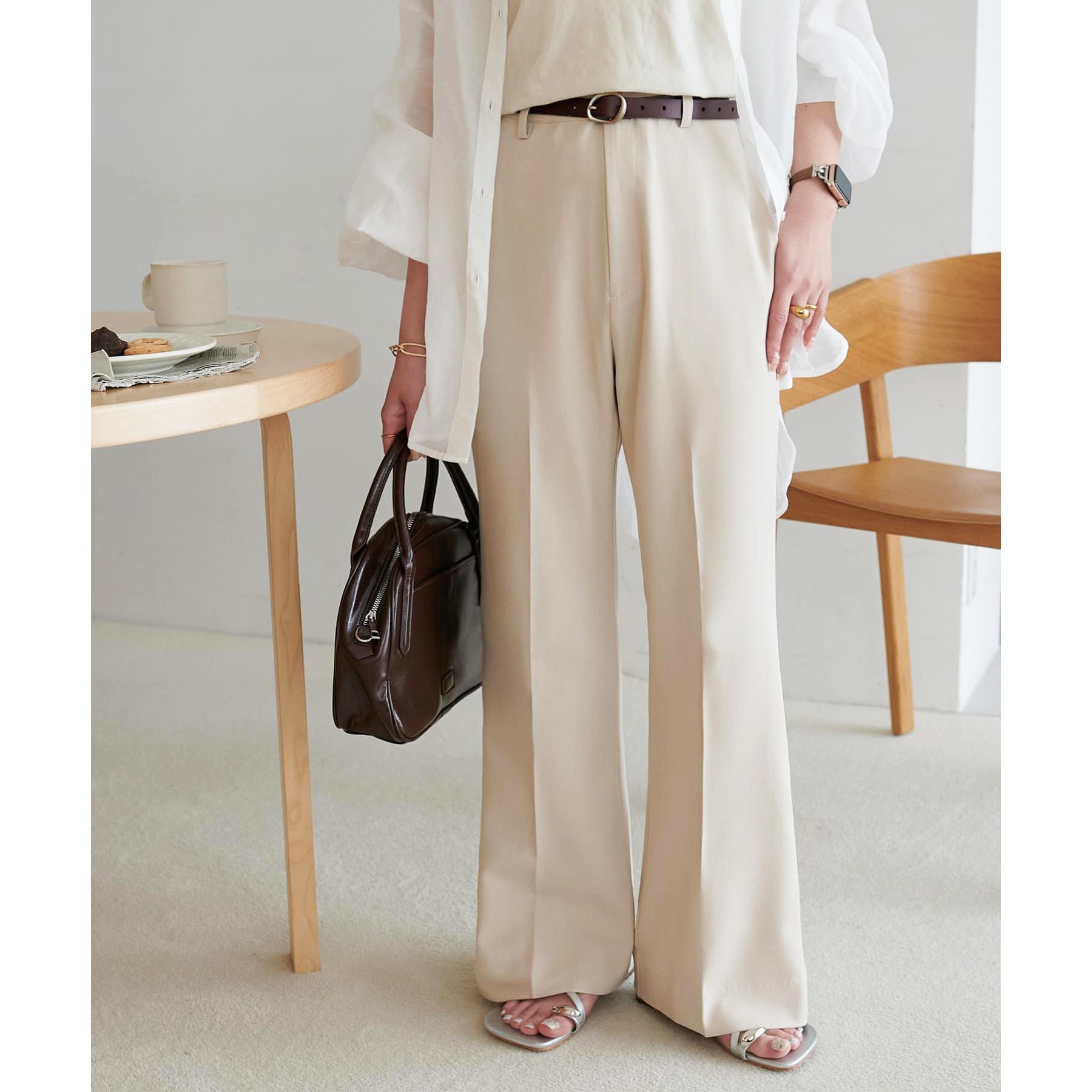 足元に向かって広がるシルエットなので、太ももまわりがすっきりとした印象になります。