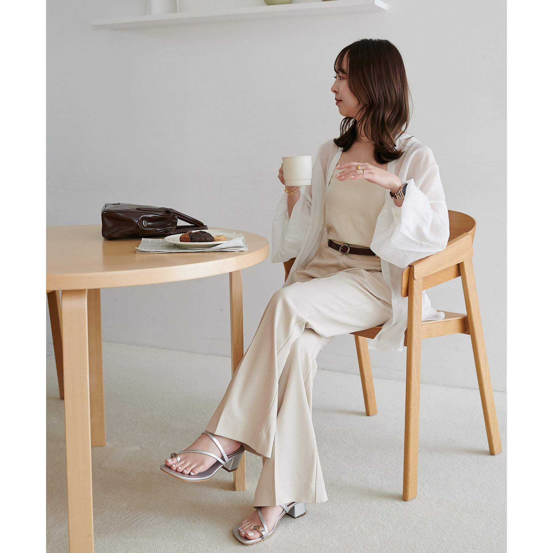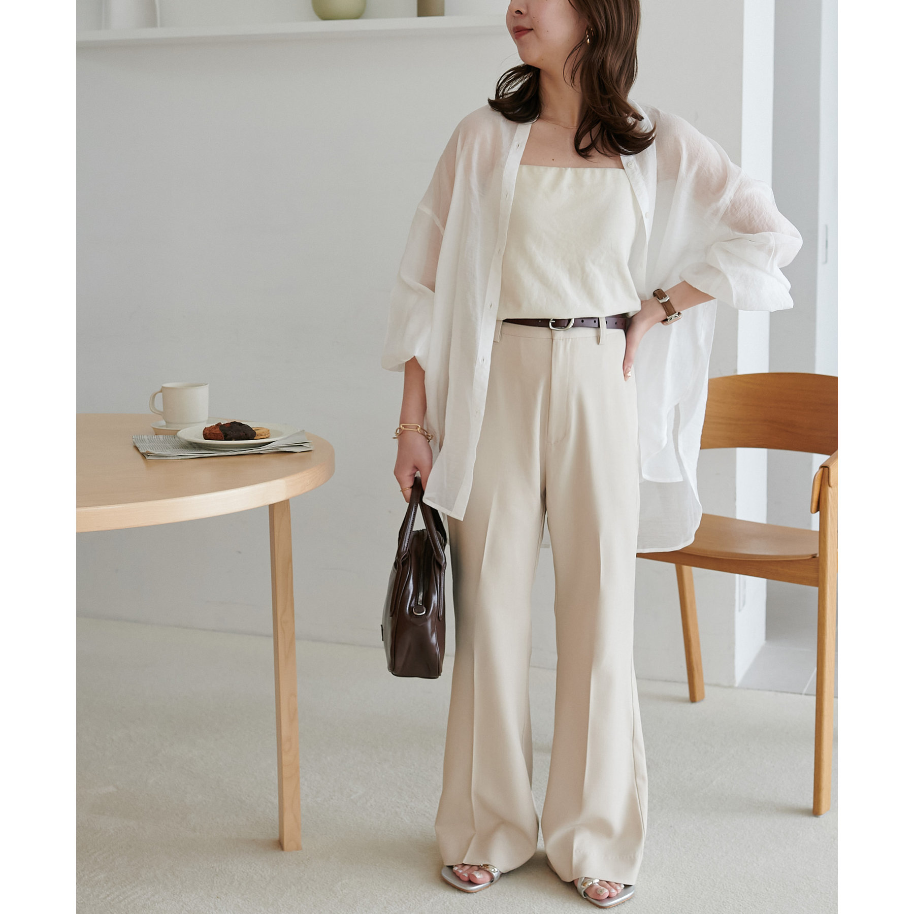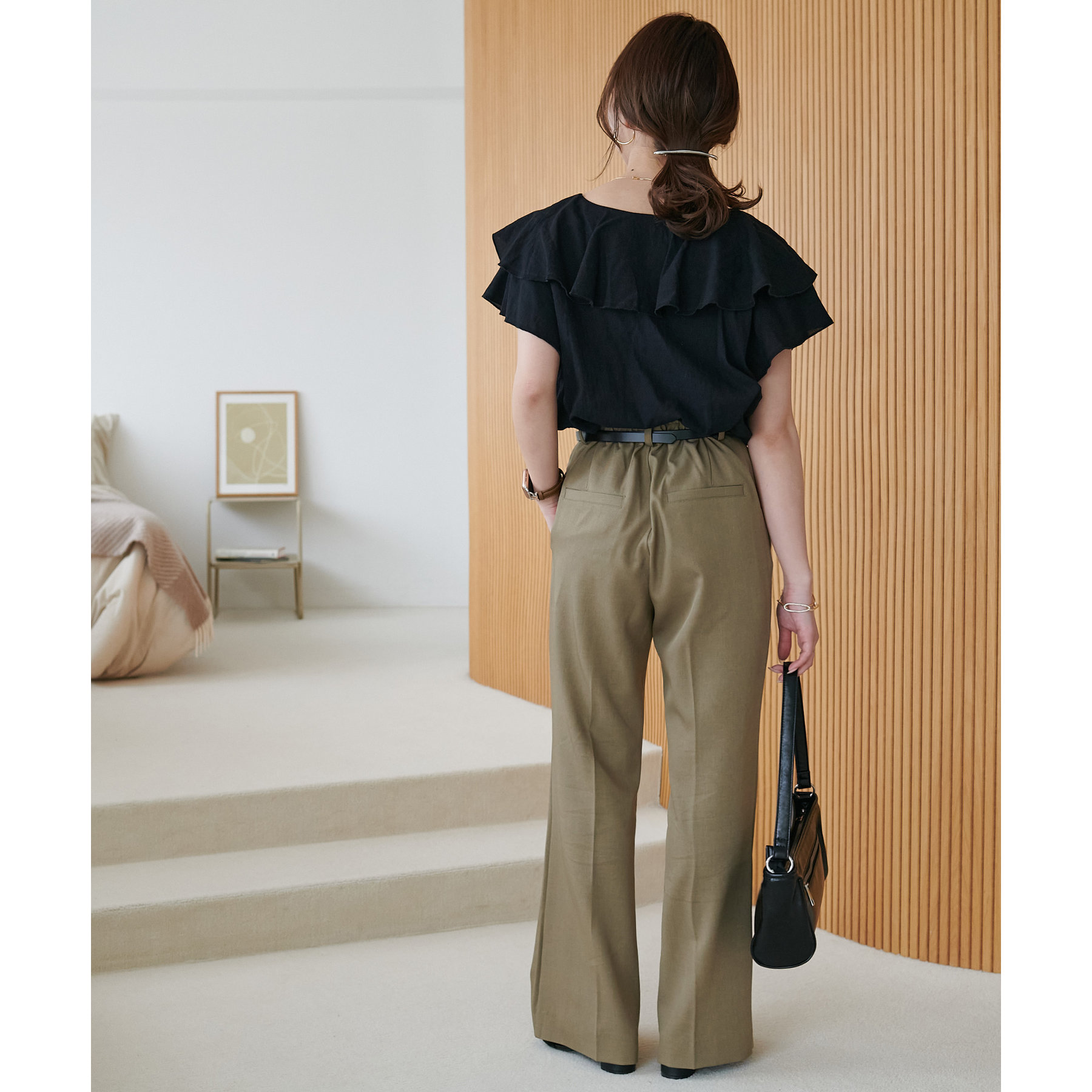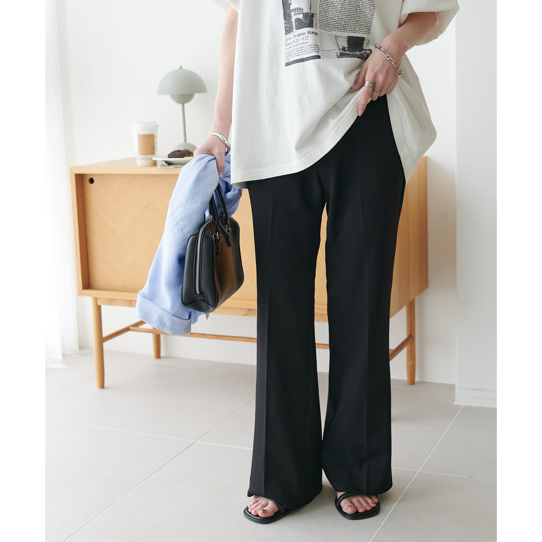 足元に向かって広がるシルエットなので、太ももまわりがすっきりとした印象になります。