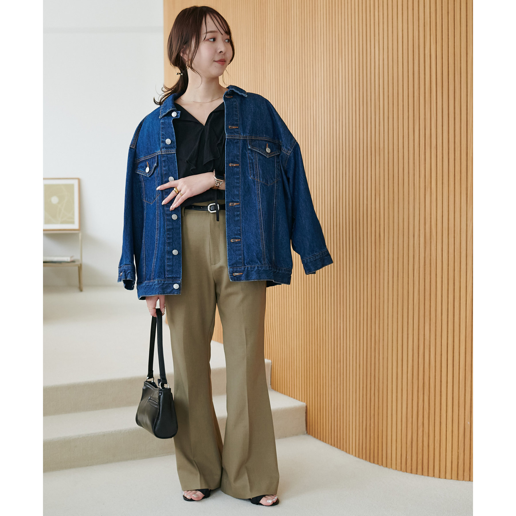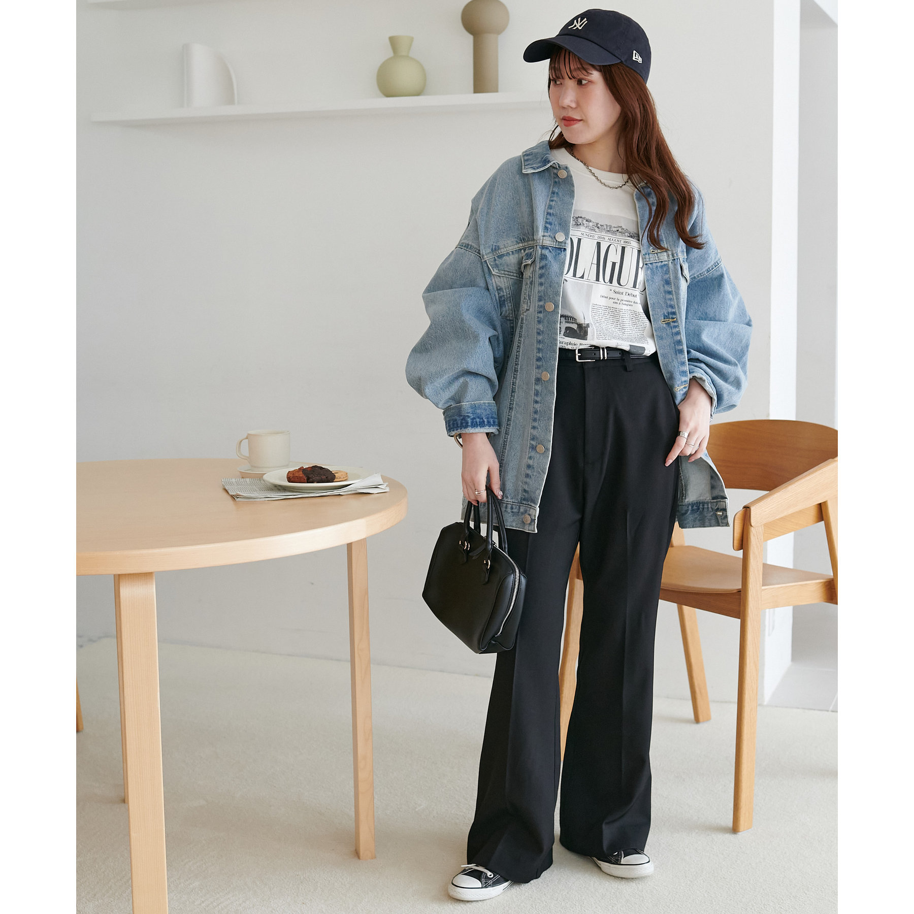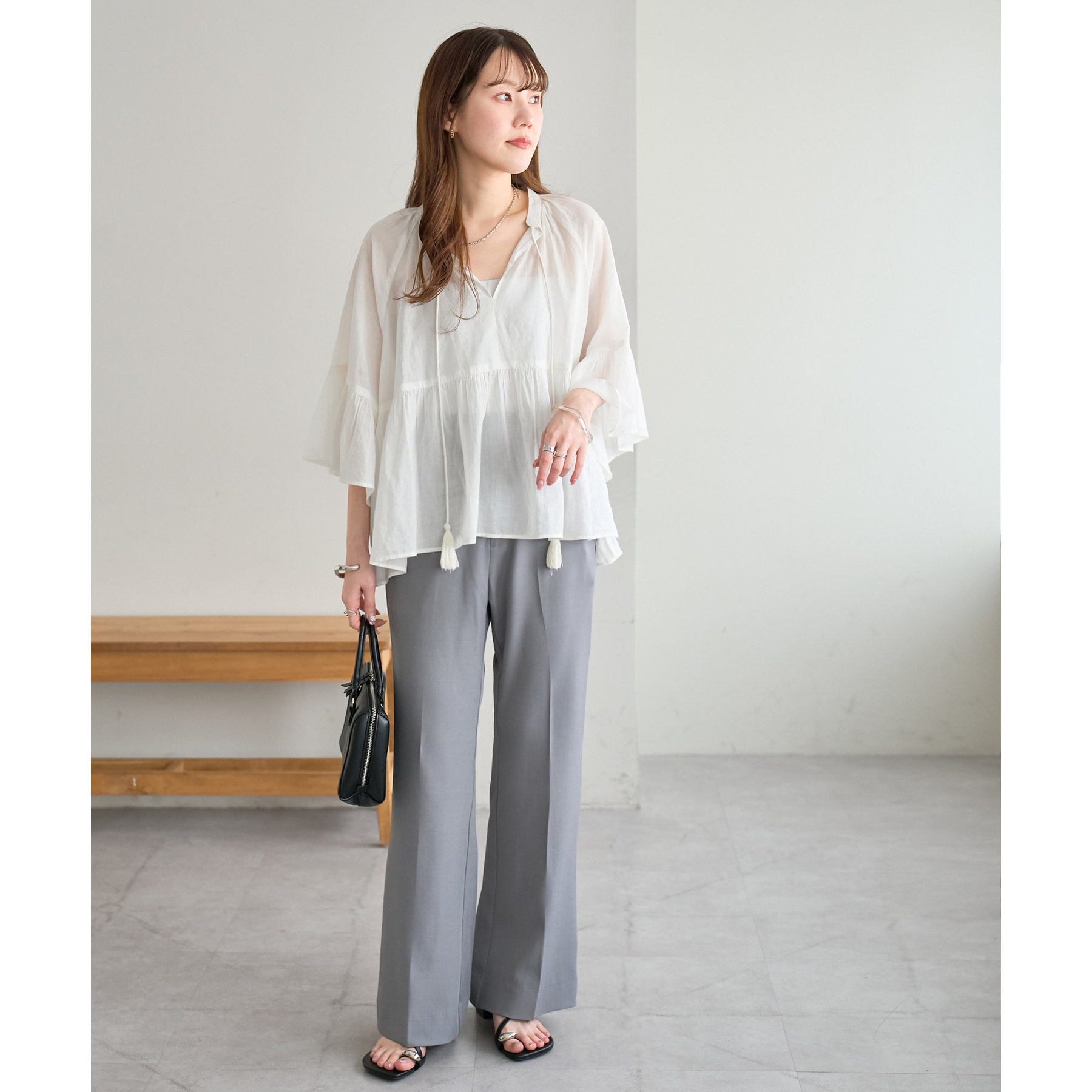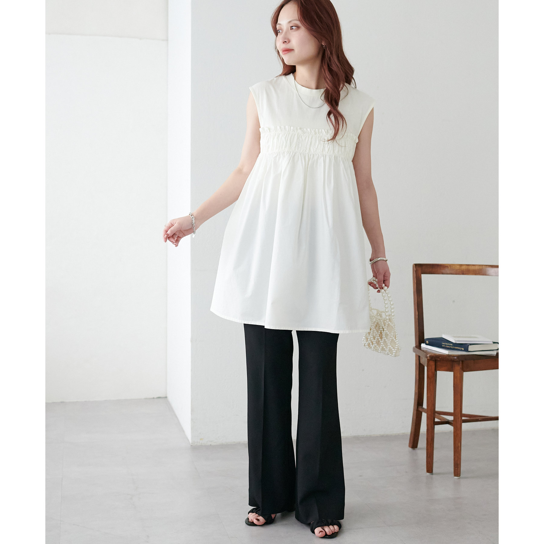 また、腰回りはすっきりとしたシルエットなので、チュニック丈のアイテムを合わせてもバランスの良い着こなしに◎