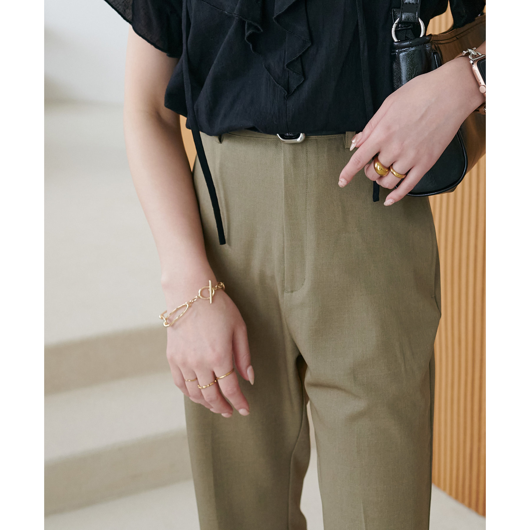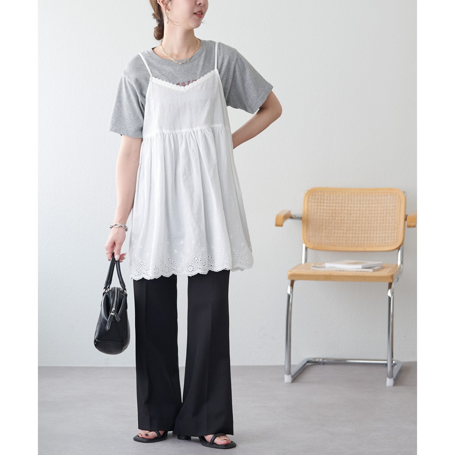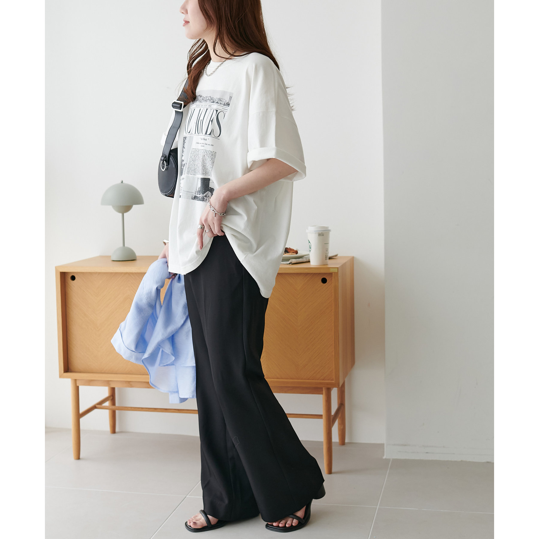 また、腰回りはすっきりとしたシルエットなので、チュニック丈のアイテムを合わせてもバランスの良い着こなしに◎