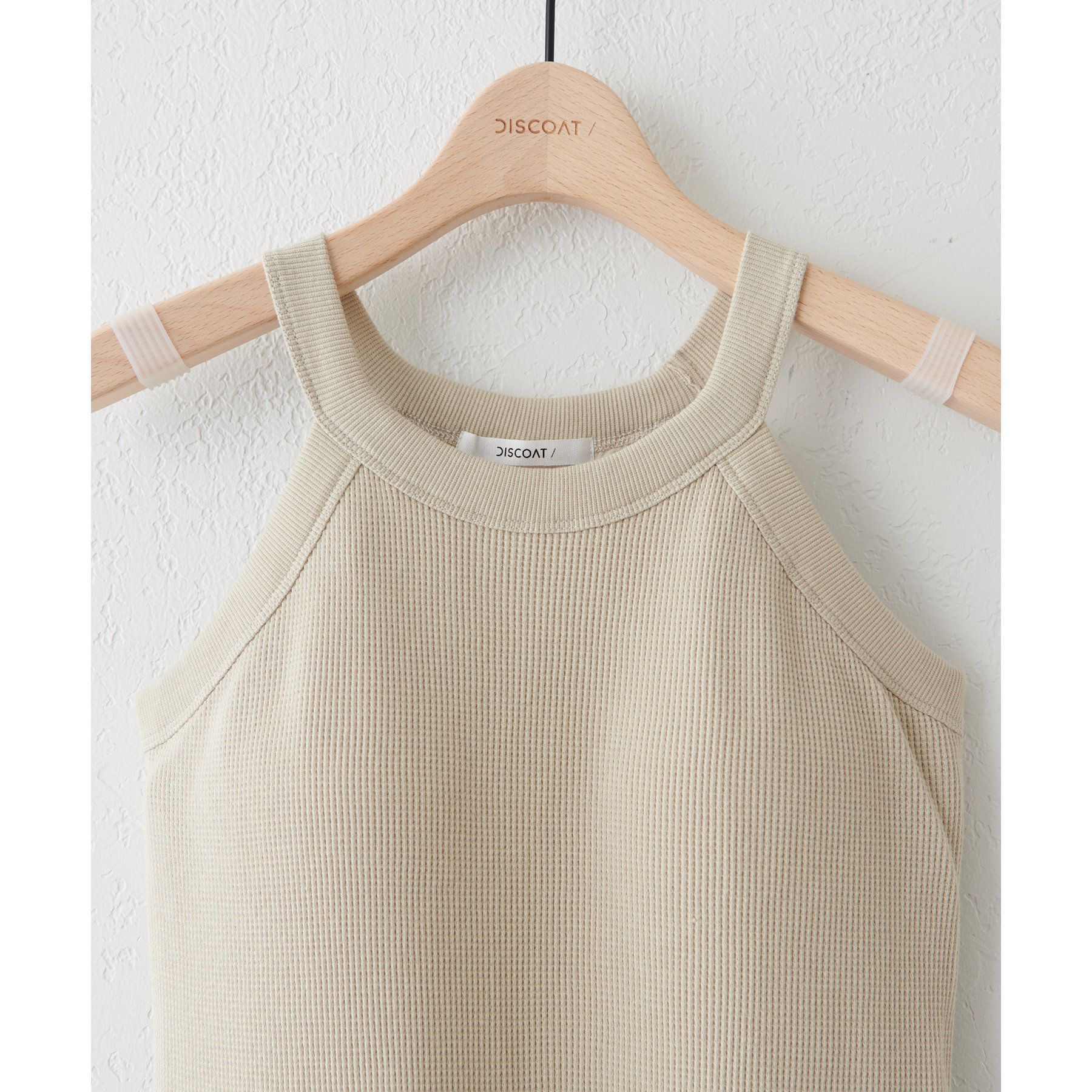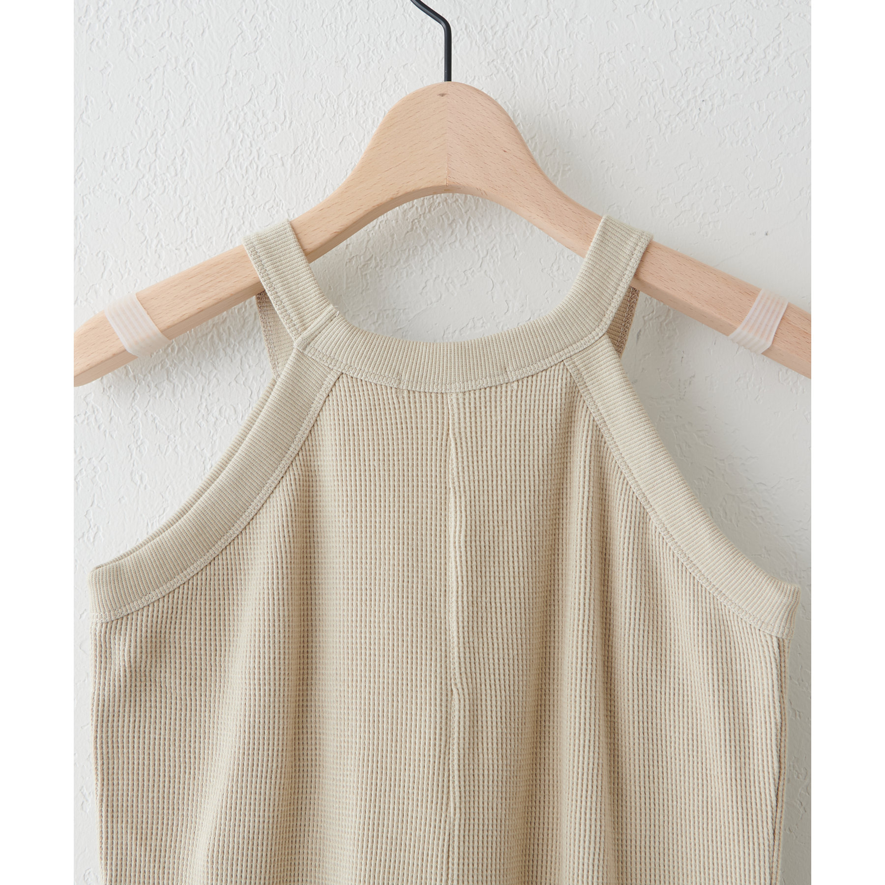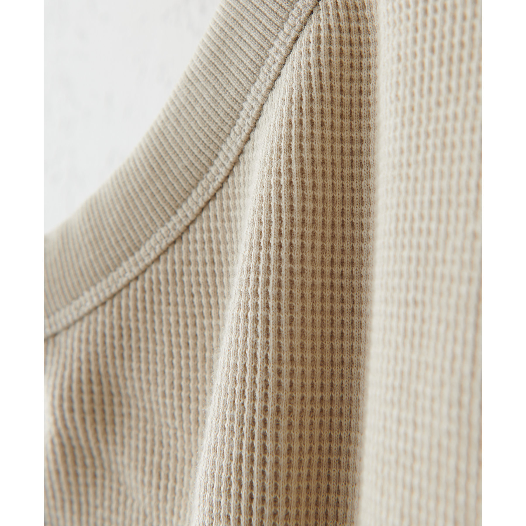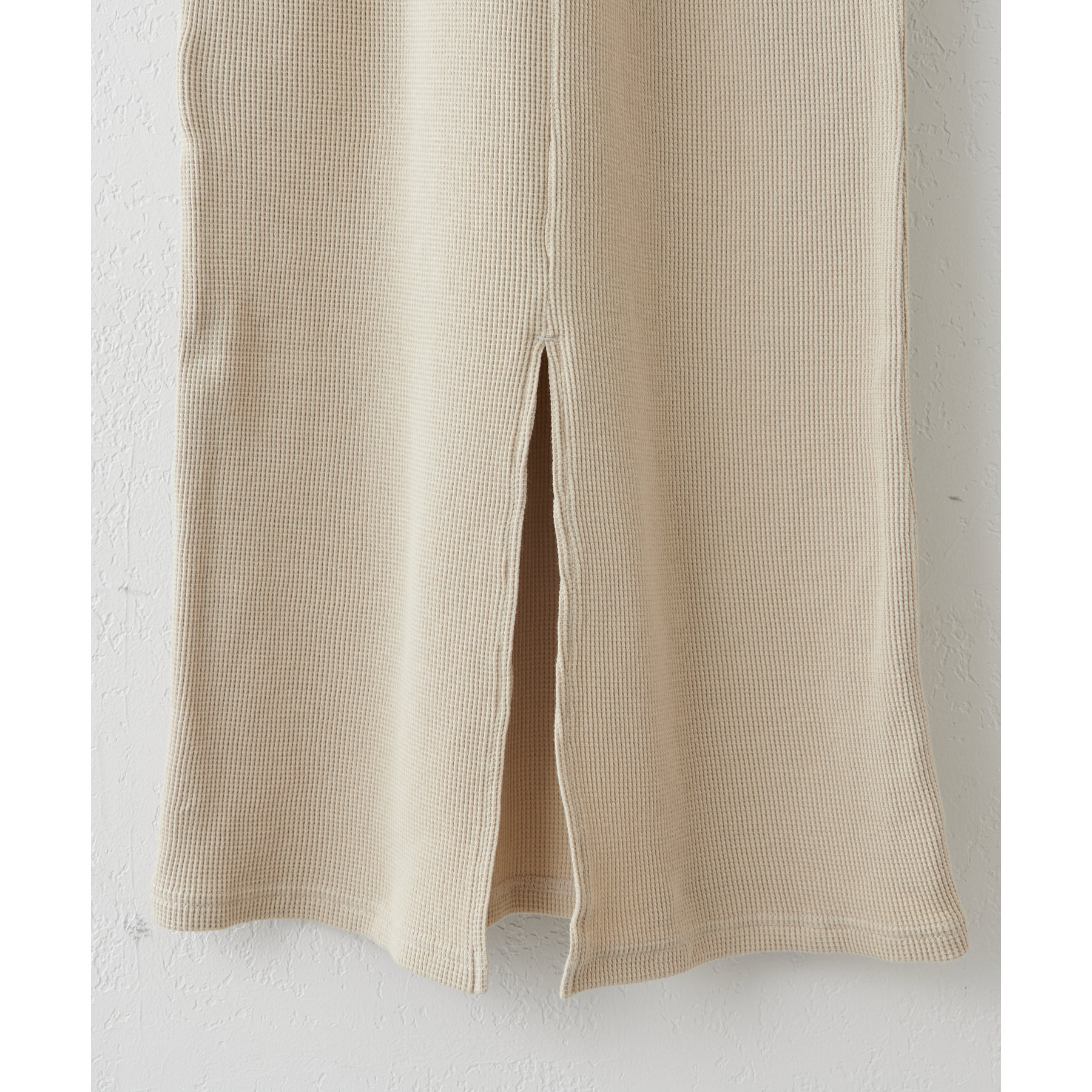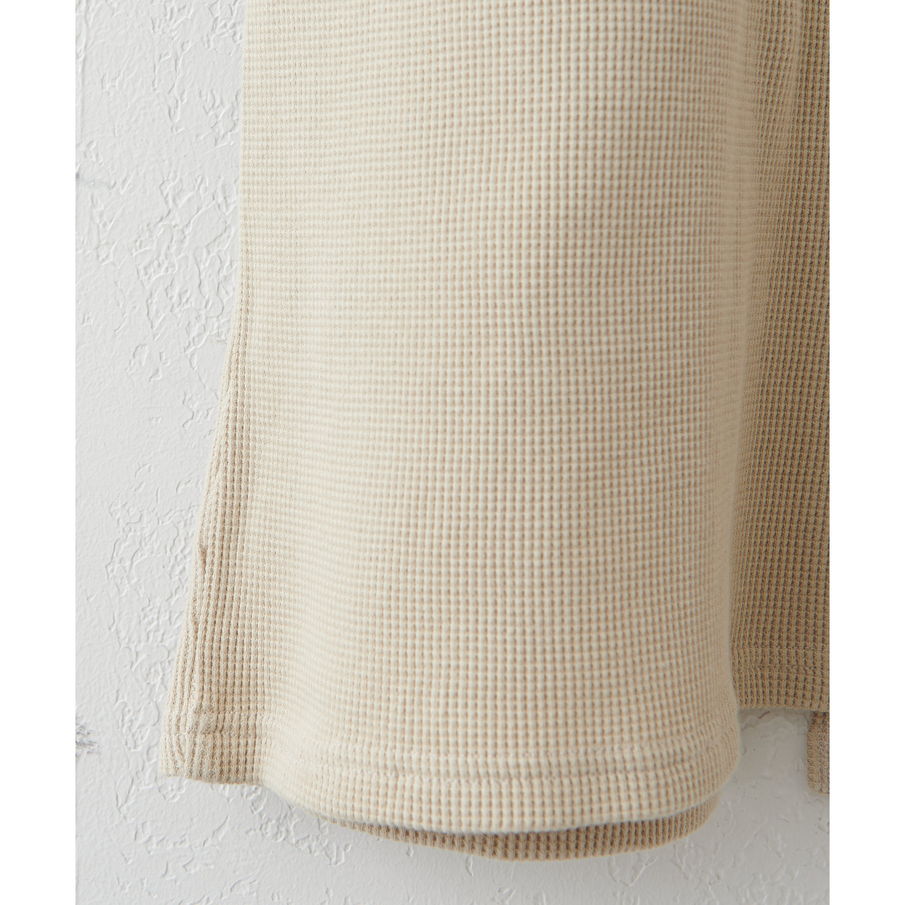 表面に凹凸感のあるワッフル素材は、程よい厚みがあり身体のラインを拾いにくいので、安心感も◎