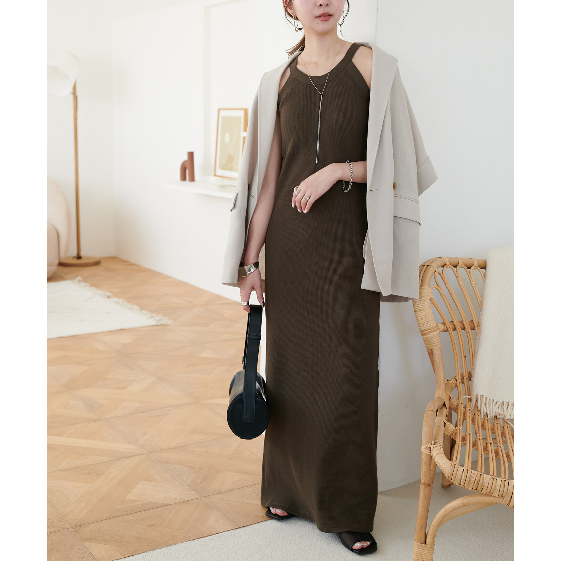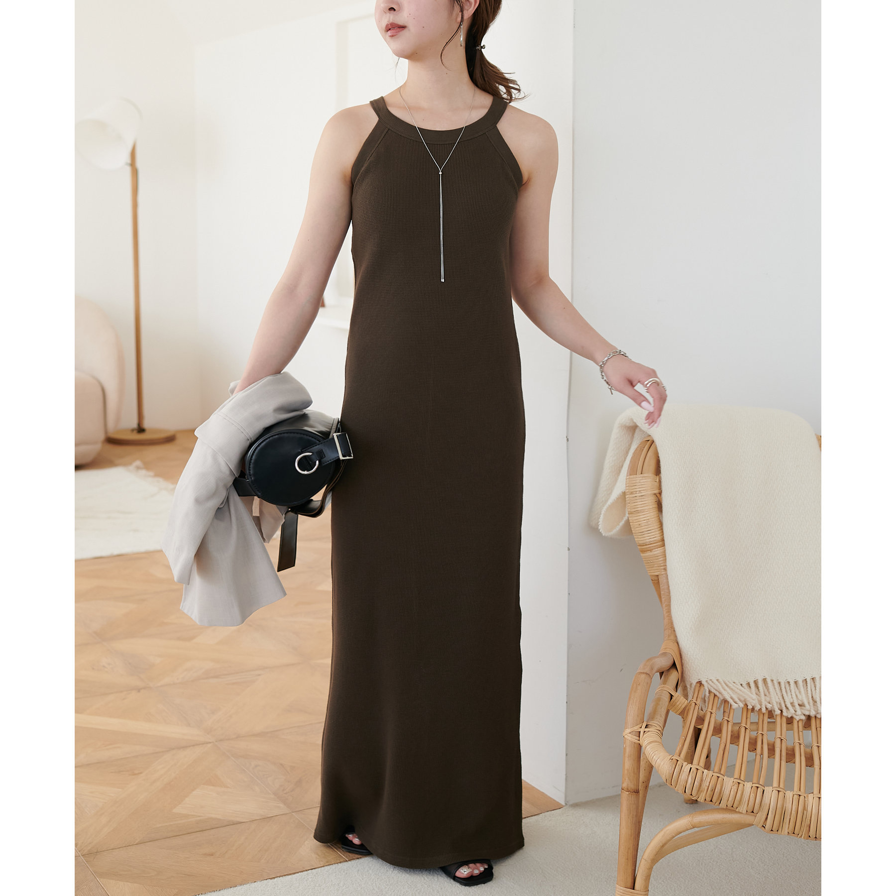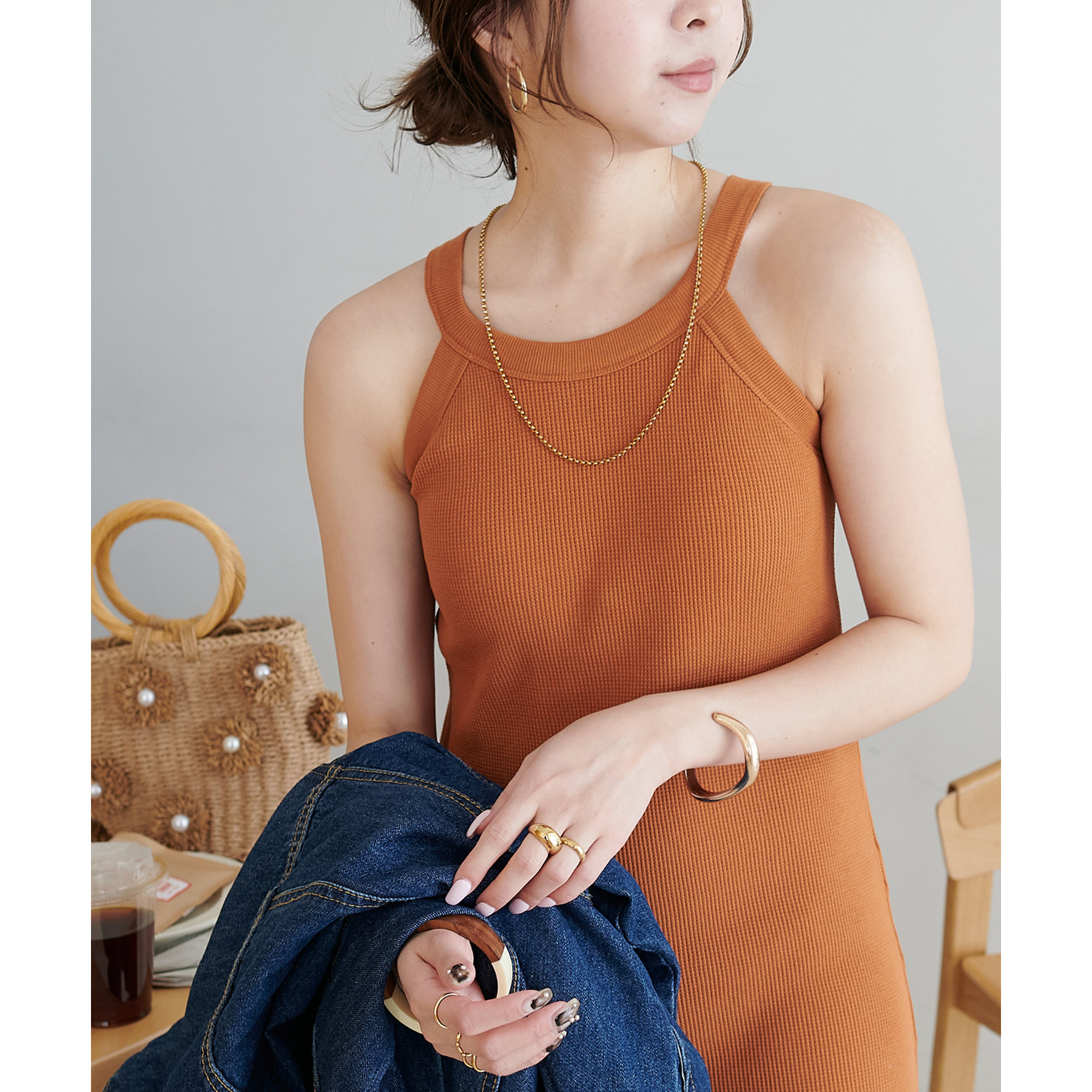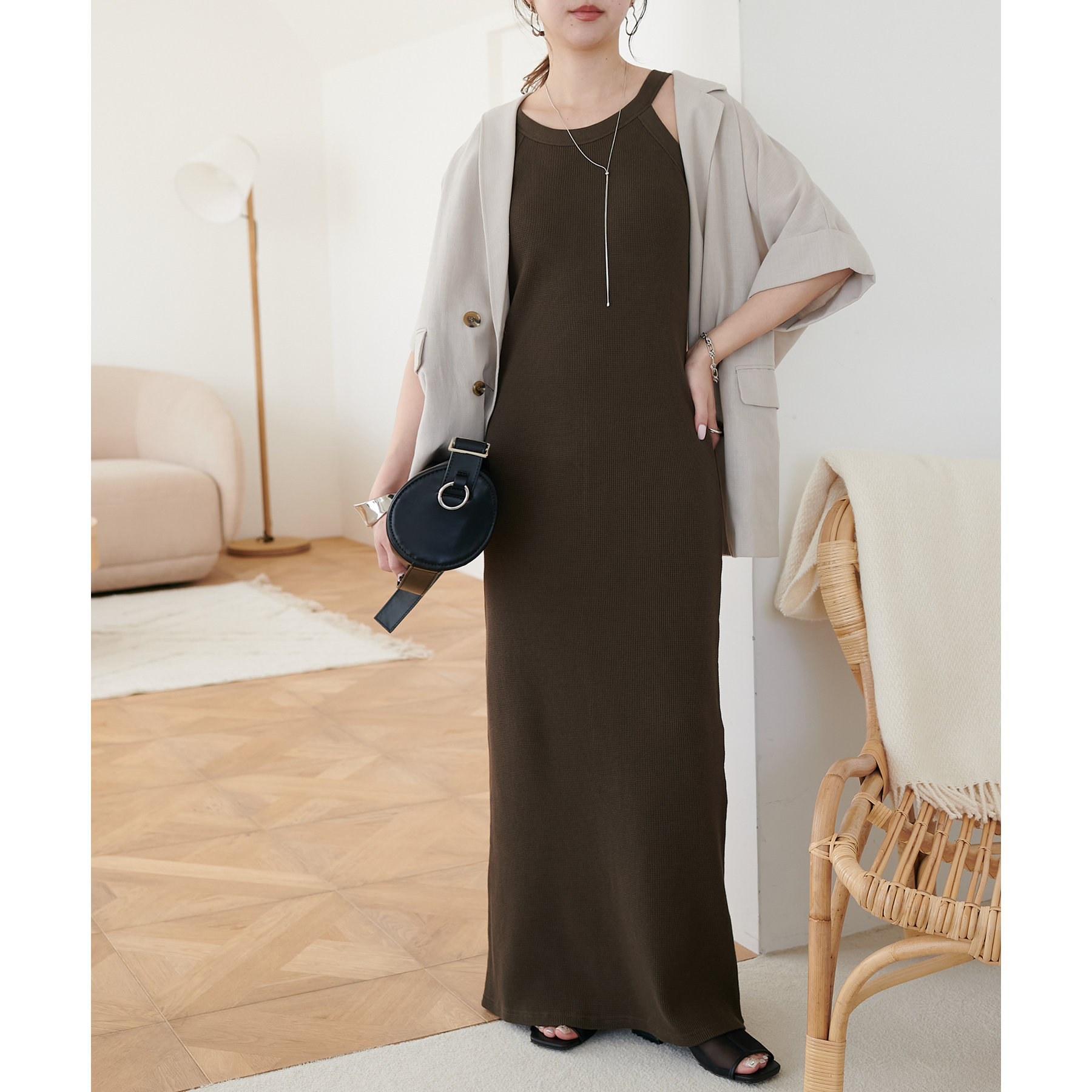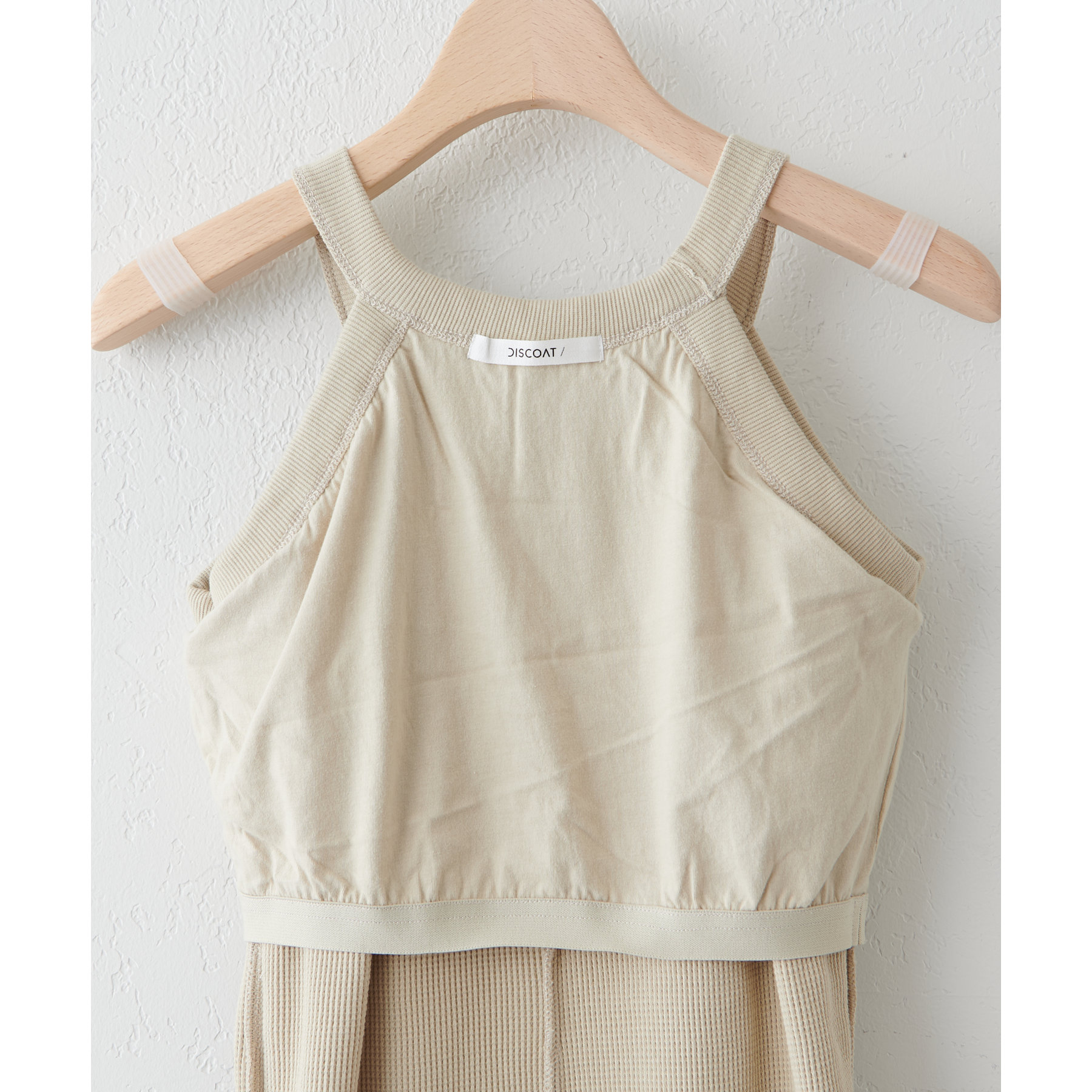 表面に凹凸感のあるワッフル素材は、程よい厚みがあり身体のラインを拾いにくいので、安心感も◎