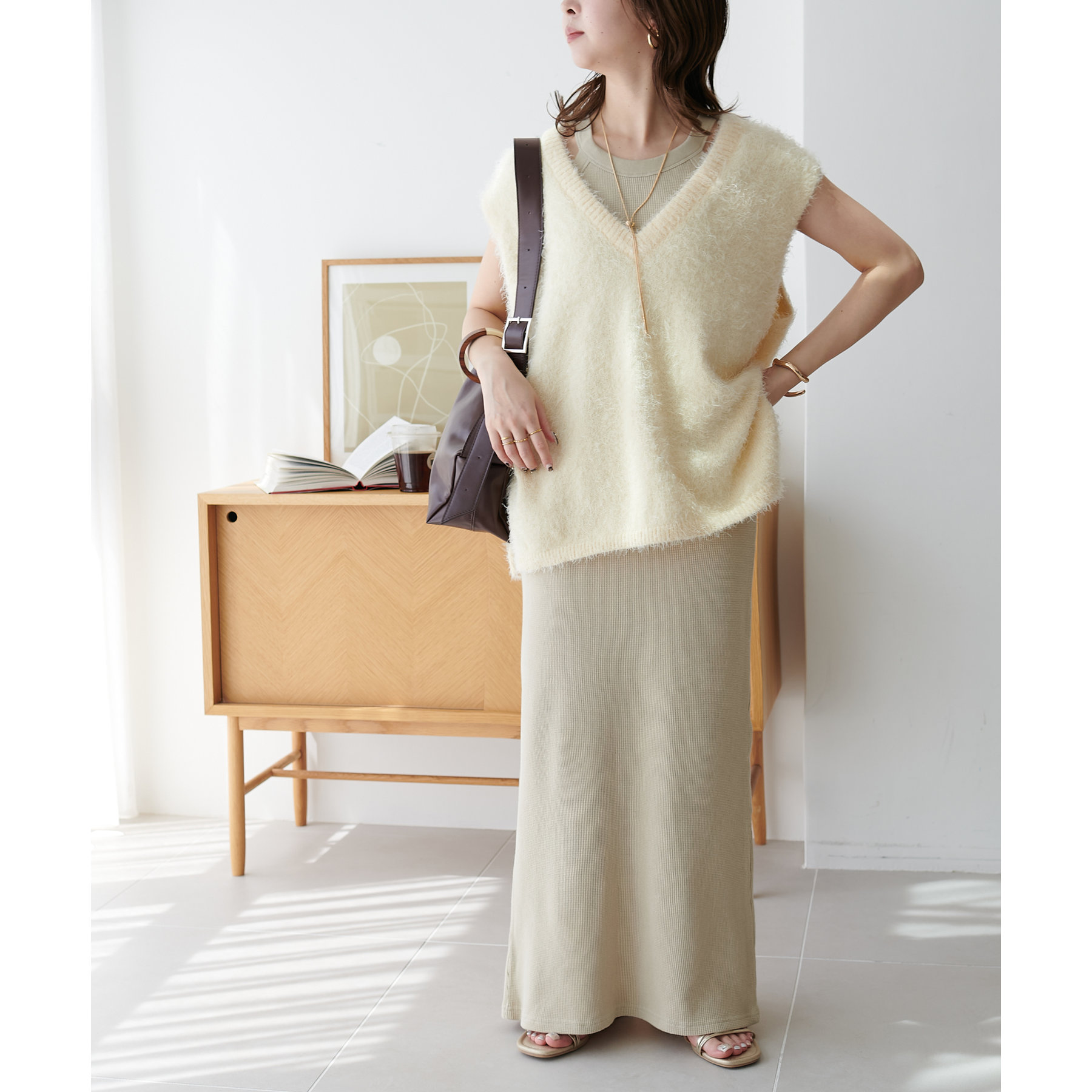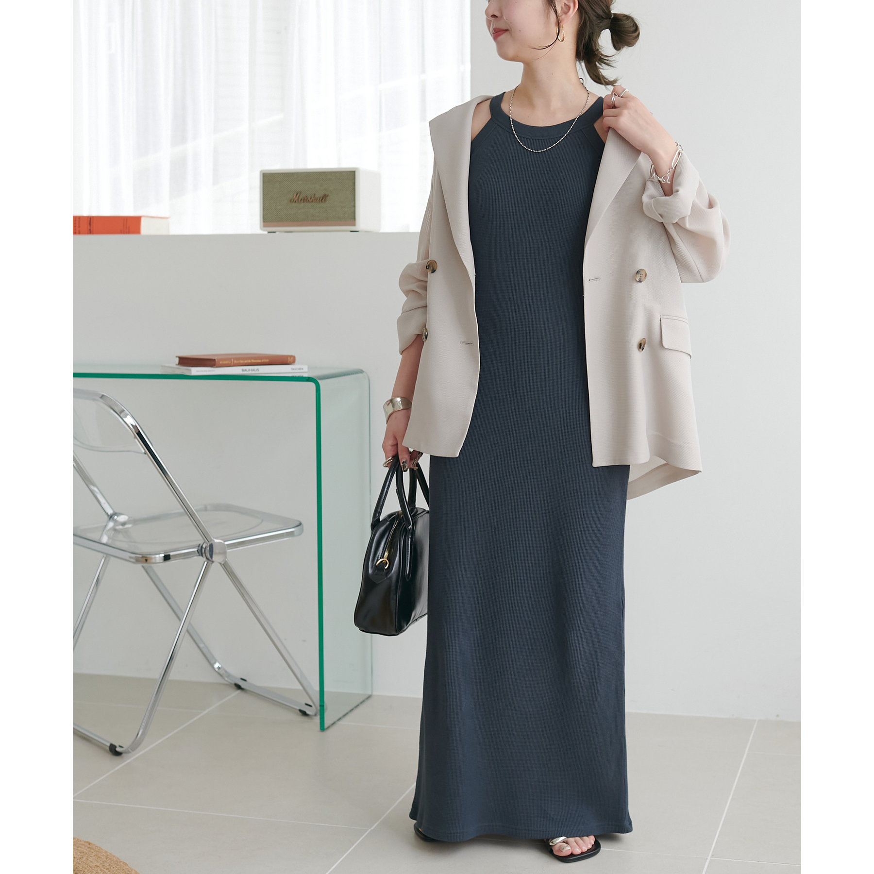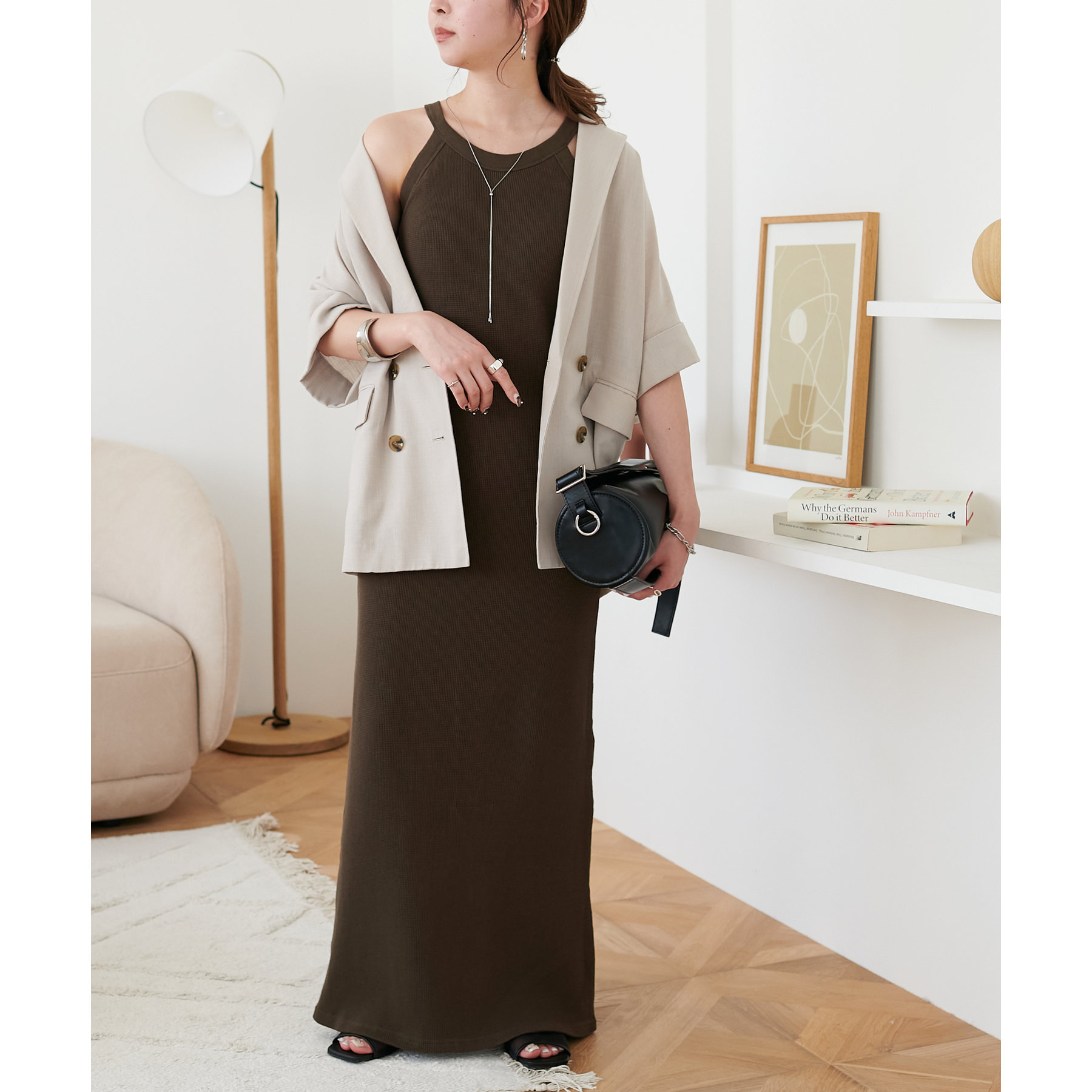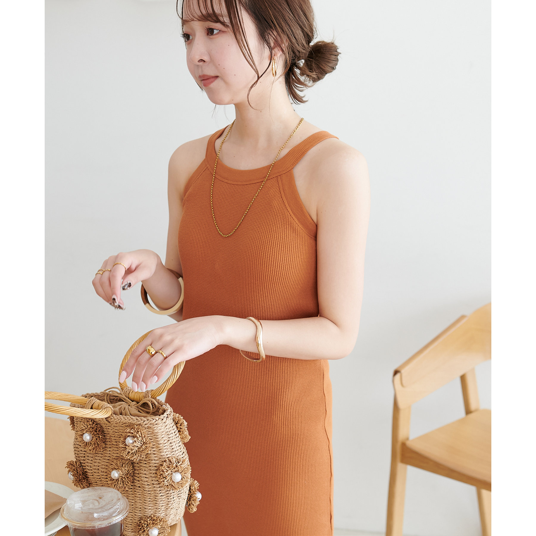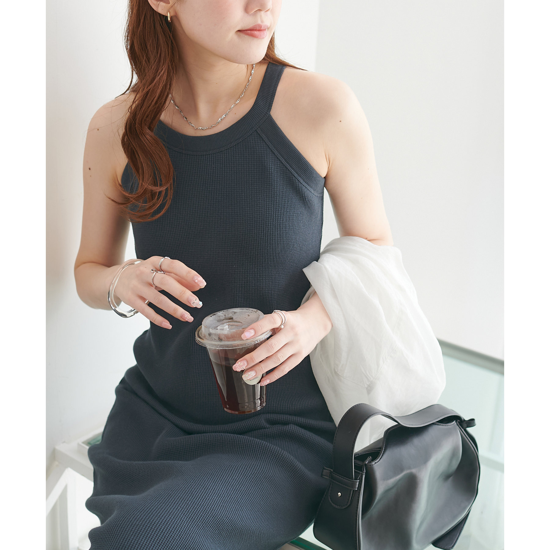 表面に凹凸感のあるワッフル素材は、程よい厚みがあり身体のラインを拾いにくいので、安心感も◎