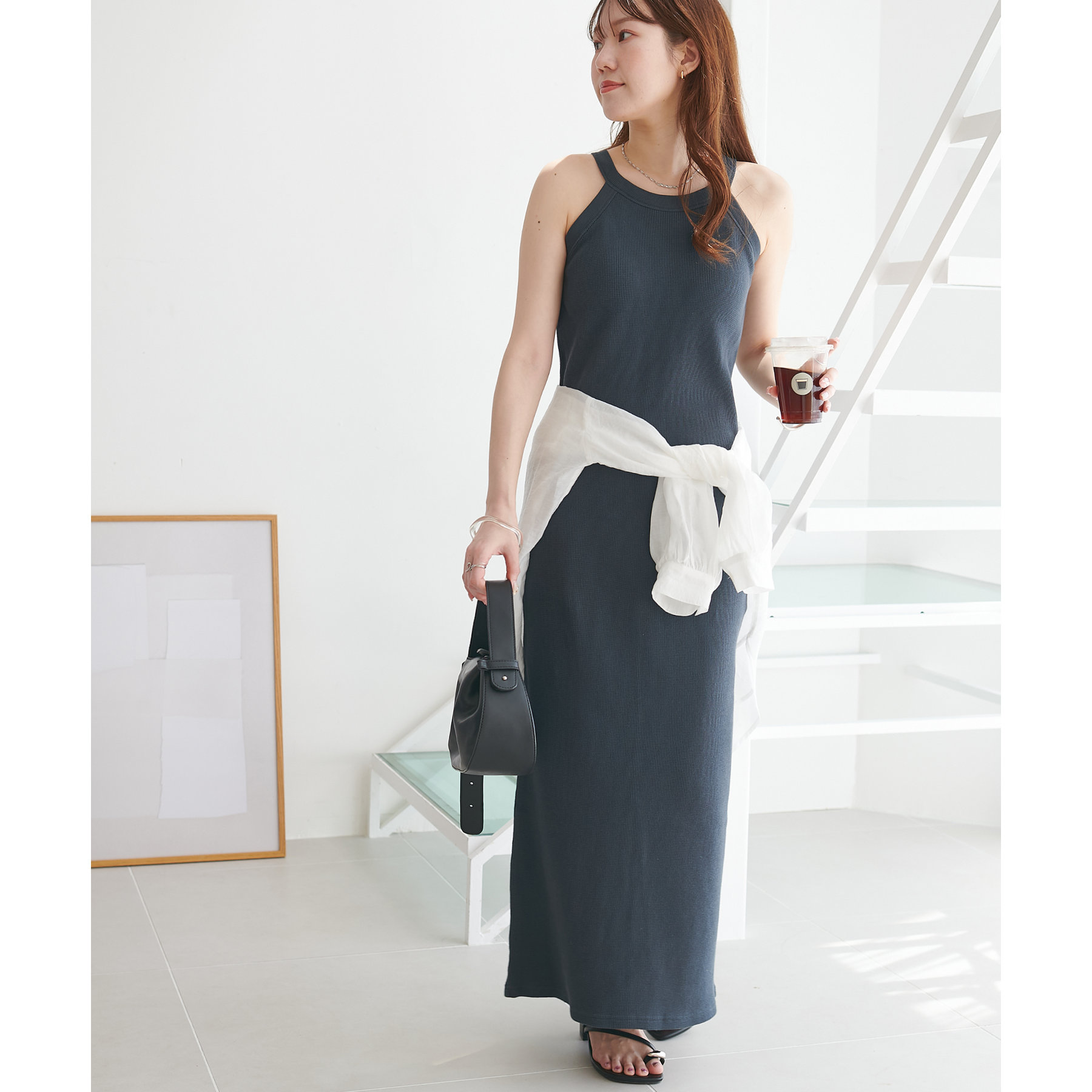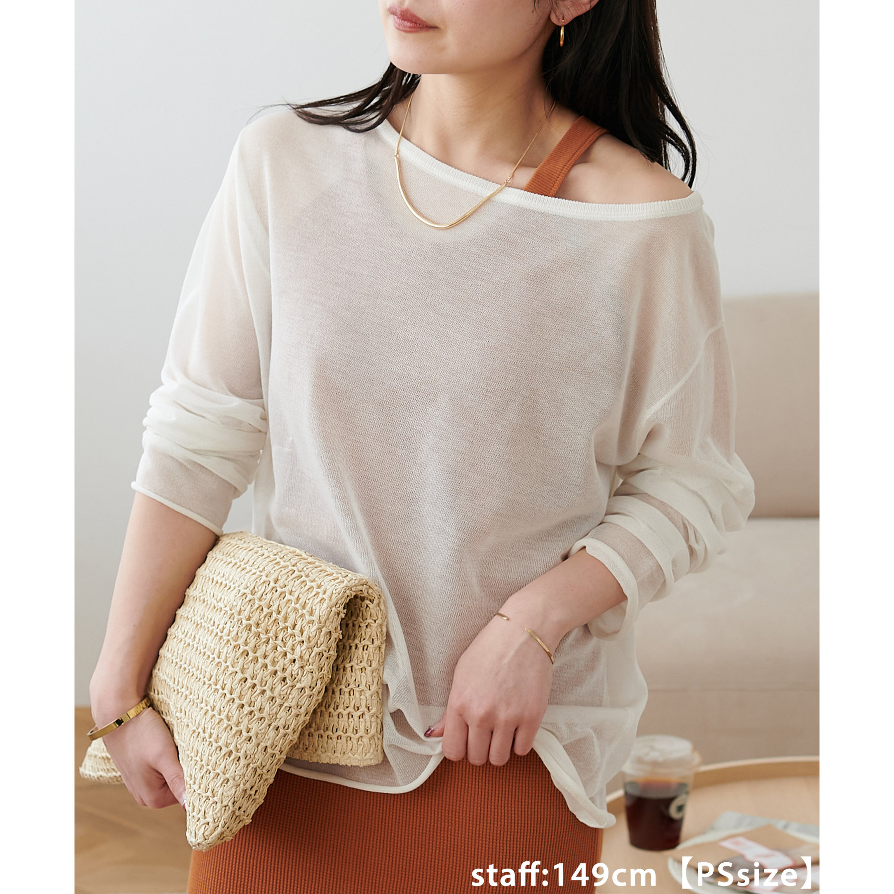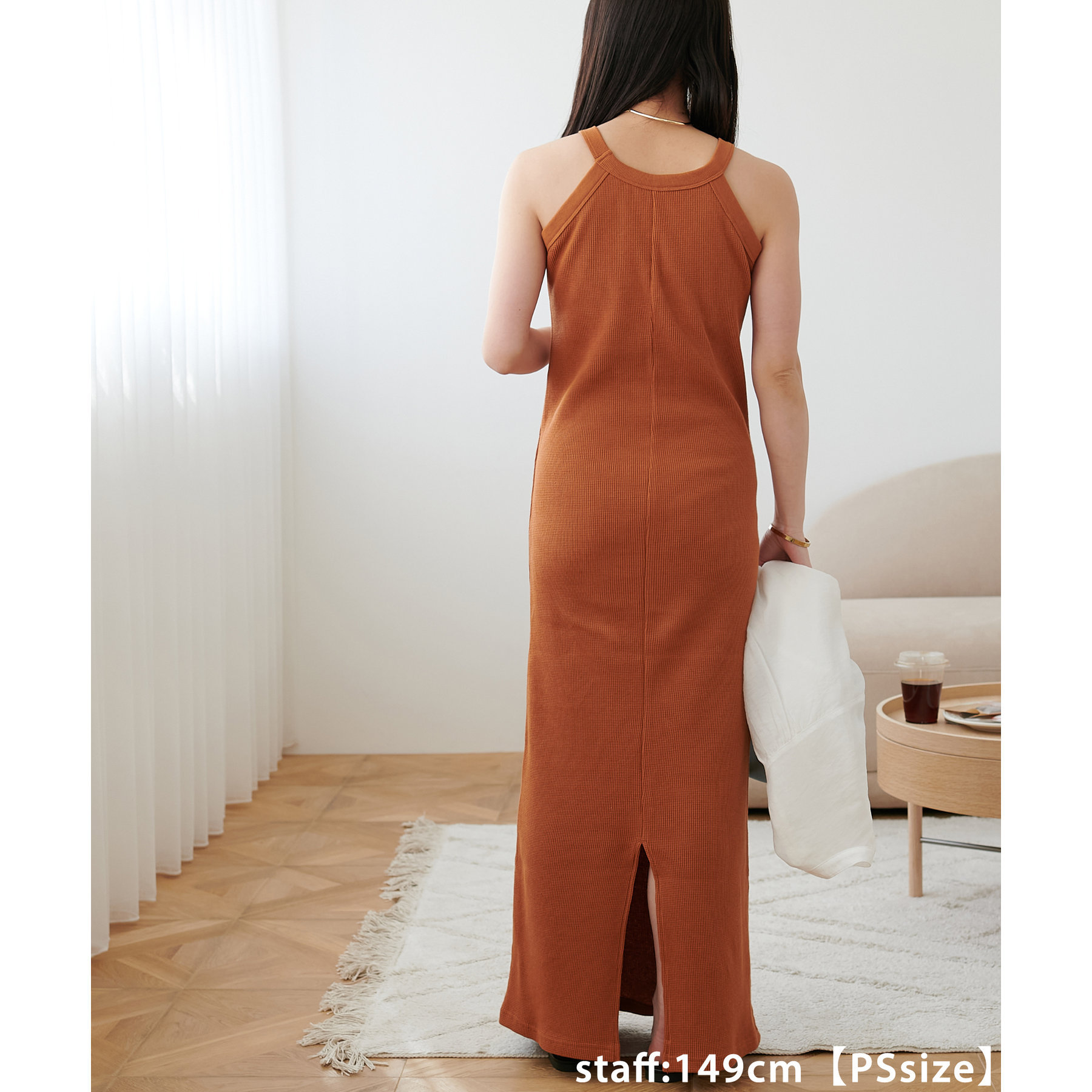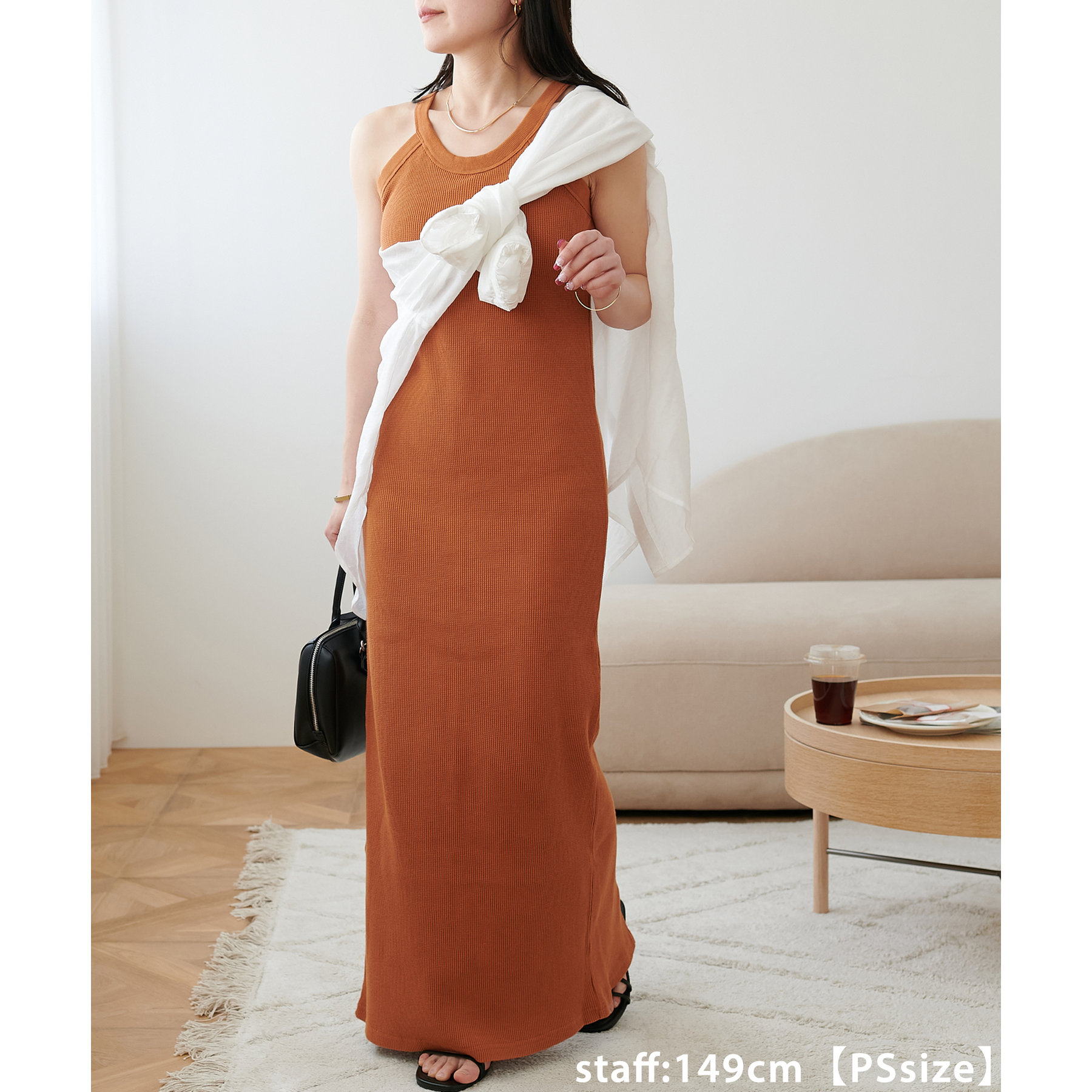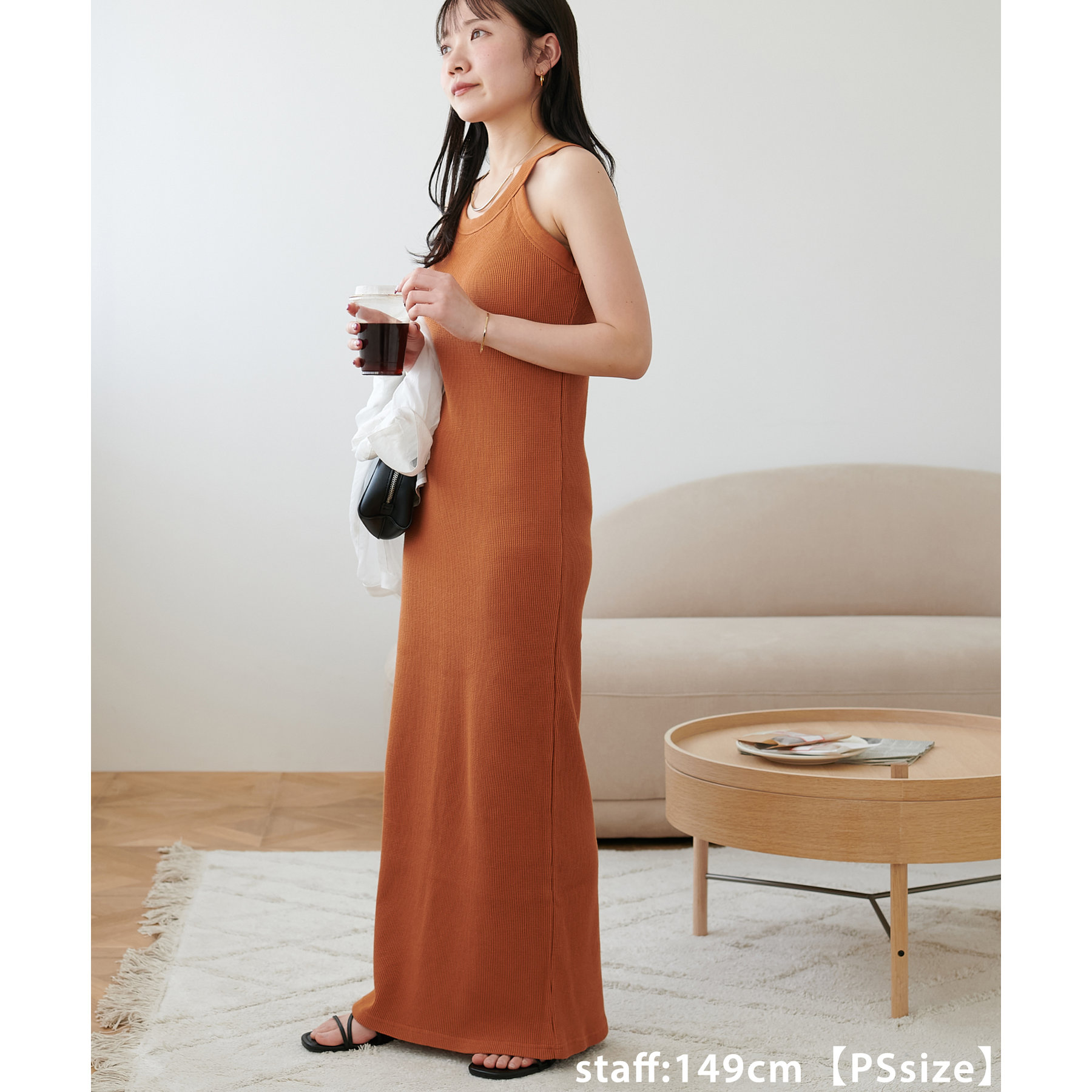 149cmスタッフ(PSサイズ着用):肩紐で調節できないワンピースは、着丈が長くてお直しが必要なものが多いですが、こちらのアイテムのPSサイズはスニーカーやサンダルで履いても引きずらないです!