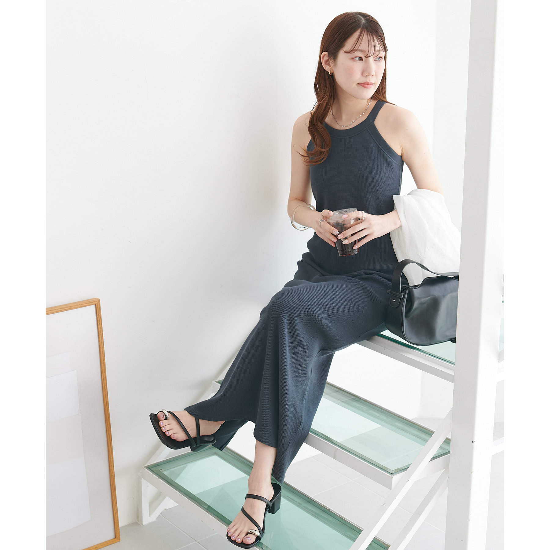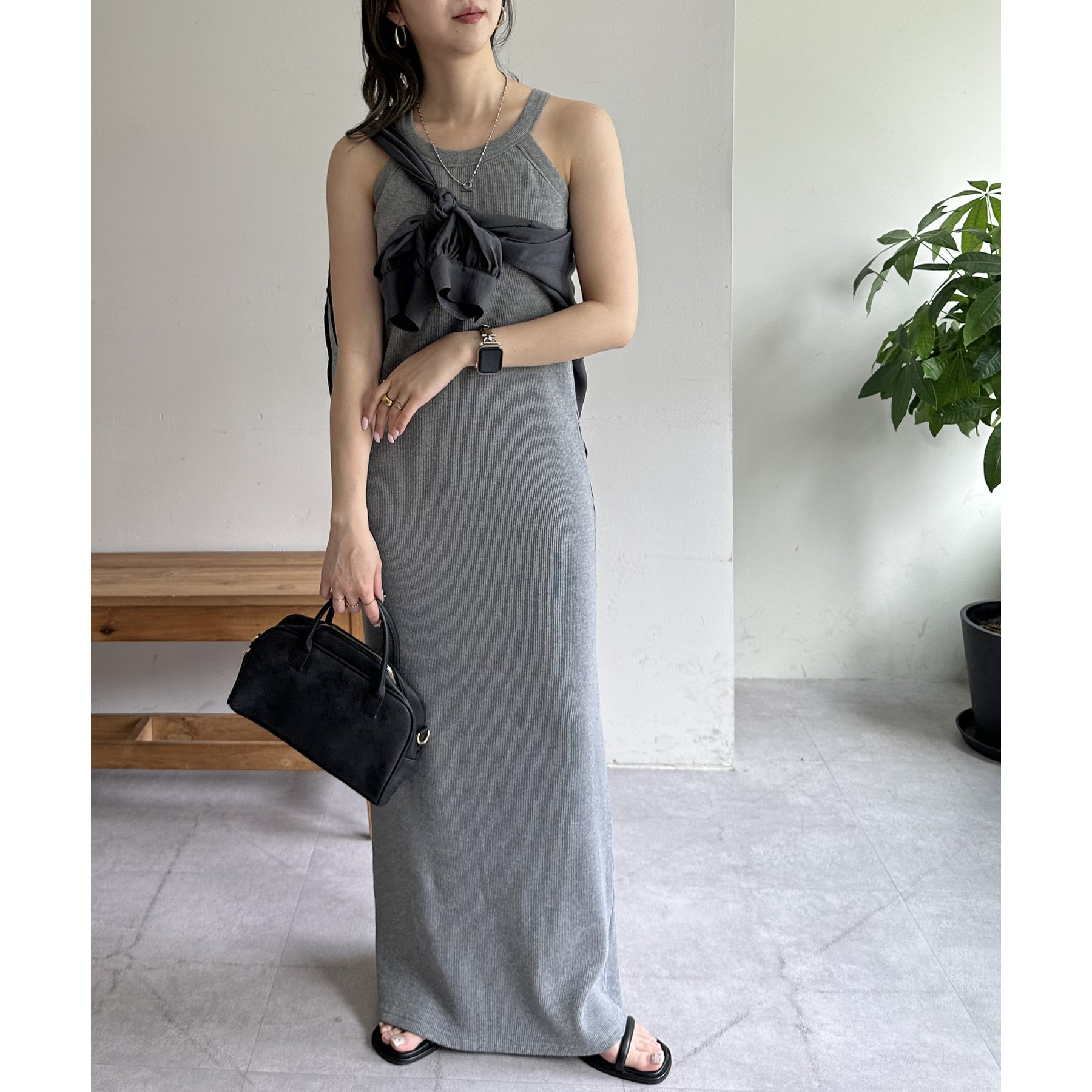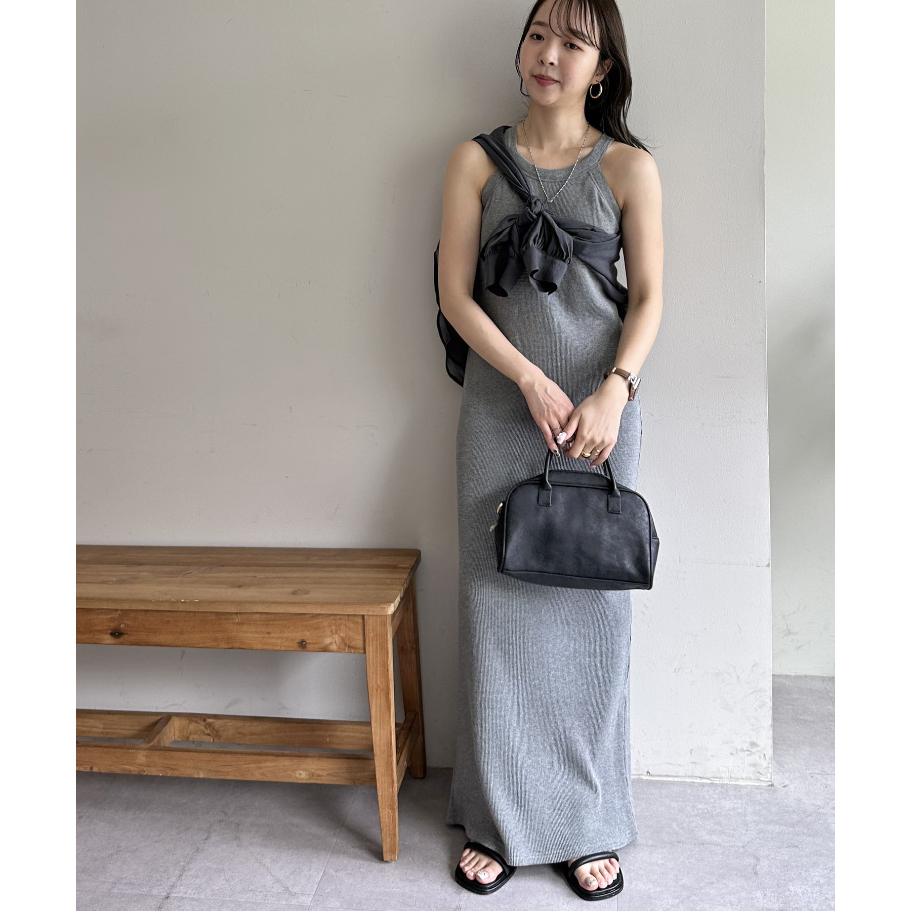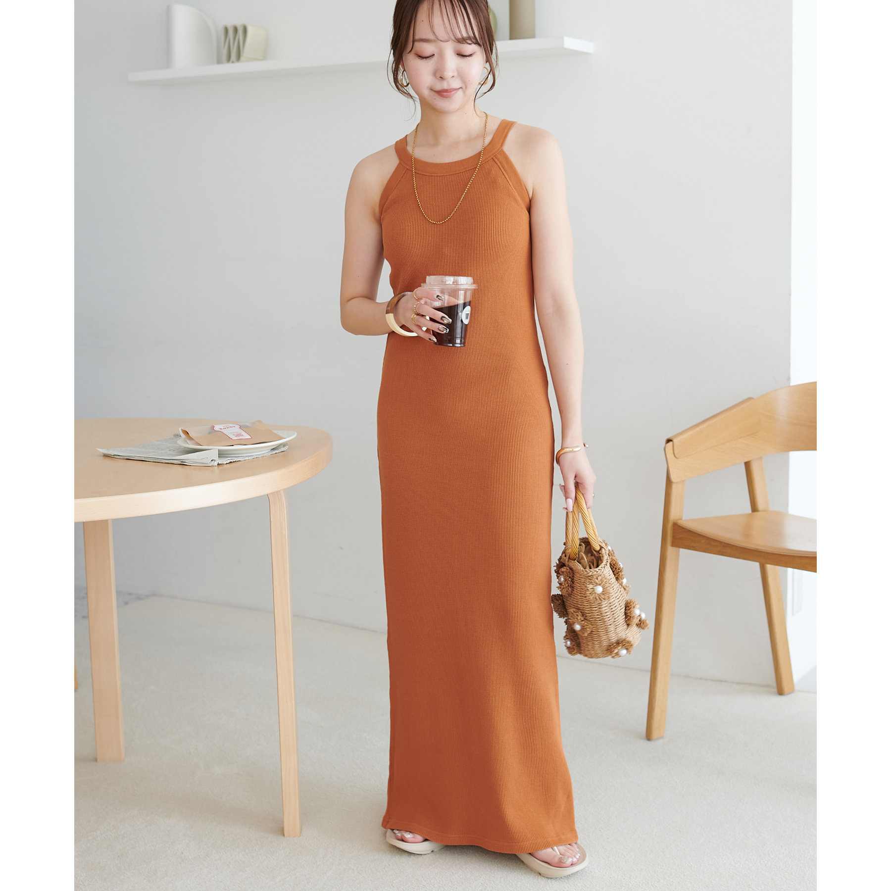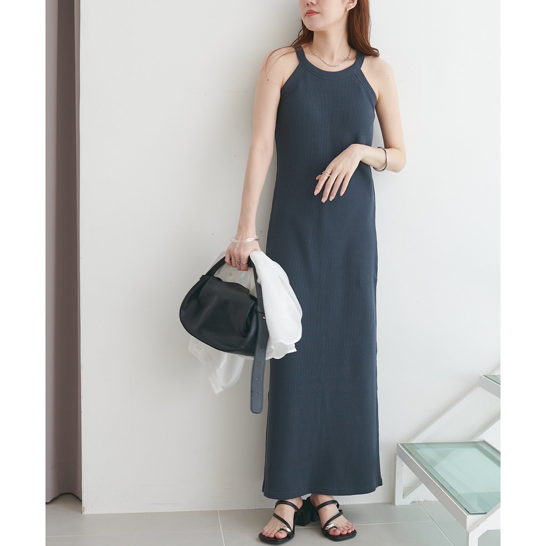 149cmスタッフ(PSサイズ着用):肩紐で調節できないワンピースは、着丈が長くてお直しが必要なものが多いですが、こちらのアイテムのPSサイズはスニーカーやサンダルで履いても引きずらないです!