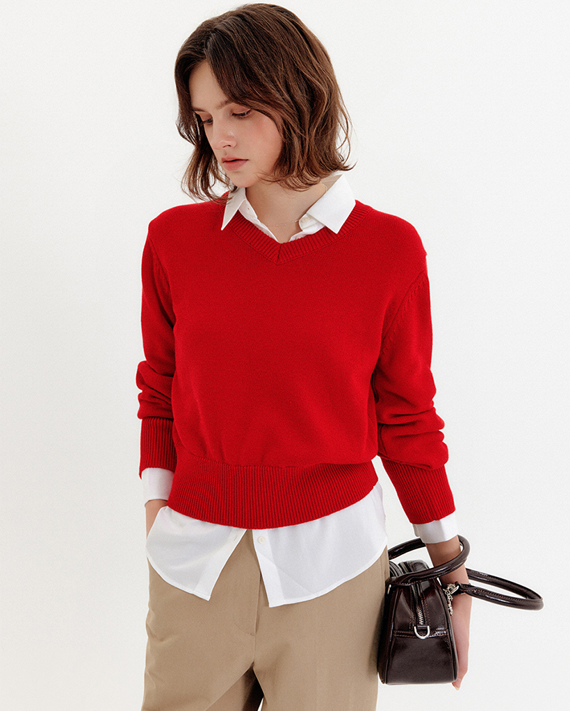 袖パフがポイントの女性らしさとトレンディさを同時に備えたVネックニット