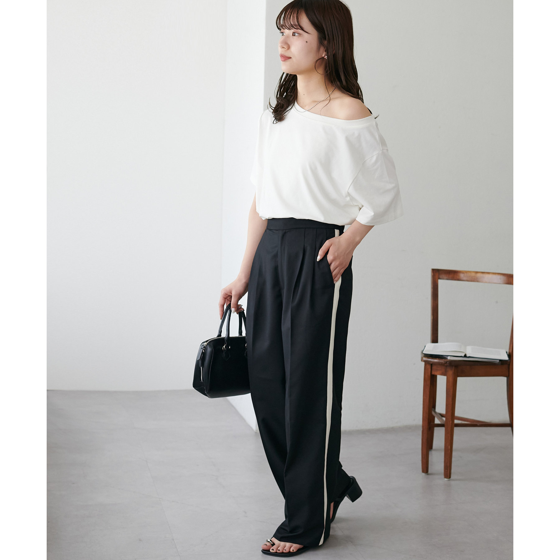 ・157cmスタッフ:サイドラインのデザインがポイントになるので、シンプルなトップスや無地のアイテムと合わせてもコーデが決まります!