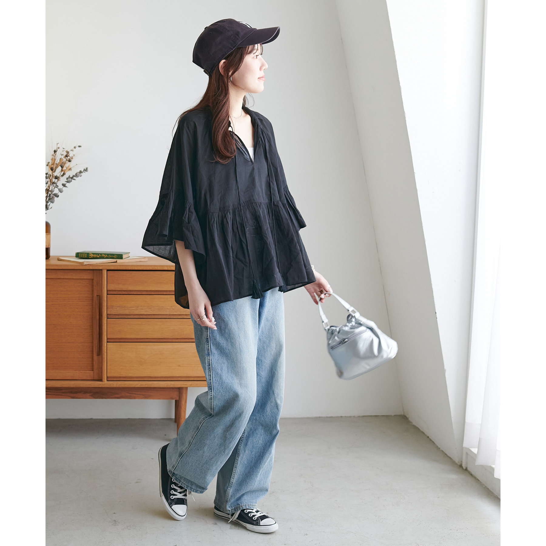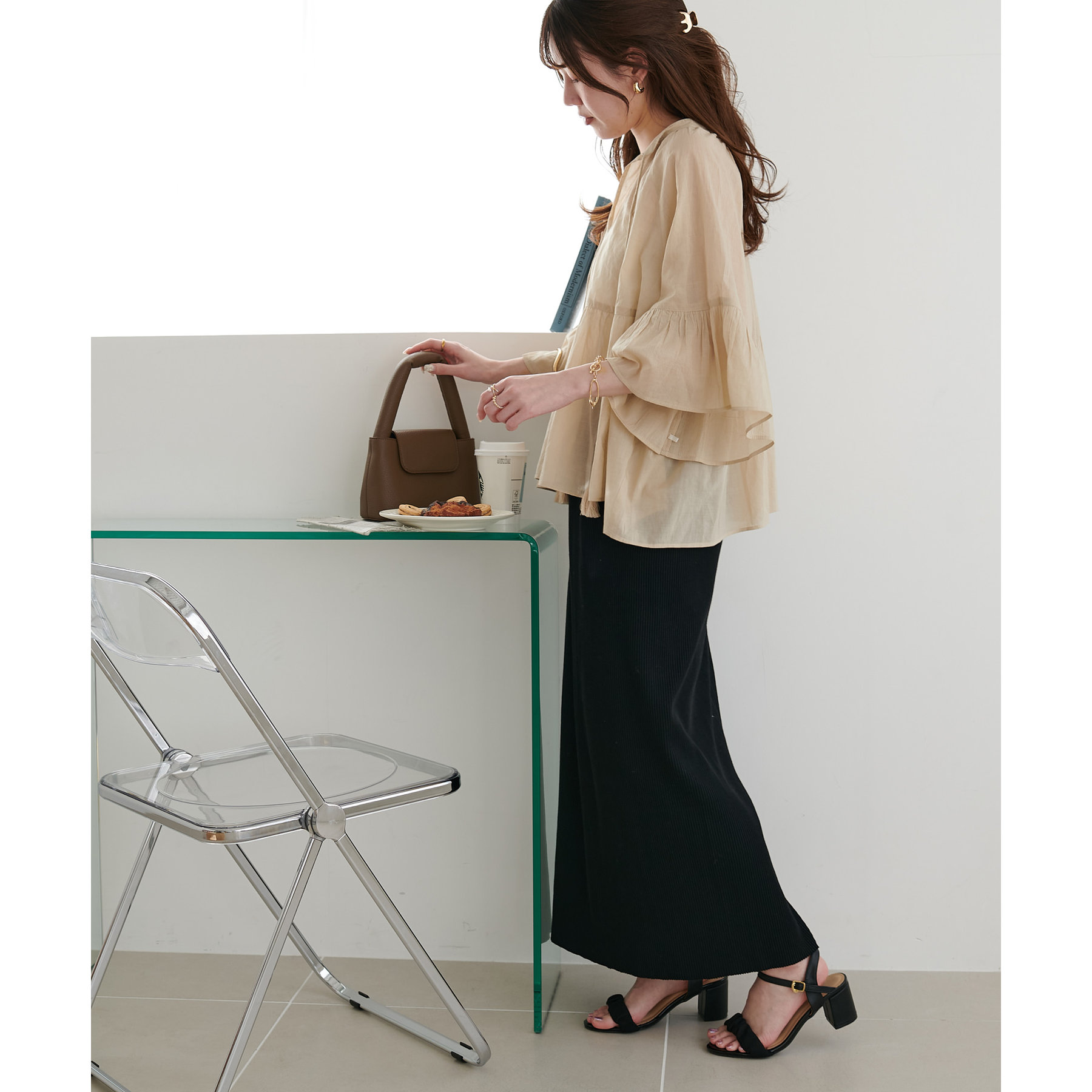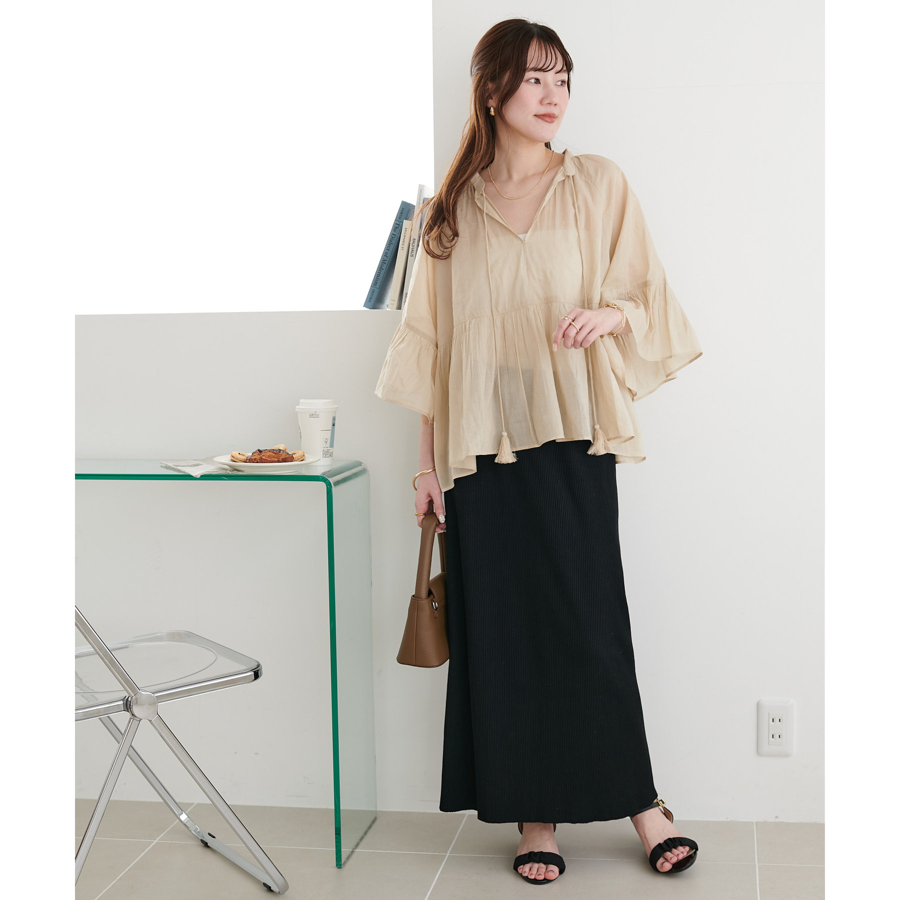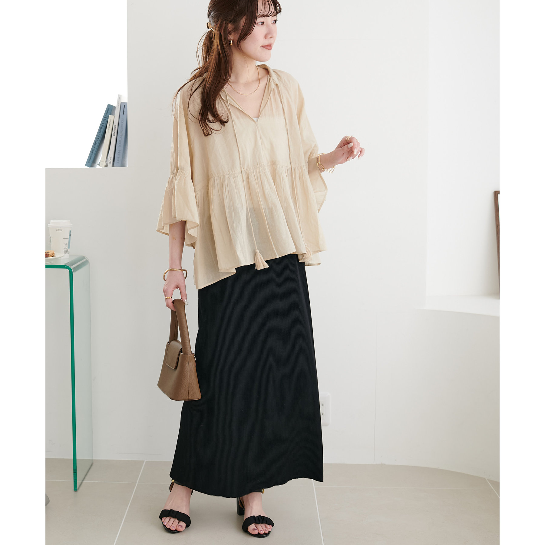 一枚で着てもサマになるブラウスですが、シンプルなデザインだからこそ、様々なボトムスとの組み合わせも楽しめます。