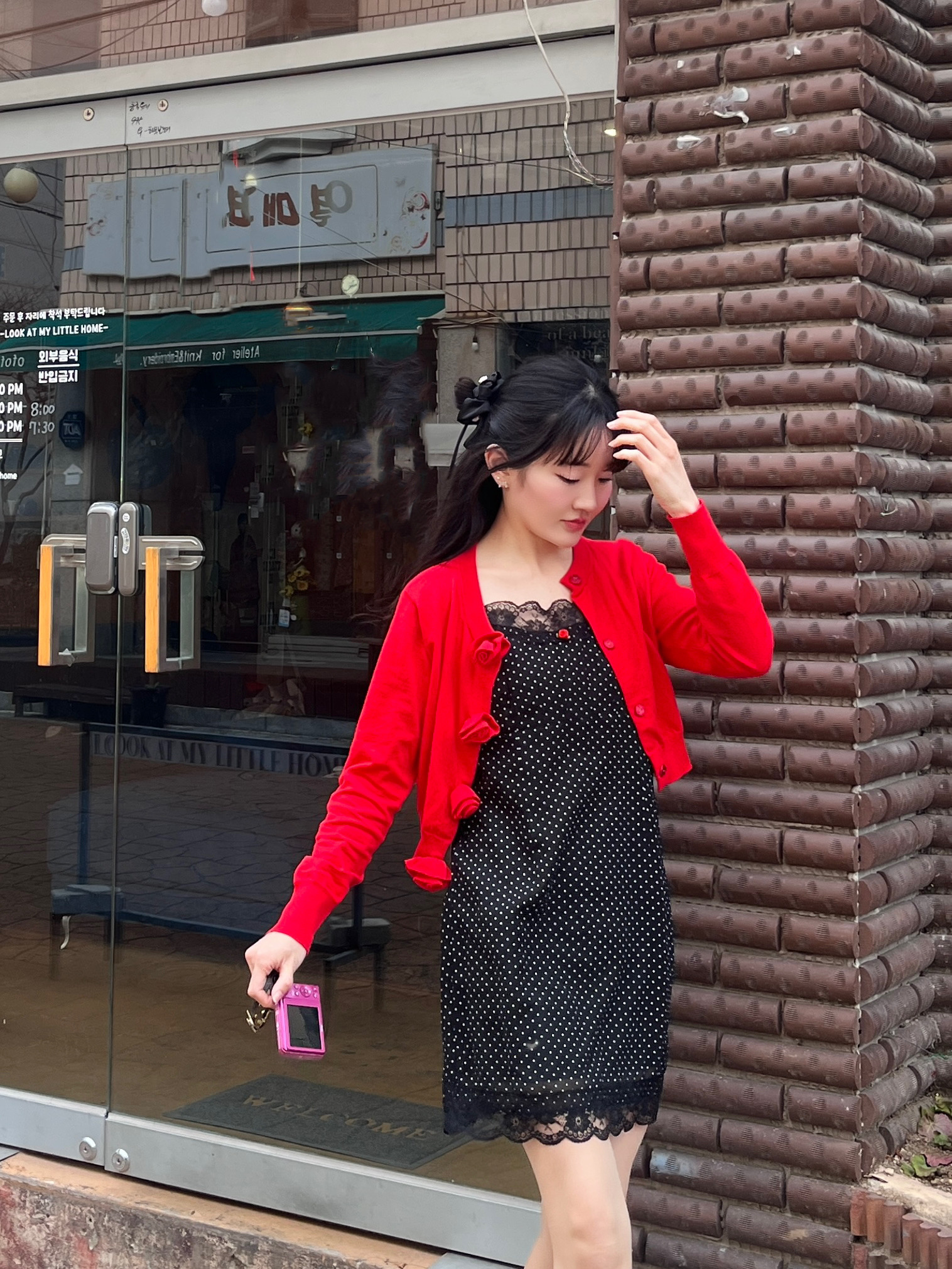 シンプルながらも胸元にワンポイント添えたバラモチーフがアクセントとなったドットキャミワンピース。