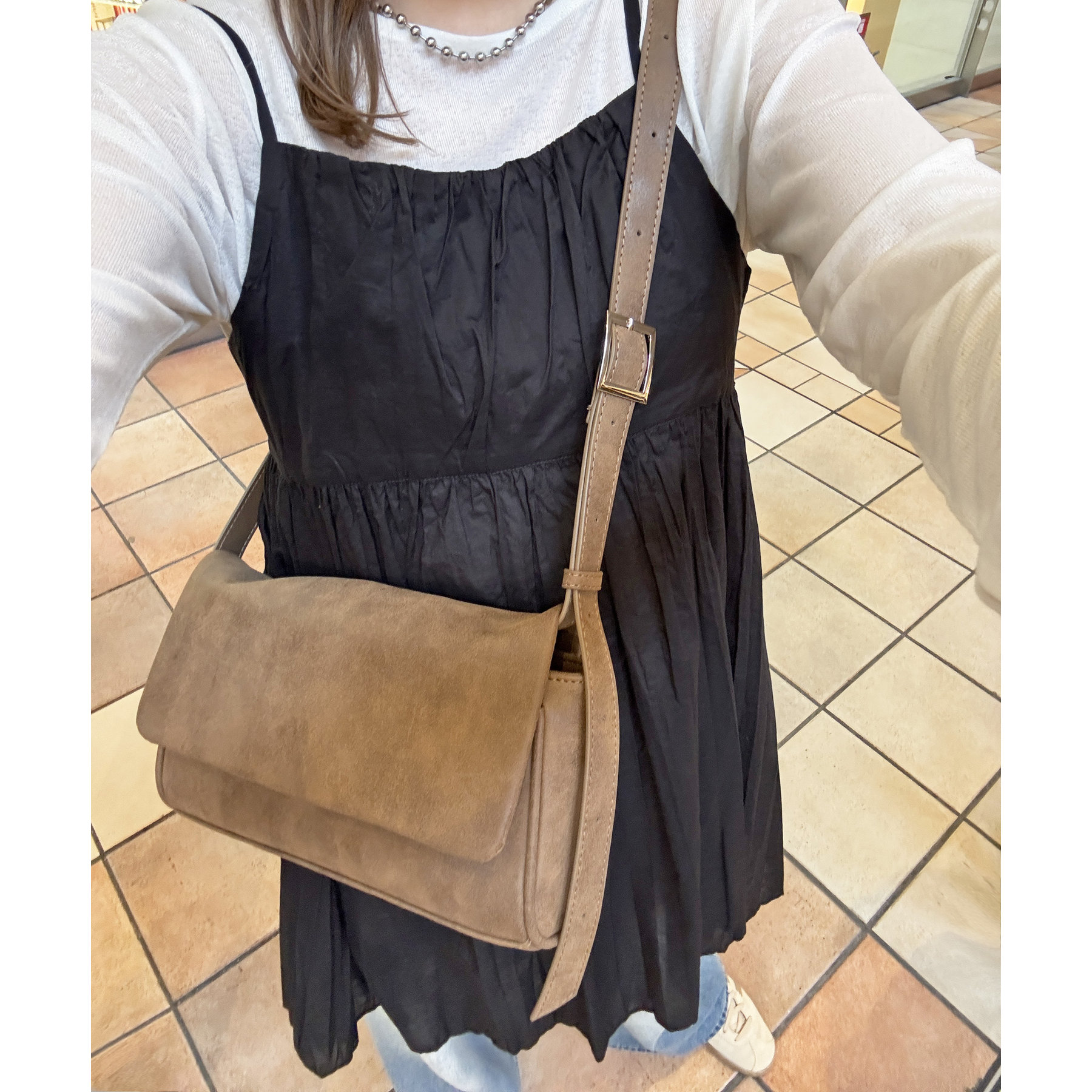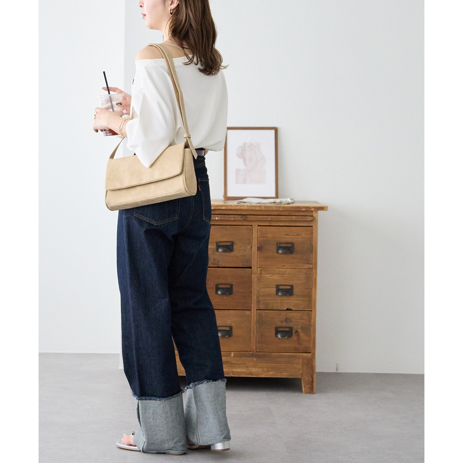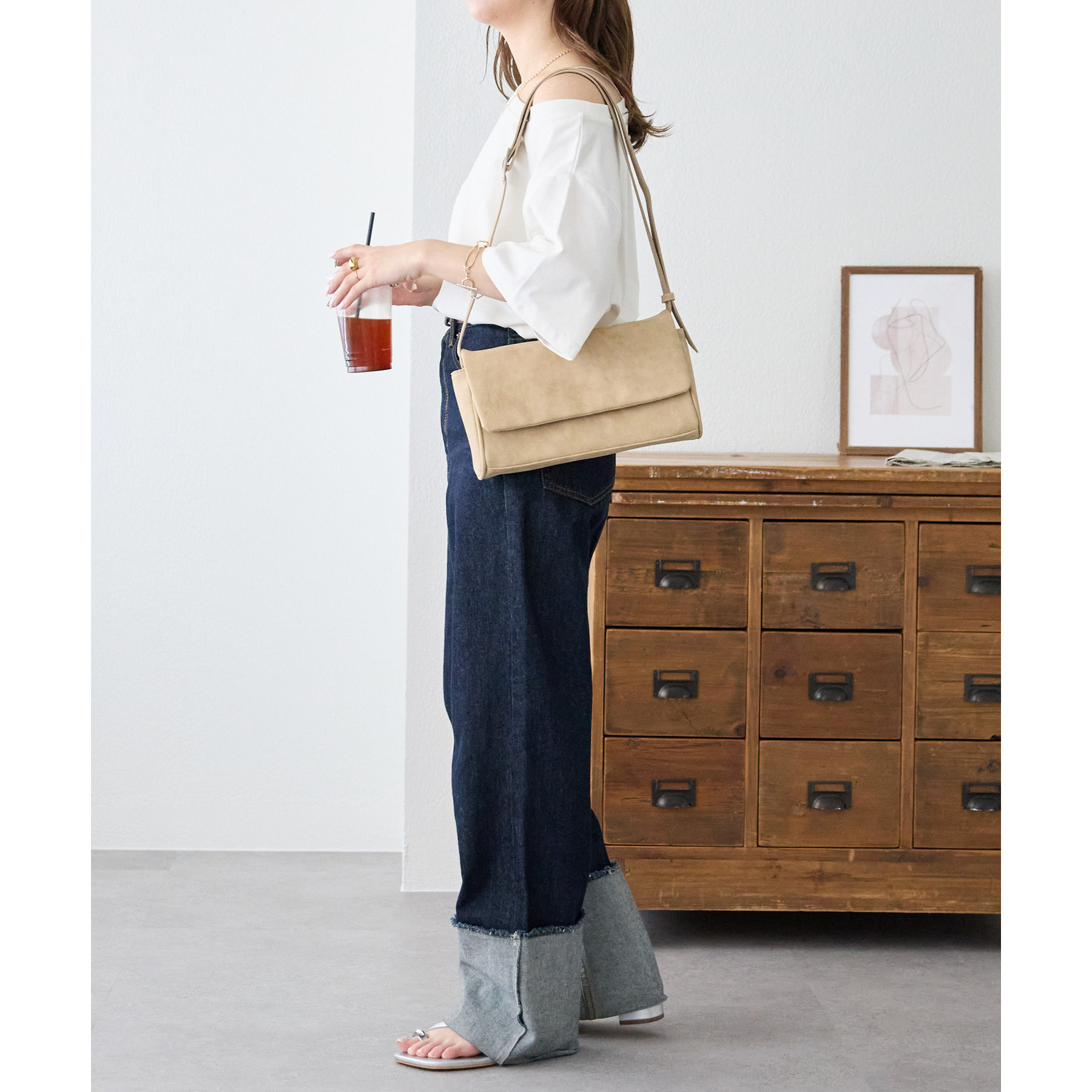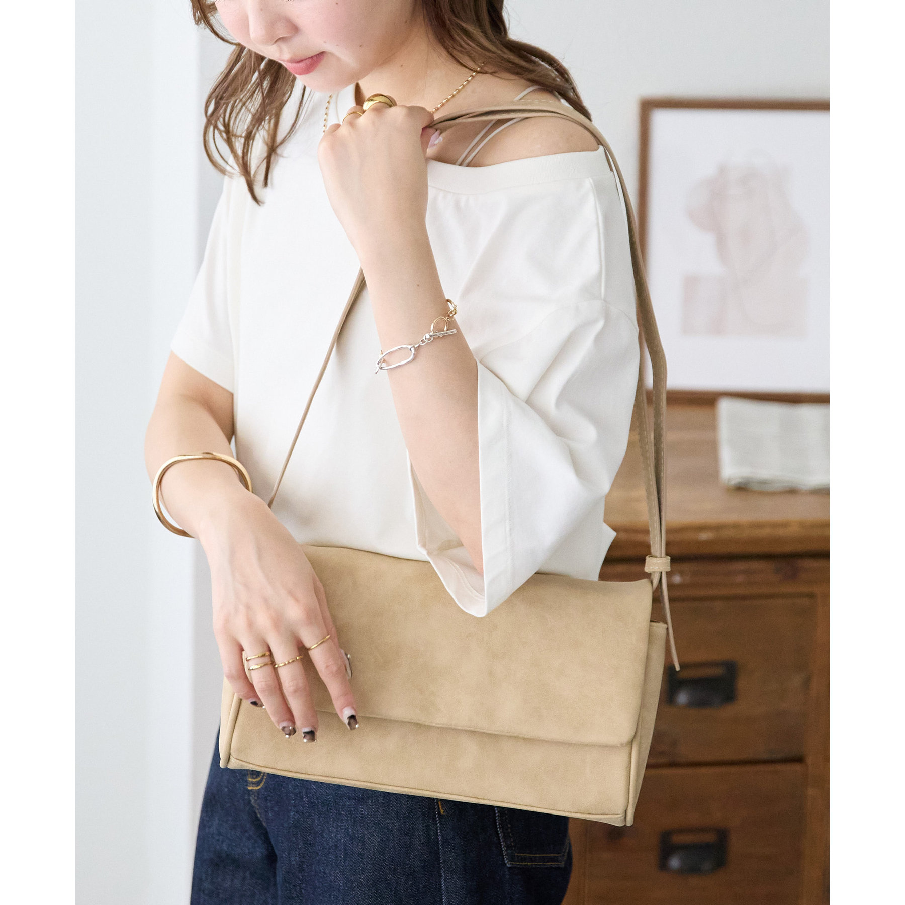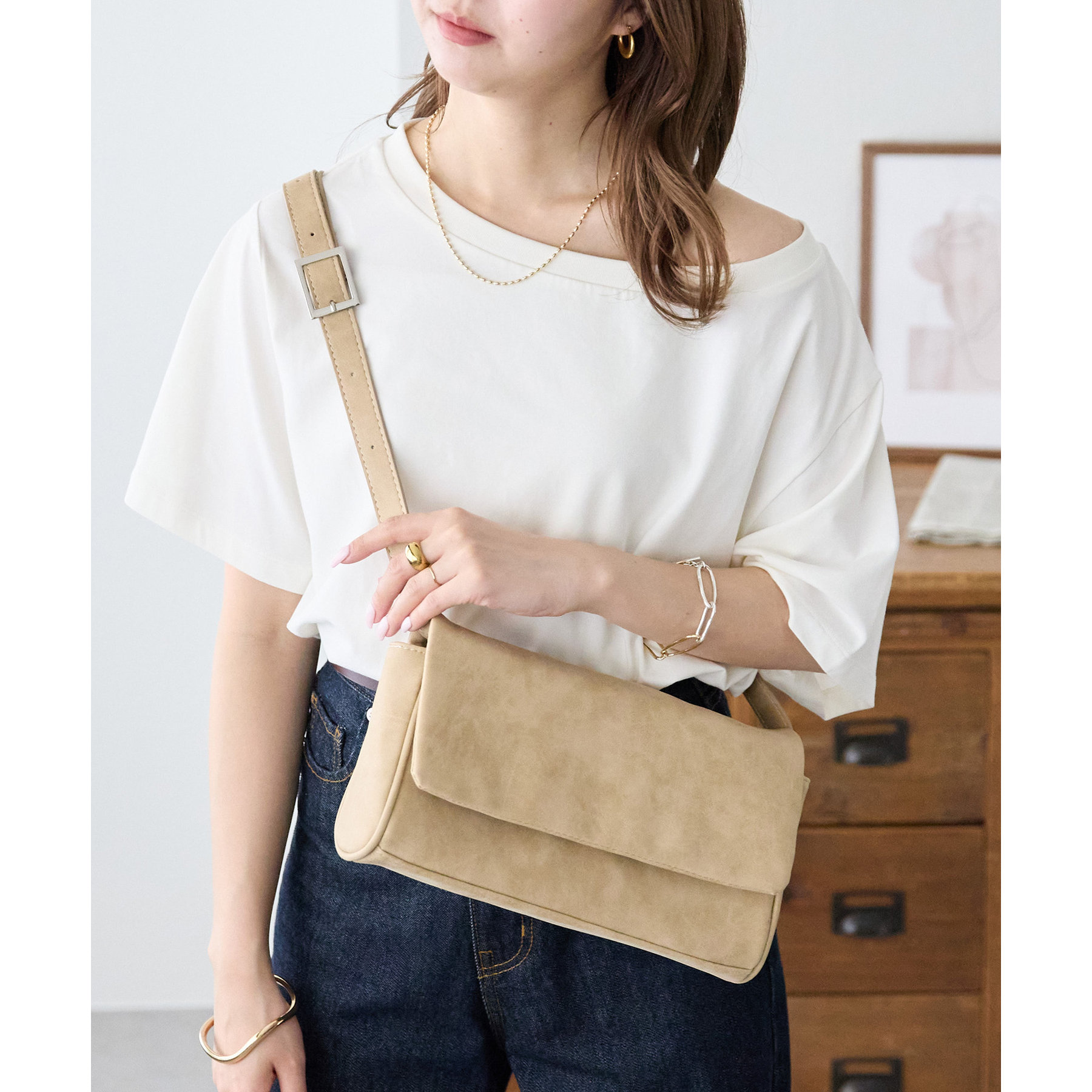 トレンドの横長フォルムとスウェード素材で、カジュアルからきれいめなコーデまで相性抜群のショルダーバッグ。フラップ部分にはマグネットボタンが付いているので開閉が楽ちん◎長さの調節と取り外しが可能なショルダー紐なのでその日の気分や服装に合わせて持ち方を変えられます。また、ショルダー紐のバックルがコーデのアクセントに♪