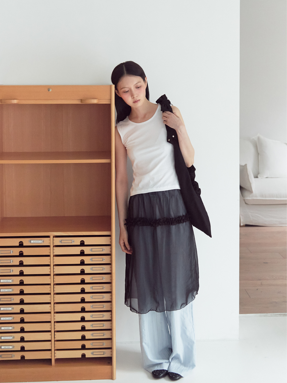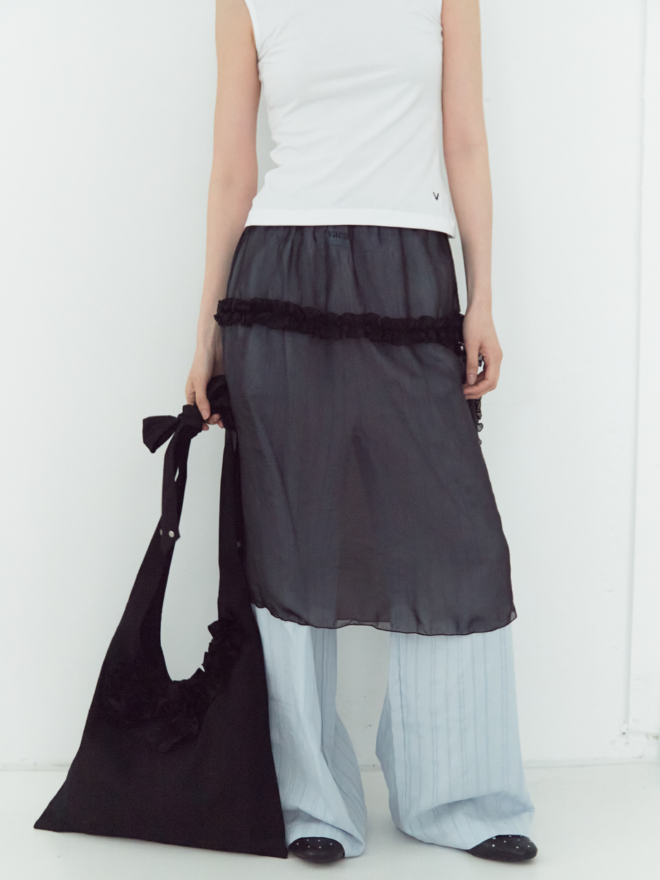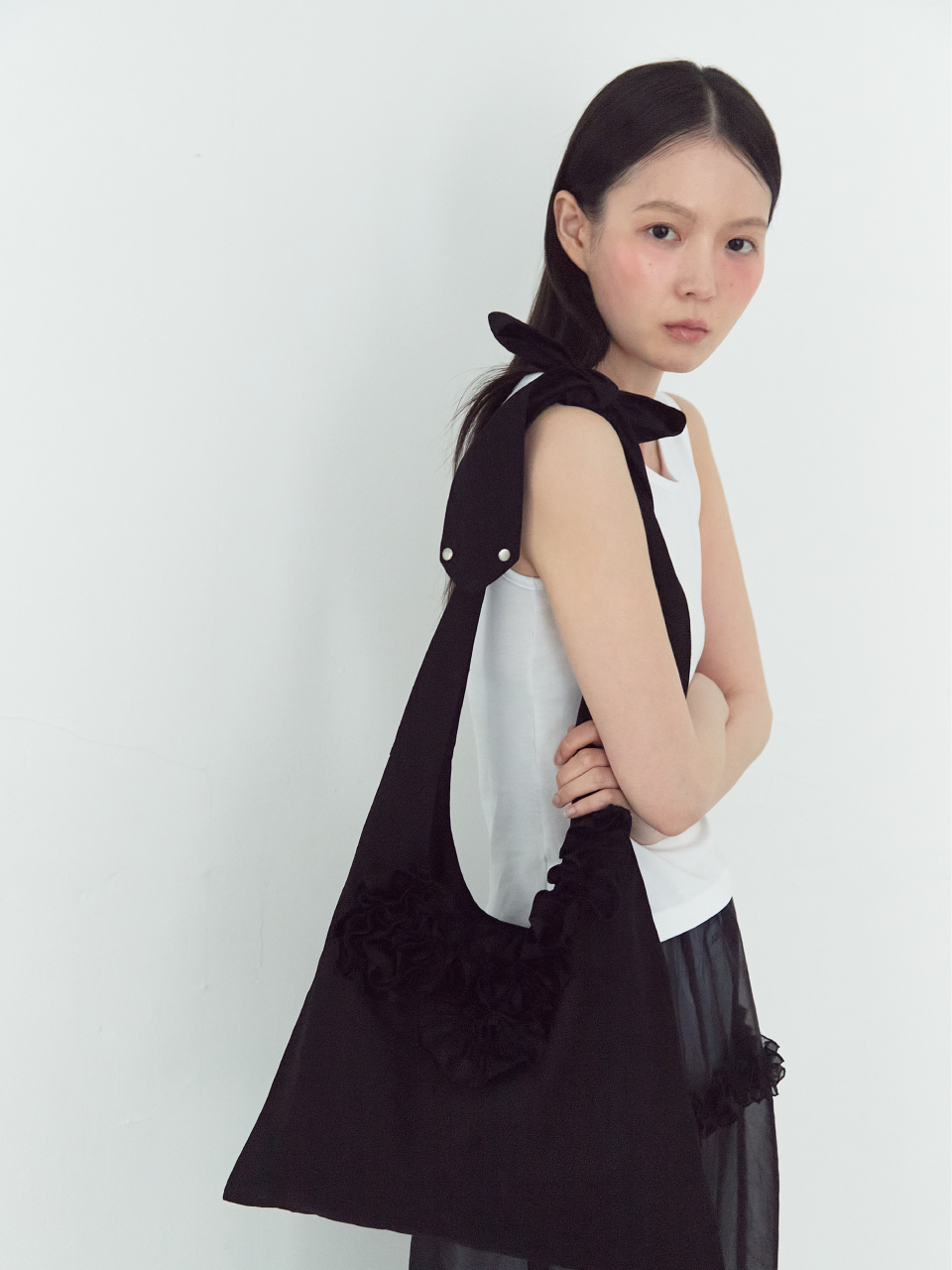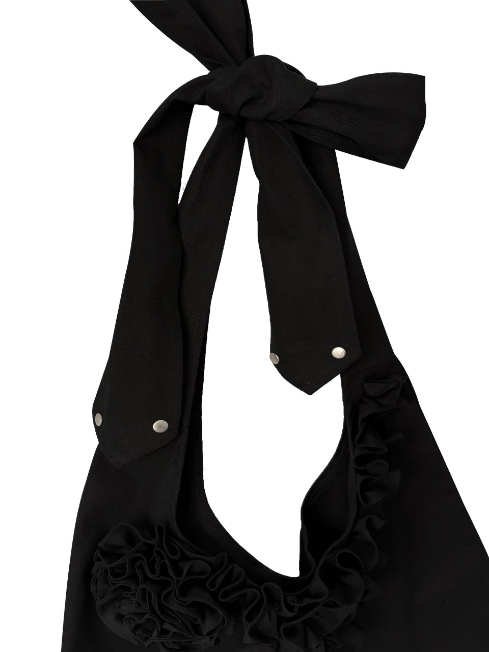 ・花柄のフリルやリベットのディテールが魅力的なアイテム。