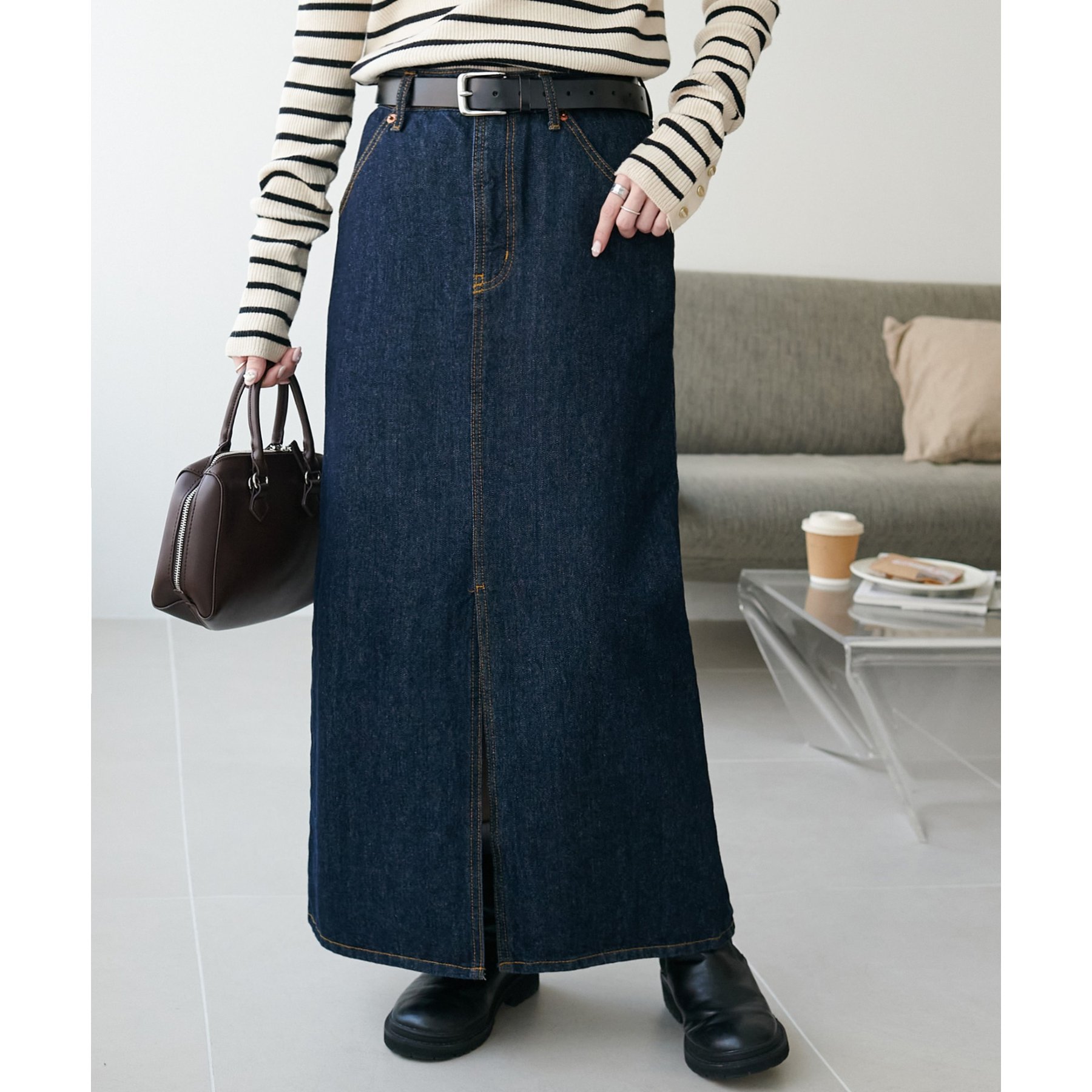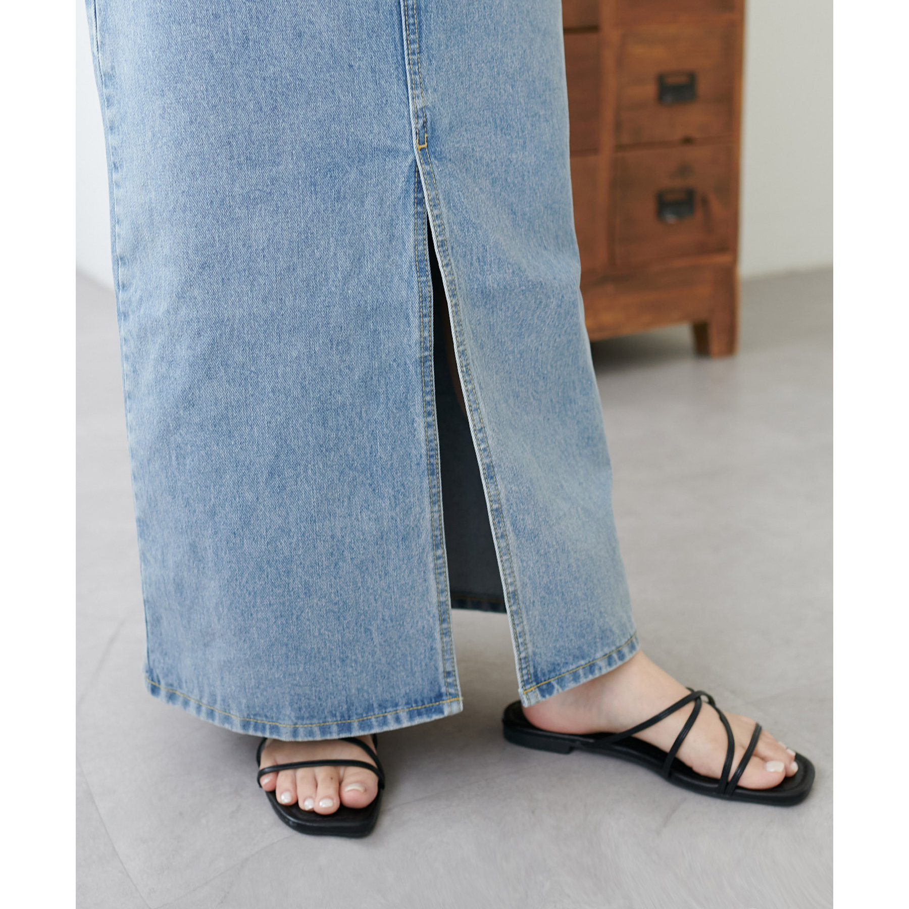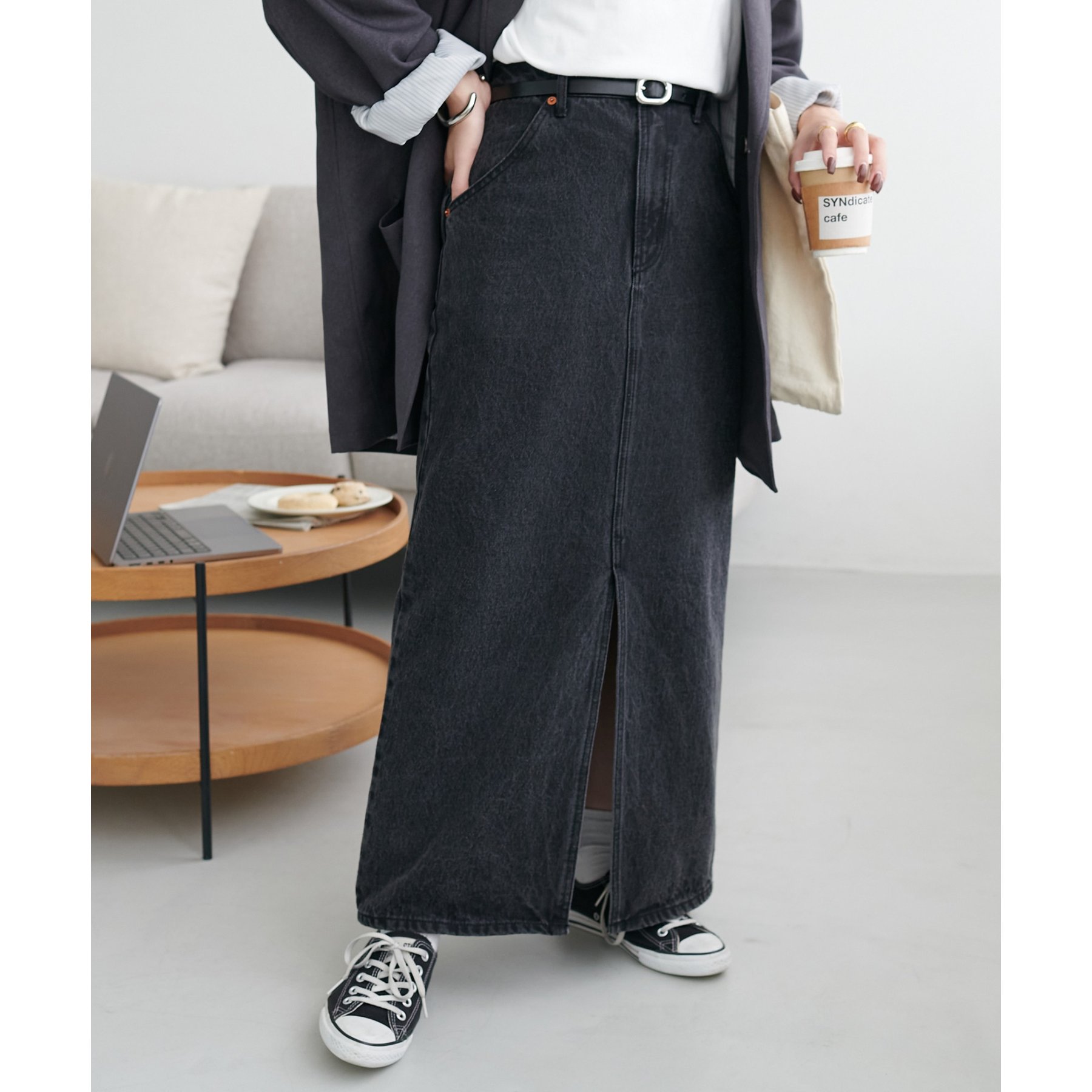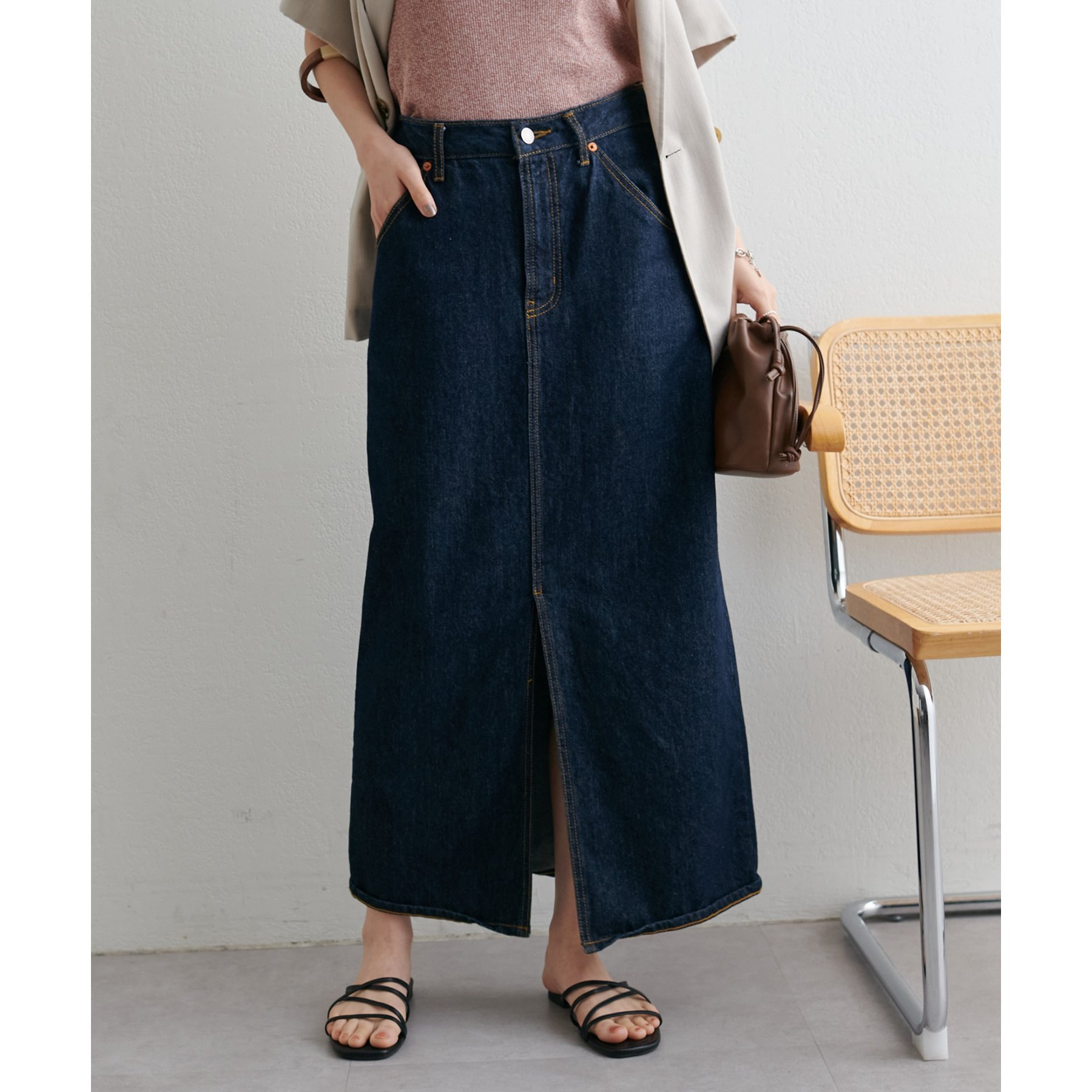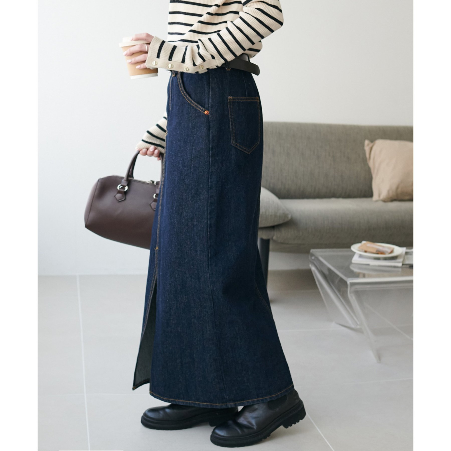 華奢見えする美シルエットのデニムナロースカート。ベーシックなデザインで様々なトップスと合わせやすく、着回しのできるアイテムです。前スリットも入っているので歩きやすさも抜群!