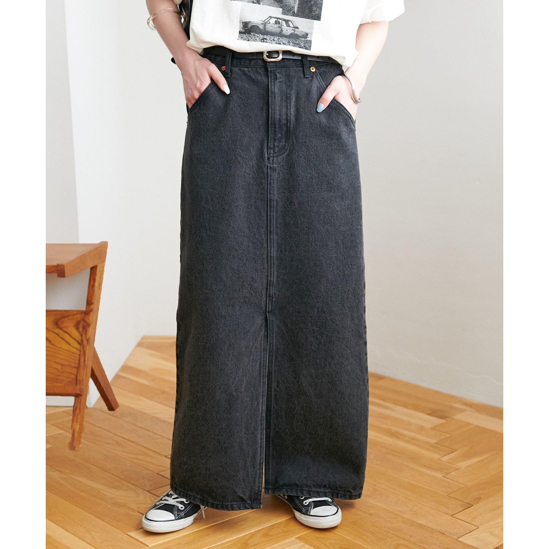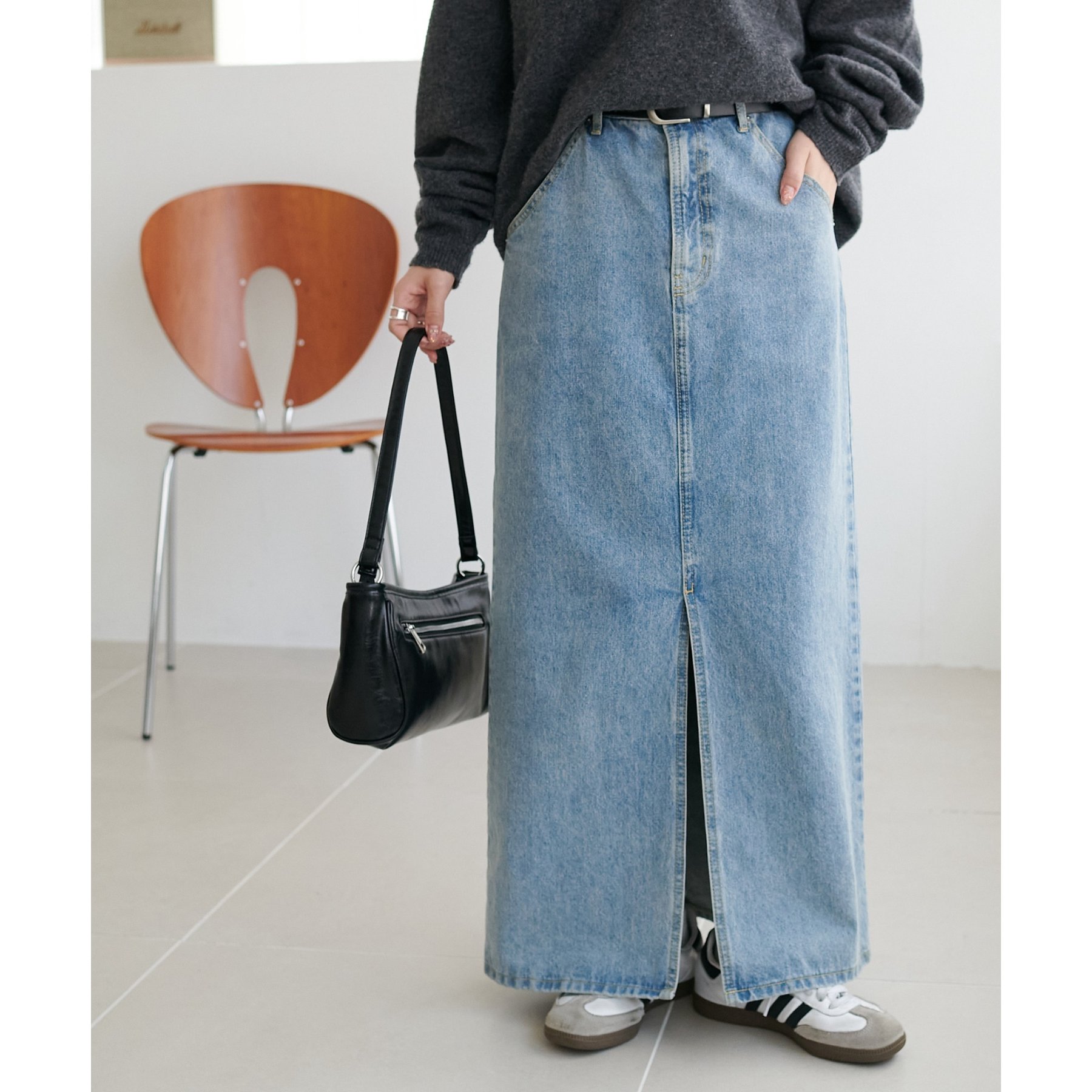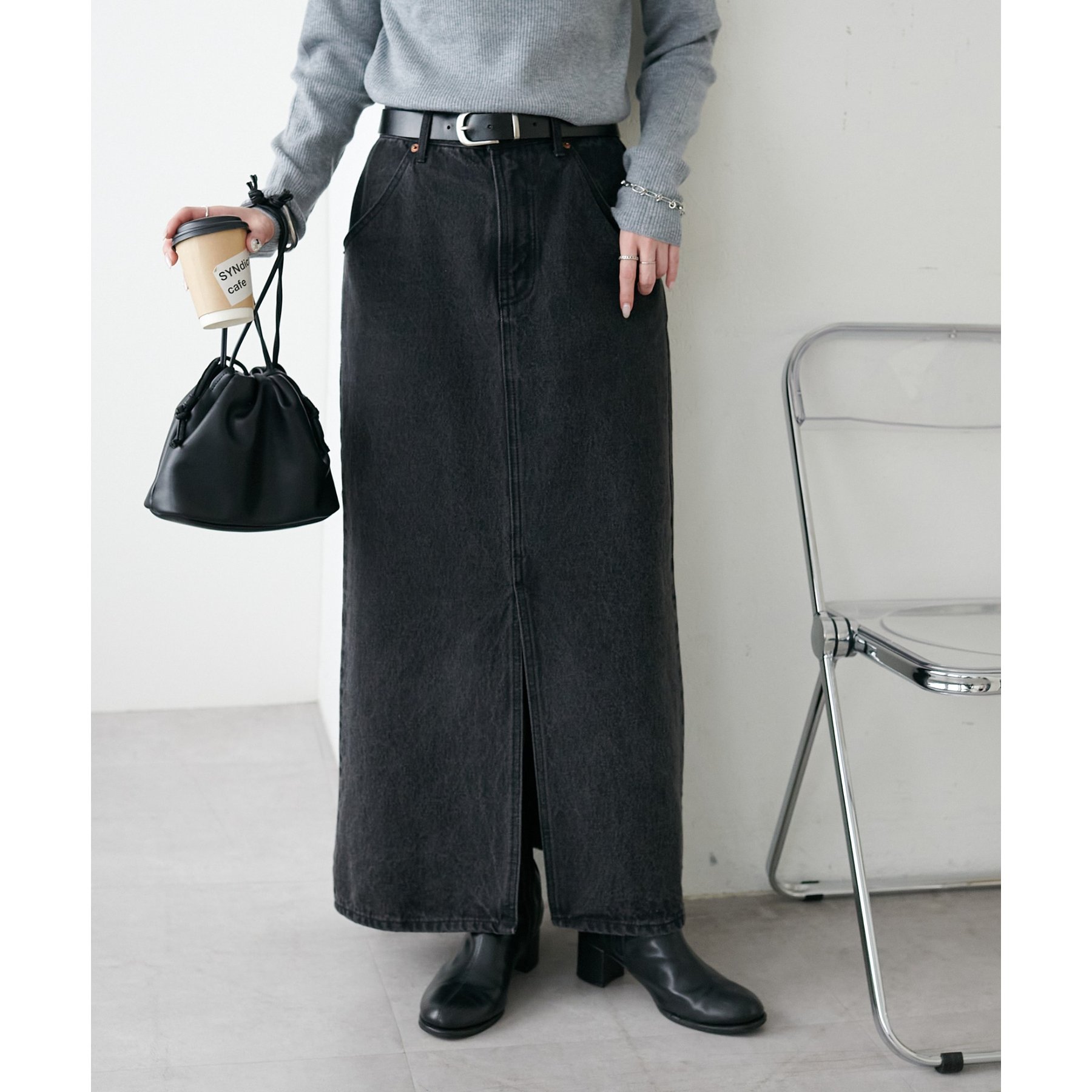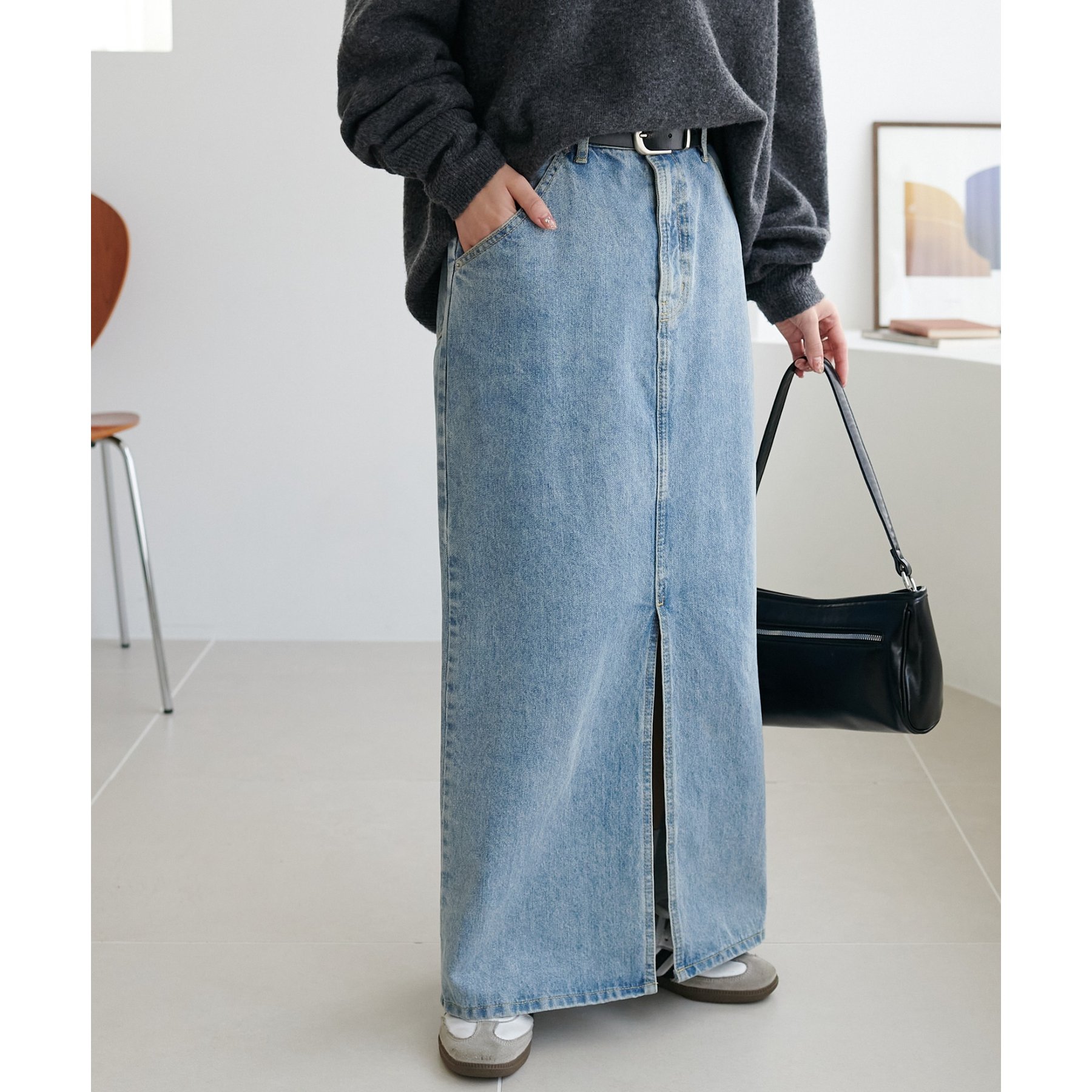 華奢見えする美シルエットのデニムナロースカート。ベーシックなデザインで様々なトップスと合わせやすく、着回しのできるアイテムです。前スリットも入っているので歩きやすさも抜群!