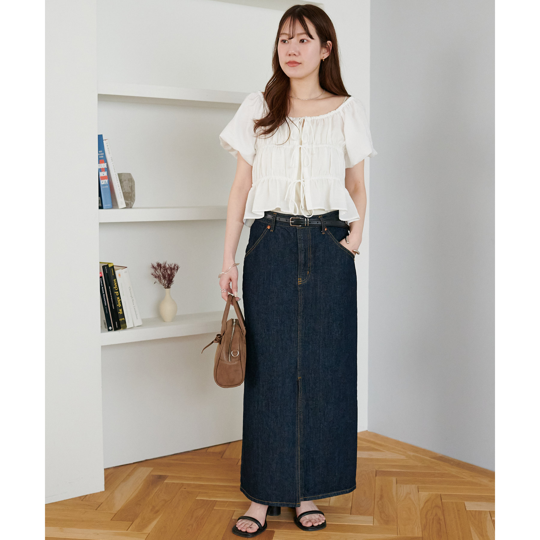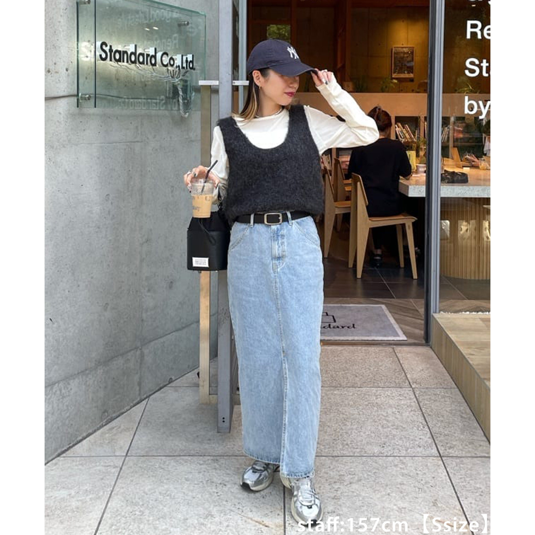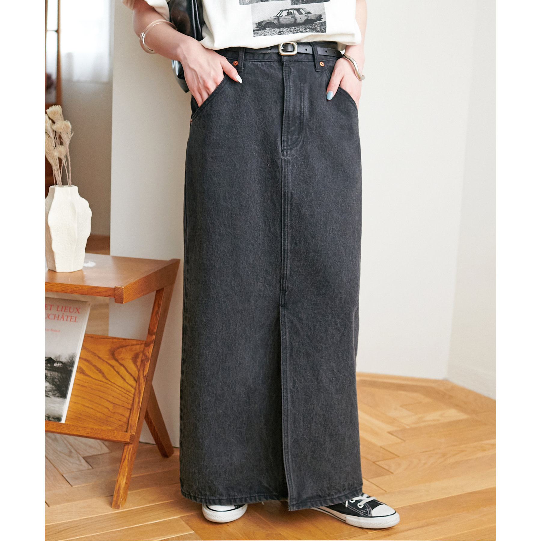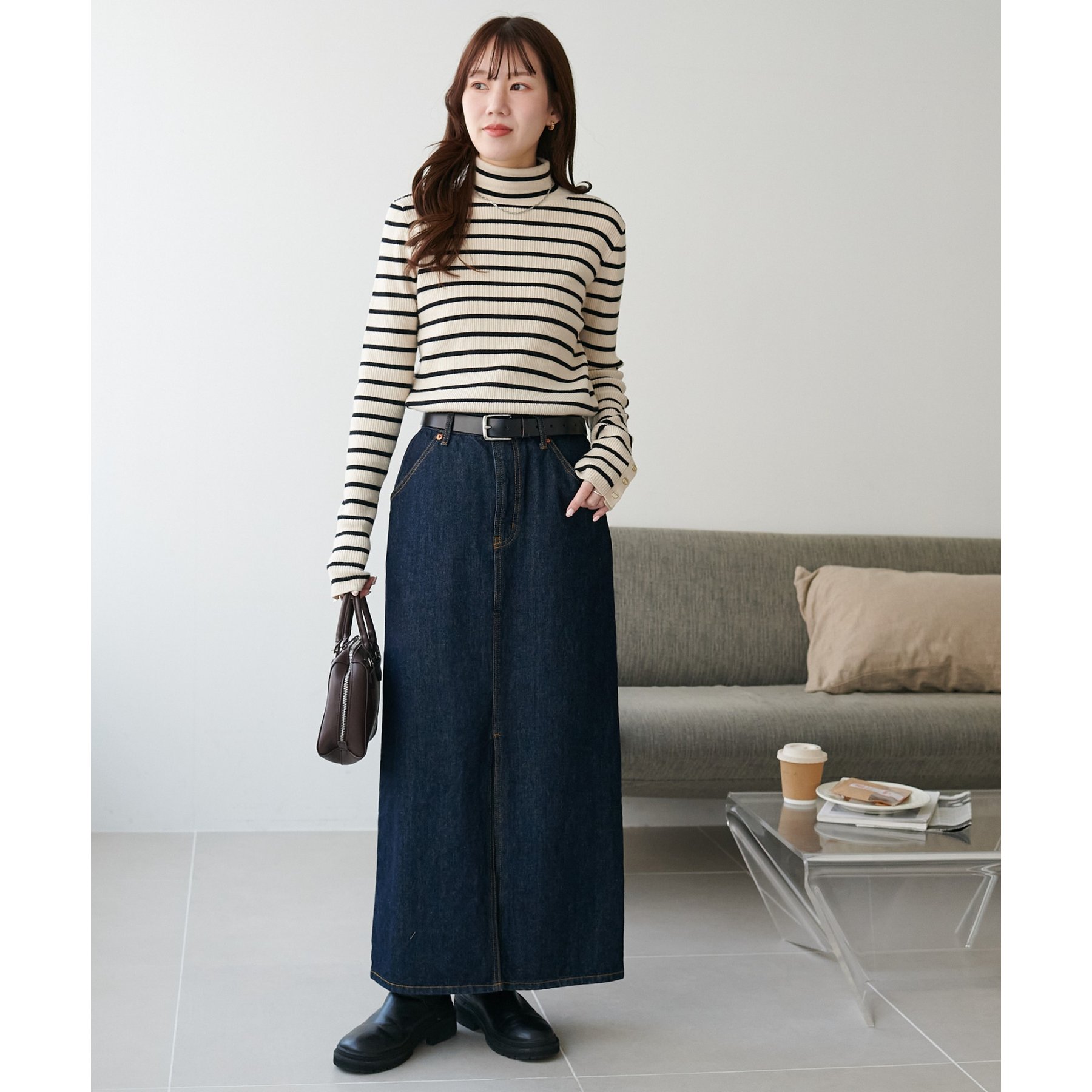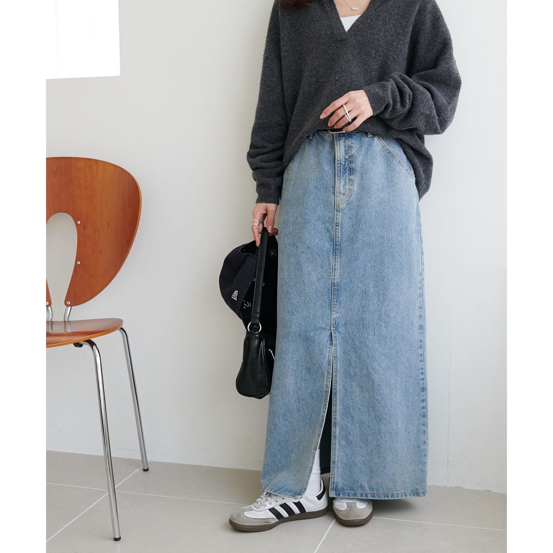 華奢見えする美シルエットのデニムナロースカート。ベーシックなデザインで様々なトップスと合わせやすく、着回しのできるアイテムです。前スリットも入っているので歩きやすさも抜群!