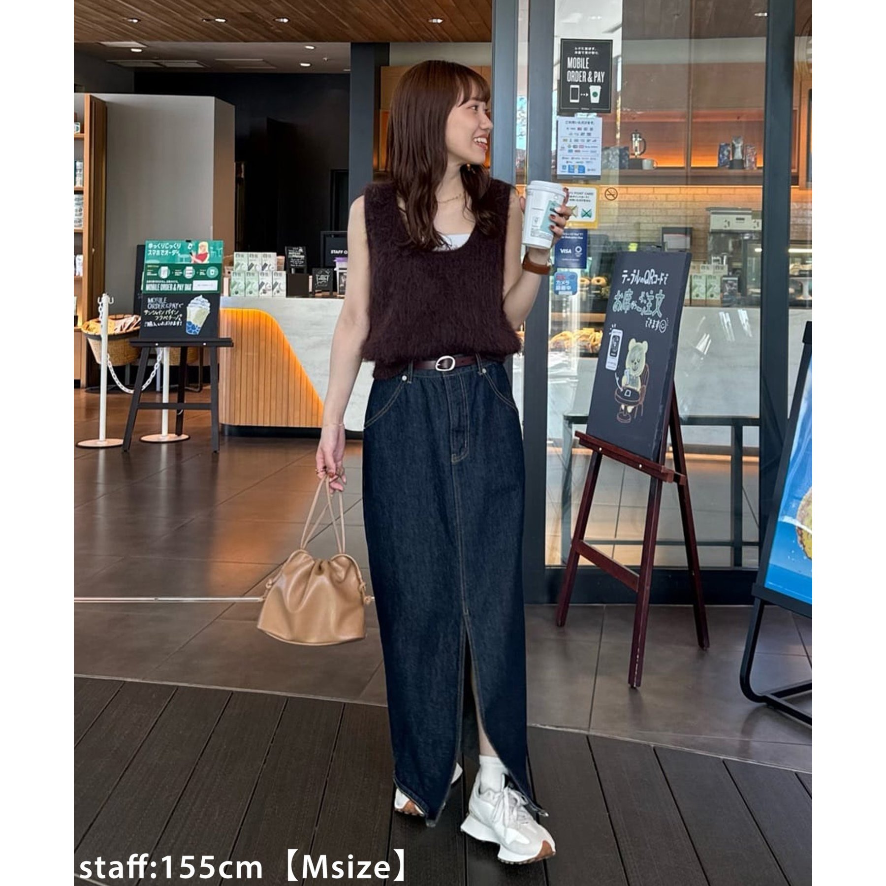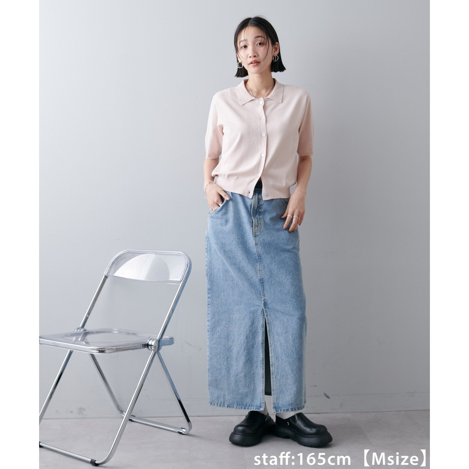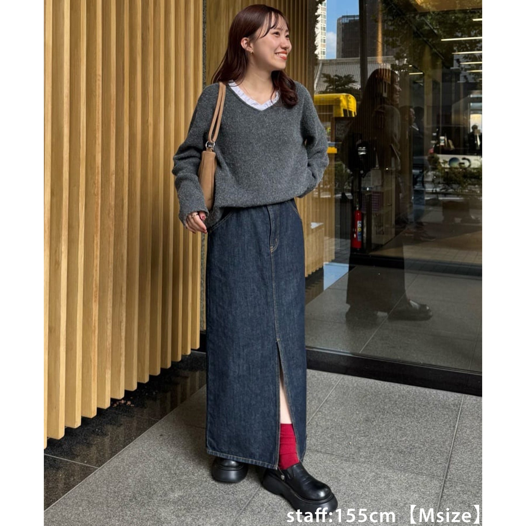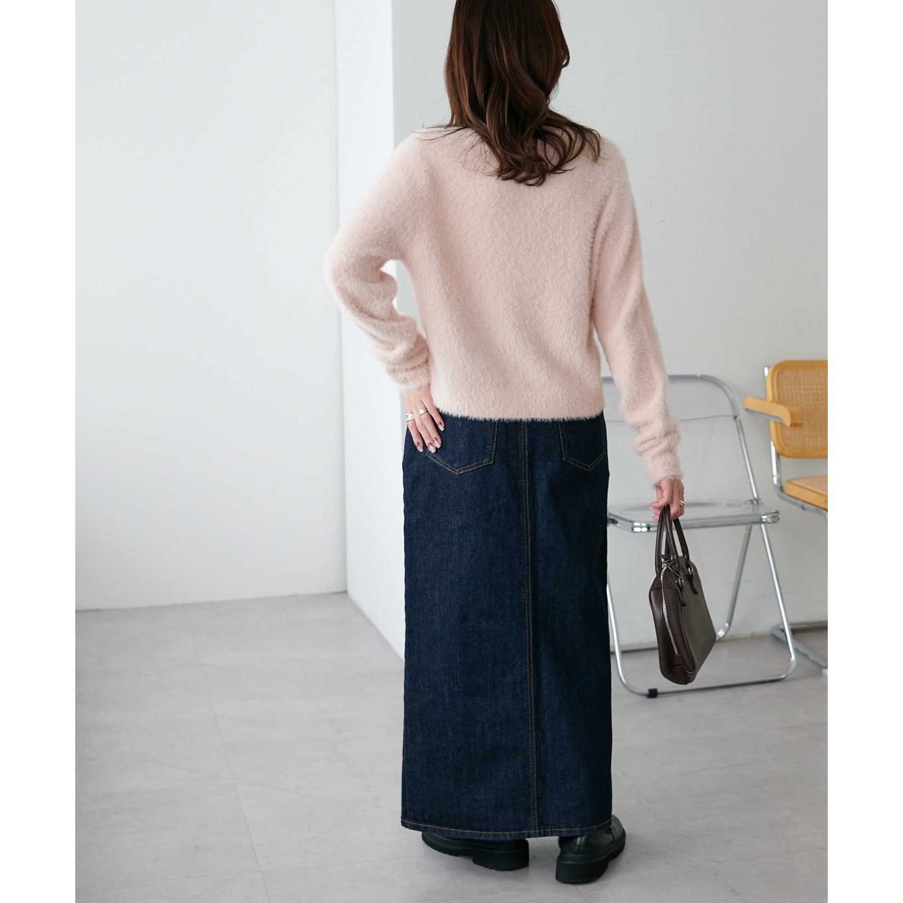 華奢見えする美シルエットのデニムナロースカート。ベーシックなデザインで様々なトップスと合わせやすく、着回しのできるアイテムです。前スリットも入っているので歩きやすさも抜群!