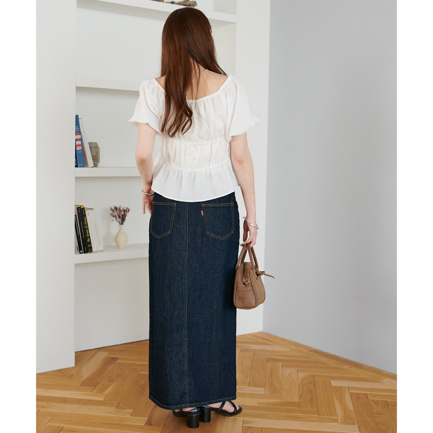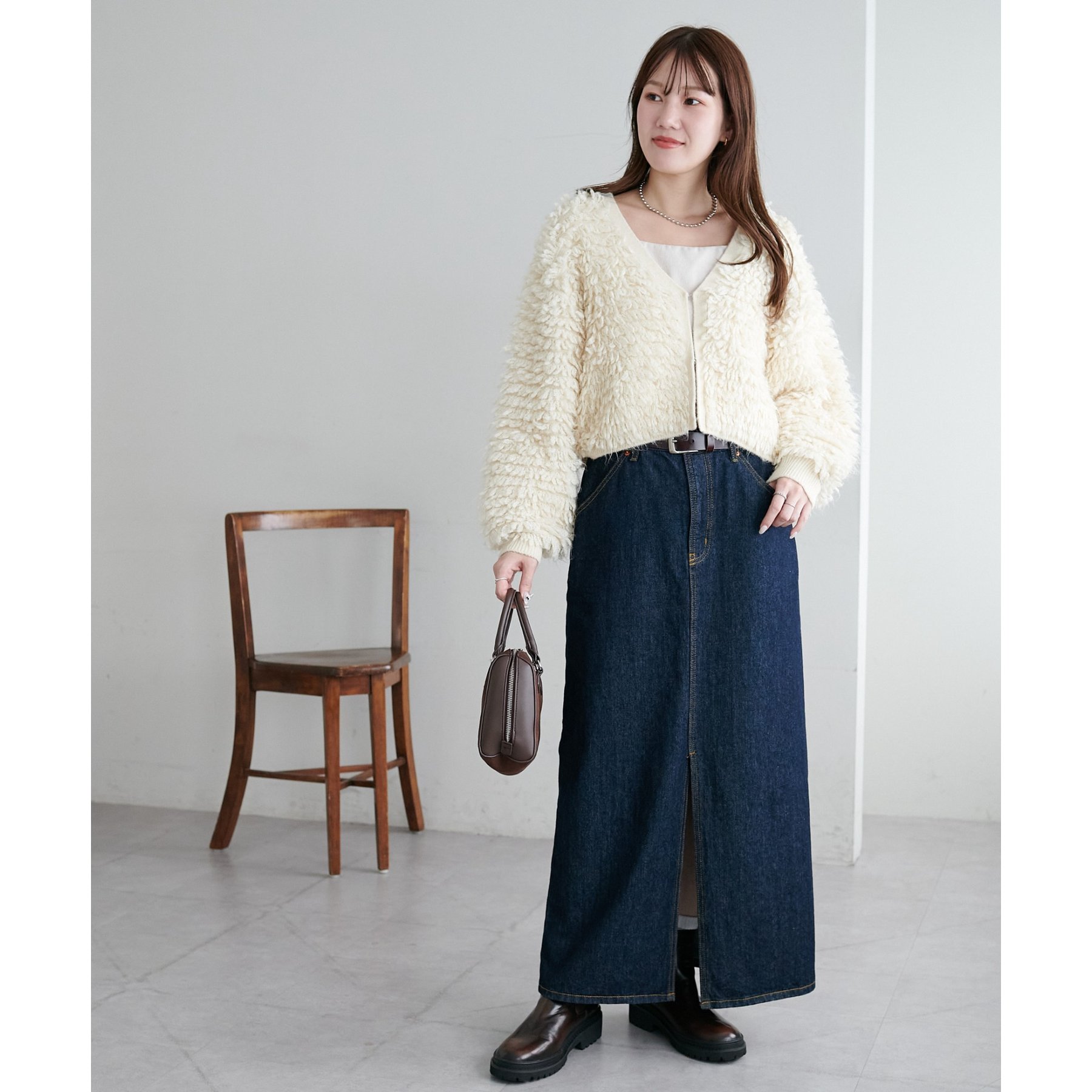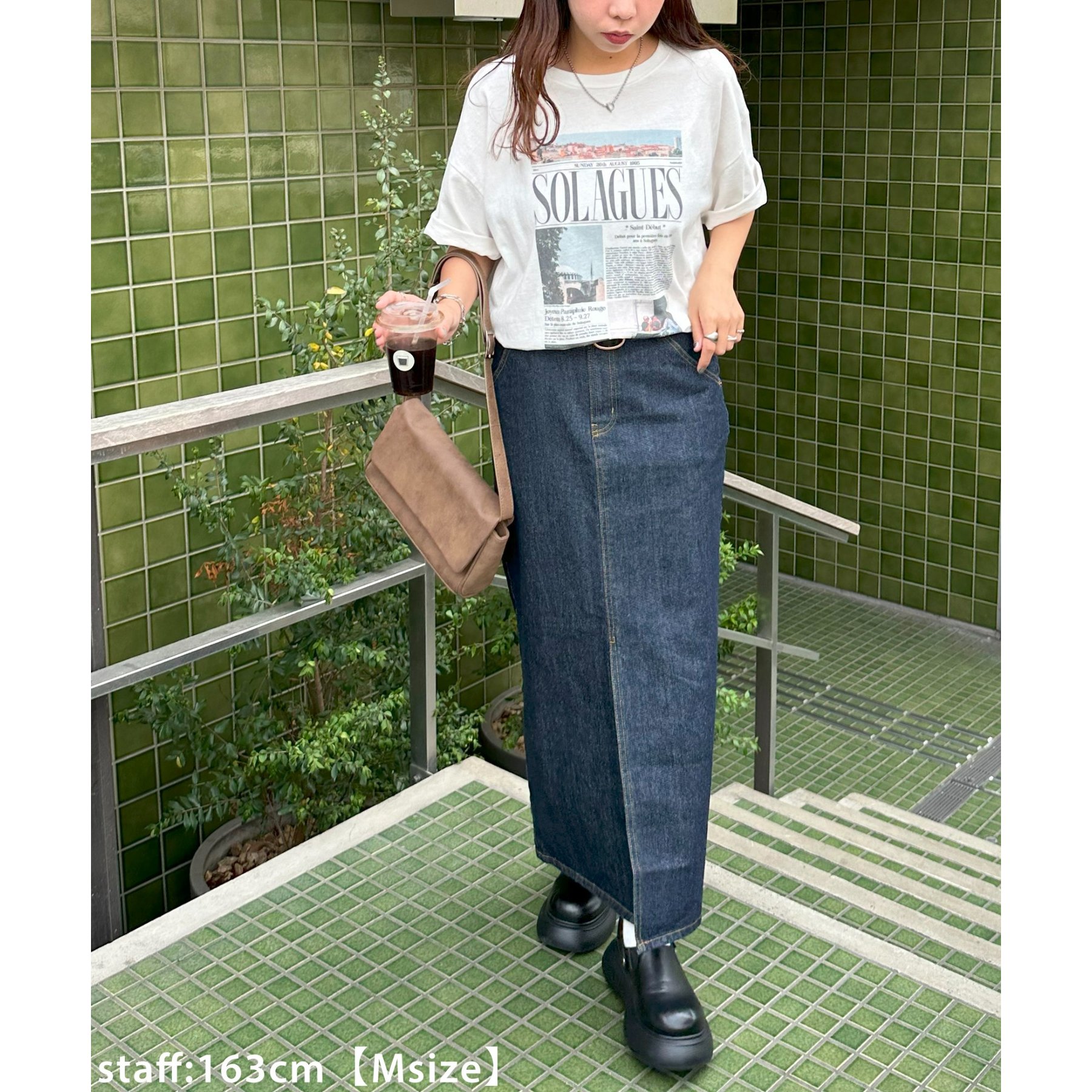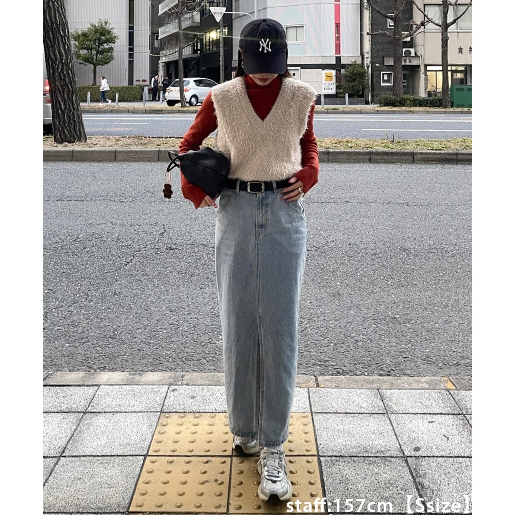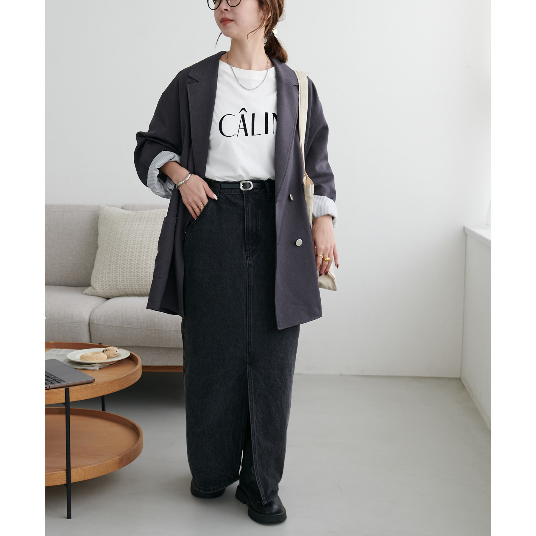 華奢見えする美シルエットのデニムナロースカート。ベーシックなデザインで様々なトップスと合わせやすく、着回しのできるアイテムです。前スリットも入っているので歩きやすさも抜群!
