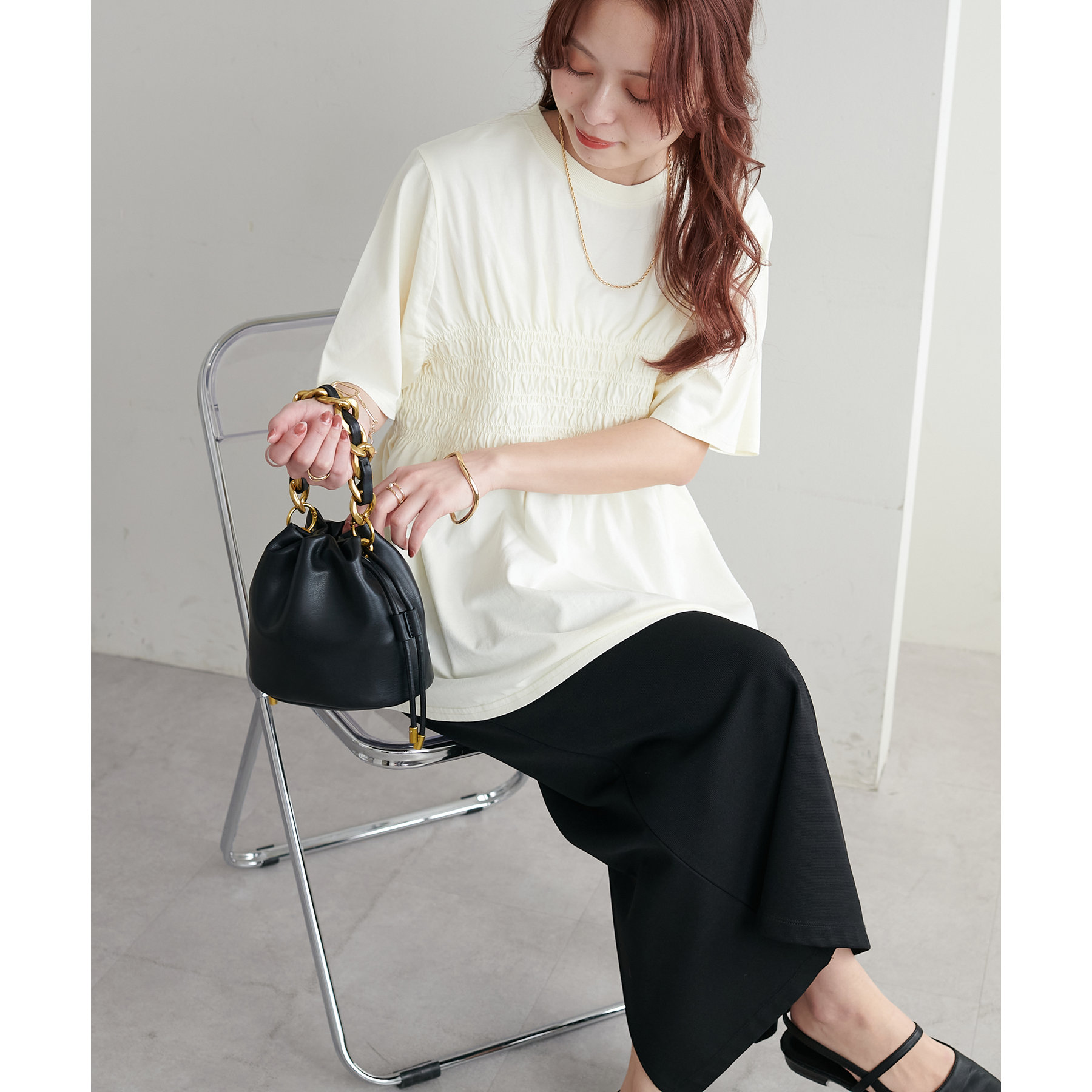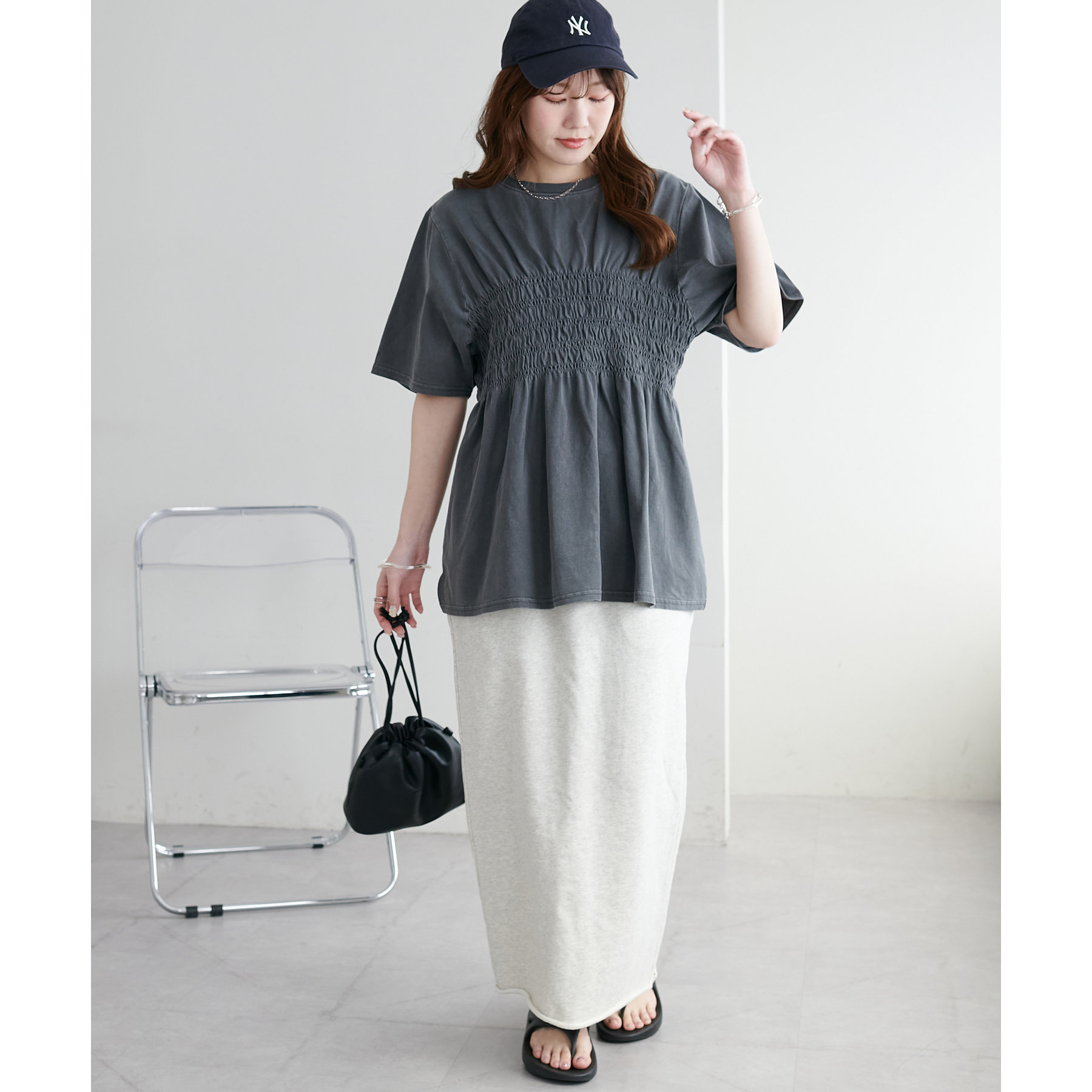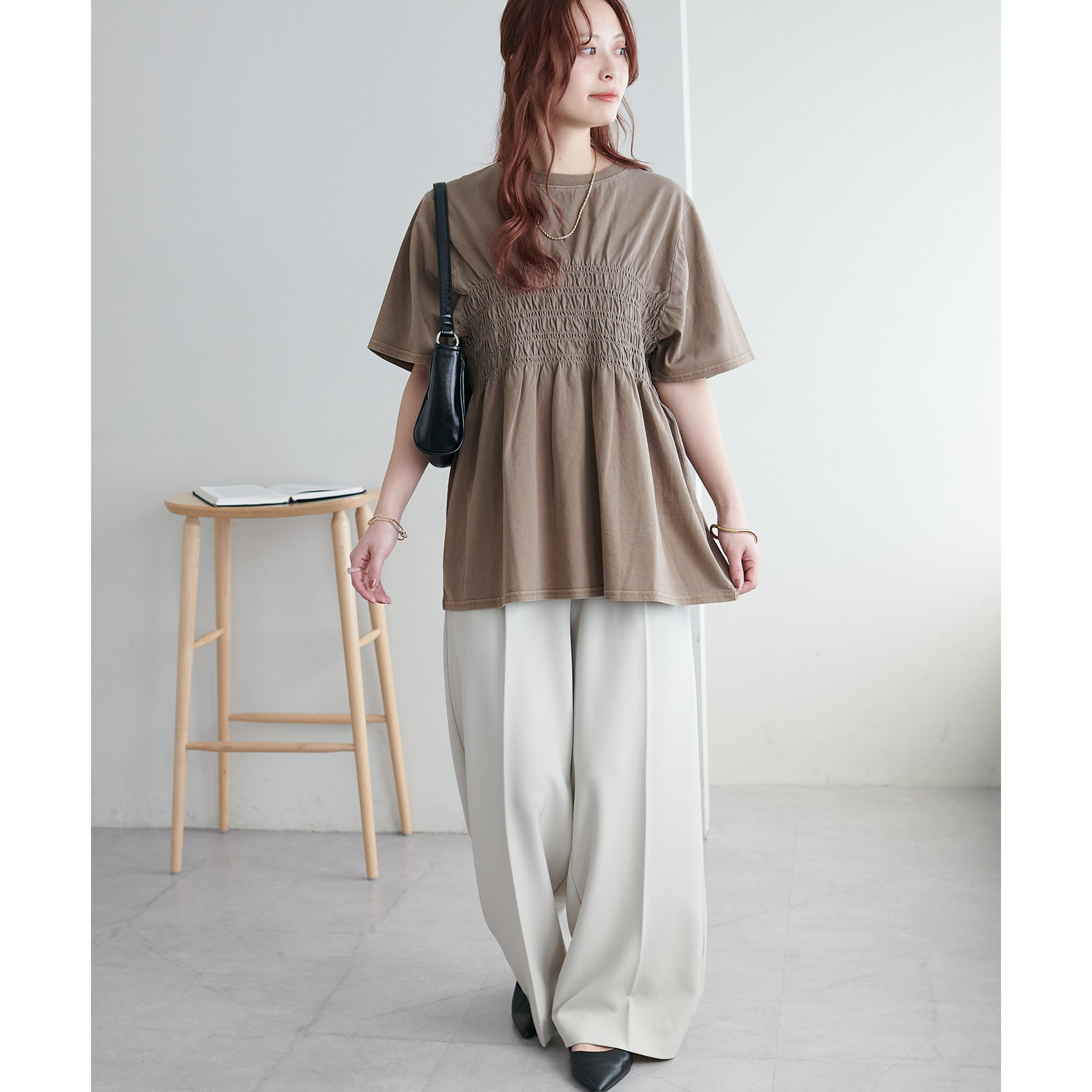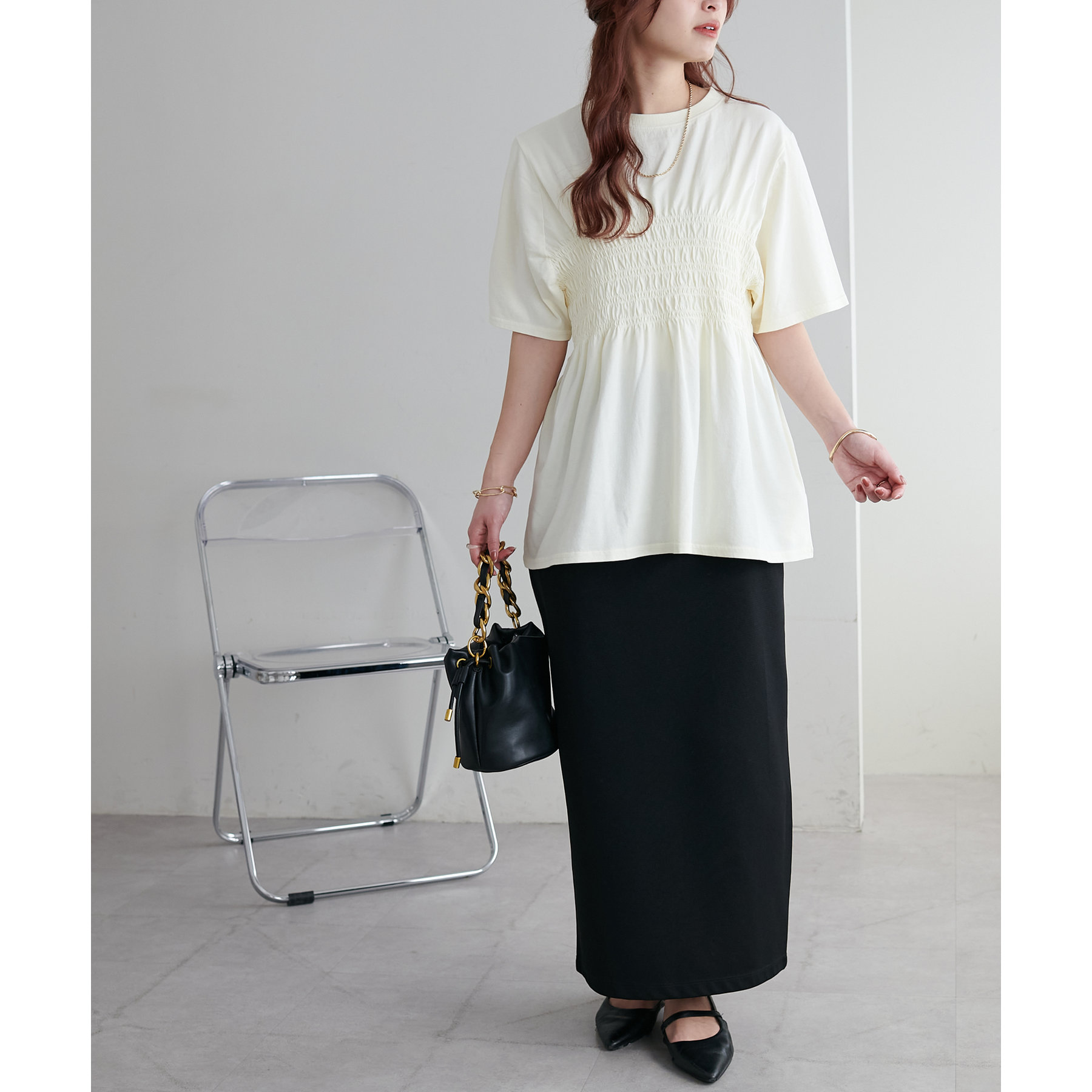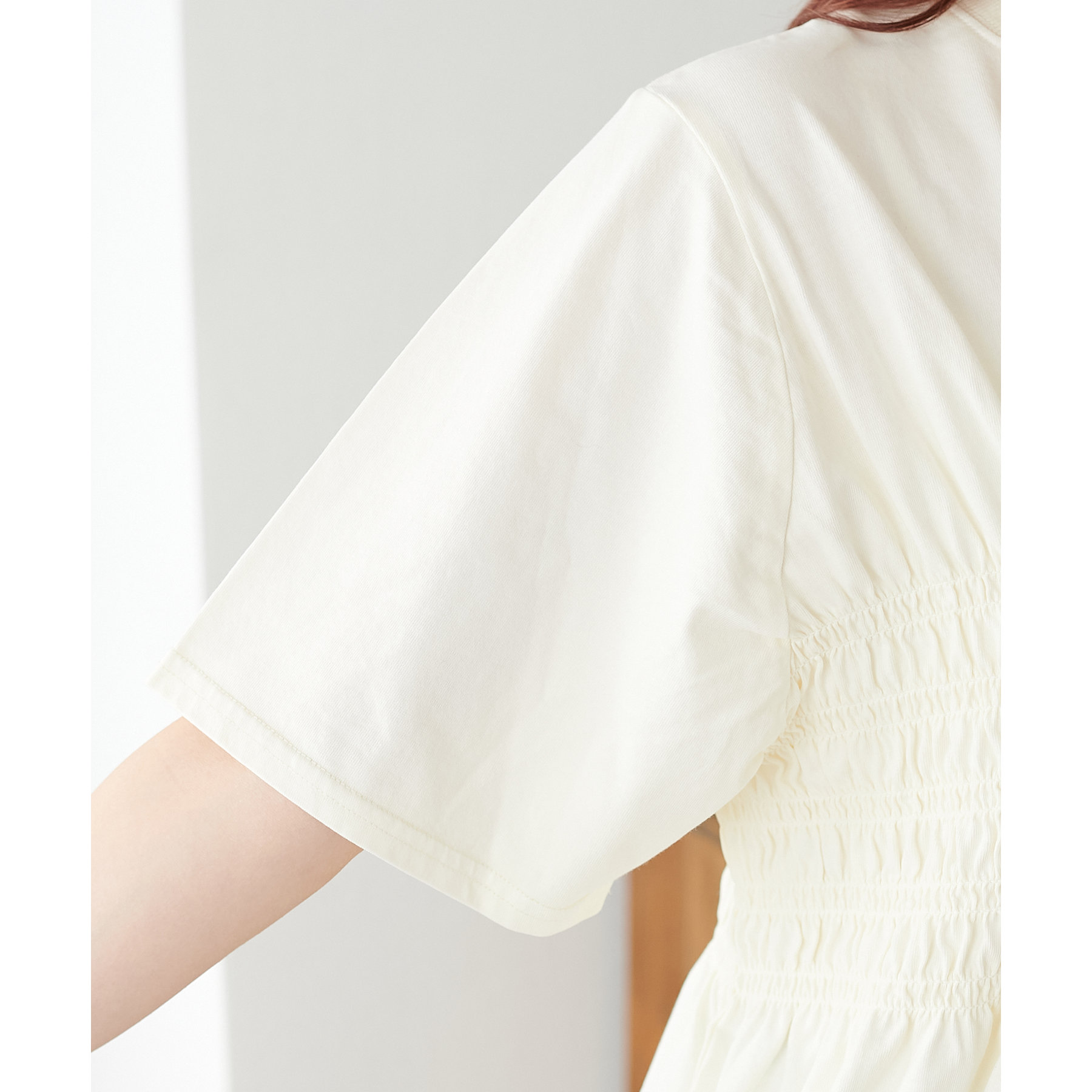 シャーリングデザインでウエストマークされ、細見えが叶います。