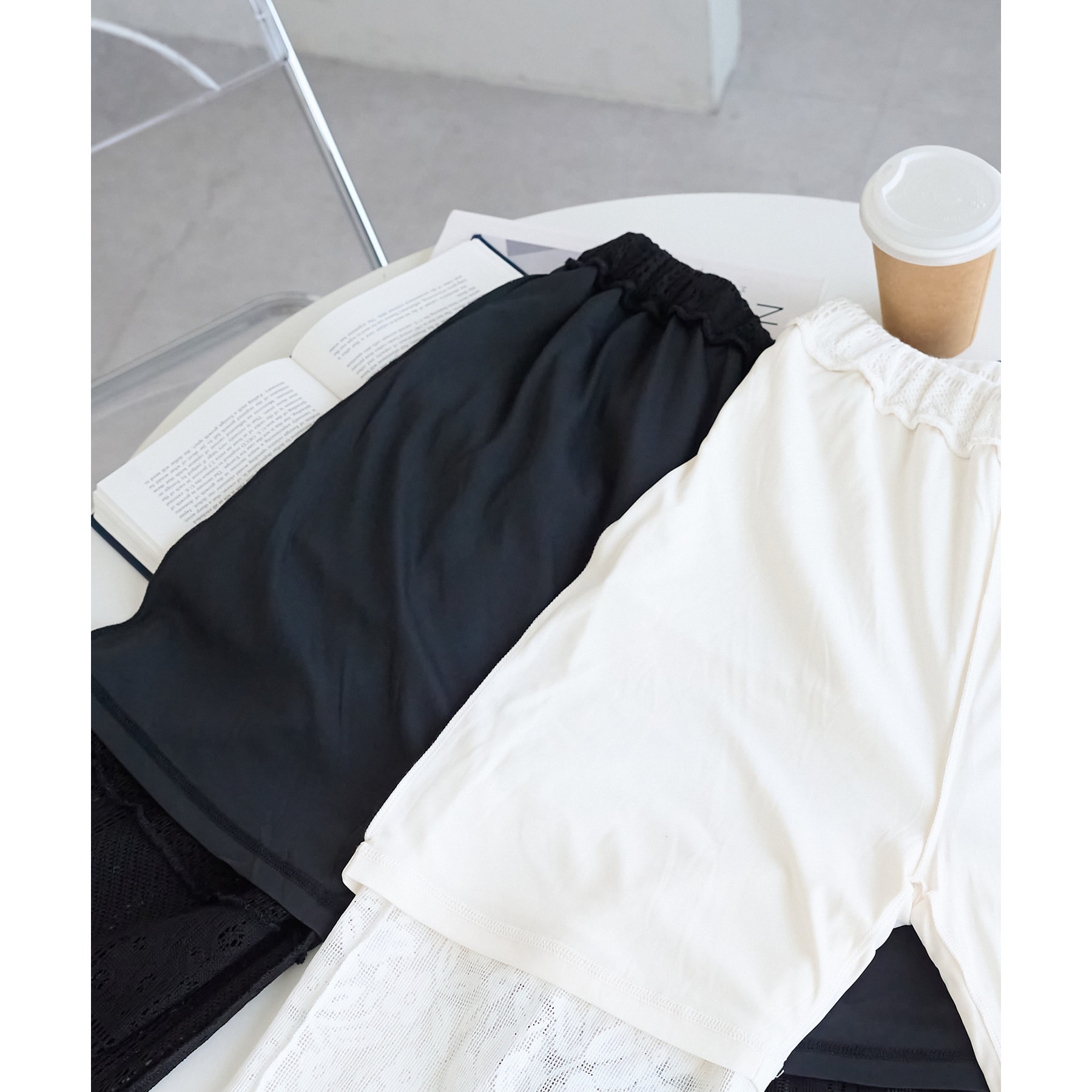 裏地付きで安心感があり、ウエスト部分は総ゴム仕様でストレスフリーの履き心地。カラーはベーシックなオフホワイトとブラックの2色をご用意いたしました♩