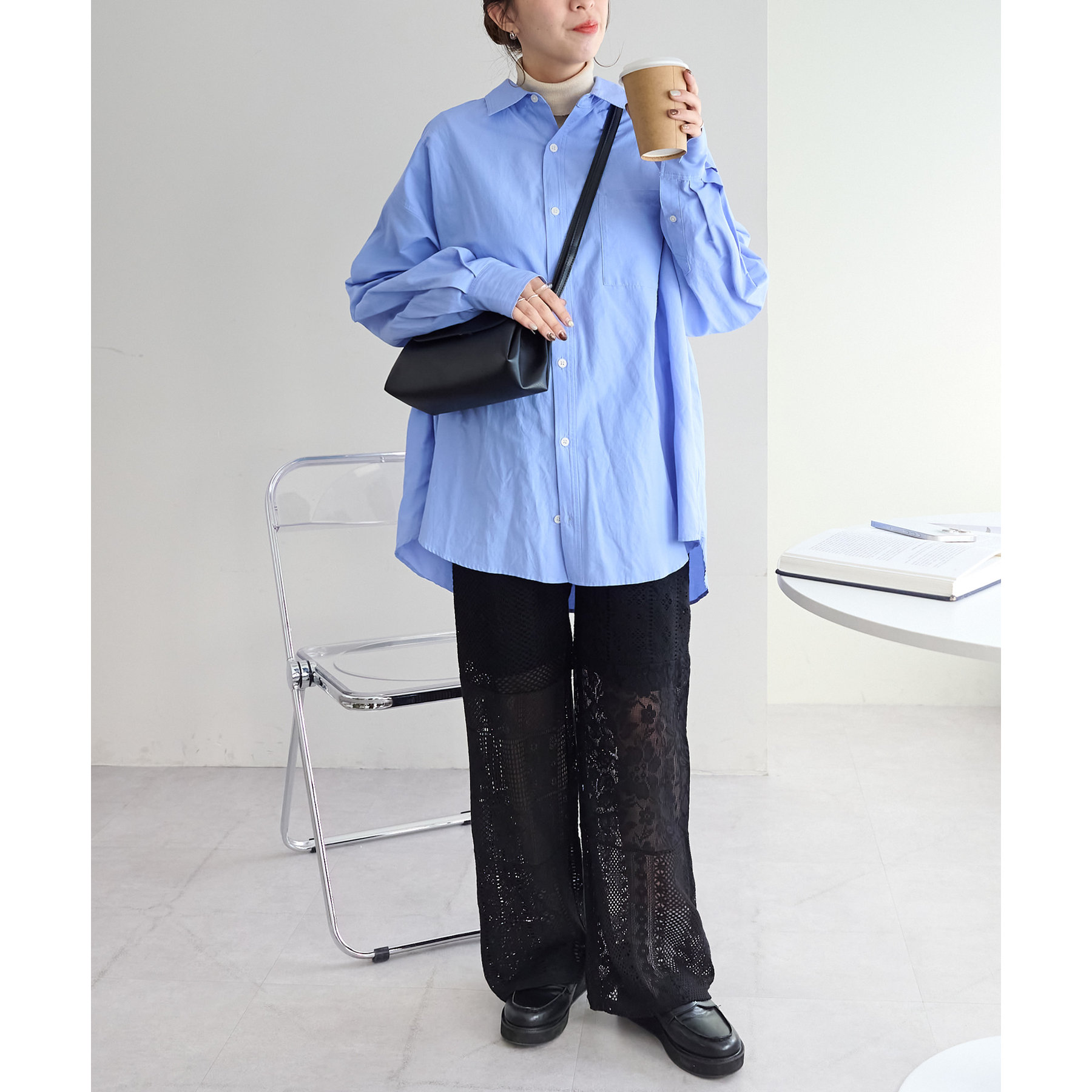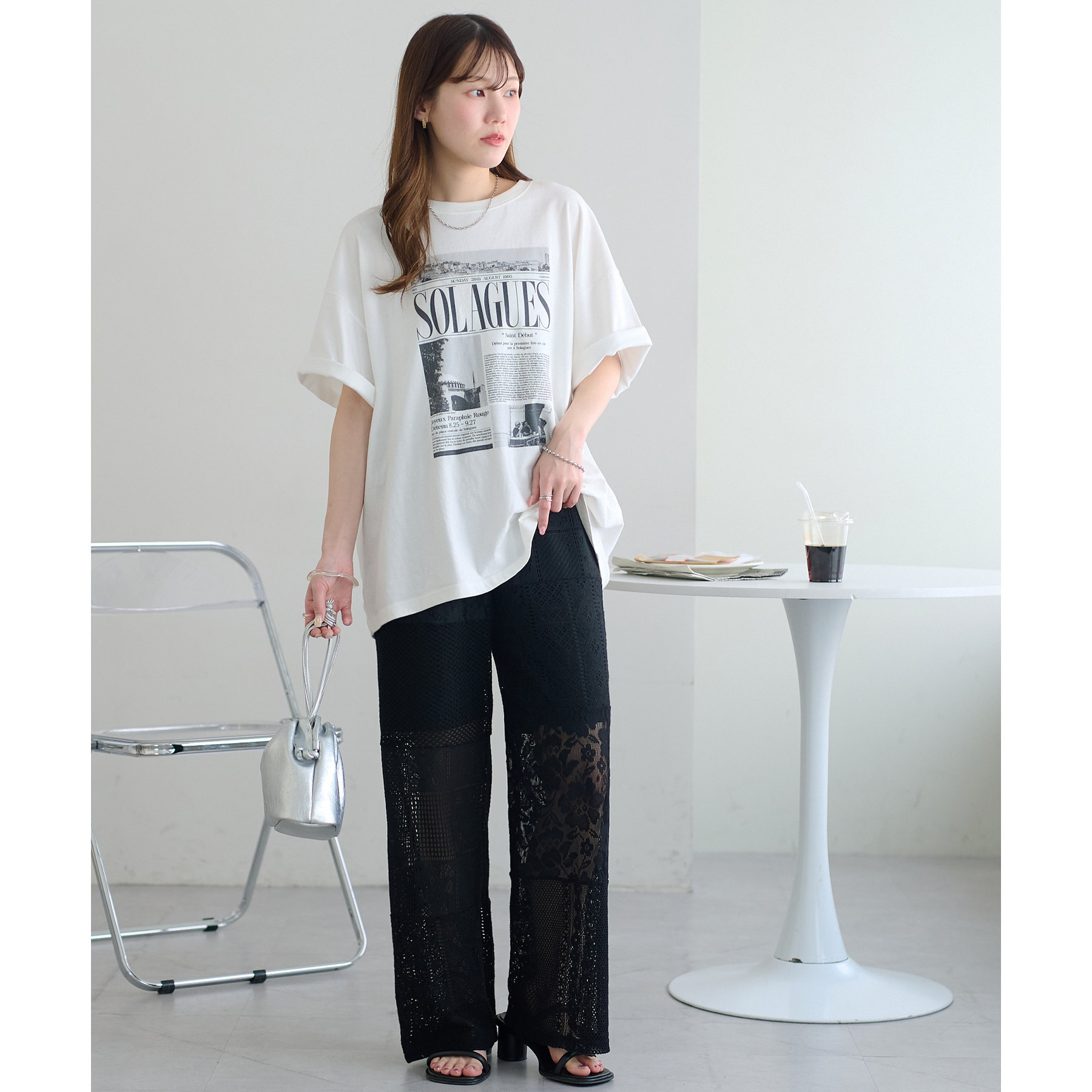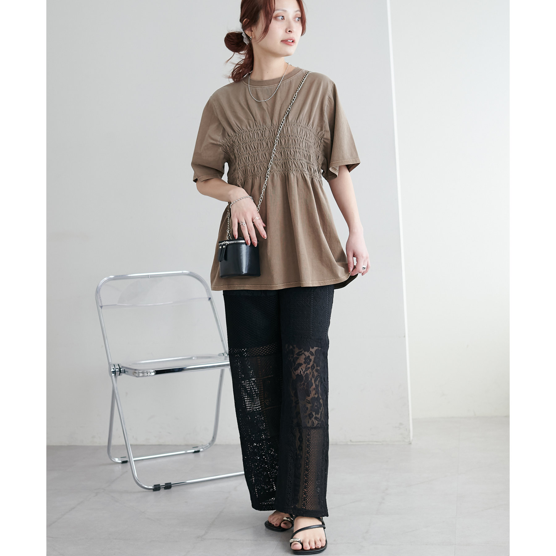 程よい透け感で女性らしさを引き立たせます。ワイドシルエットで体のラインを拾わないのも嬉しいポイント◎