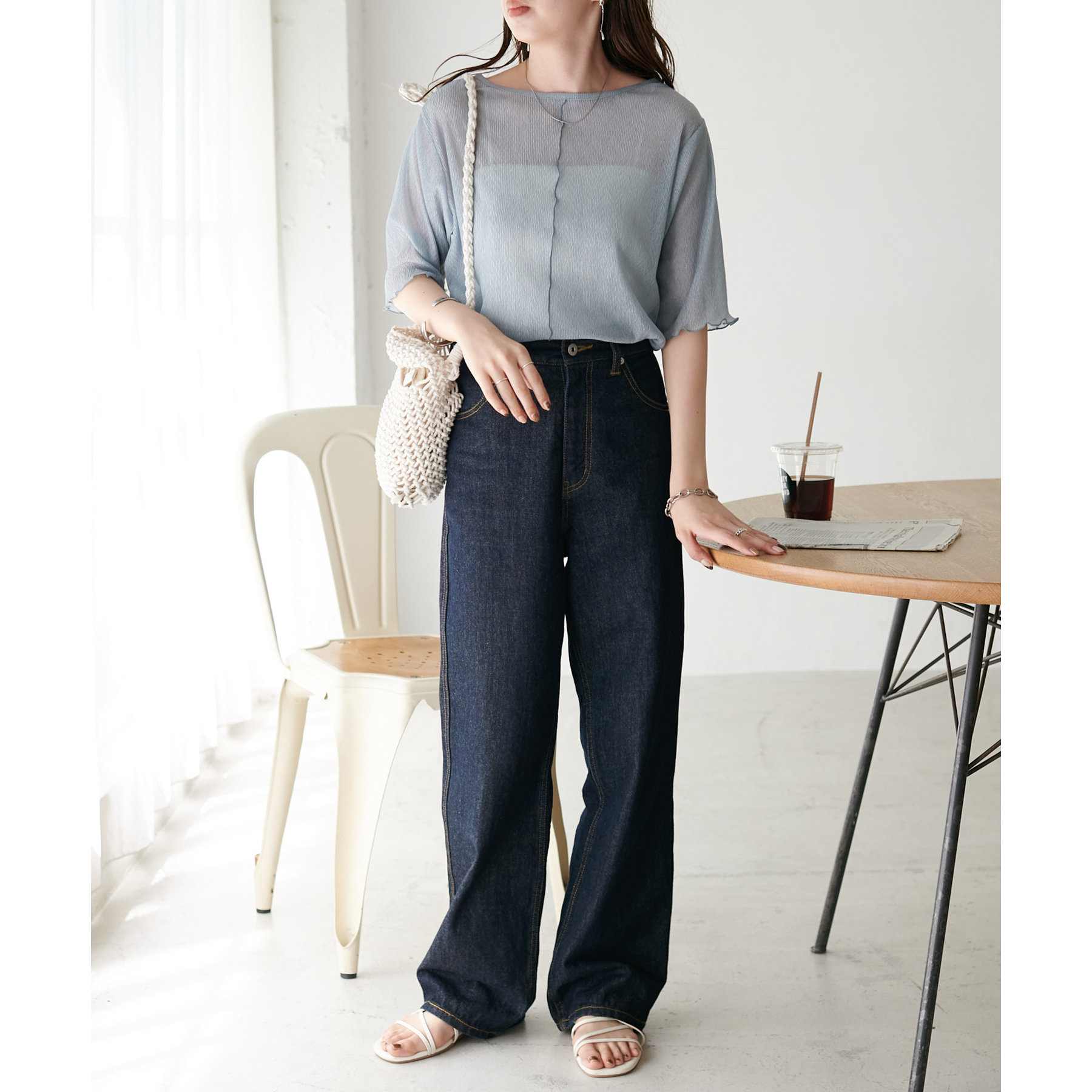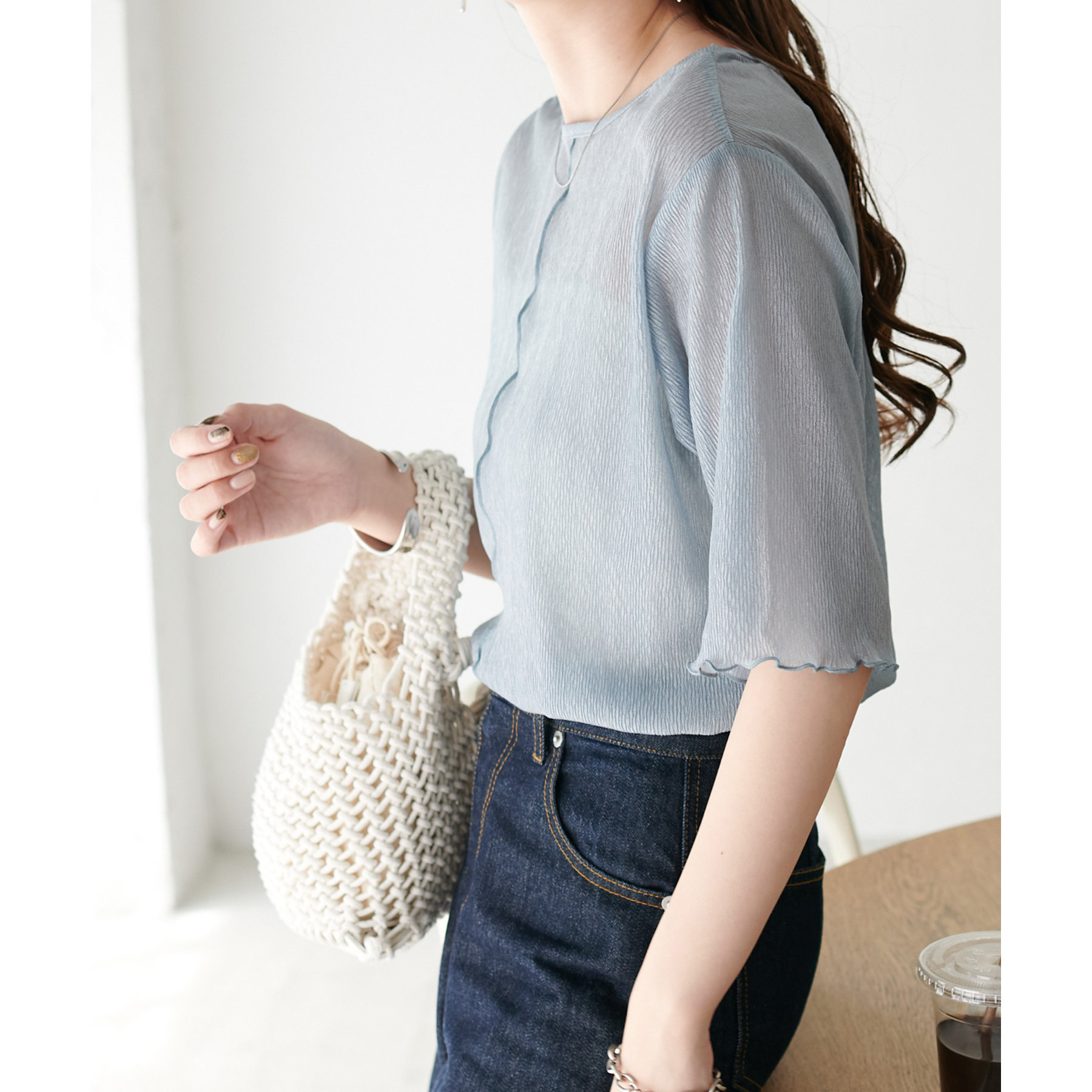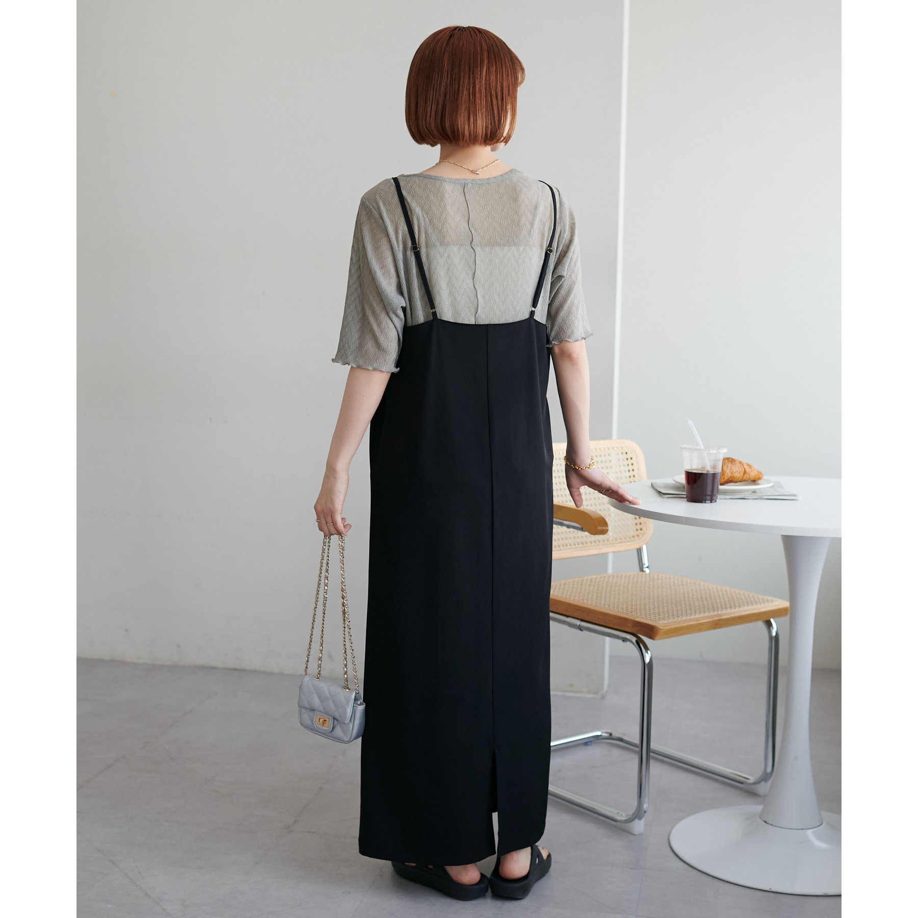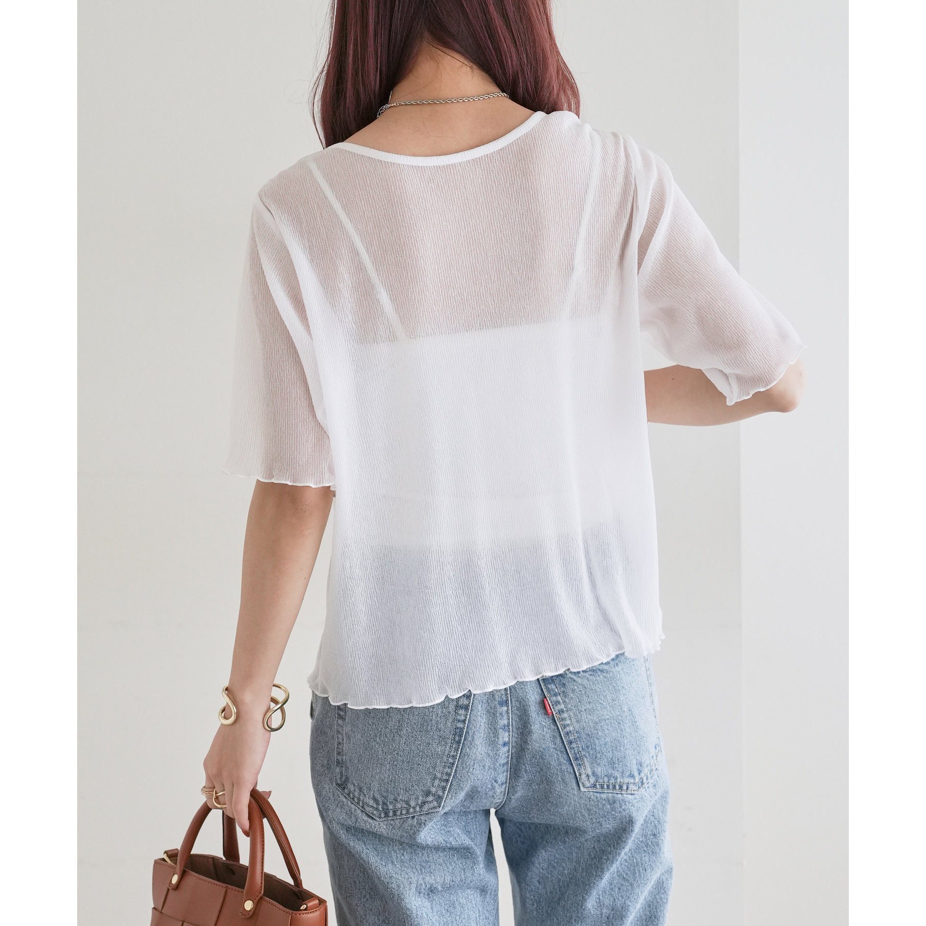 148cmスタッフ(Mサイズ着用): ヒップに軽くかかるくらいの丈で、インもアウトもキレイに決まります。透け感はありますが、プリーツがあることで体に張り付かず、涼しく着られました!