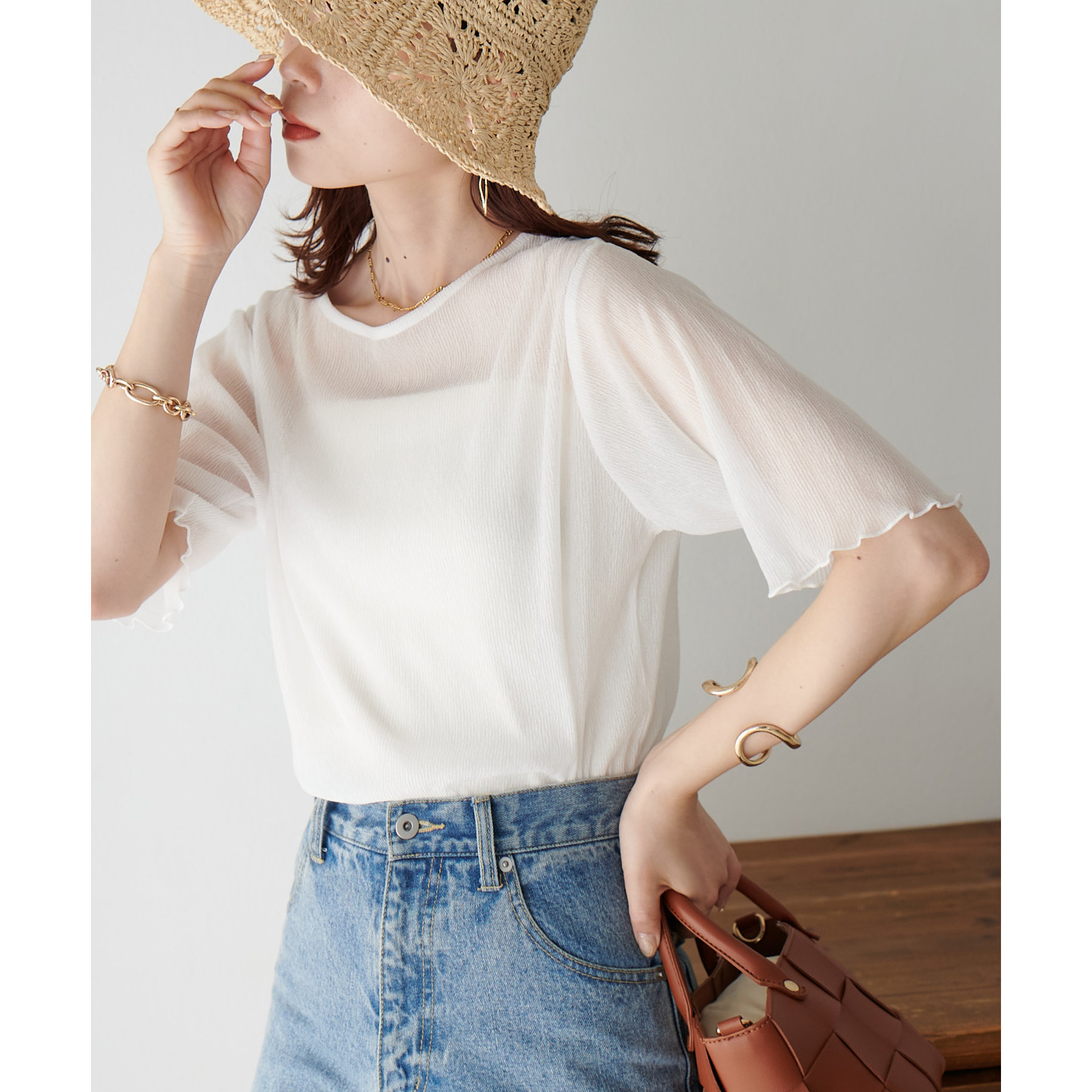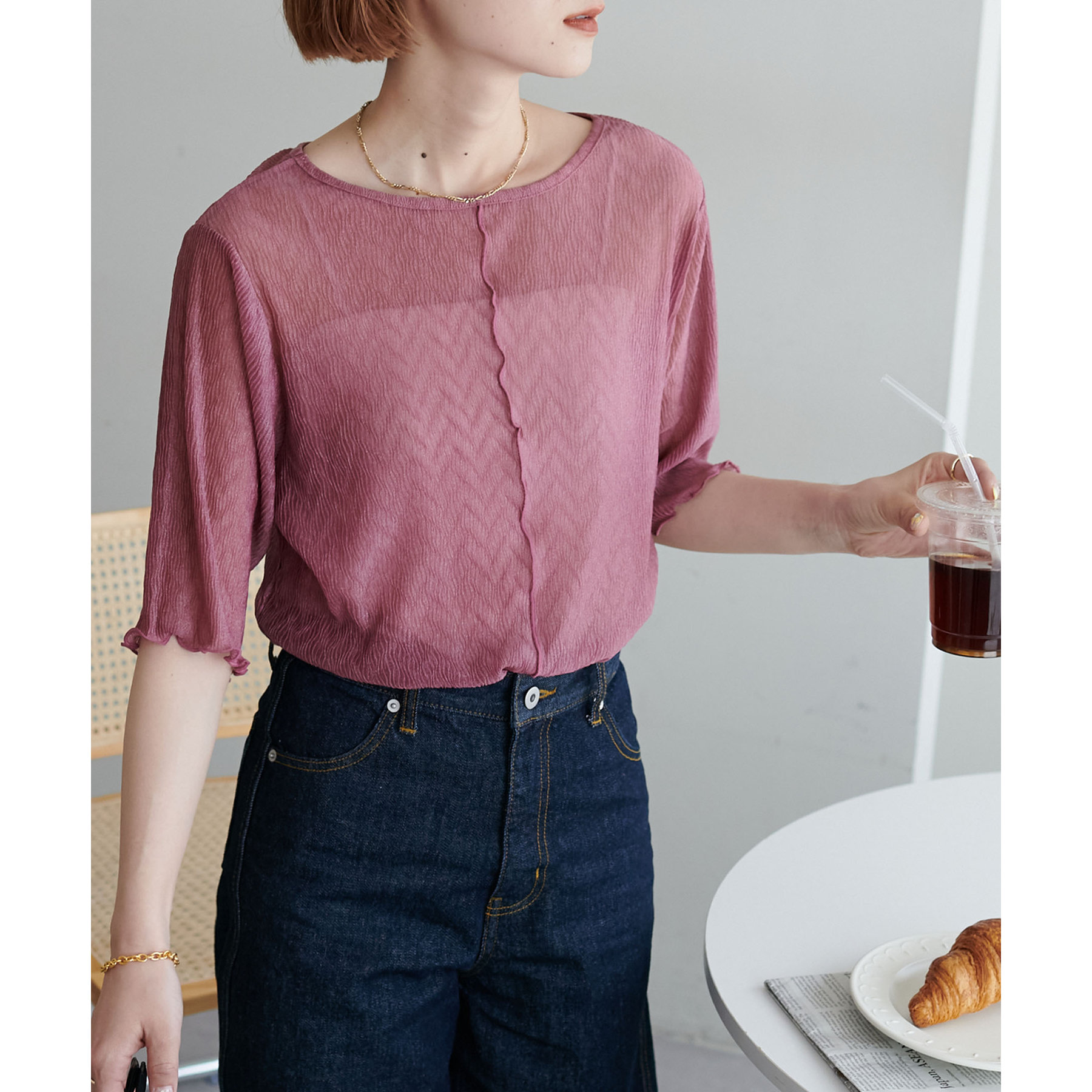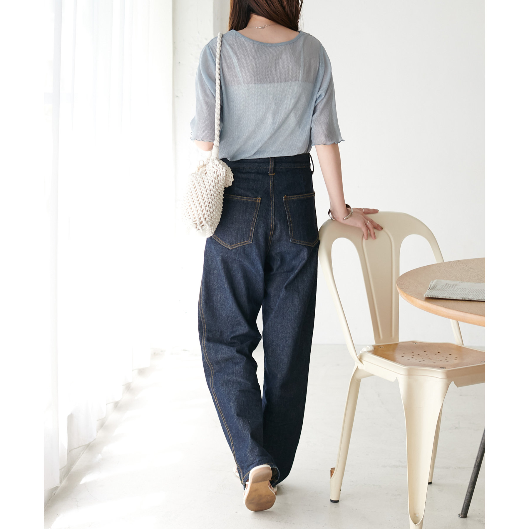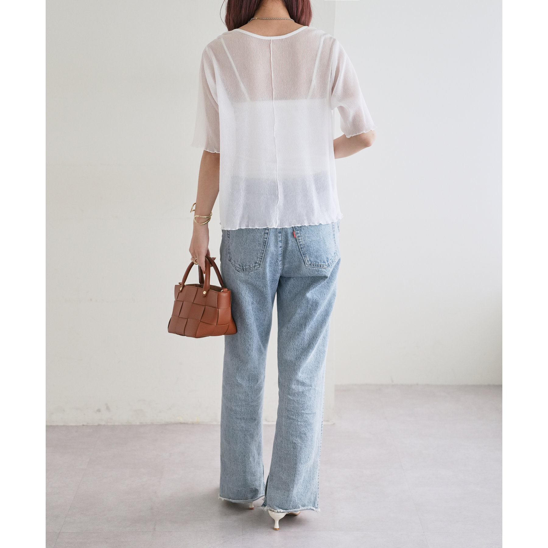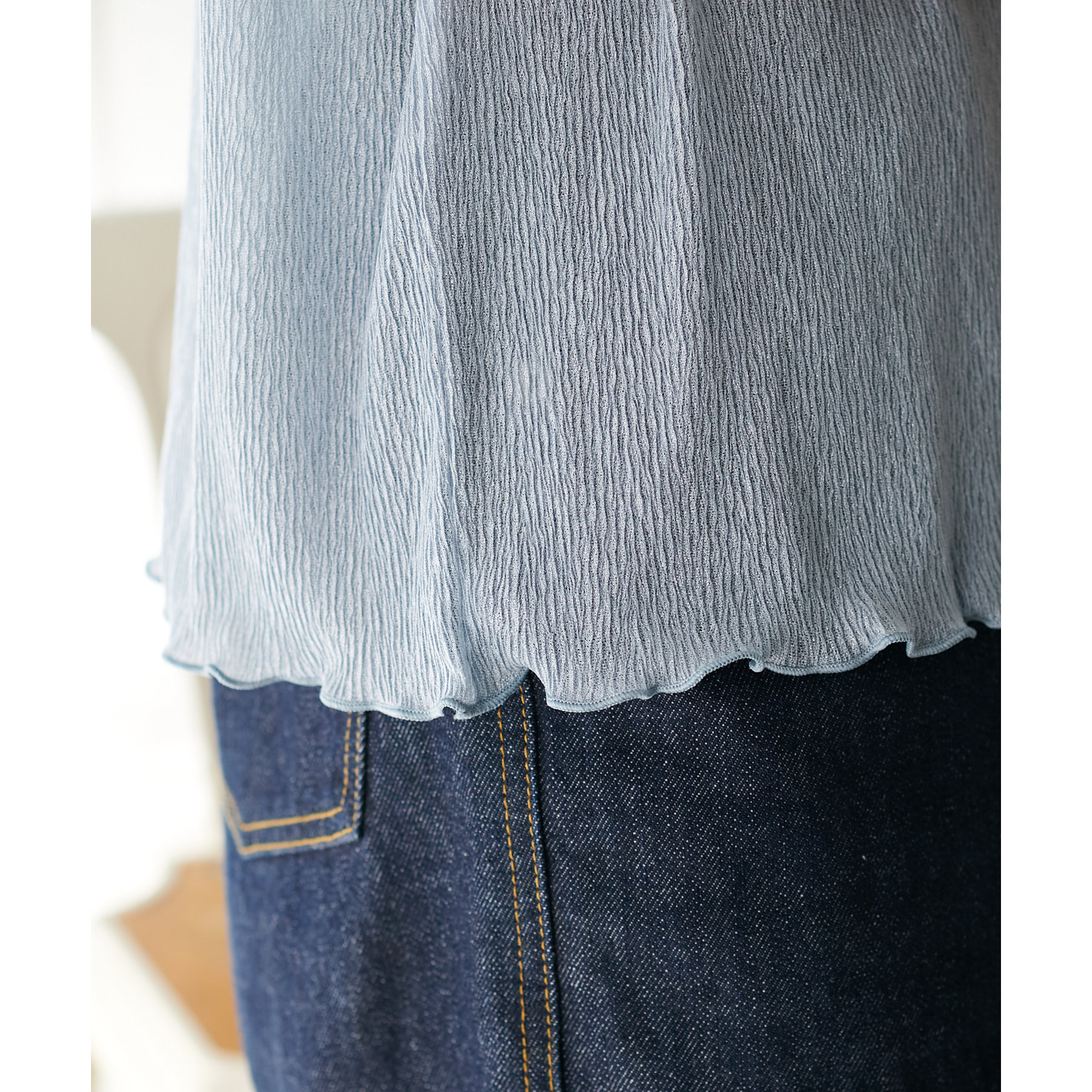 148cmスタッフ(Mサイズ着用): ヒップに軽くかかるくらいの丈で、インもアウトもキレイに決まります。透け感はありますが、プリーツがあることで体に張り付かず、涼しく着られました!