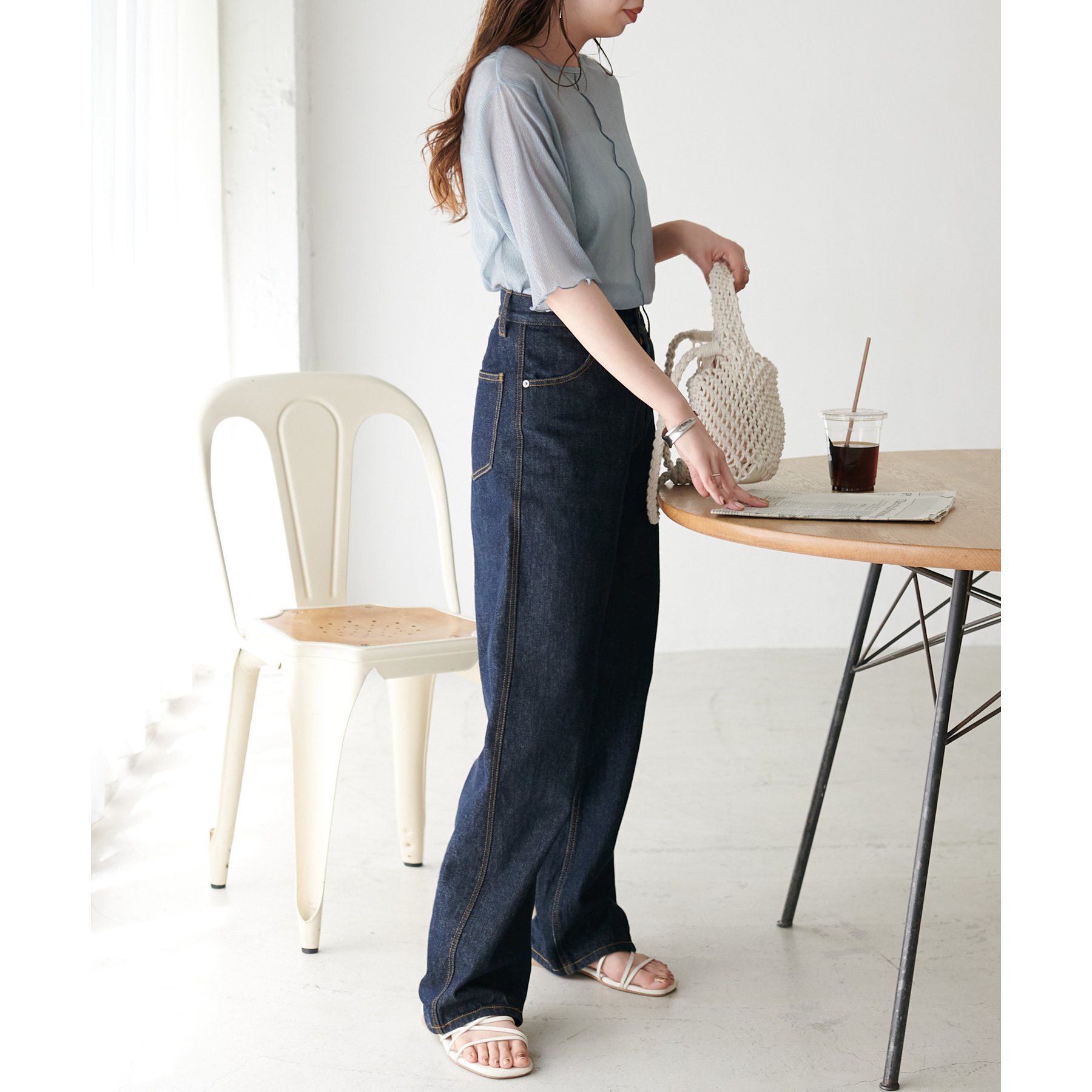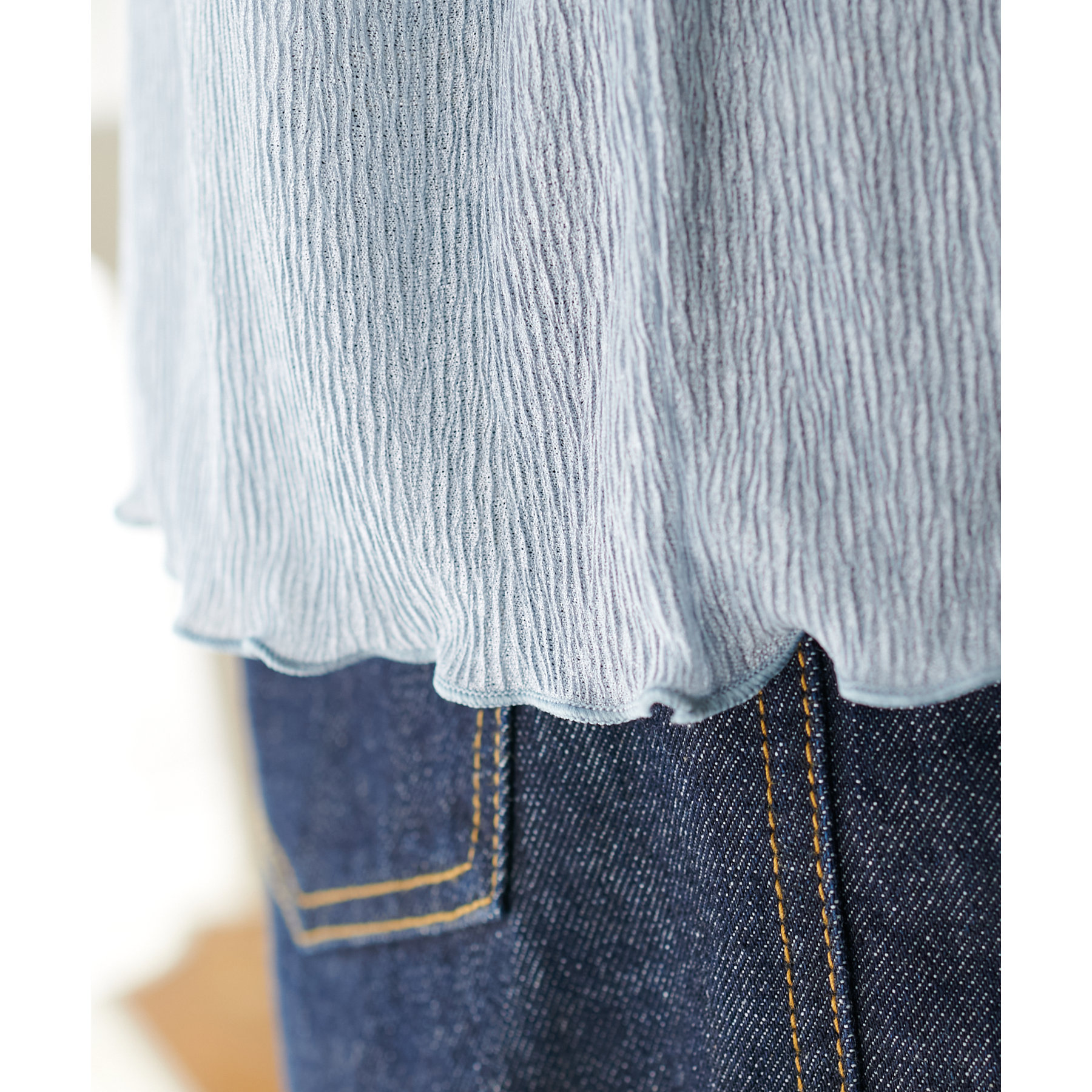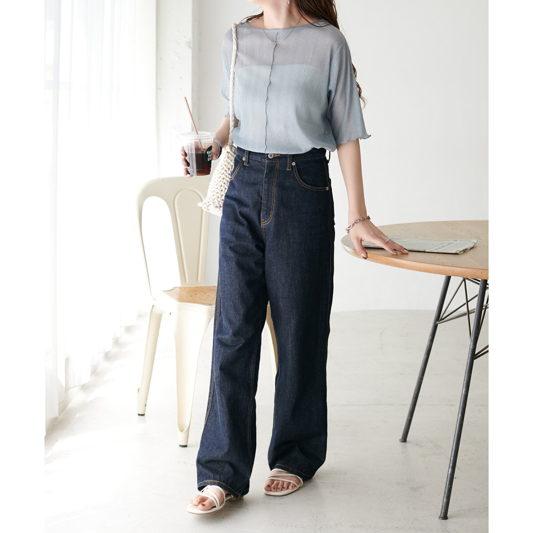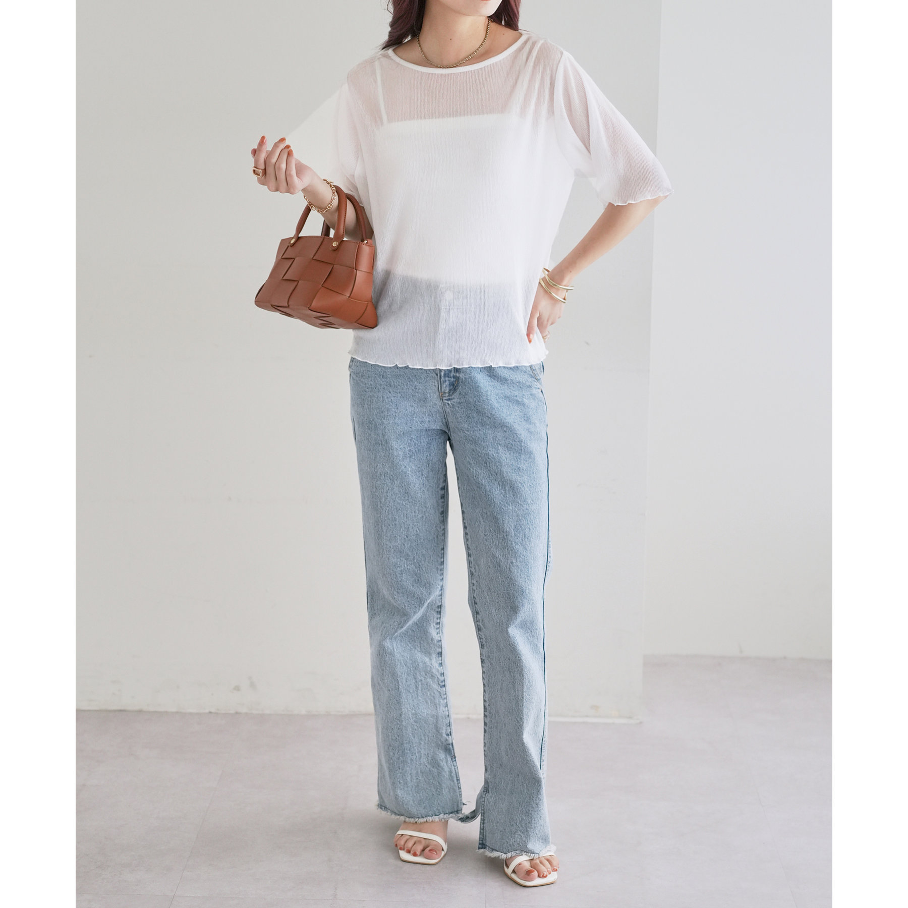 148cmスタッフ(Mサイズ着用): ヒップに軽くかかるくらいの丈で、インもアウトもキレイに決まります。透け感はありますが、プリーツがあることで体に張り付かず、涼しく着られました!