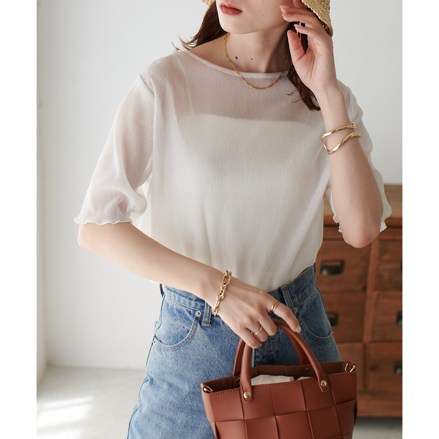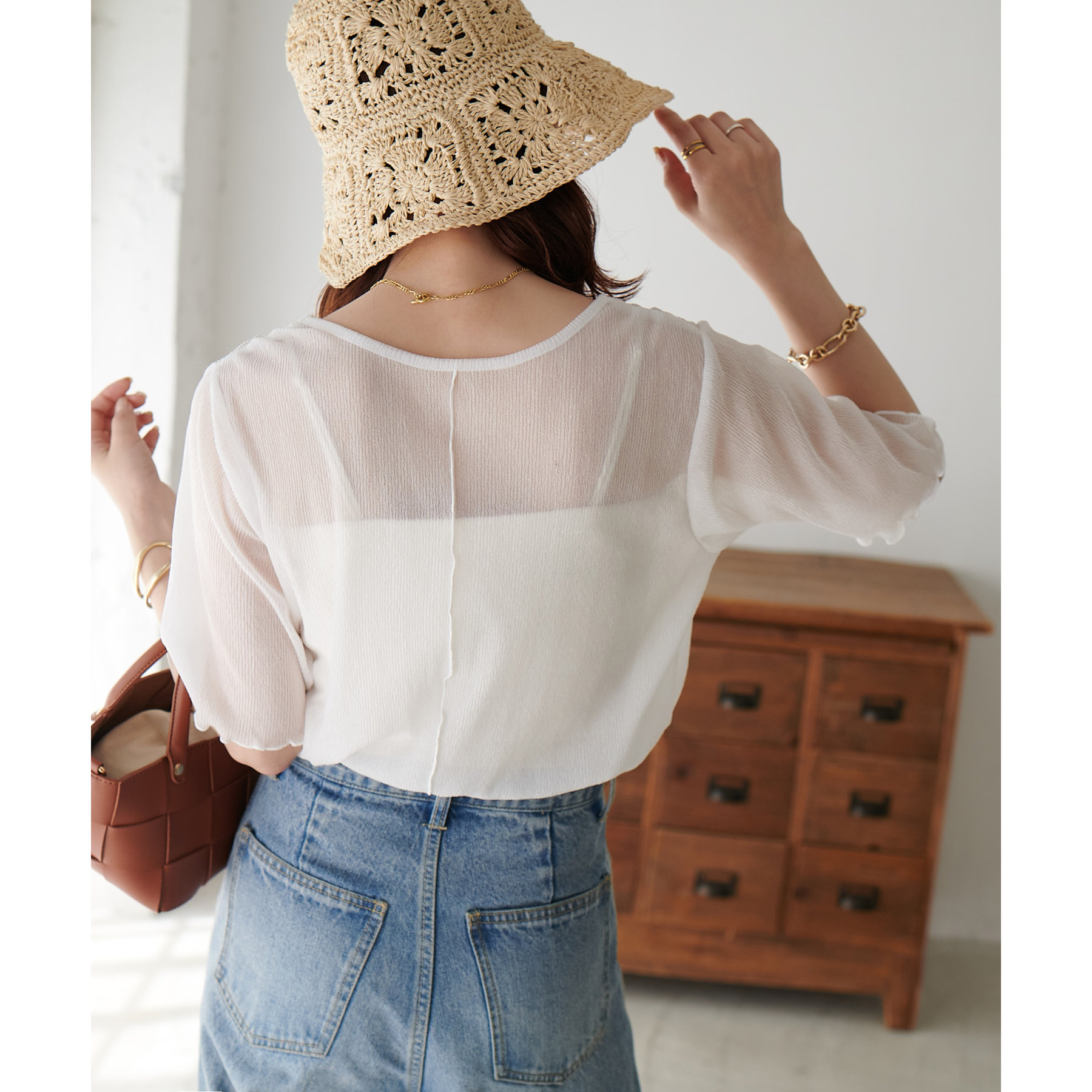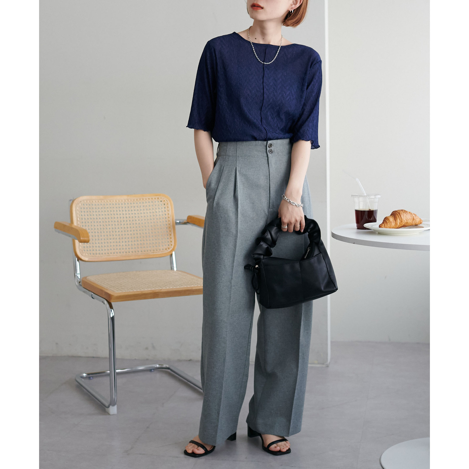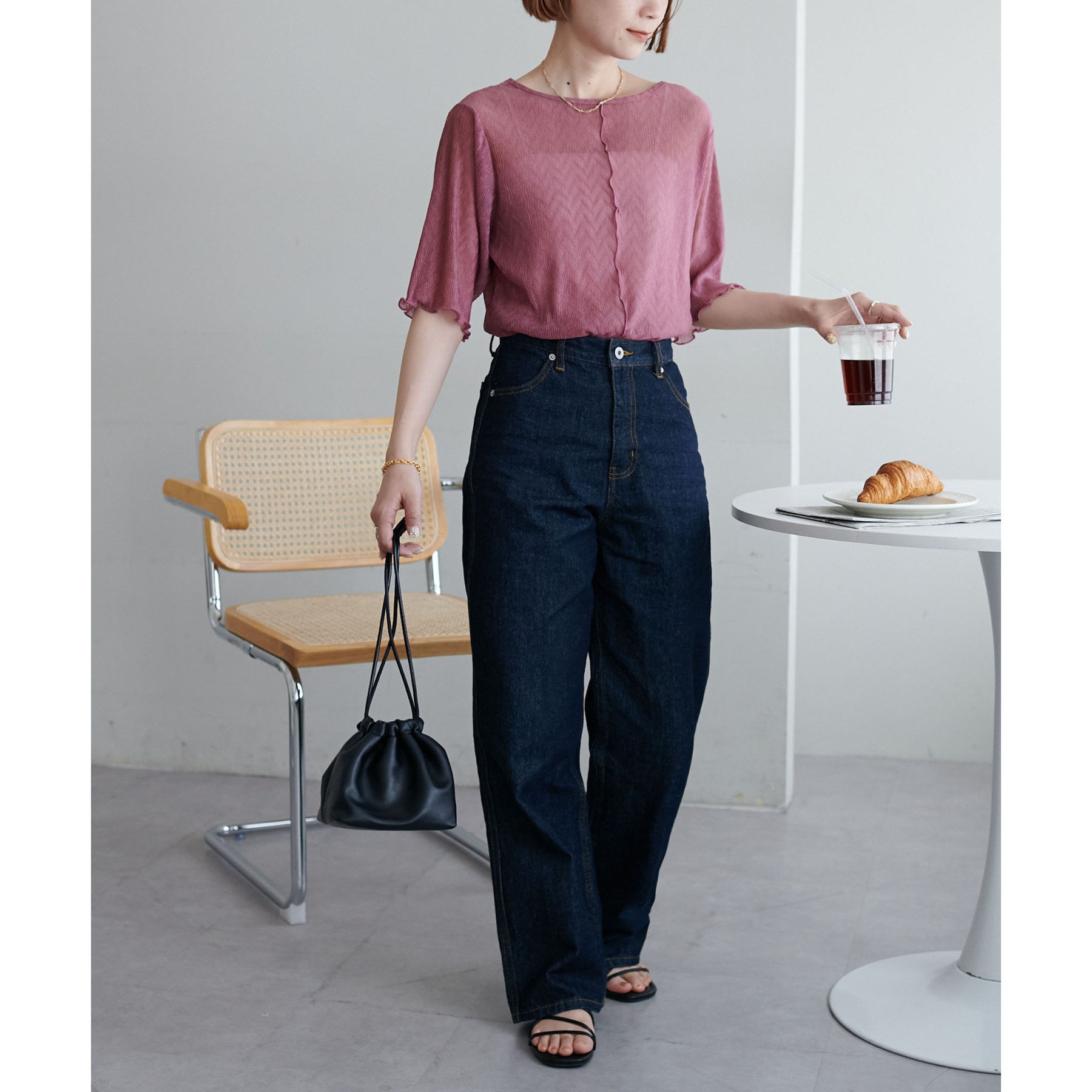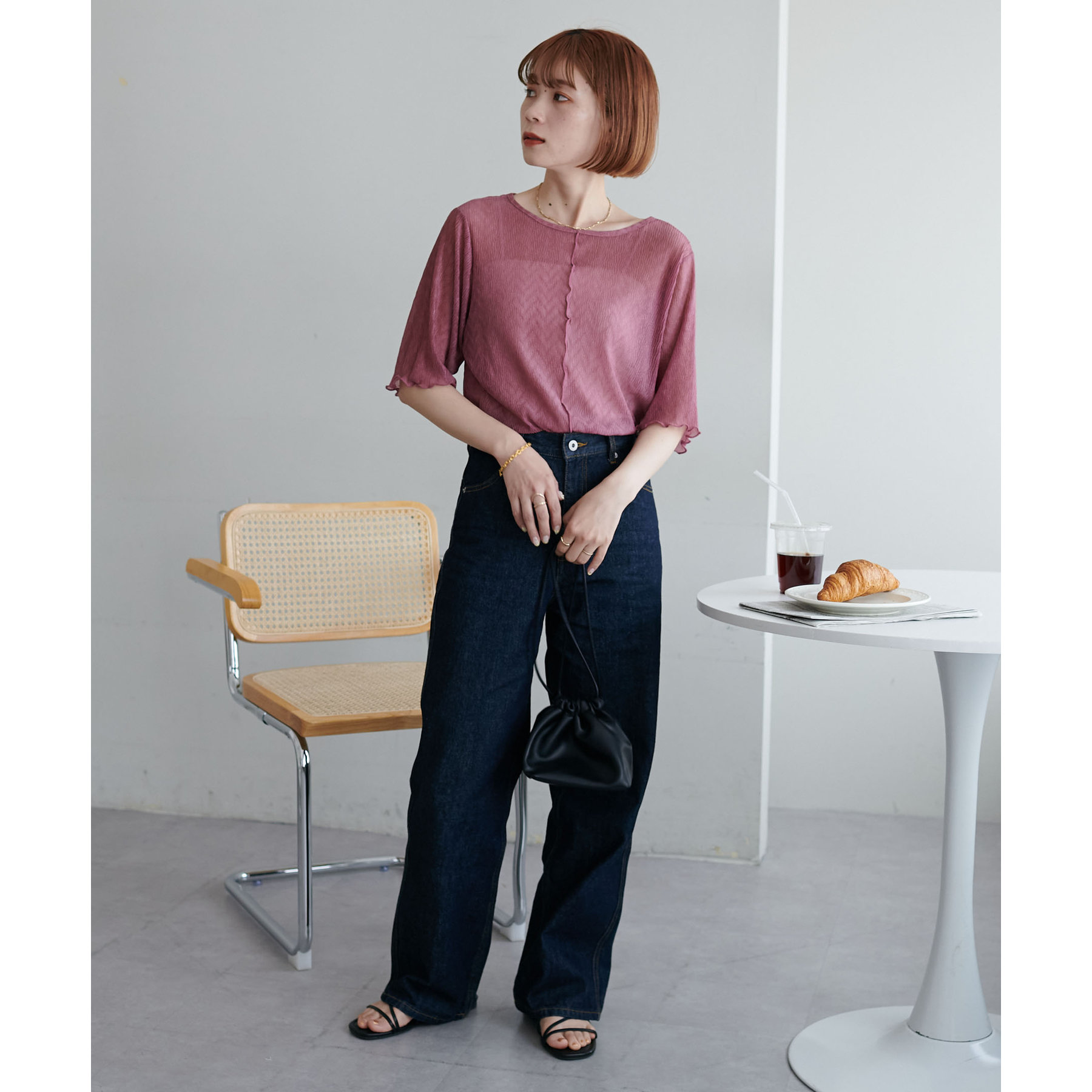 148cmスタッフ(Mサイズ着用): ヒップに軽くかかるくらいの丈で、インもアウトもキレイに決まります。透け感はありますが、プリーツがあることで体に張り付かず、涼しく着られました!