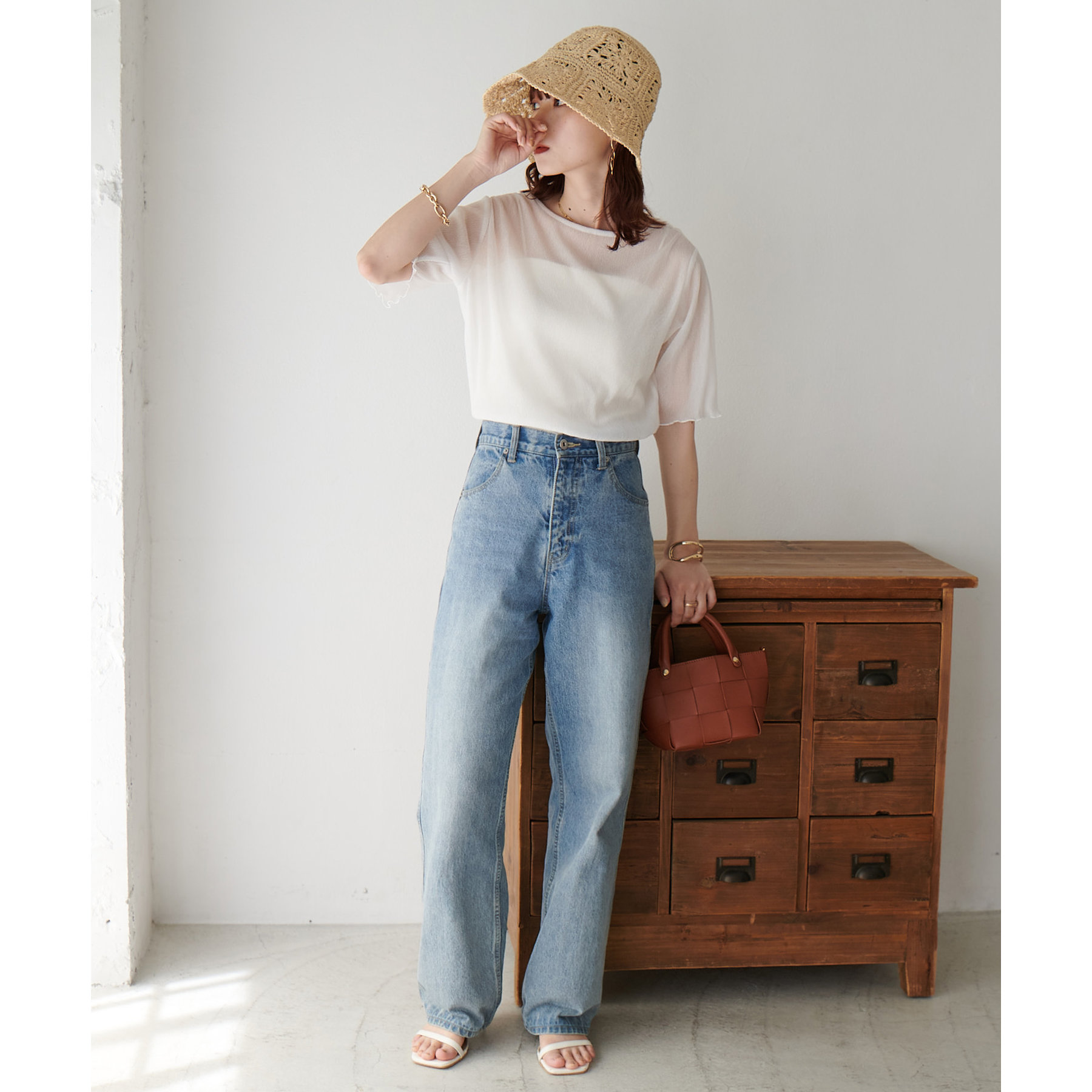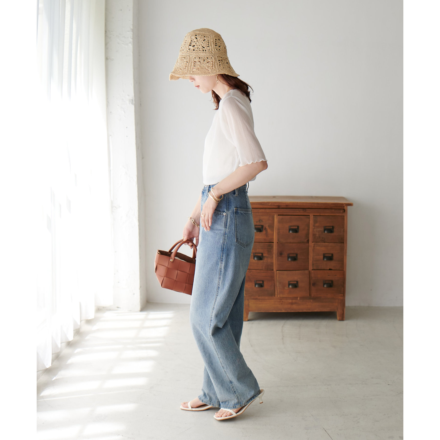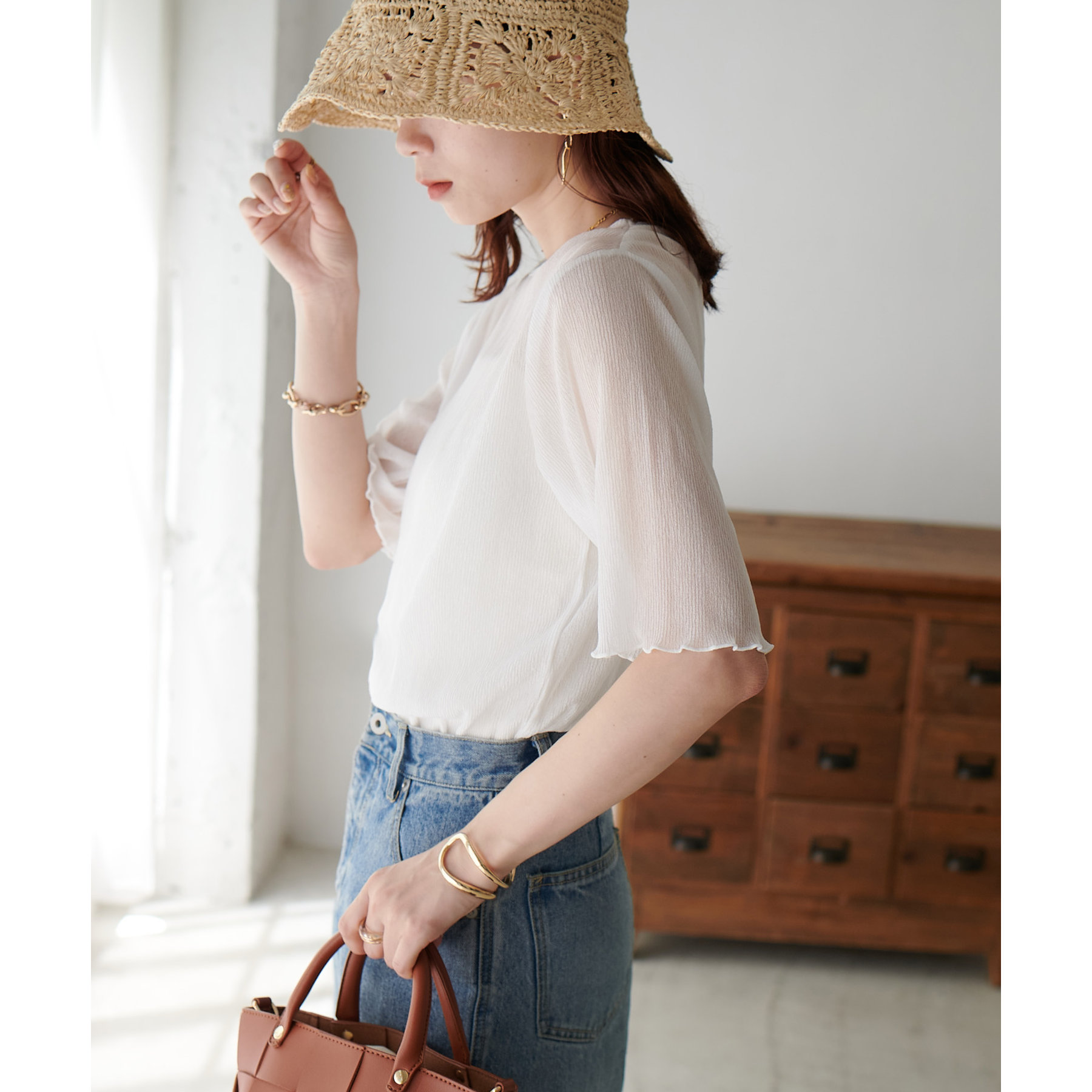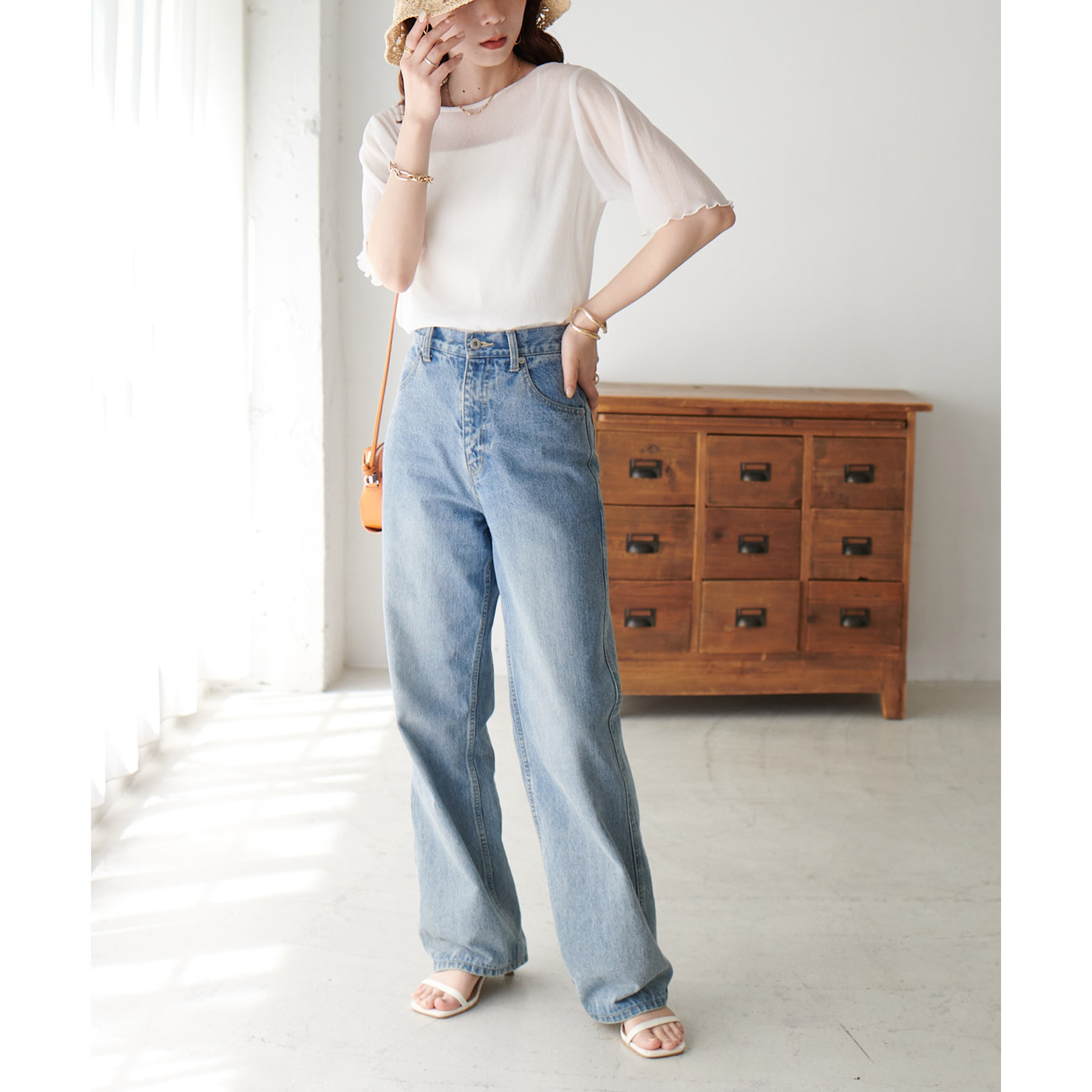 148cmスタッフ(Mサイズ着用): ヒップに軽くかかるくらいの丈で、インもアウトもキレイに決まります。透け感はありますが、プリーツがあることで体に張り付かず、涼しく着られました!
