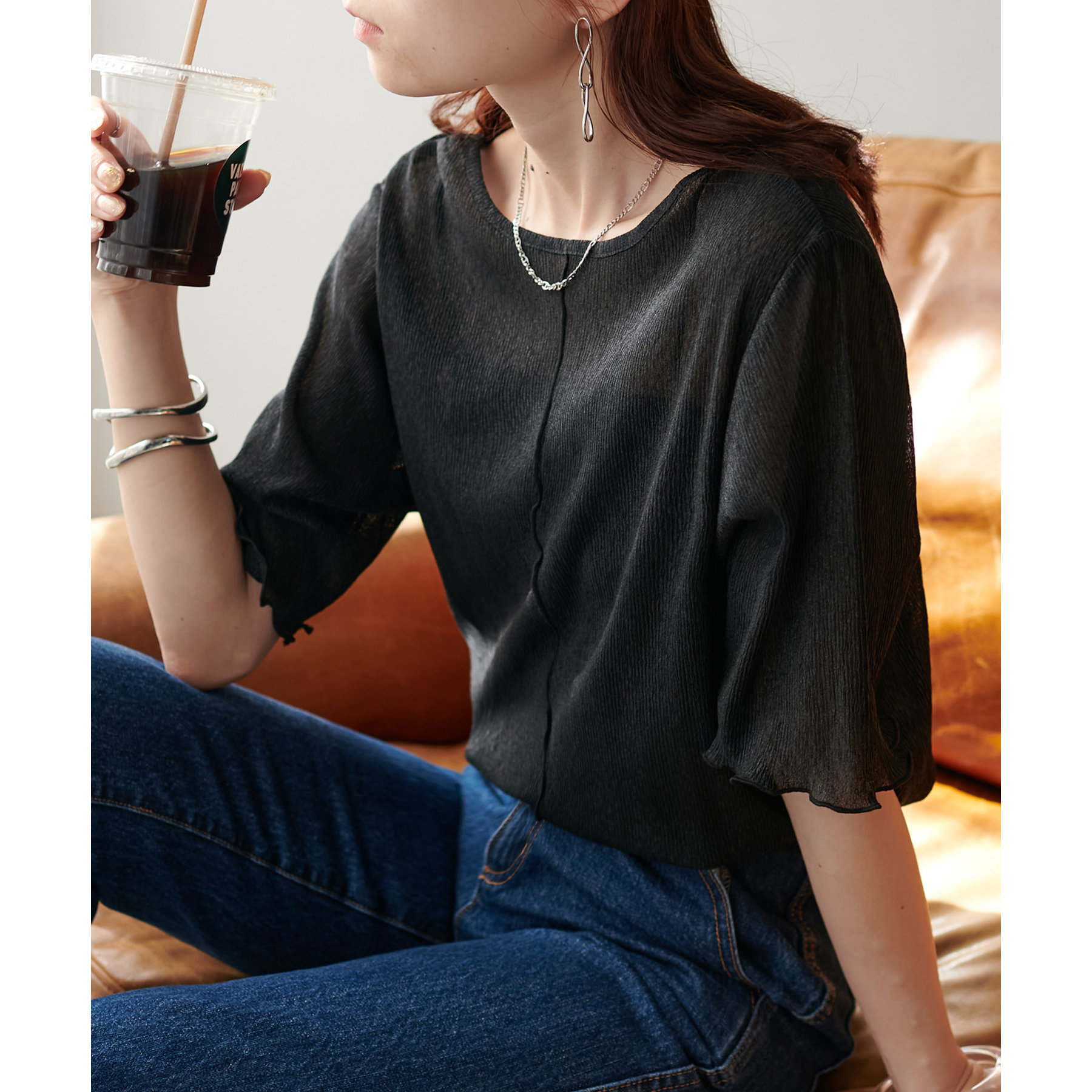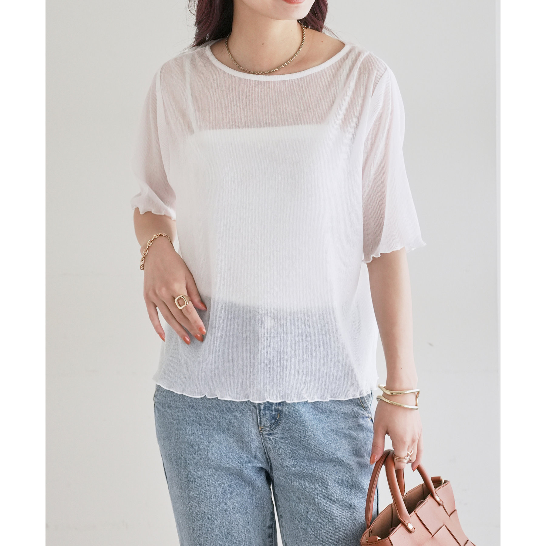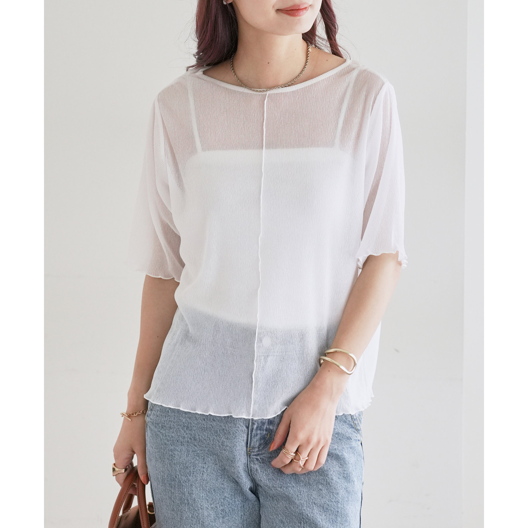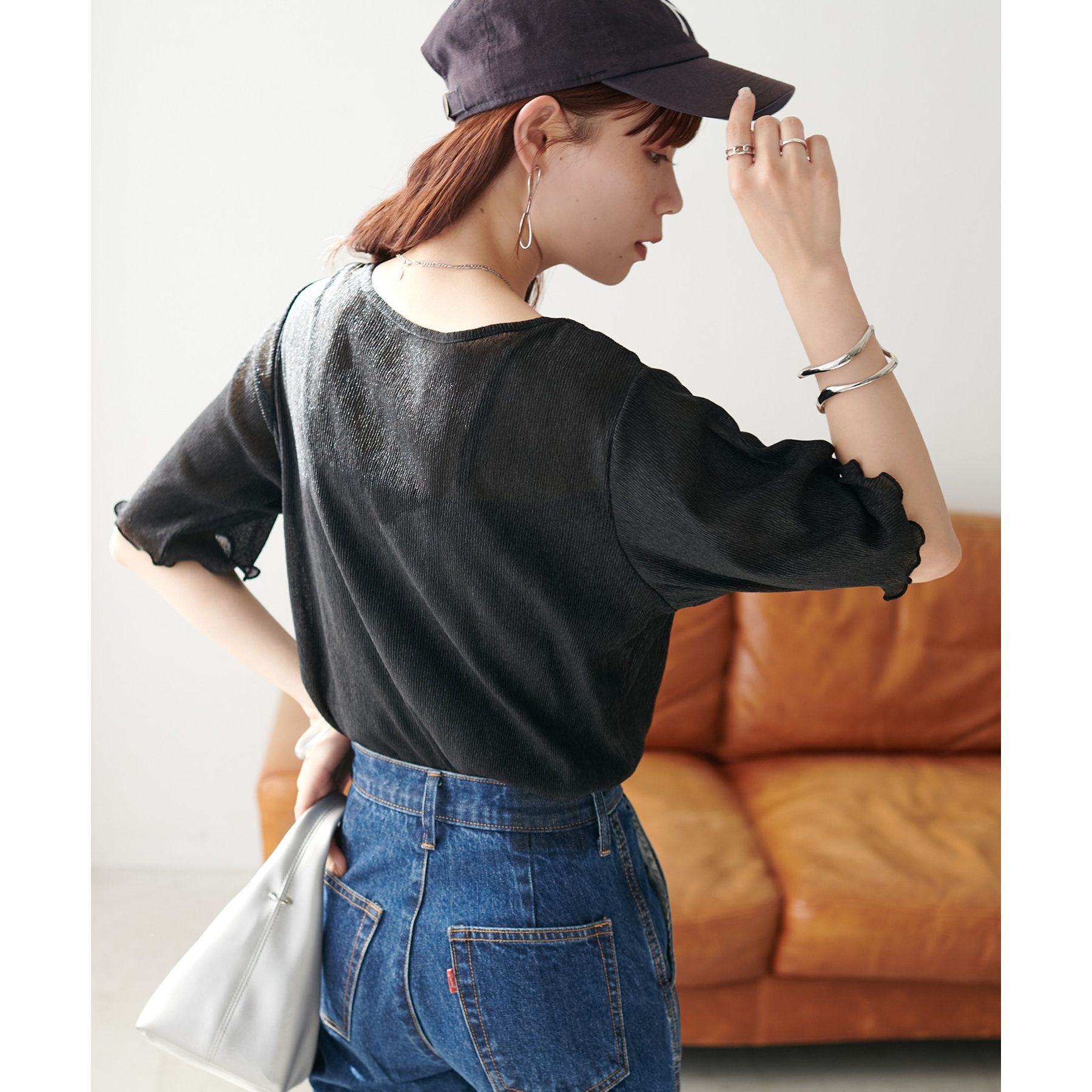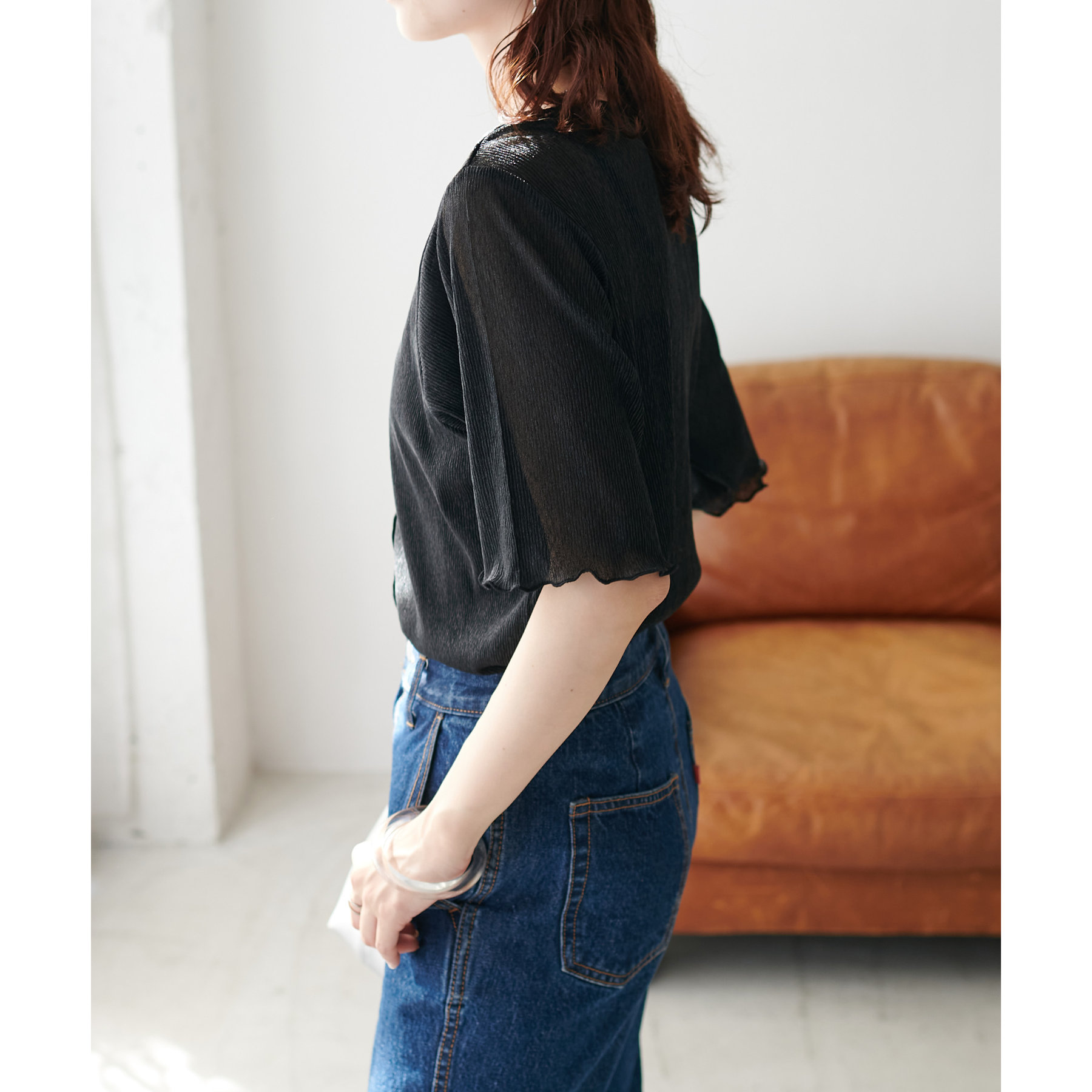 155cmスタッフ(Mサイズ着用):ラメ感も派手すぎず、顔まわりがパッと明るく見える印象。前後で雰囲気が変わるので、毎日のコーデに取り入れやすいです♪
