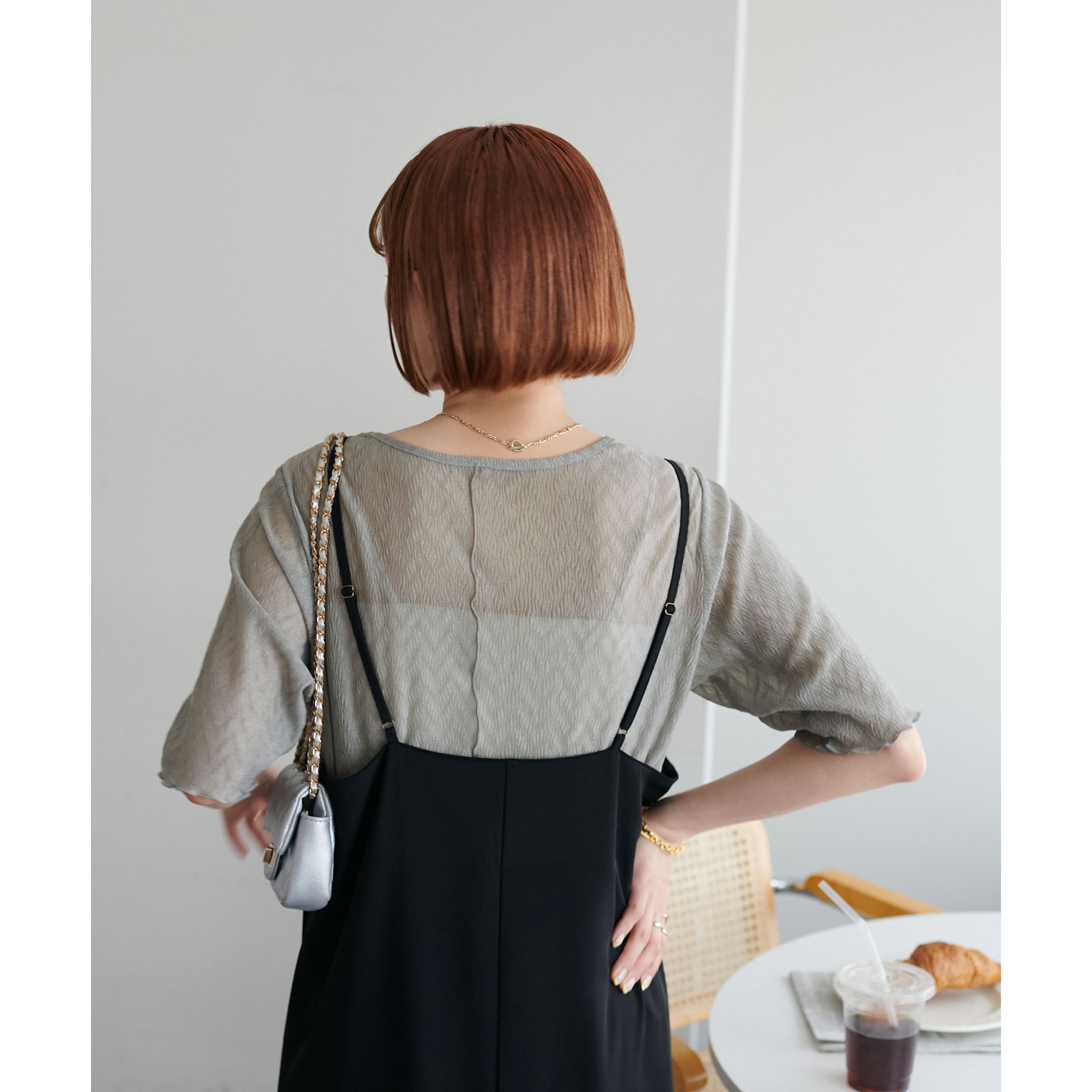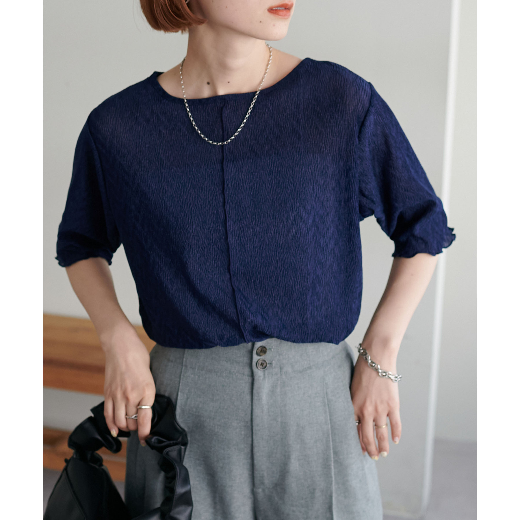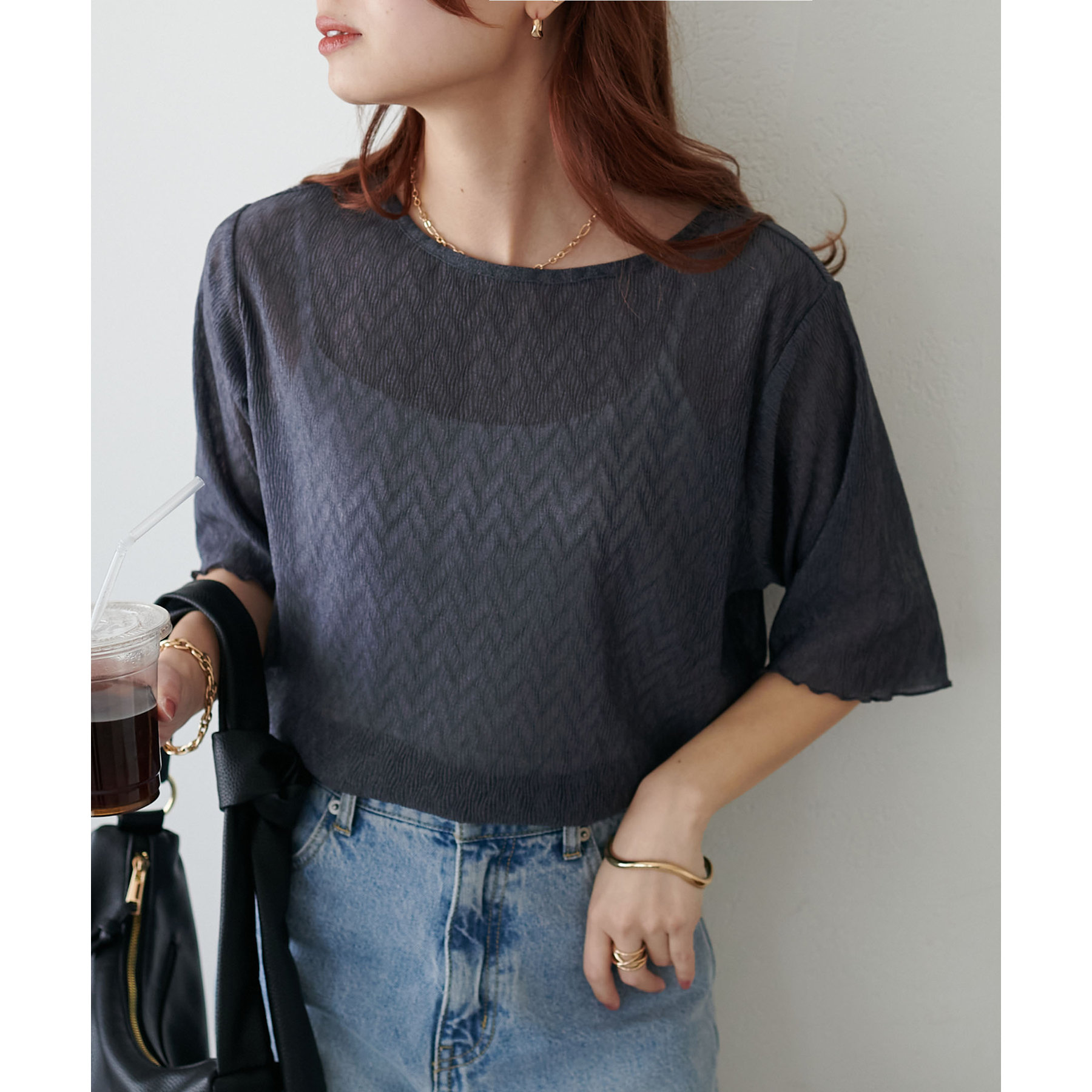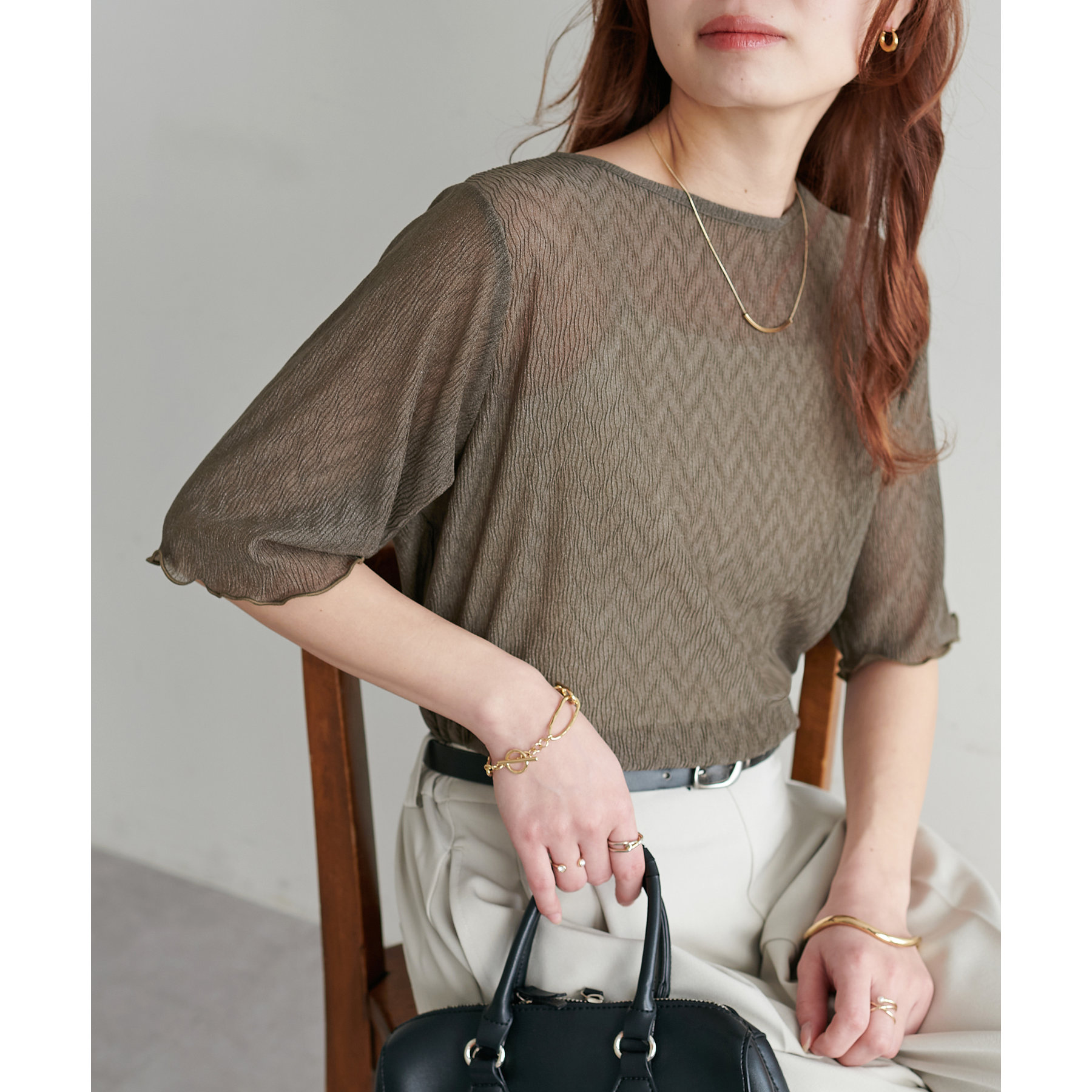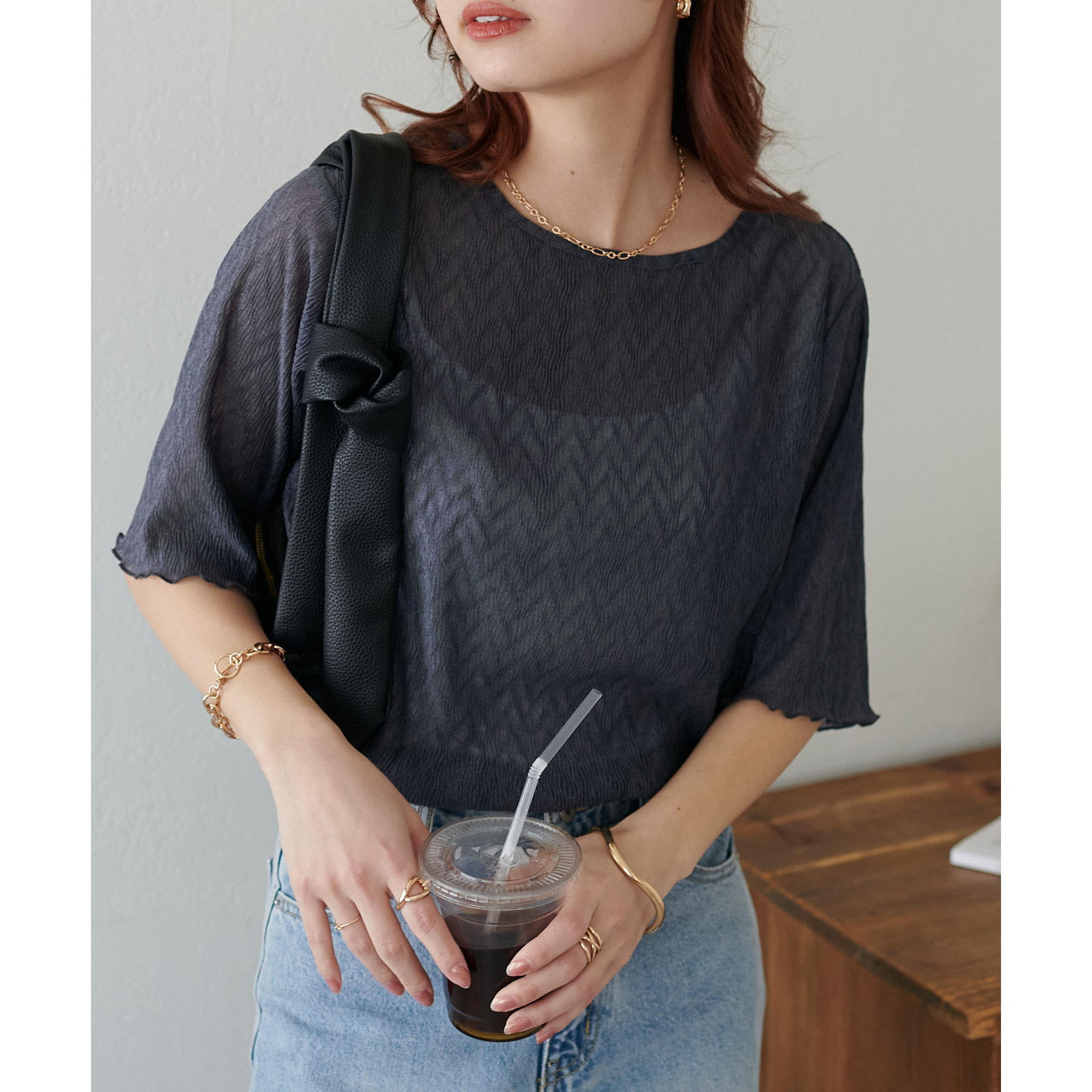 155cmスタッフ(Mサイズ着用):ラメ感も派手すぎず、顔まわりがパッと明るく見える印象。前後で雰囲気が変わるので、毎日のコーデに取り入れやすいです♪