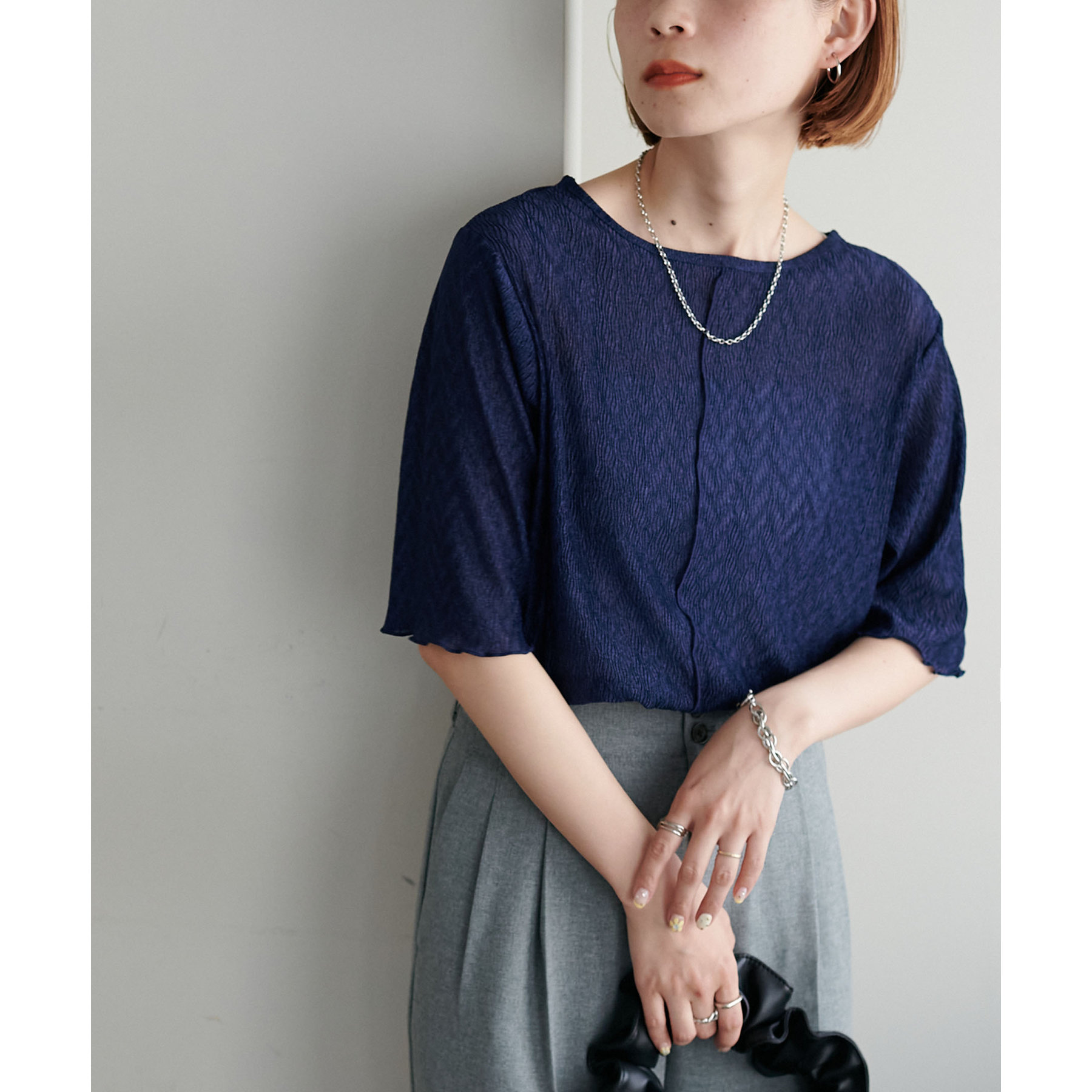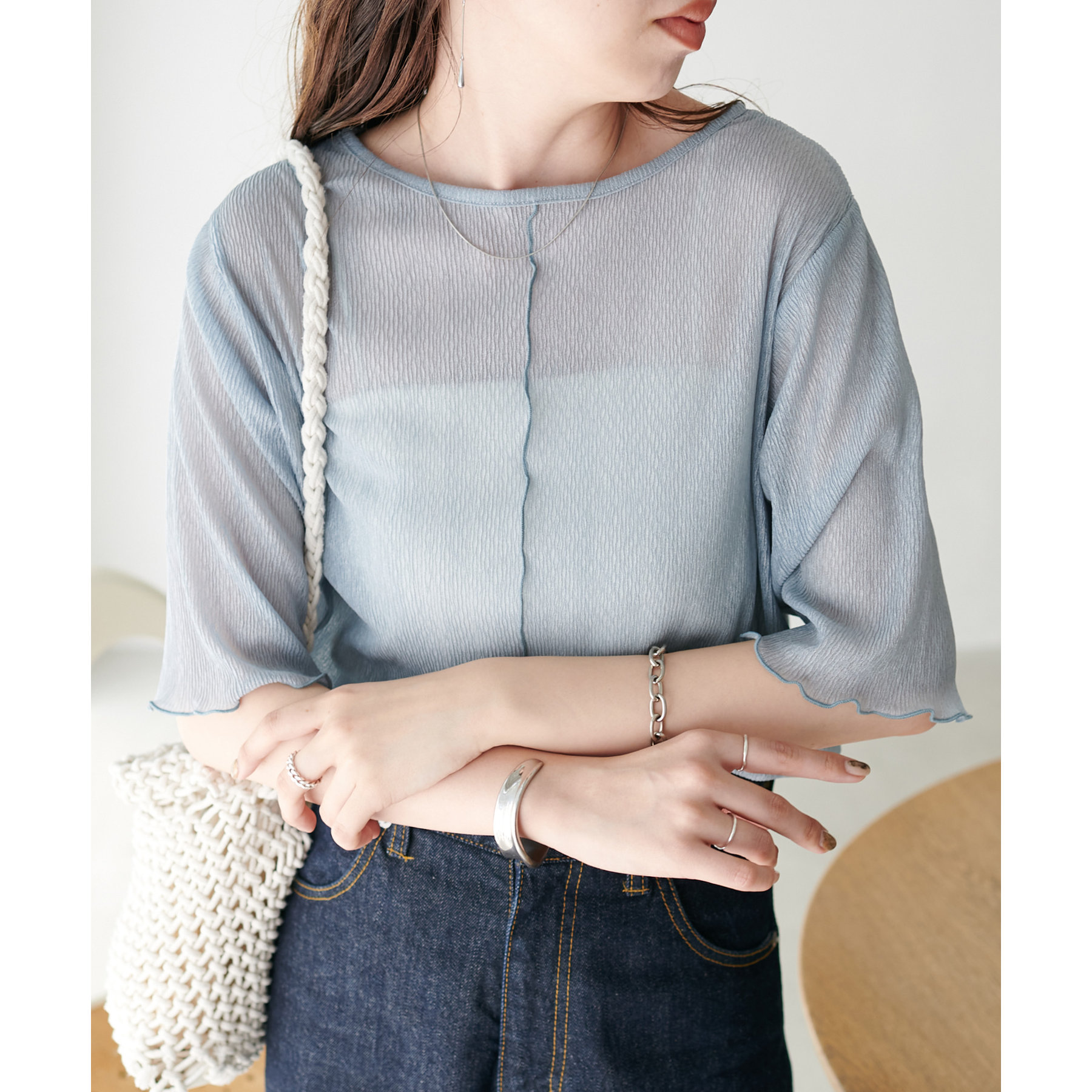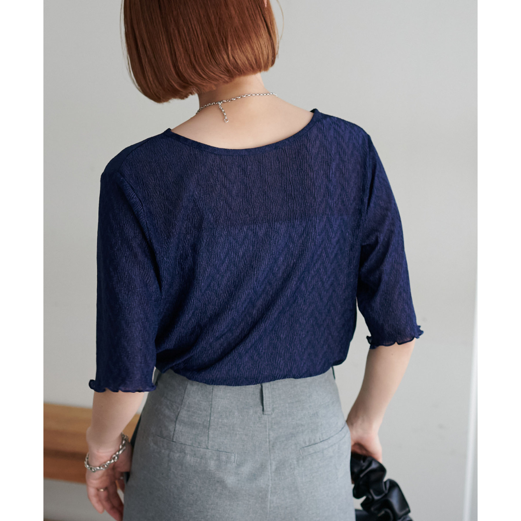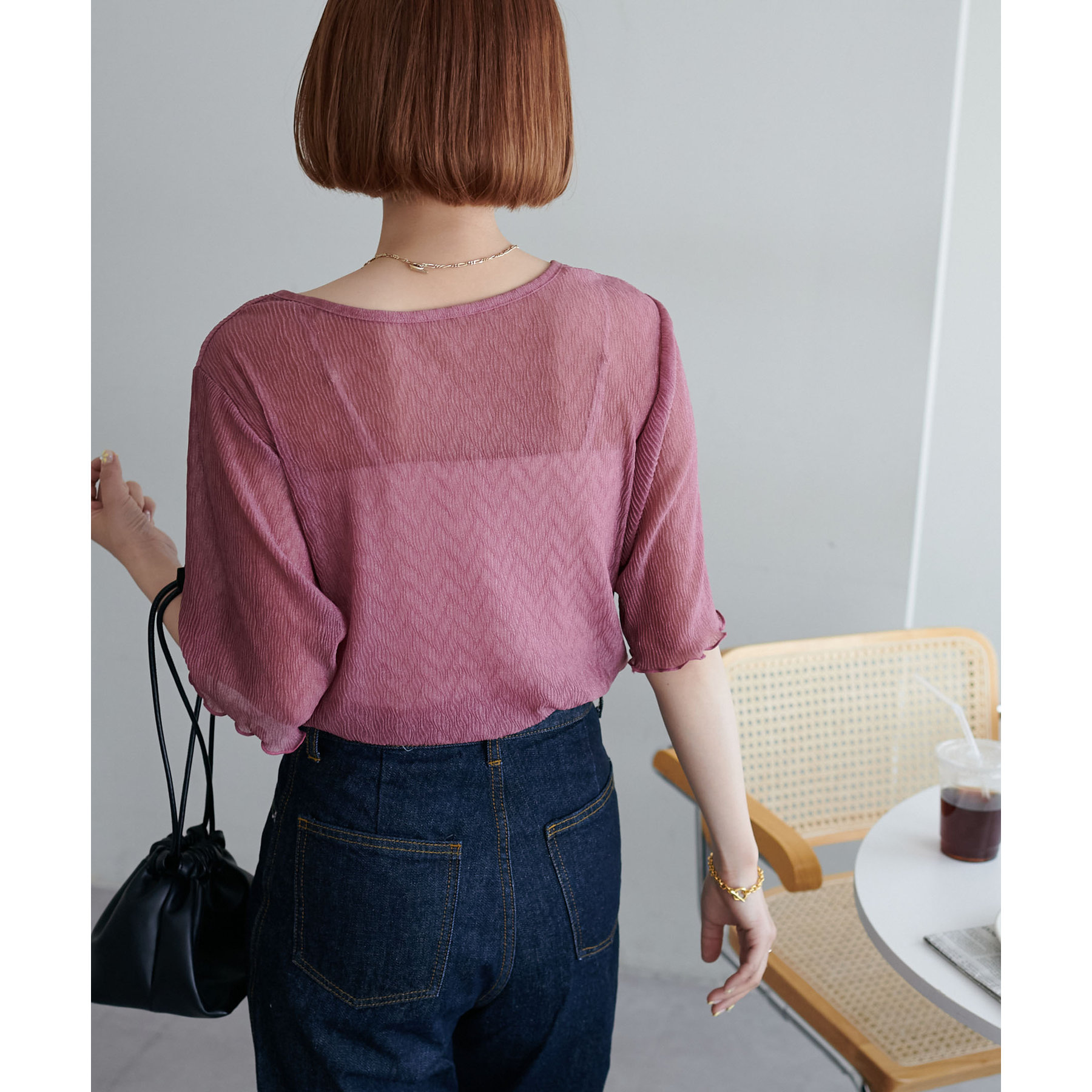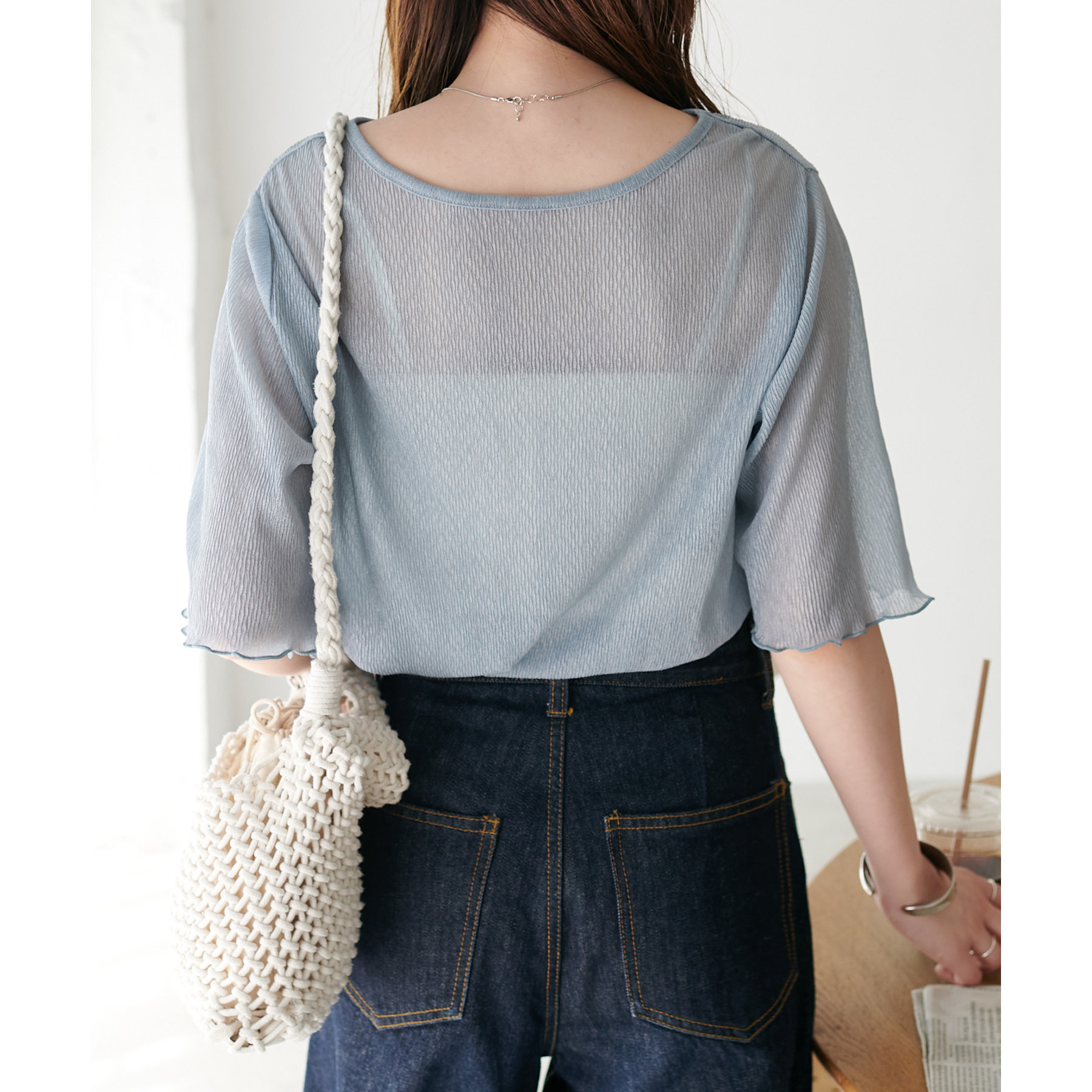 155cmスタッフ(Mサイズ着用):ラメ感も派手すぎず、顔まわりがパッと明るく見える印象。前後で雰囲気が変わるので、毎日のコーデに取り入れやすいです♪