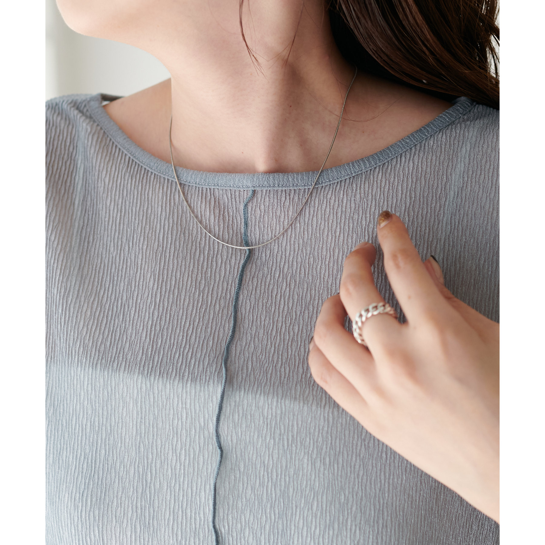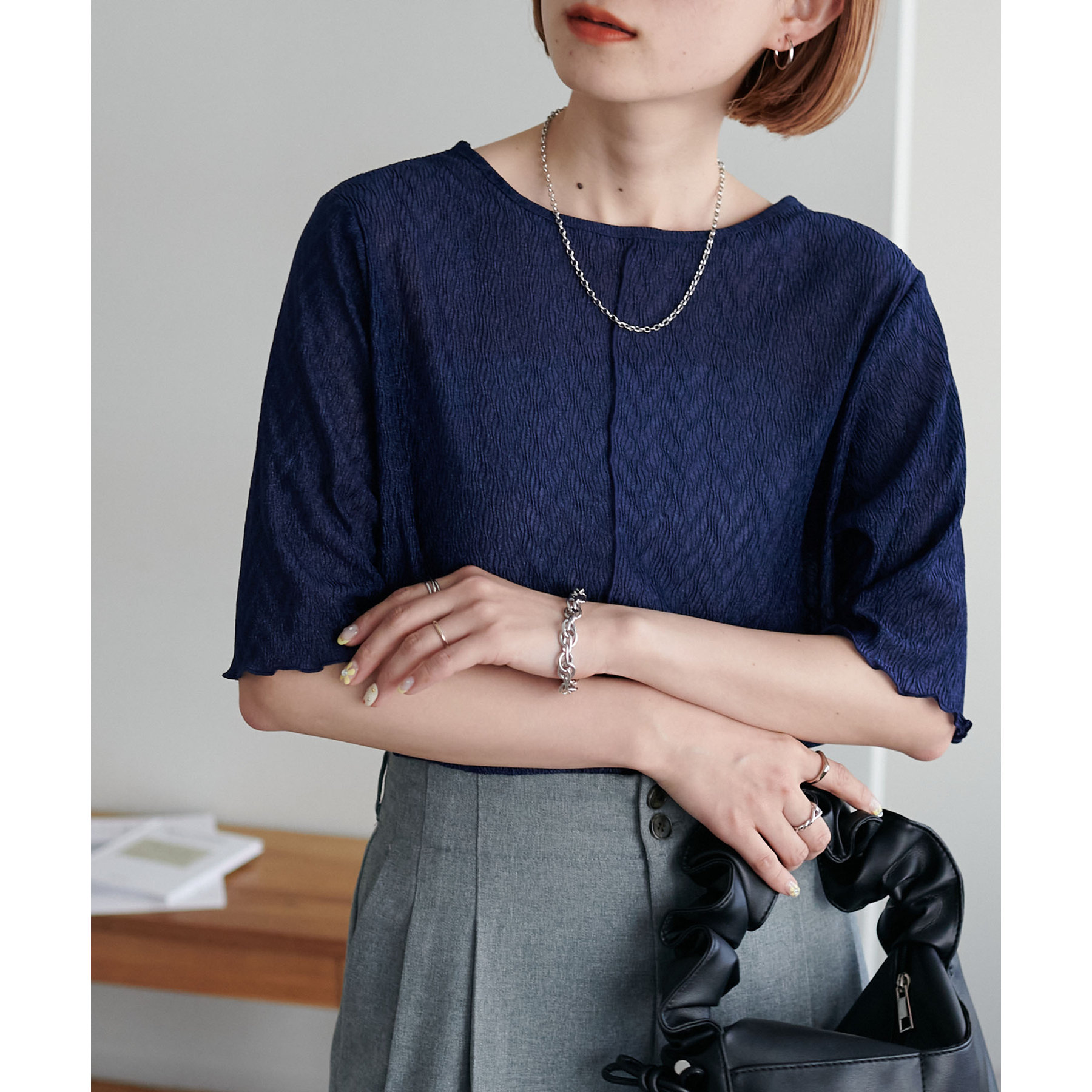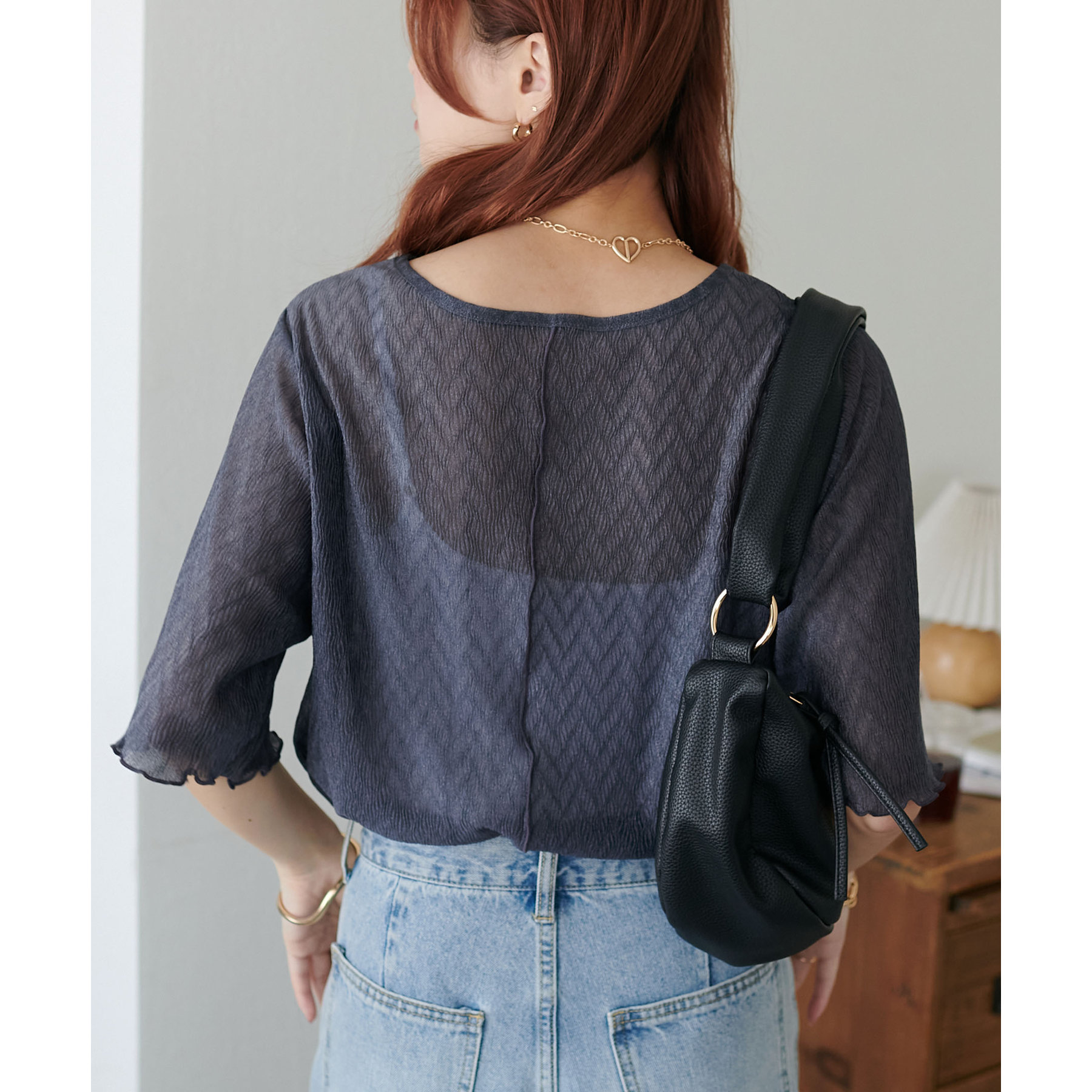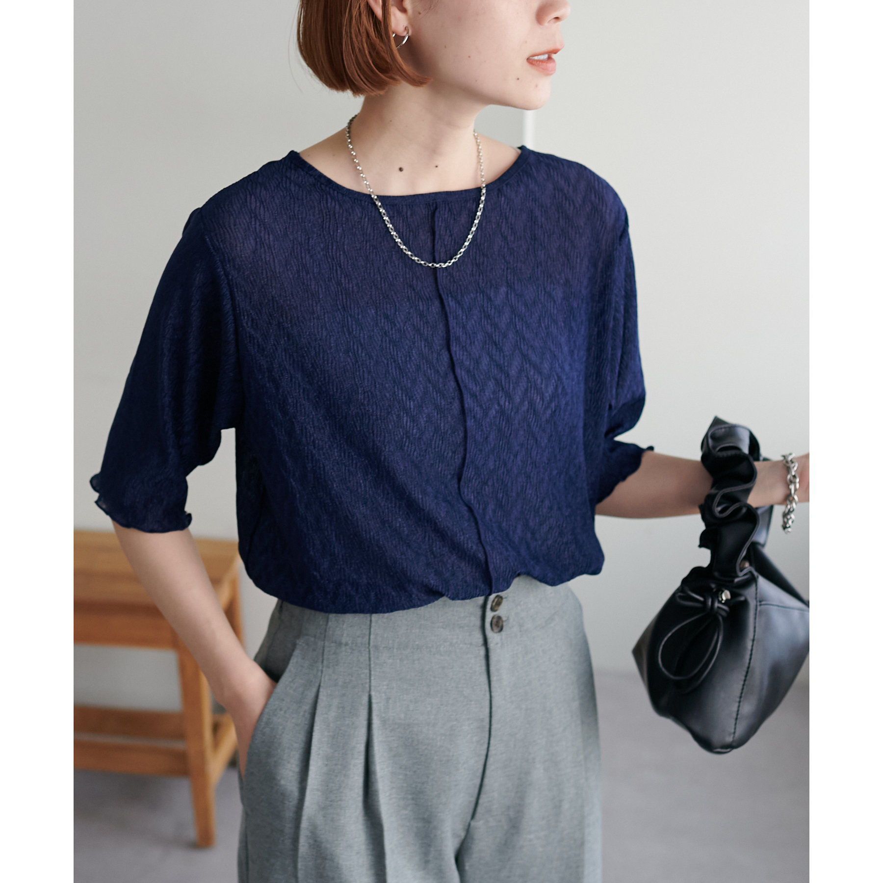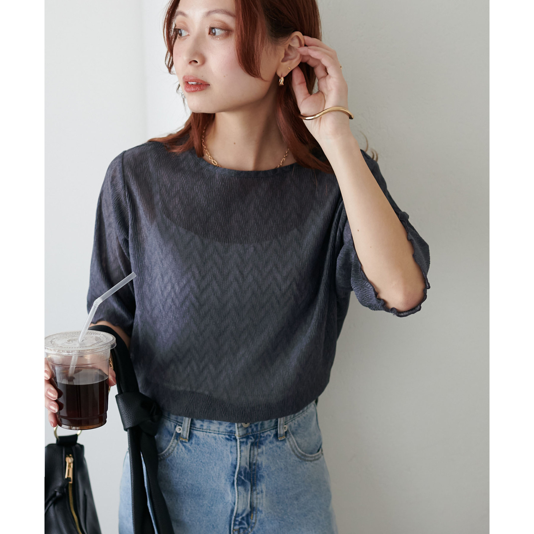155cmスタッフ(Mサイズ着用):ラメ感も派手すぎず、顔まわりがパッと明るく見える印象。前後で雰囲気が変わるので、毎日のコーデに取り入れやすいです♪