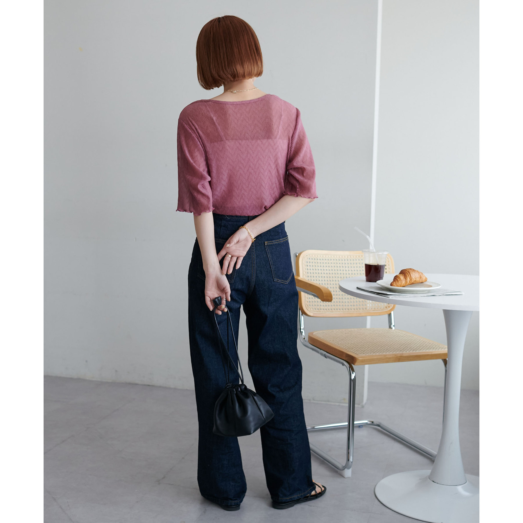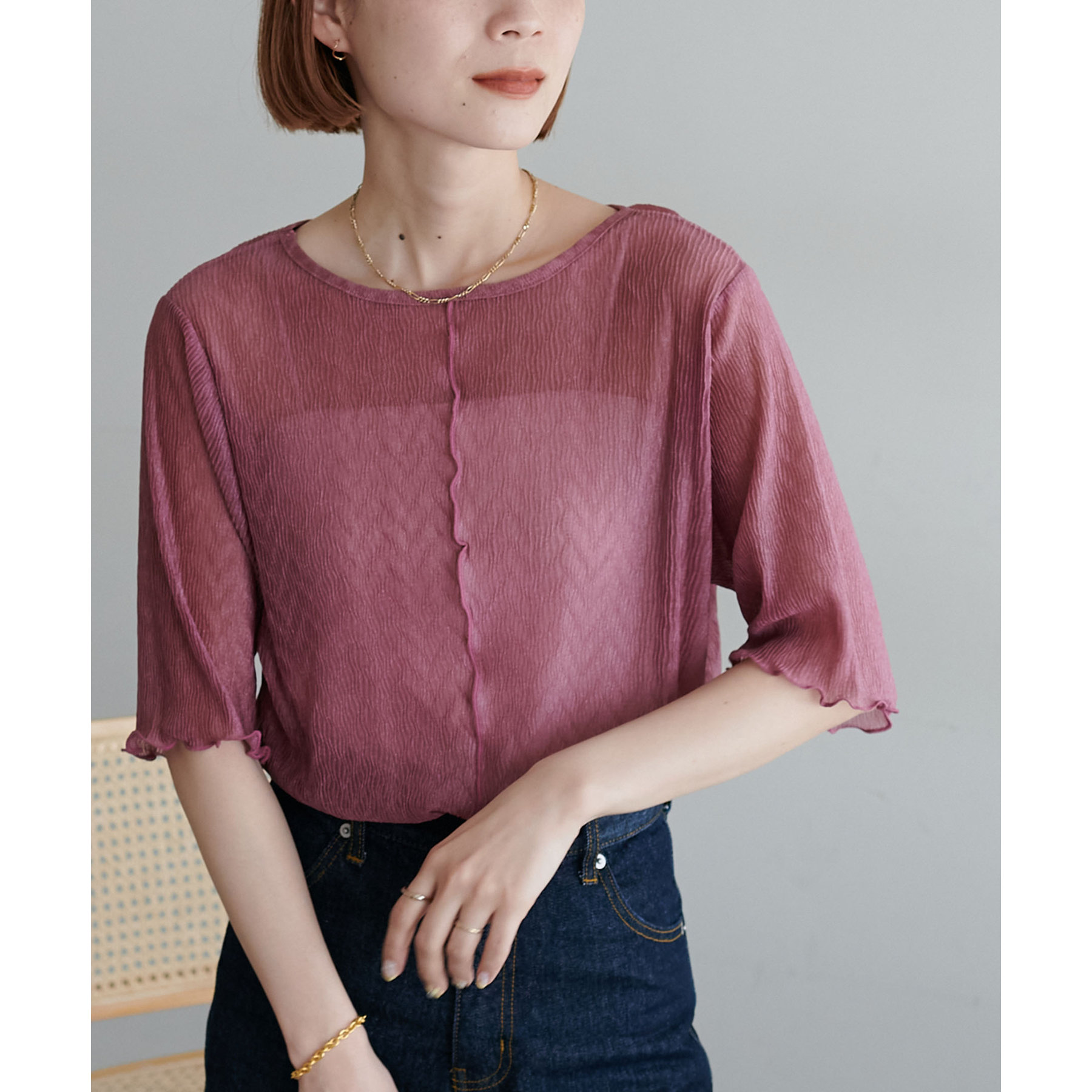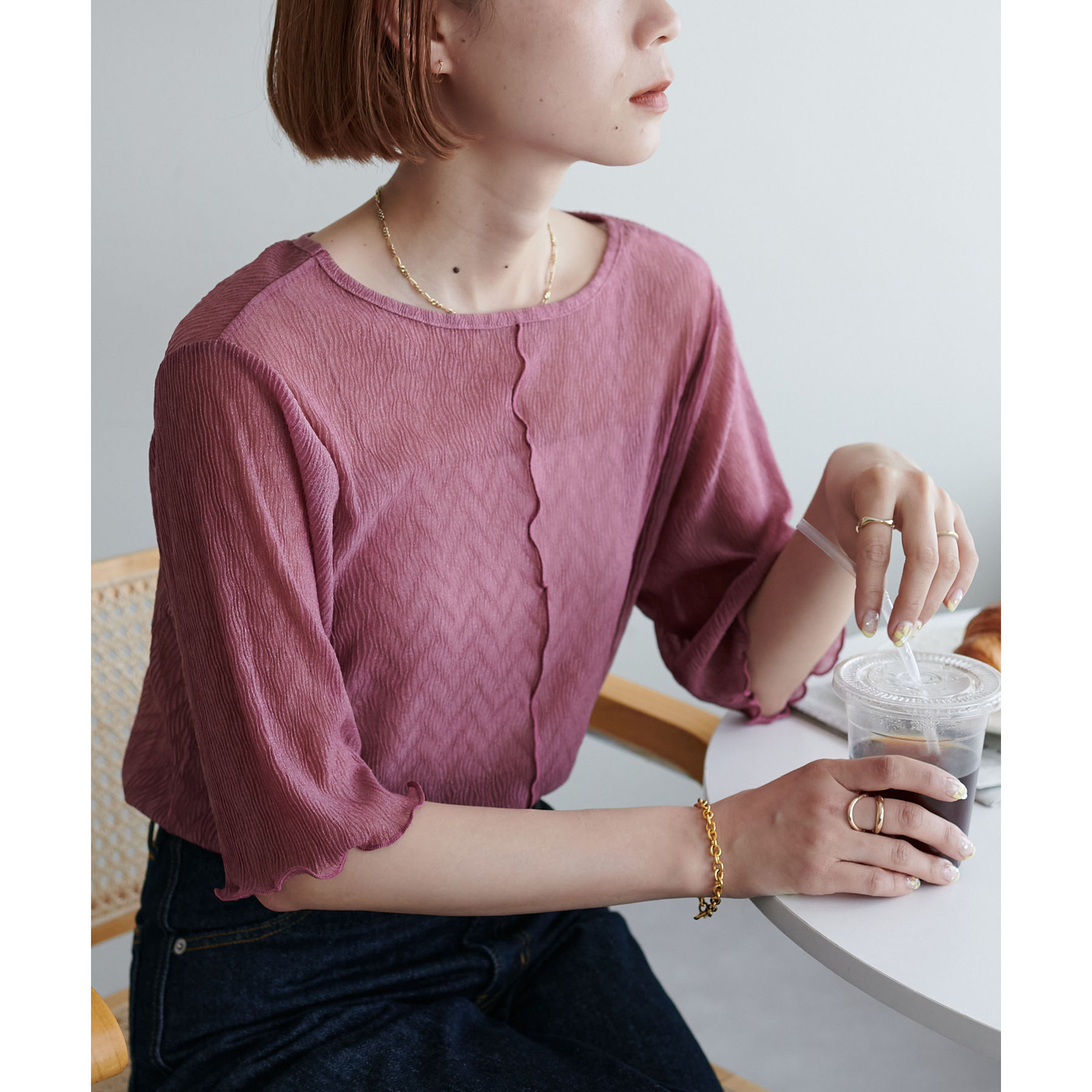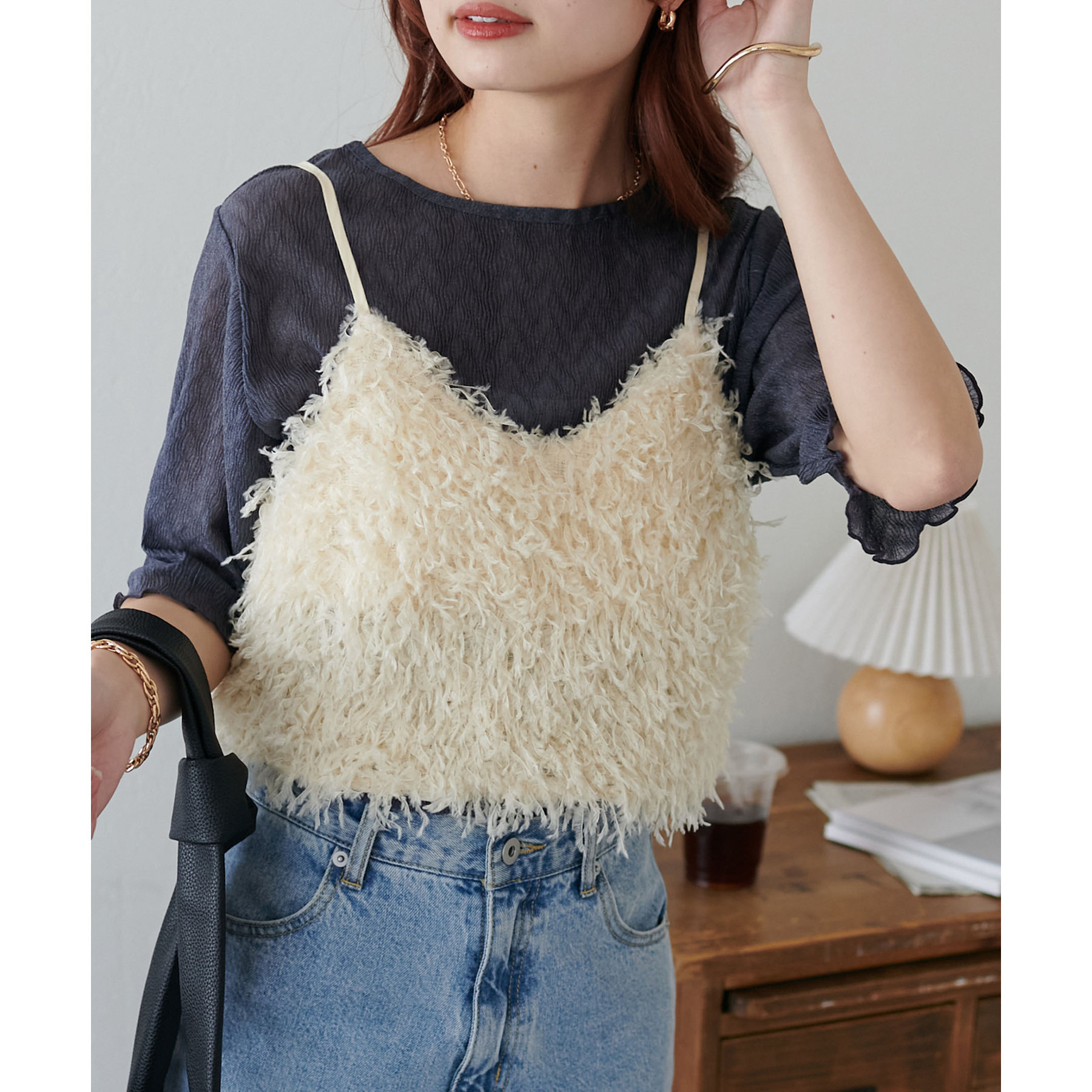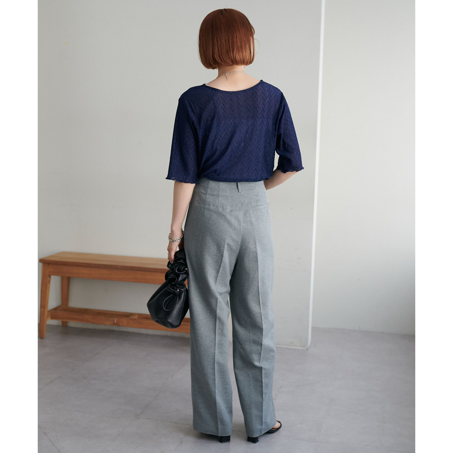 155cmスタッフ(Mサイズ着用):ラメ感も派手すぎず、顔まわりがパッと明るく見える印象。前後で雰囲気が変わるので、毎日のコーデに取り入れやすいです♪