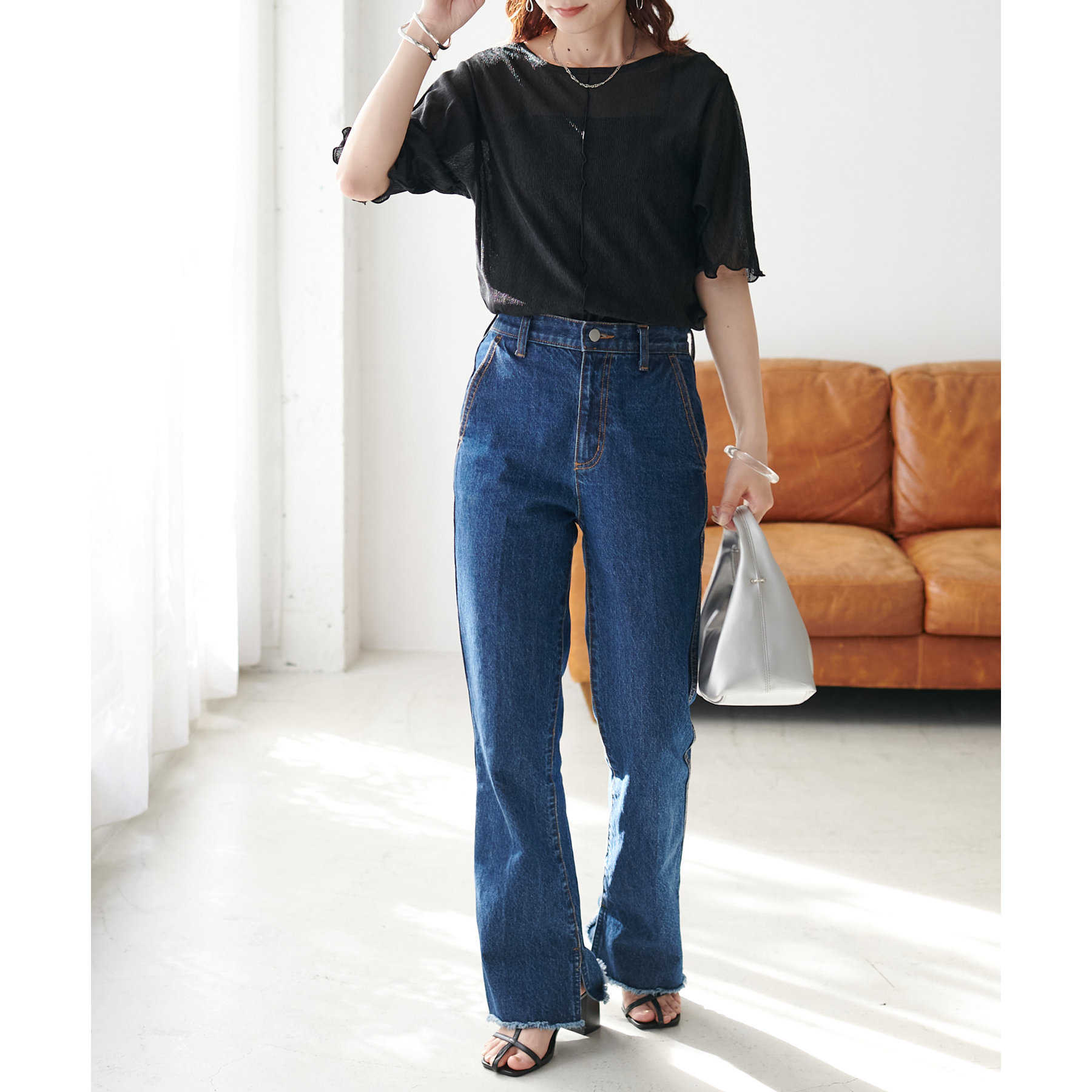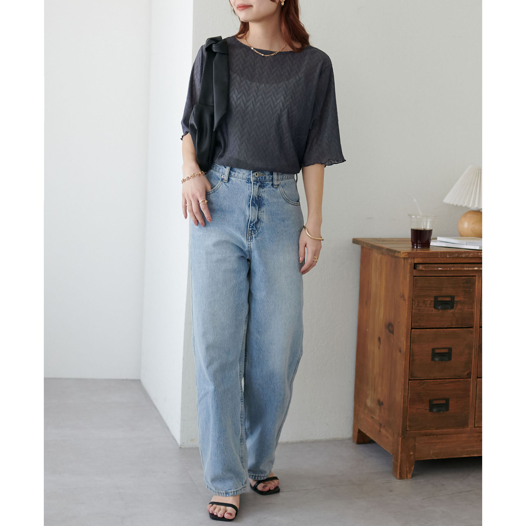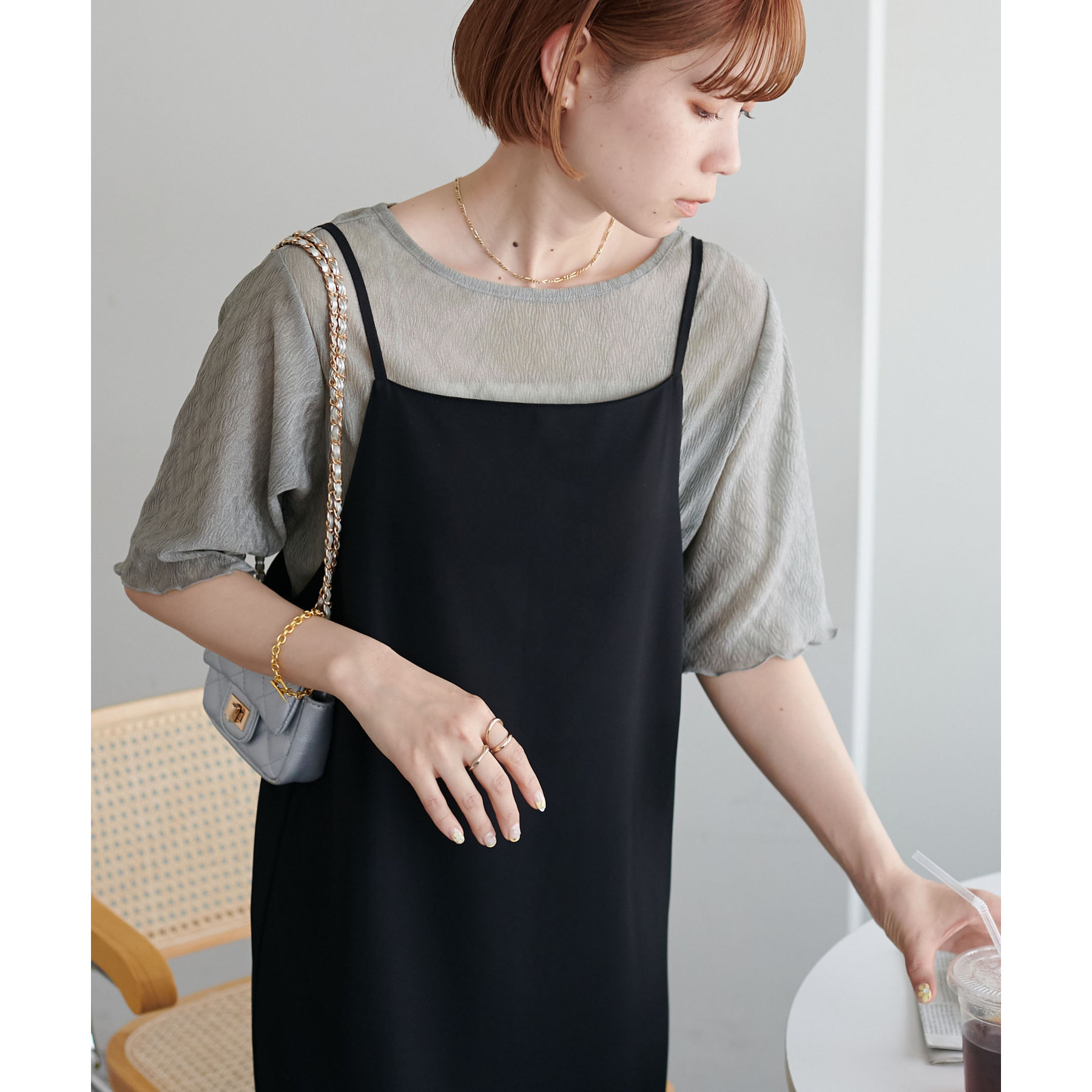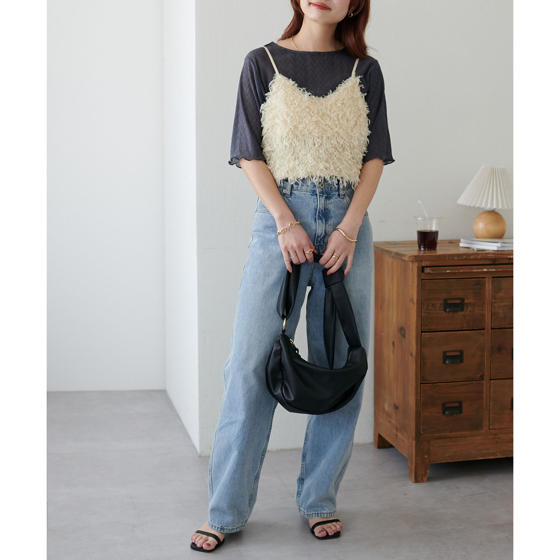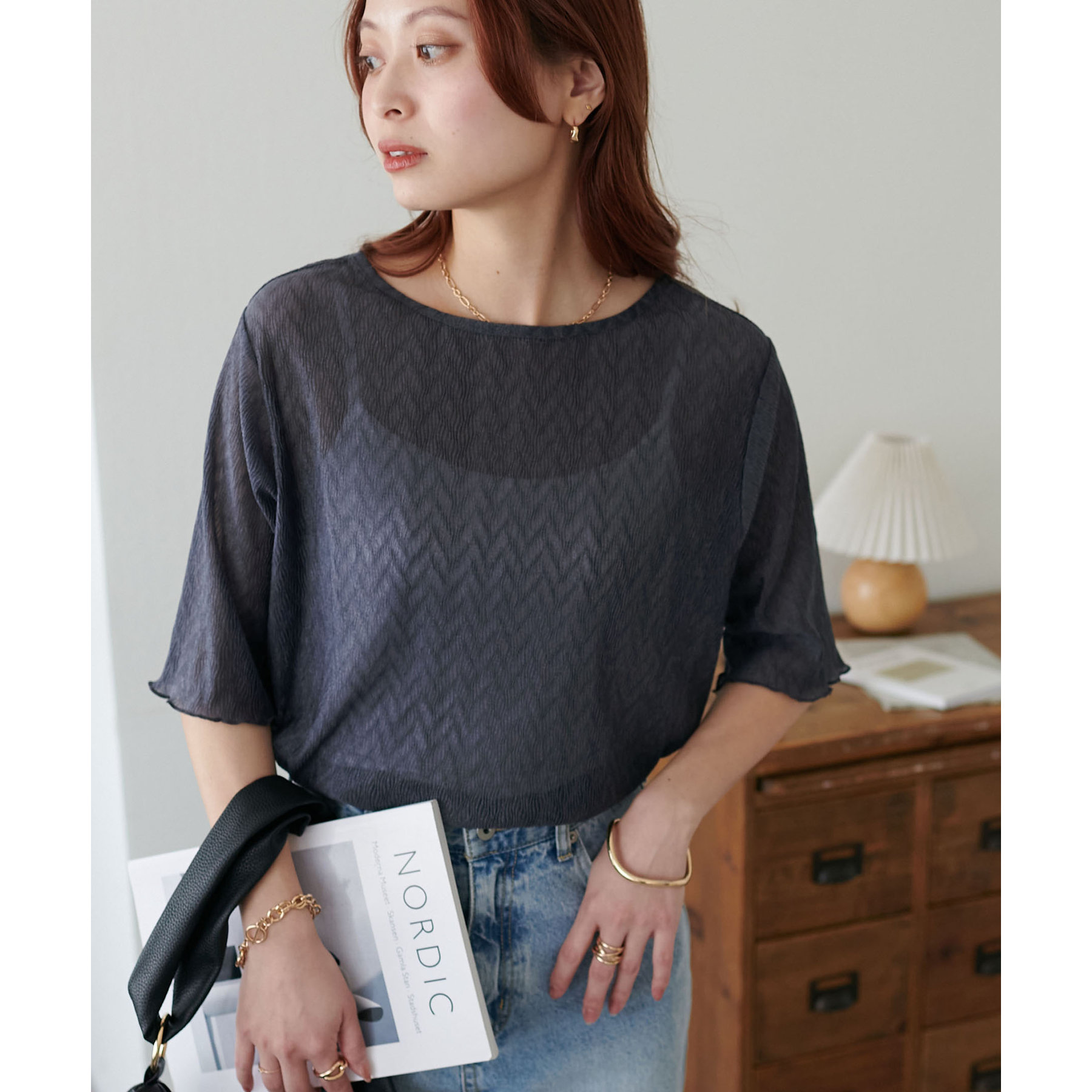 155cmスタッフ(Mサイズ着用):ラメ感も派手すぎず、顔まわりがパッと明るく見える印象。前後で雰囲気が変わるので、毎日のコーデに取り入れやすいです♪