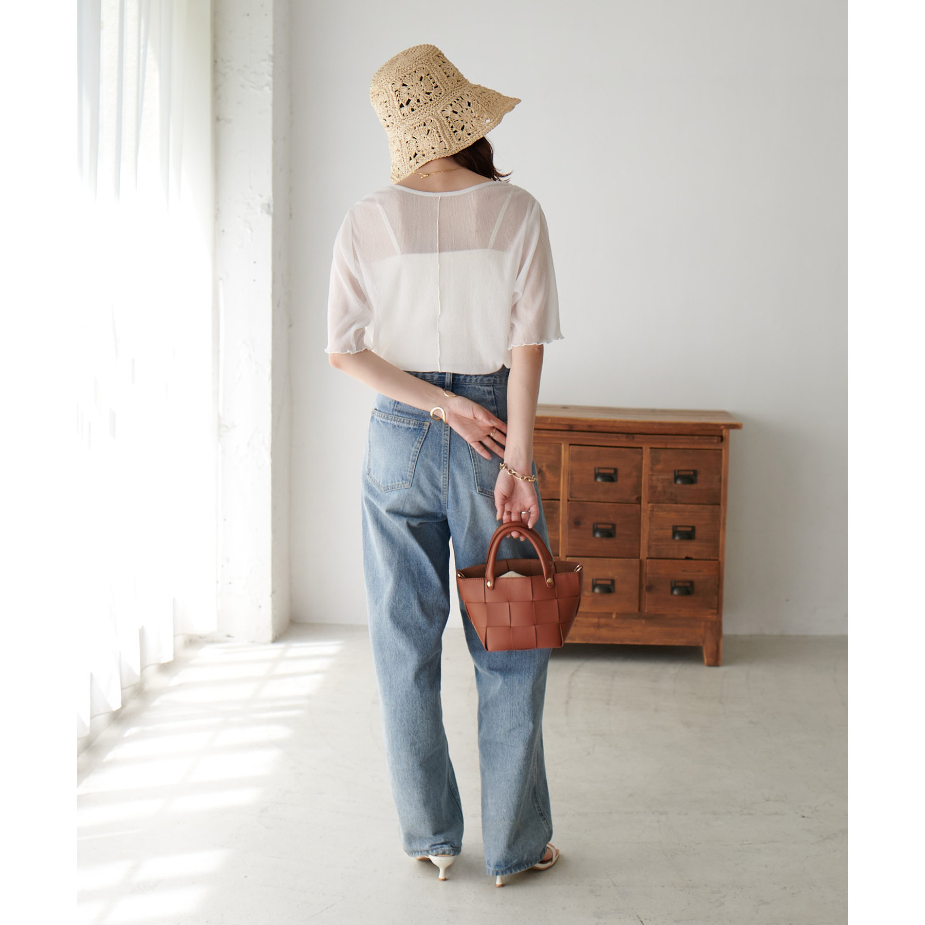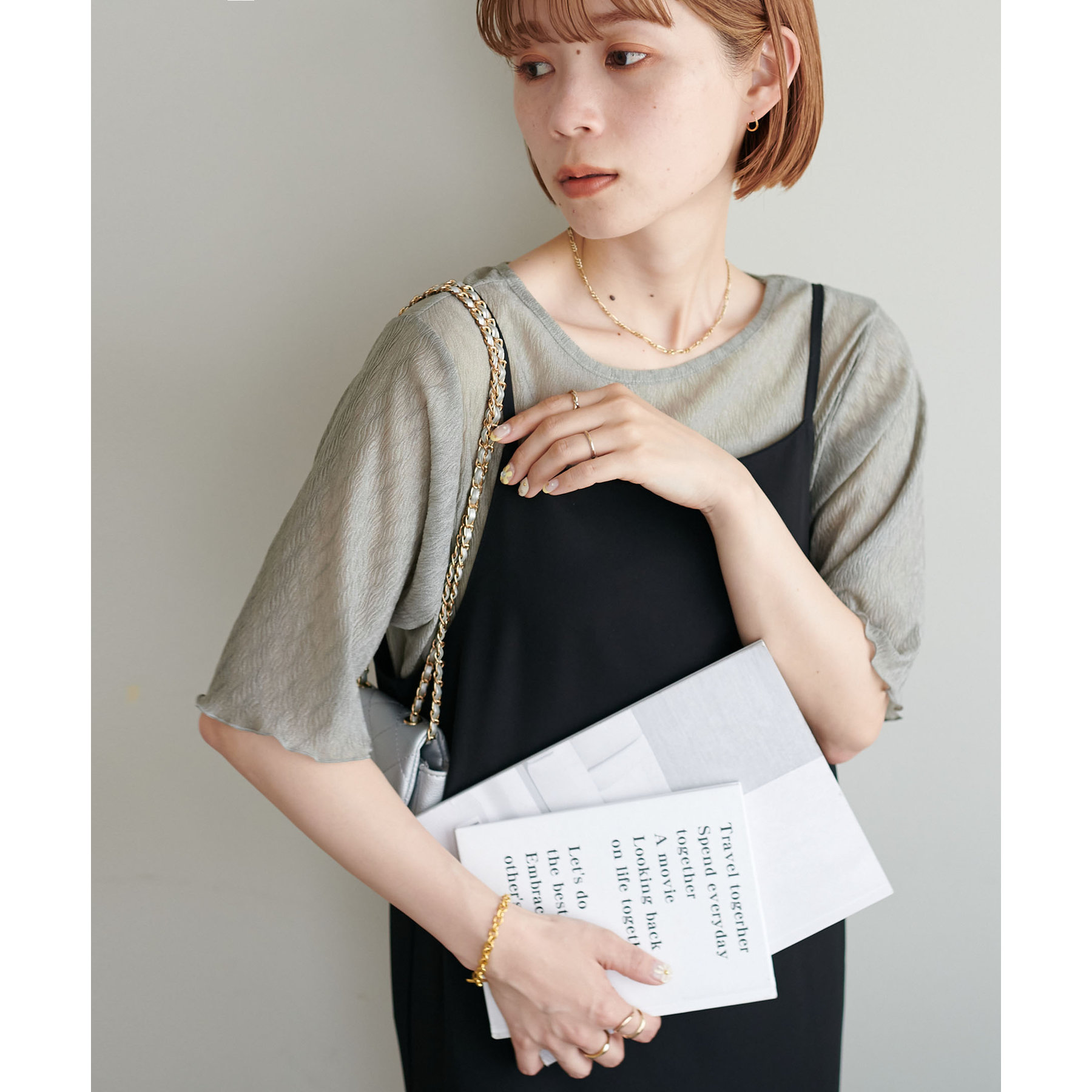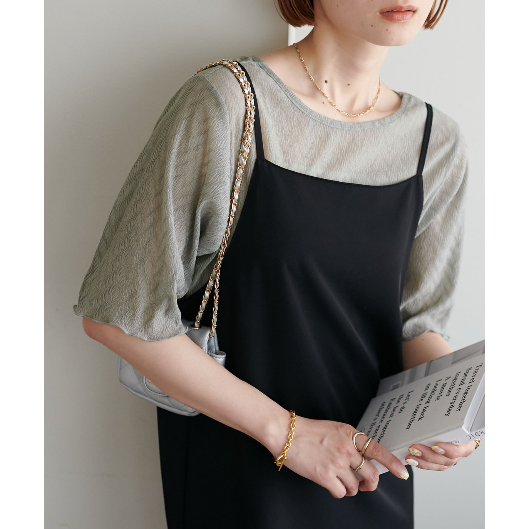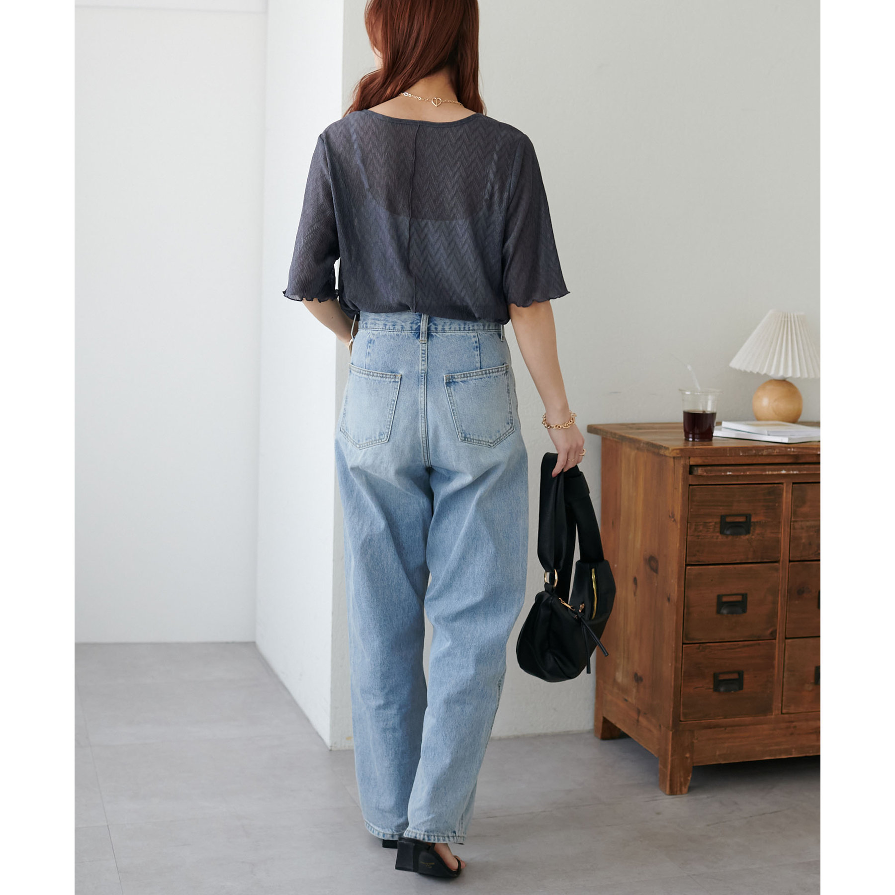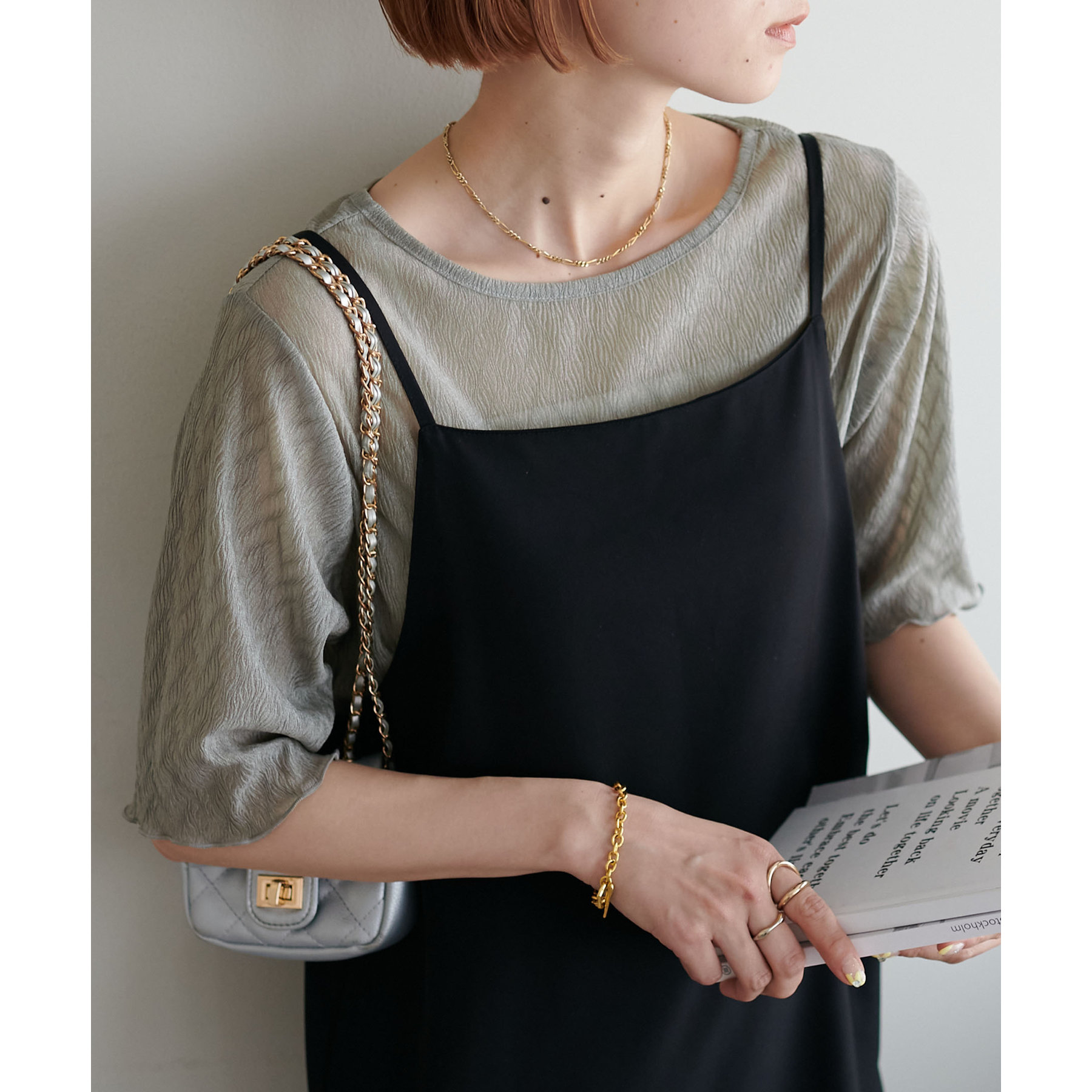 155cmスタッフ(Mサイズ着用):ラメ感も派手すぎず、顔まわりがパッと明るく見える印象。前後で雰囲気が変わるので、毎日のコーデに取り入れやすいです♪