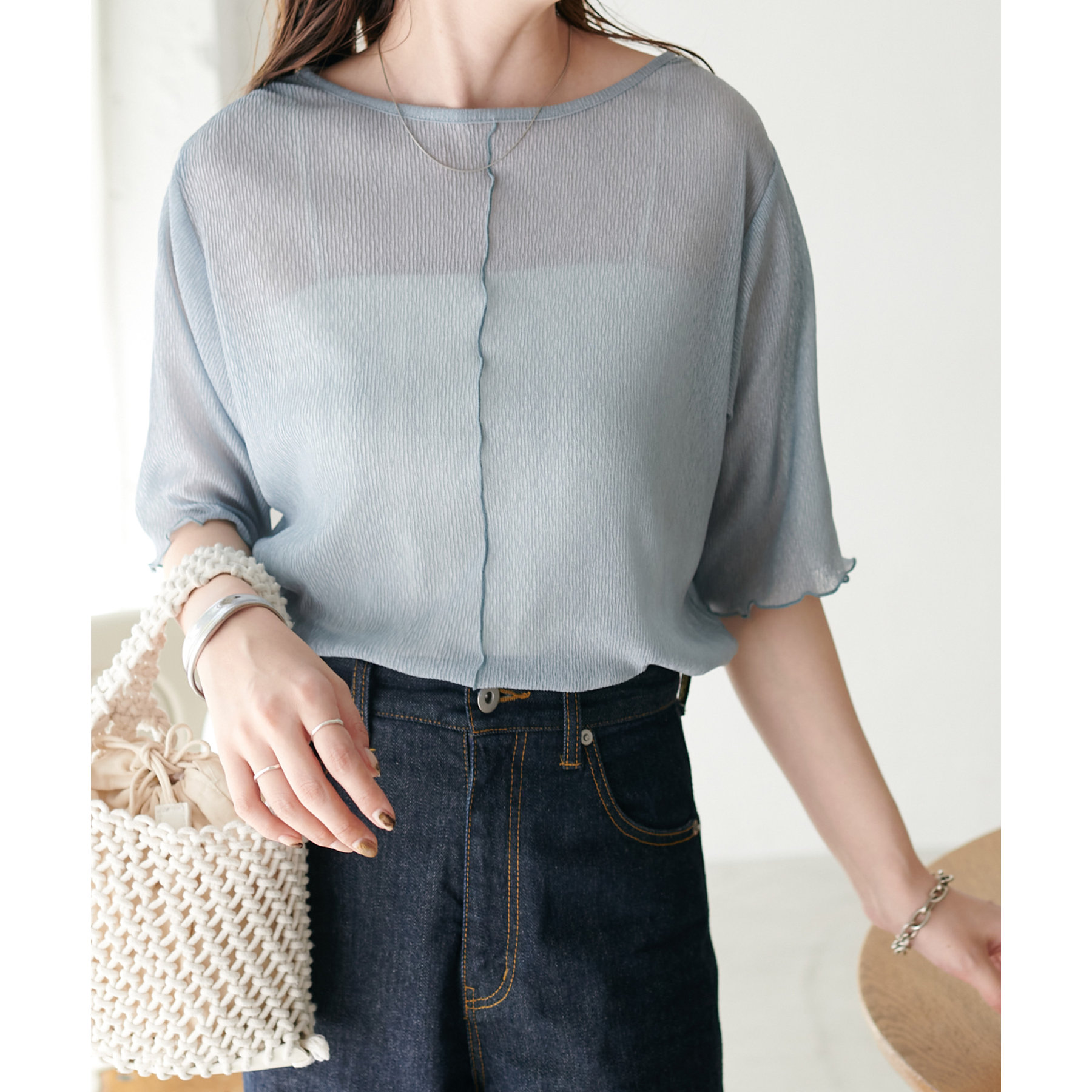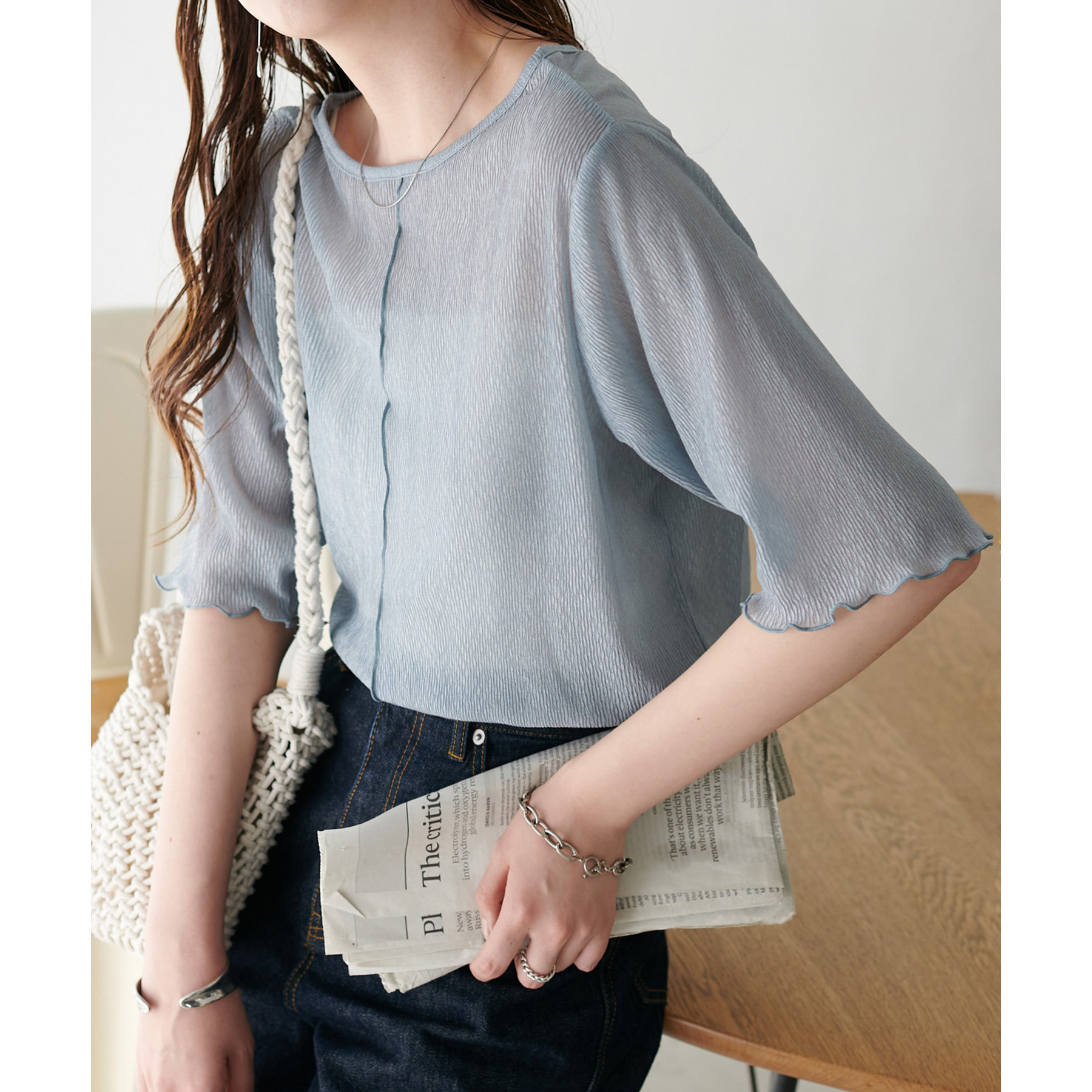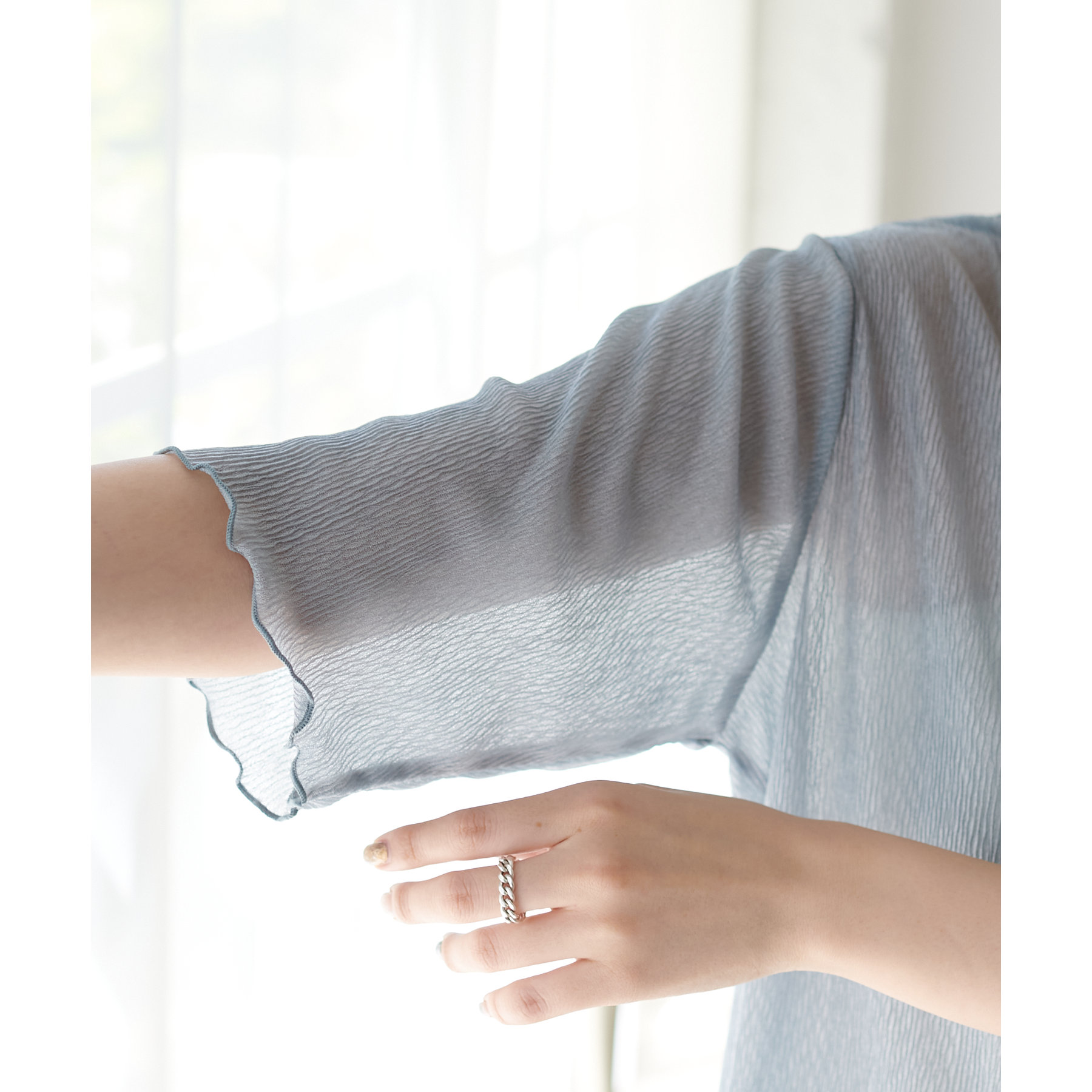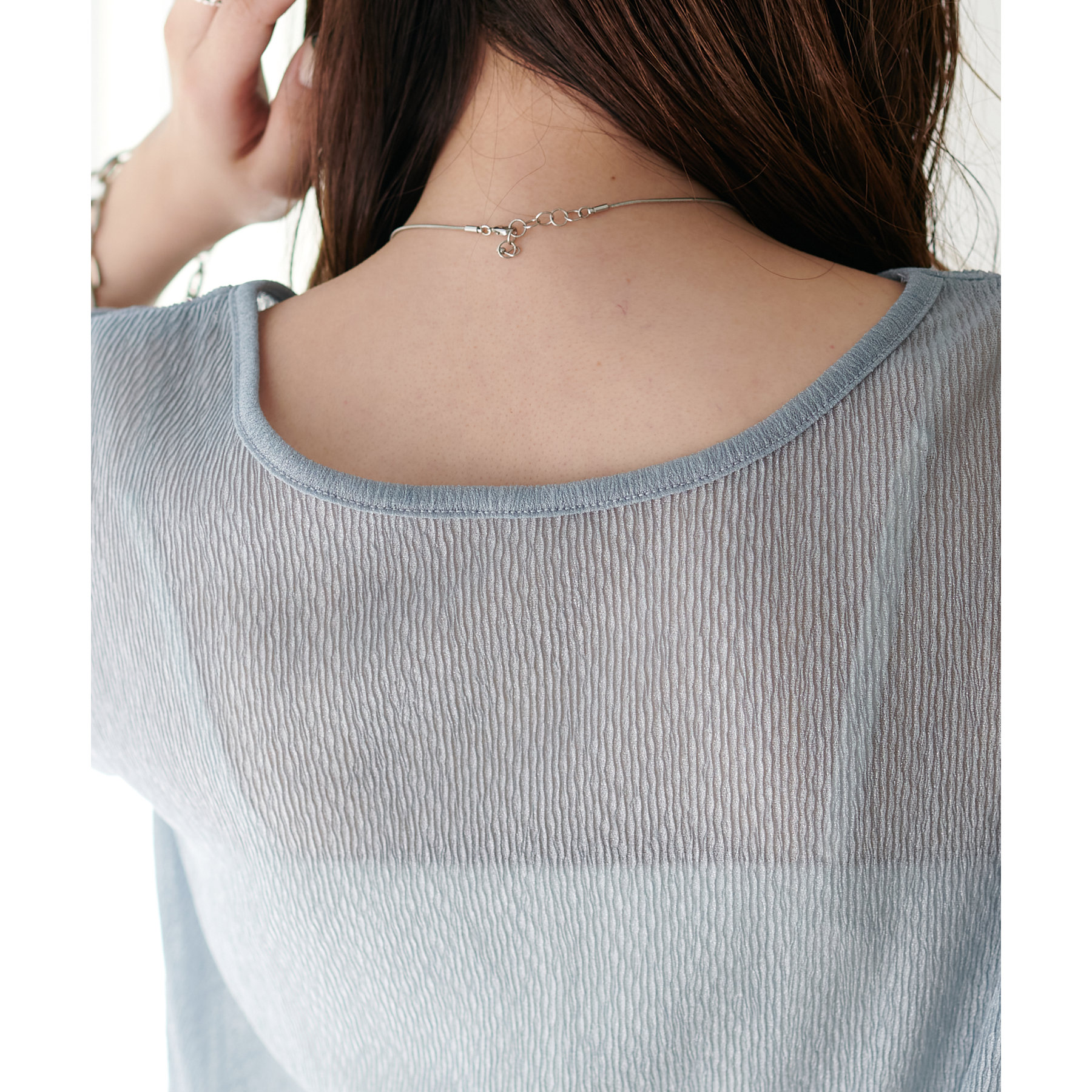 程よいラメ感とヨウリュウのような肌離れの良い生地が上品なシアーTシャツ。袖口と裾に施したプリーツがフェミニン感をプラス◎前後2WAY仕様で切り替え部分をフロントにしてもトレンド感のある着こなしに。シーズンにぴったりのヘルシー感高まる一枚です♪ベーシックなお色味に、ライトブルーの爽やかなカラーを加えた色展開も魅力の一つです。