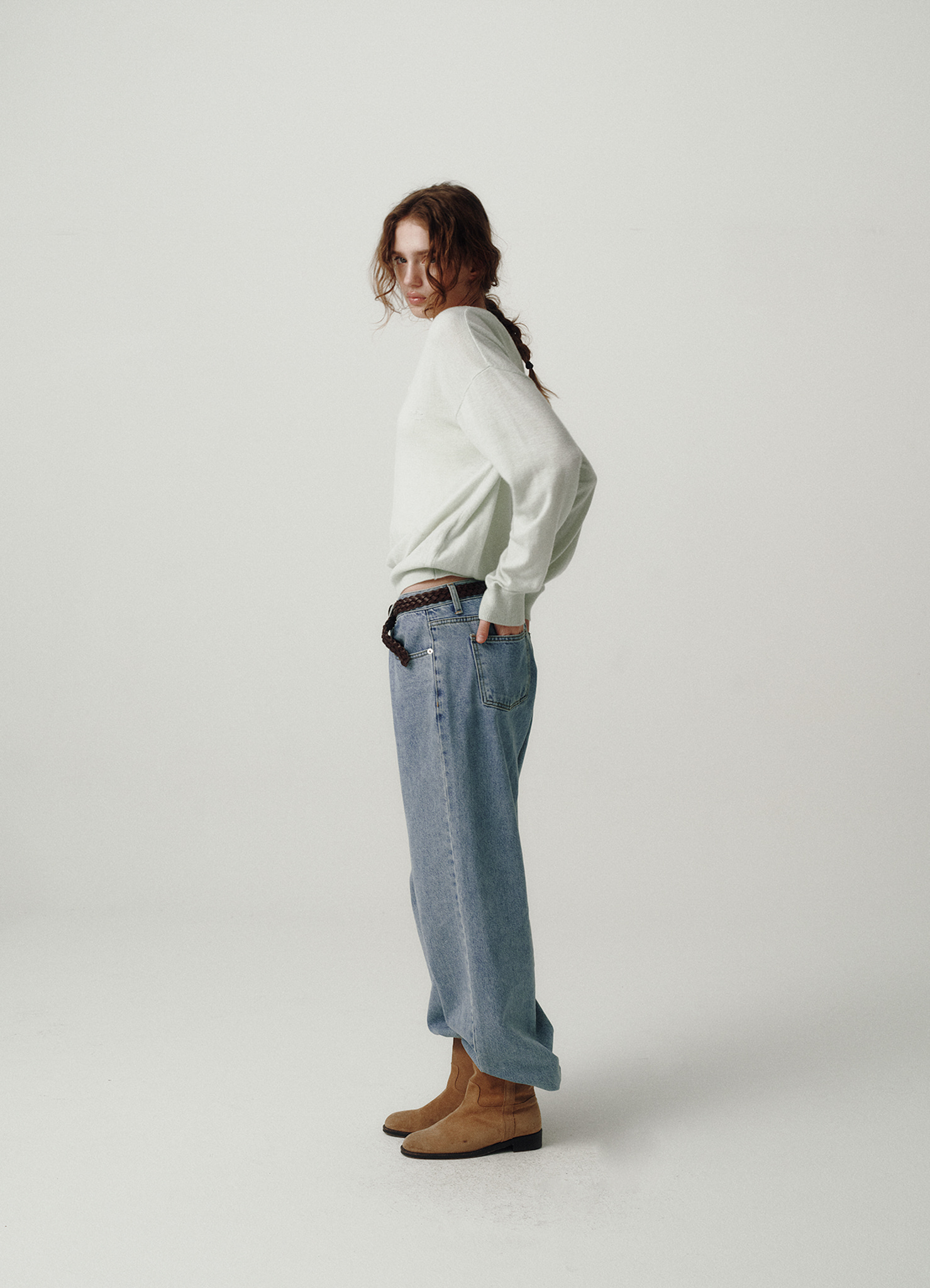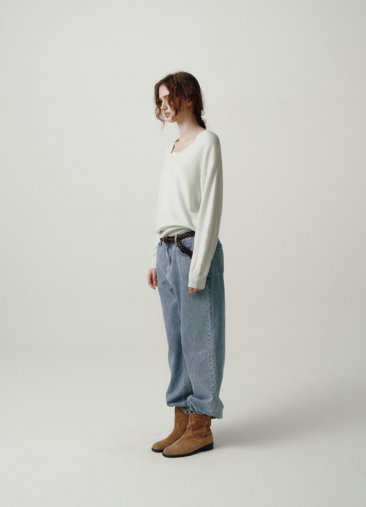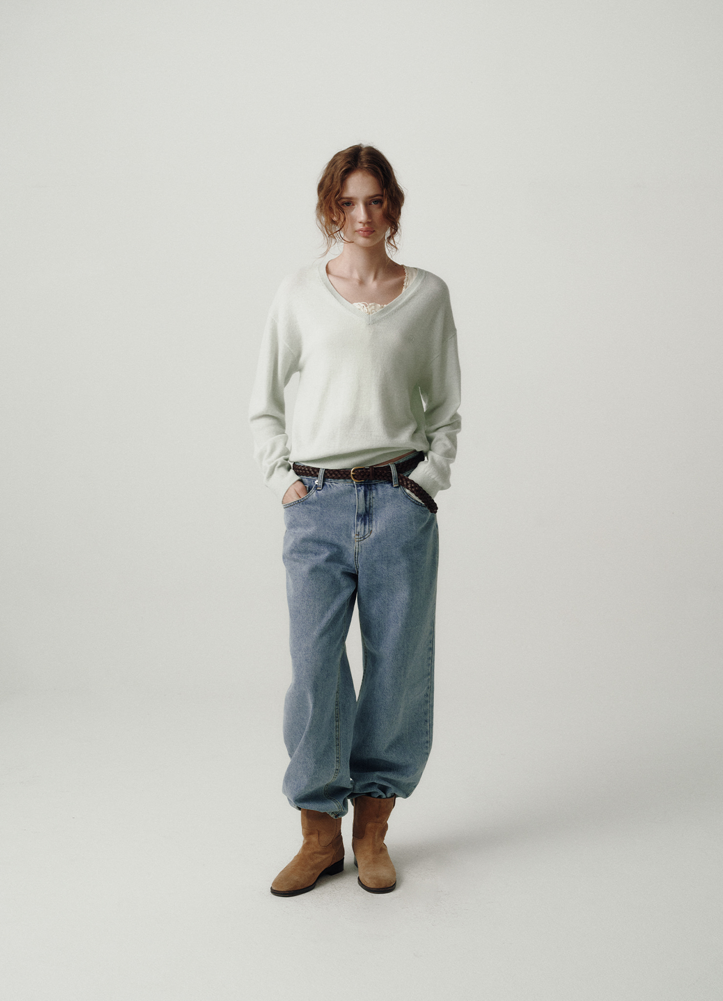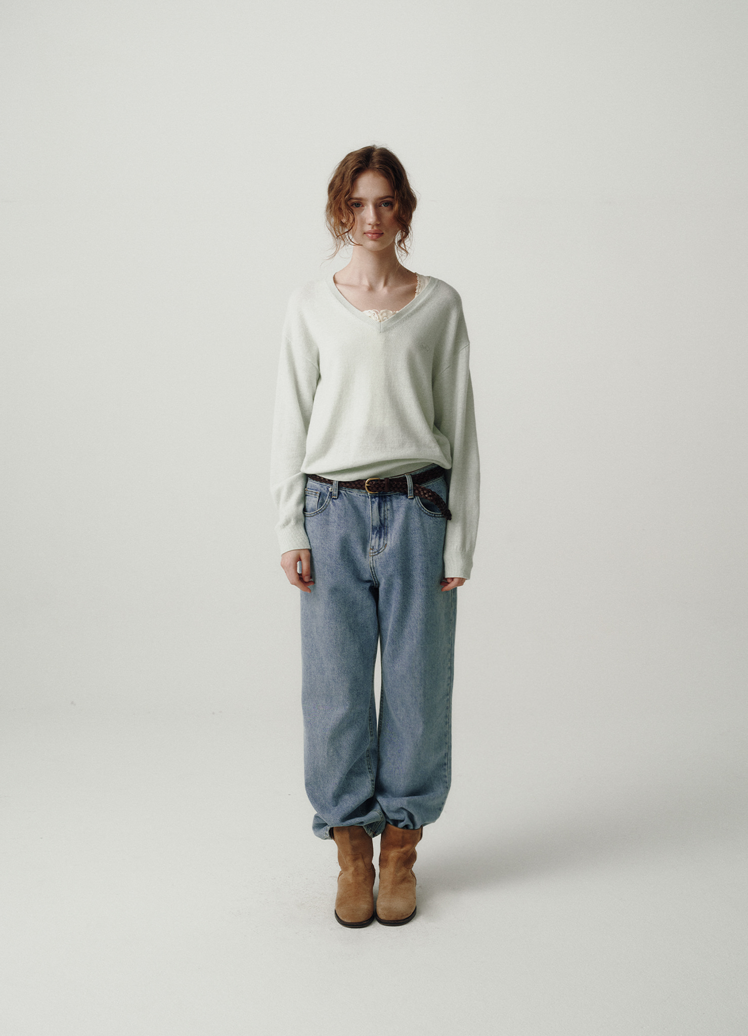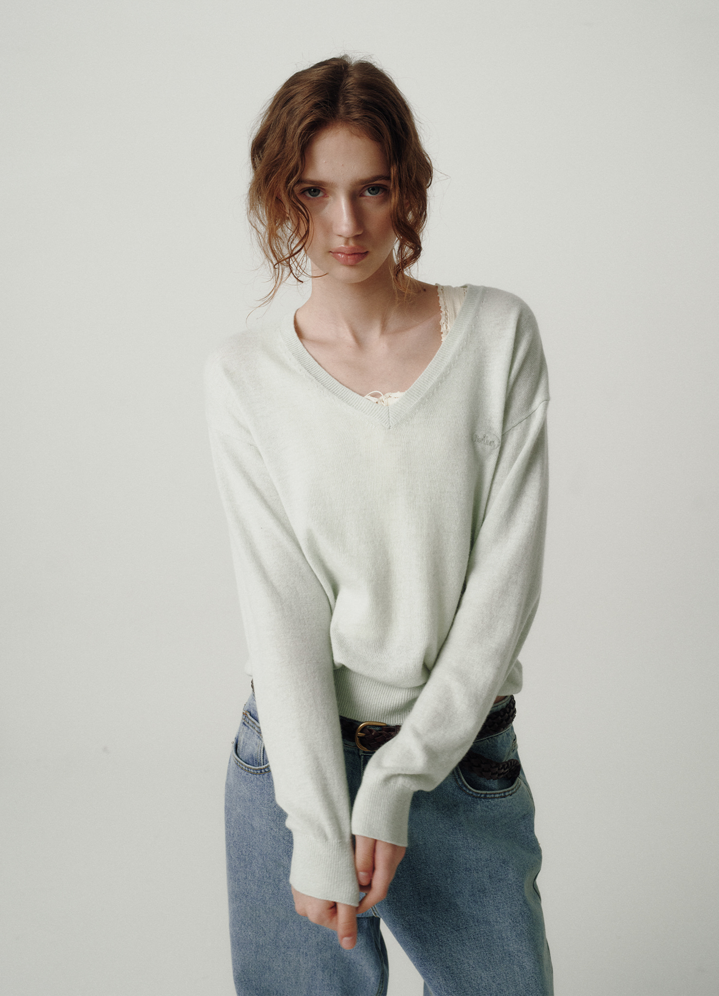 Vネック&ドロップショルダー、リブ仕様のニットセータータイプ。